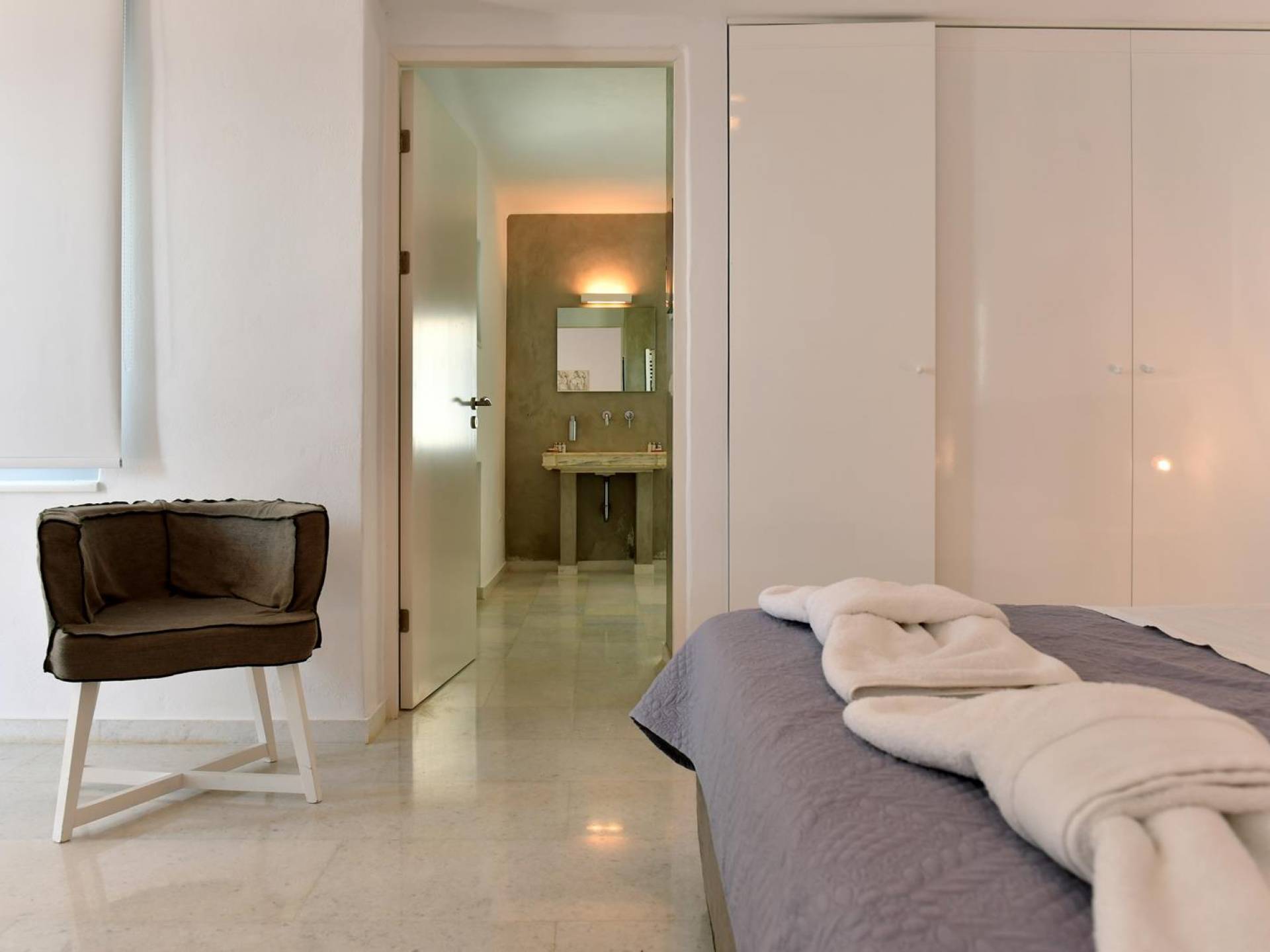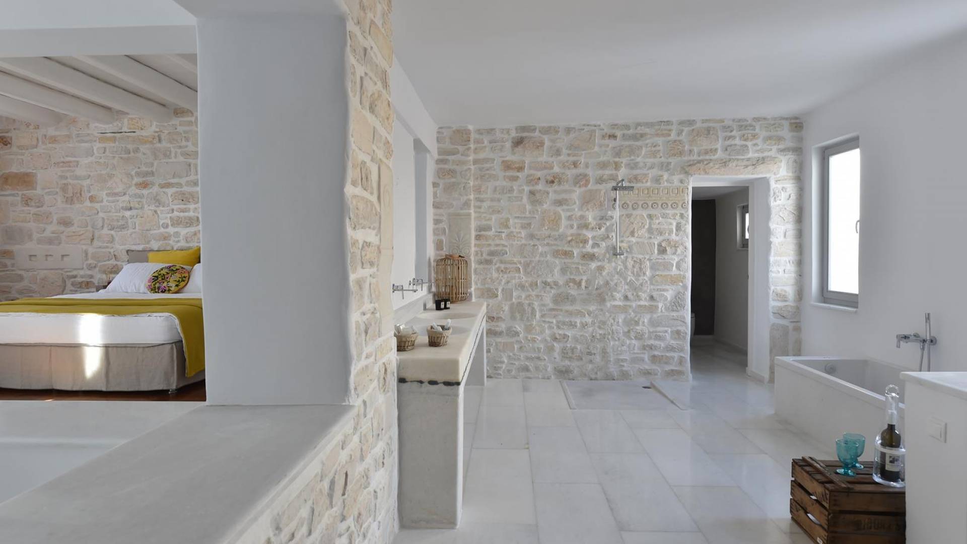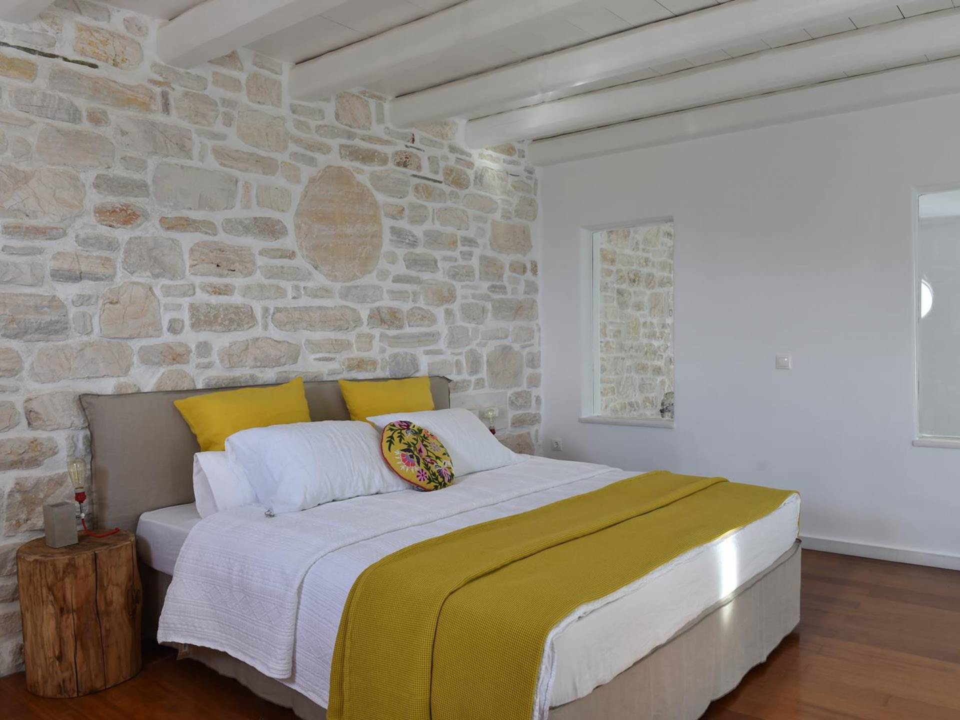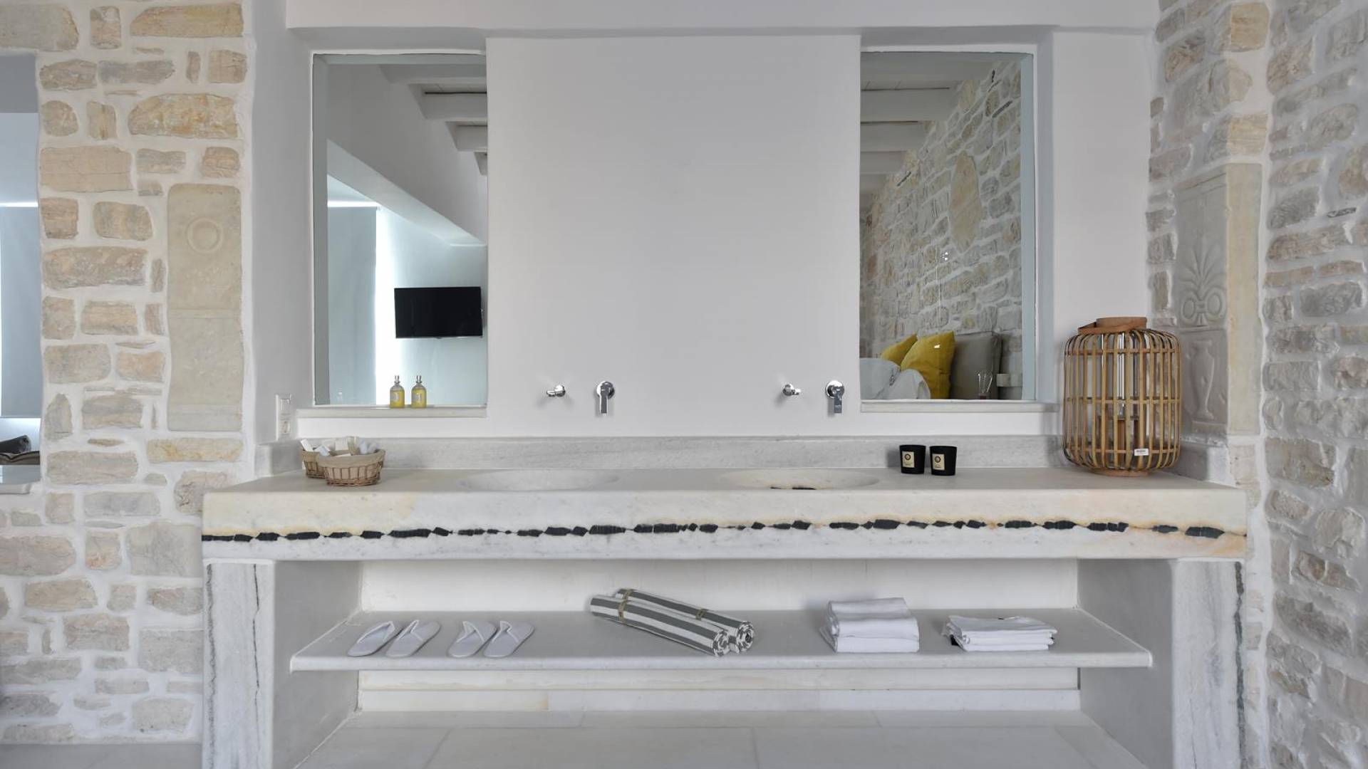 Enveloped by the aura of quiet and calm and the sounds of nature, Villa Aethra in Paros, in an enchanting area, boasts an unrivaled array of luxury facilities in Paros ensuring a pleasurable holiday experience for their elite guests. Main House Ground Level: Entrance hall, living room with direct access to terrace and pool area (TV, DVD, sound system, fireplace, dining area, a fully equipped kitchen, and a guest WC). Double room with en suite bathroom (shower, double bed, A/C, TV, safe box, sea view). Main House Upper Level: Master bedroom with en suite bathroom and sitting area (bathtub, shower cabin, toilet room, double vanity, king size bed, A/C, TV, safe box, private veranda with sea and Antiparos view.