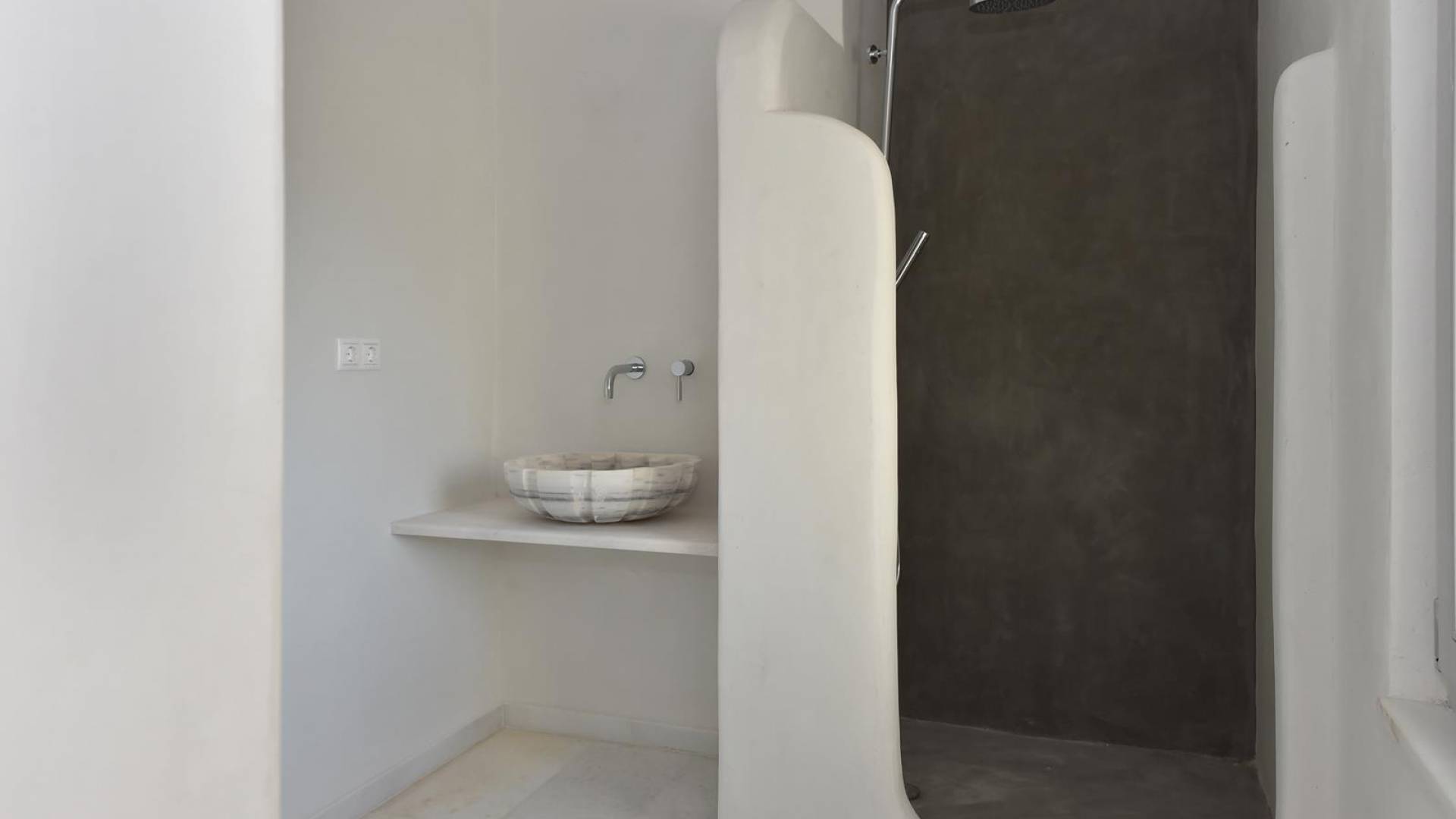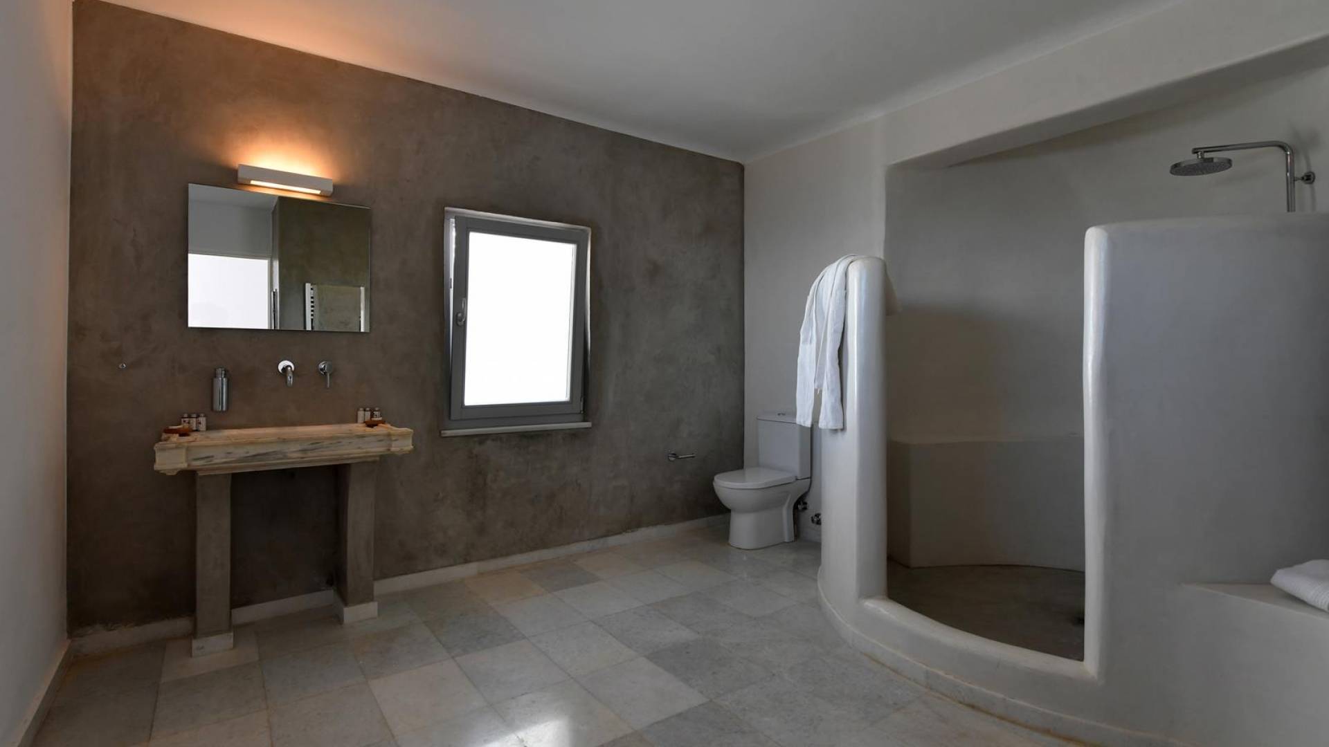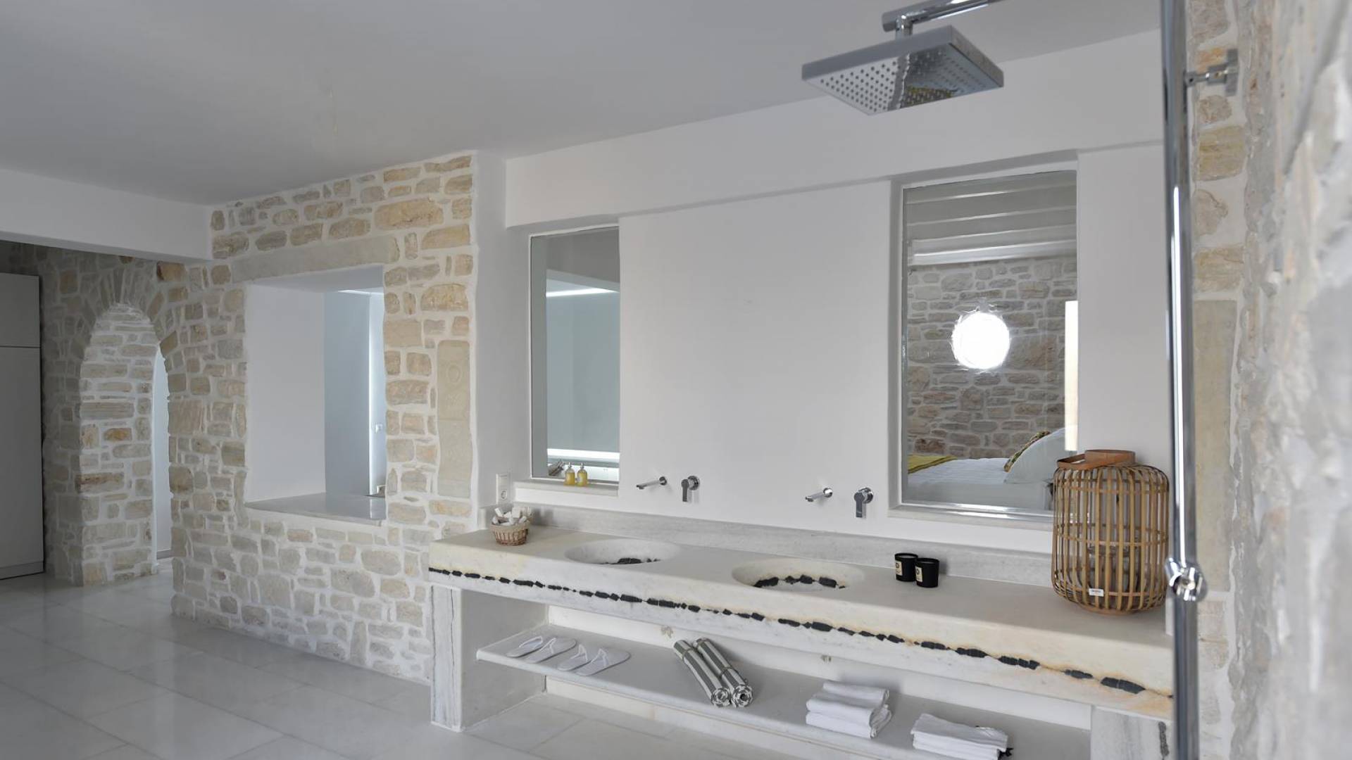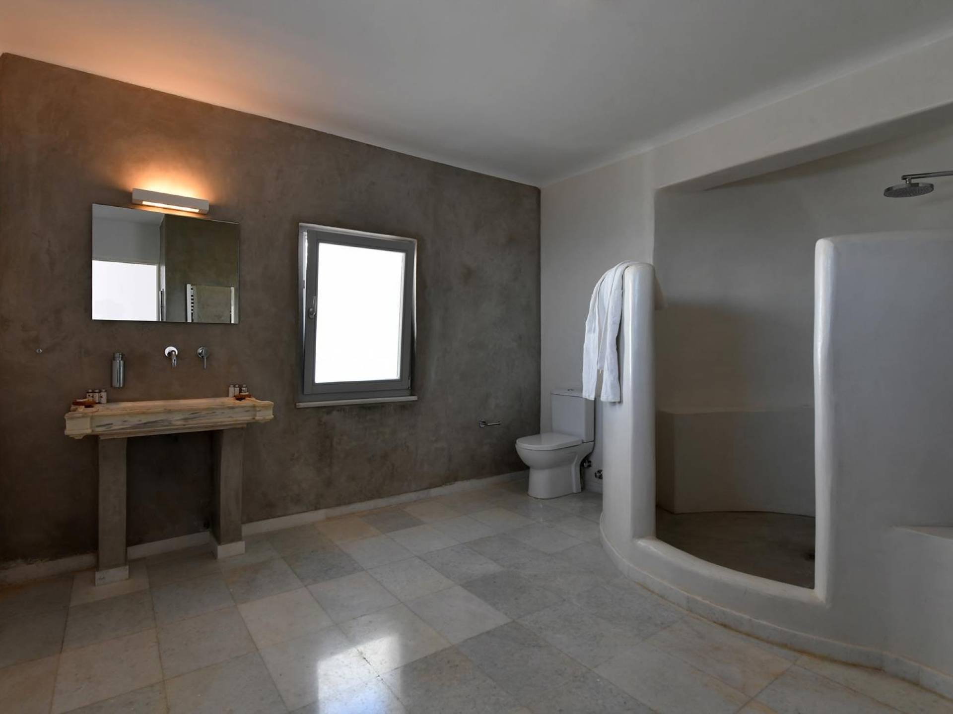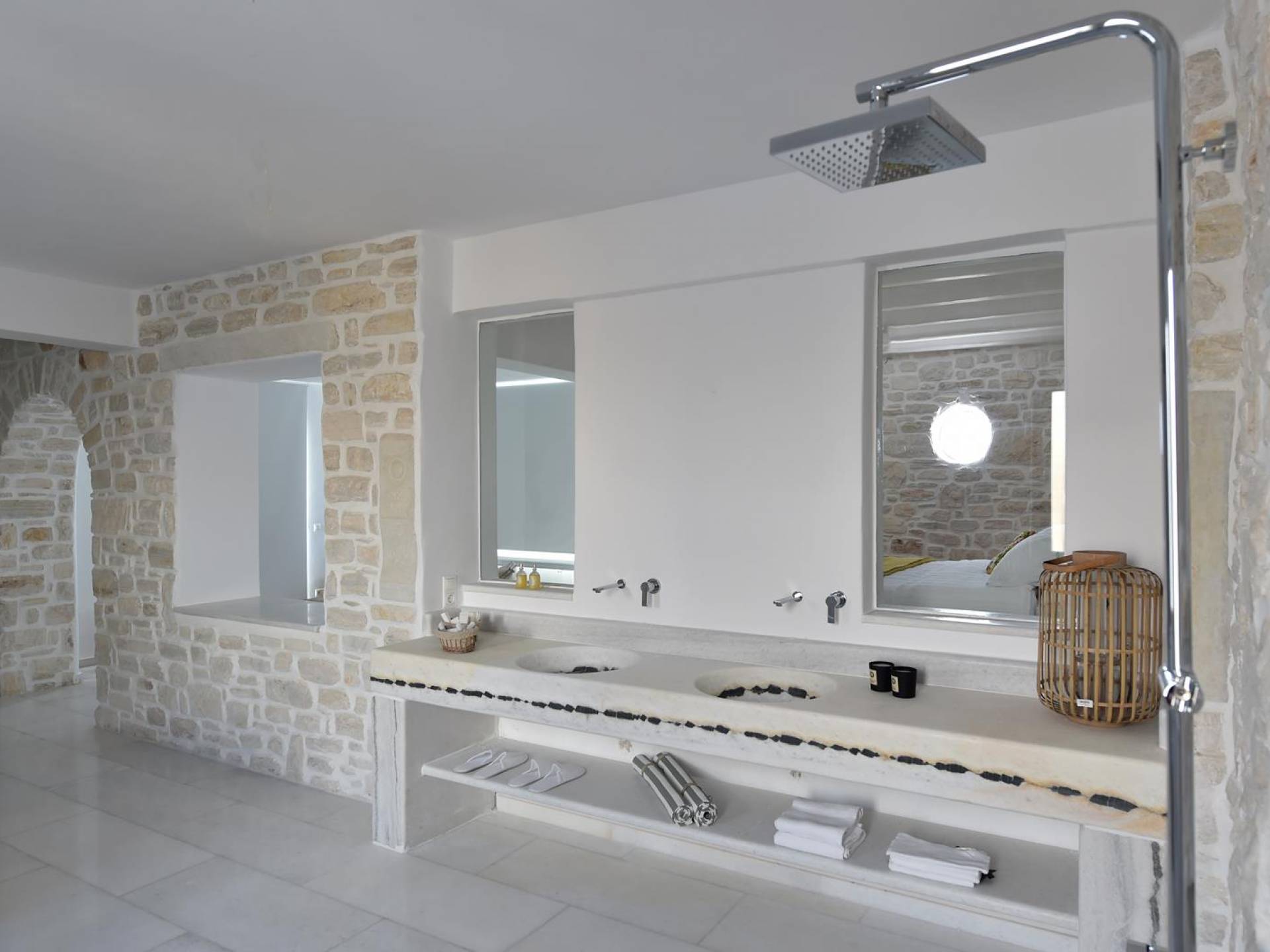 Enveloped by the aura of quiet and calm and the sounds of nature, Villa Aethra in Paros, in an enchanting area, boasts an unrivaled array of luxury facilities in Paros ensuring a pleasurable holiday experience for their elite guests. Main House Ground Level: Entrance hall, living room with direct access to terrace and pool area (TV, DVD, sound system, fireplace, dining area, a fully equipped kitchen, and a guest WC). Double room with en suite bathroom (shower, double bed, A/C, TV, safe box, sea view). Main House Upper Level: Master bedroom with en suite bathroom and sitting area (bathtub, shower cabin, toilet room, double vanity, king size bed, A/C, TV, safe box, private veranda with sea and Antiparos view.