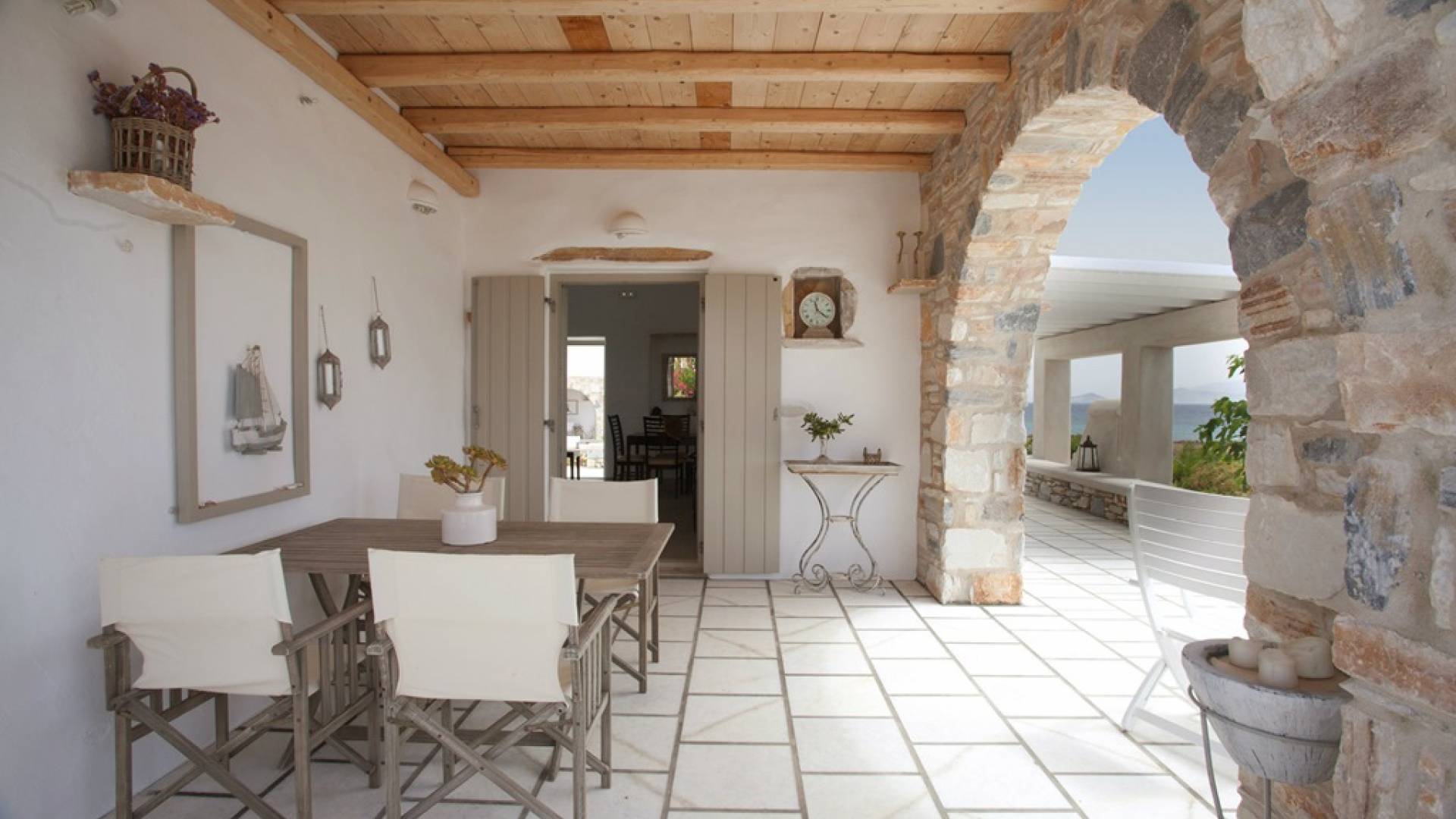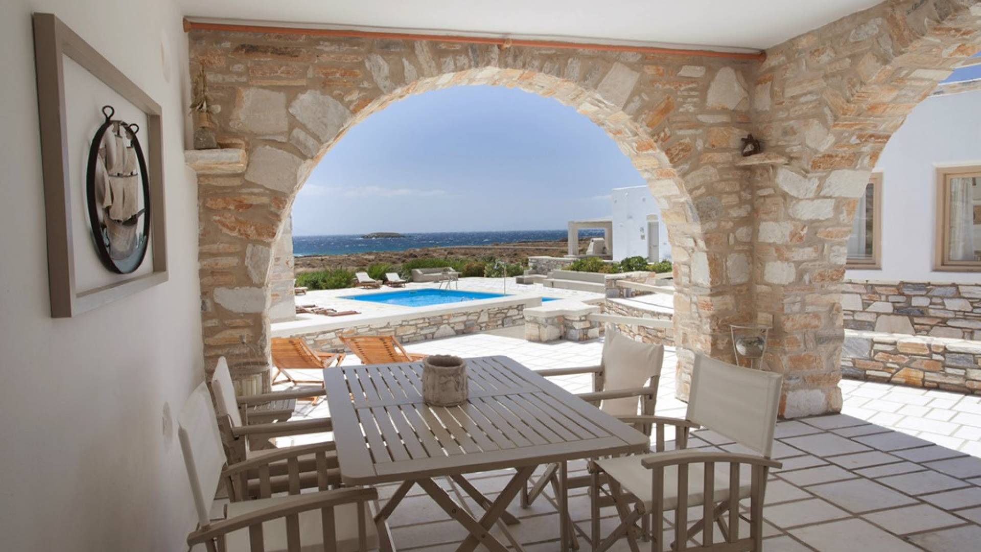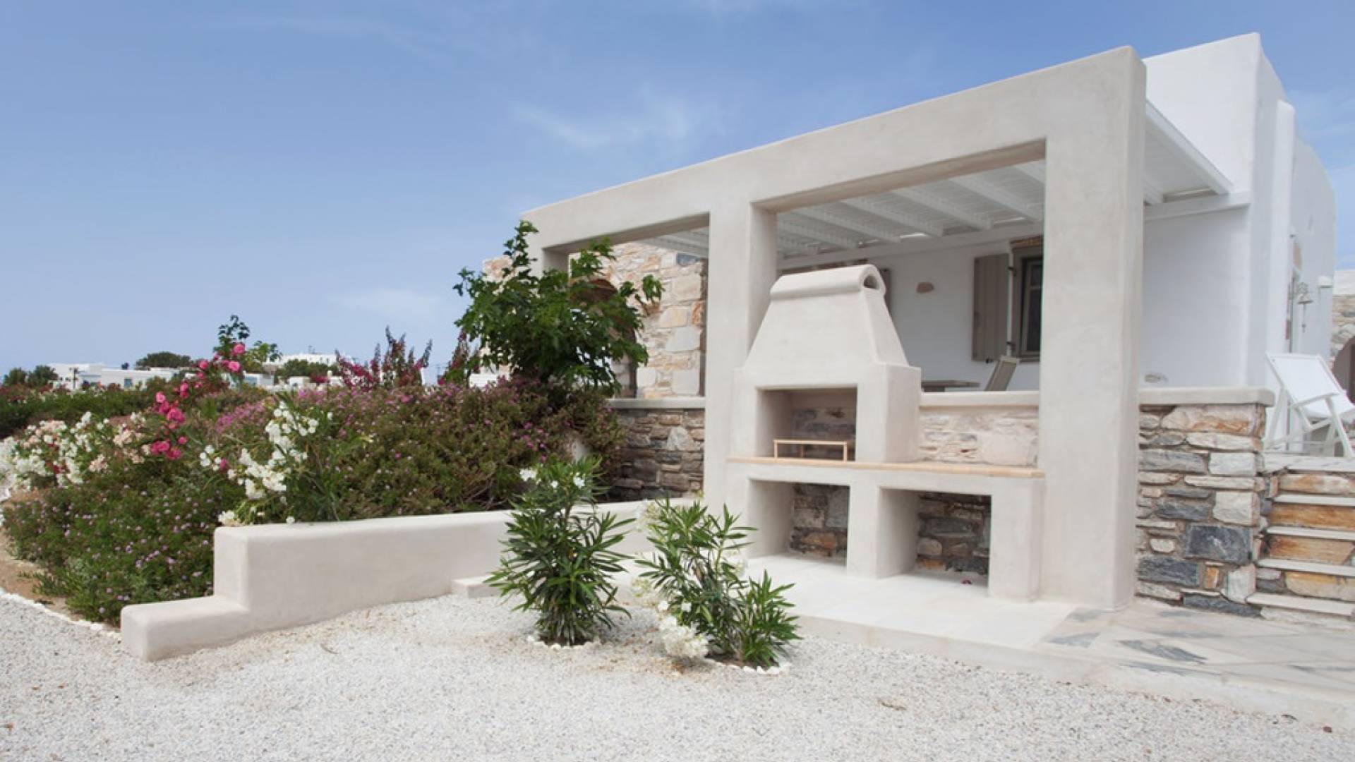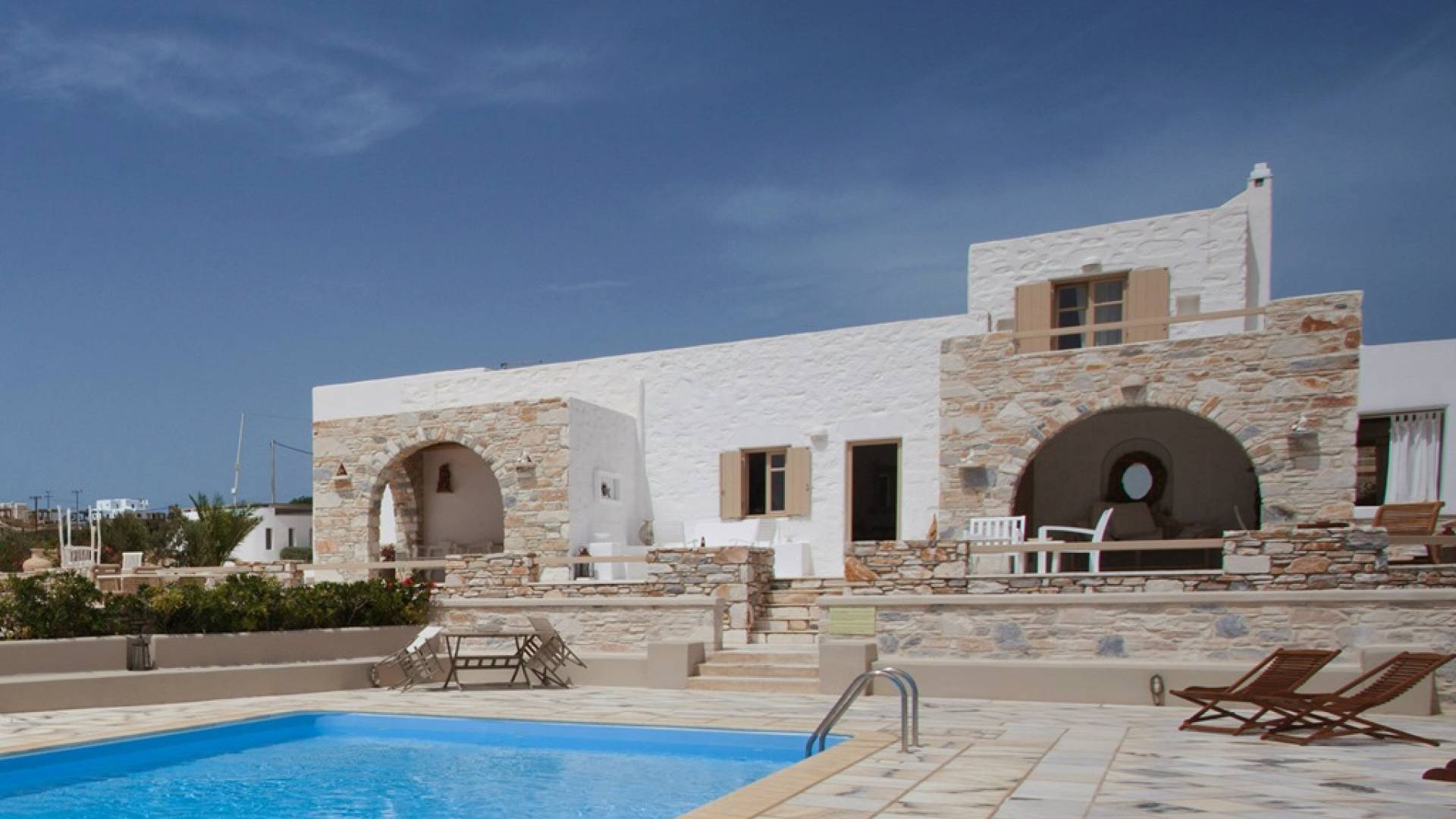 Pebbles Villa is a residence of 180m2. It has a spacious living room, fully equipped kitchen, dining room, 2 double bedrooms, 2 twin bedrooms and 3 bathrooms. It can accommodate 8 persons. Pebbles Villa has three spacious shaded verandas with indoor and outdoor dining areas and a private BBQ. It shares the pool, the garden and the parking with the three other Villas. Pebbles Villa is just in front of the common pool and has a breathtaking view of the sea and the island of Naxos!
