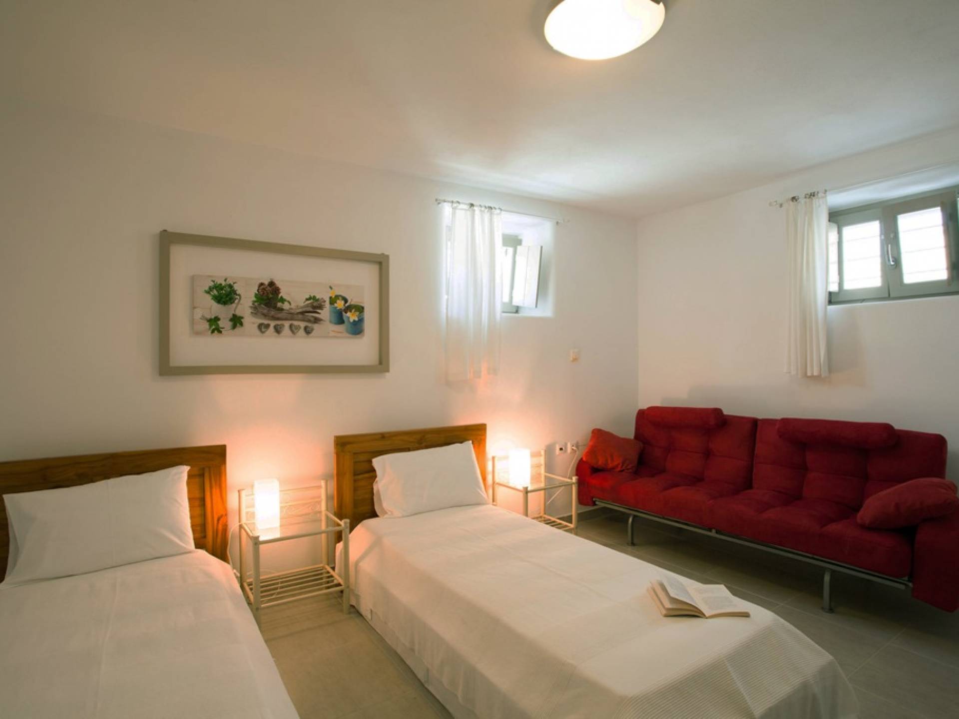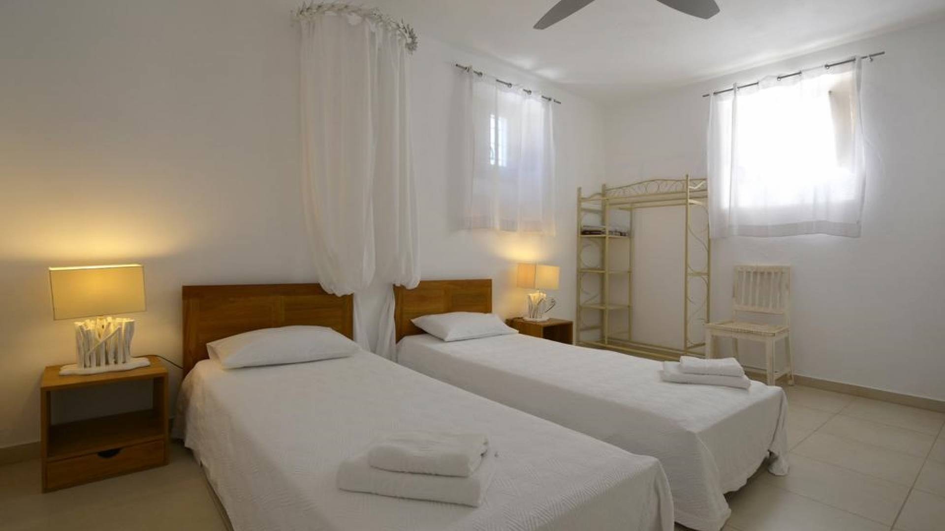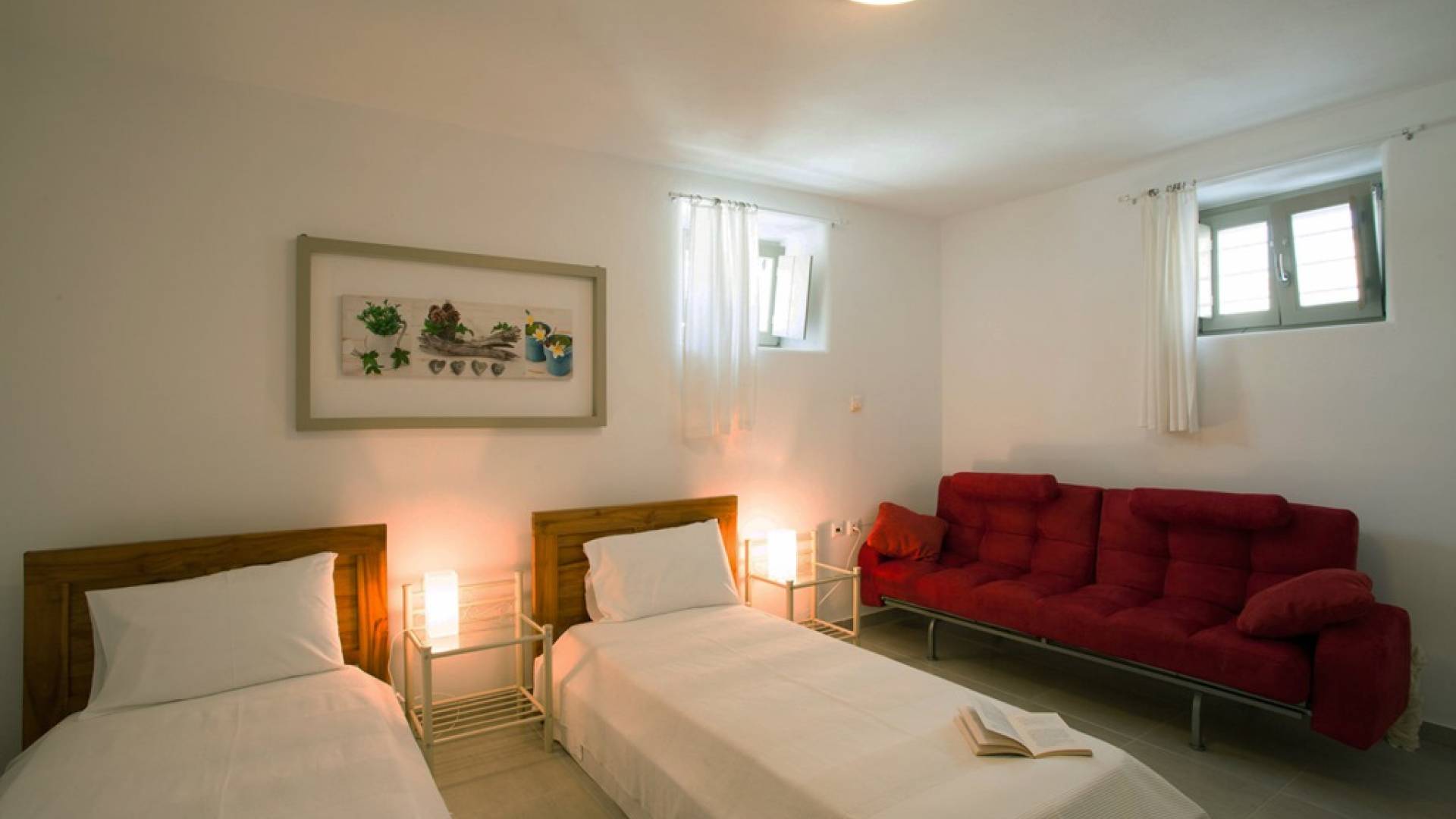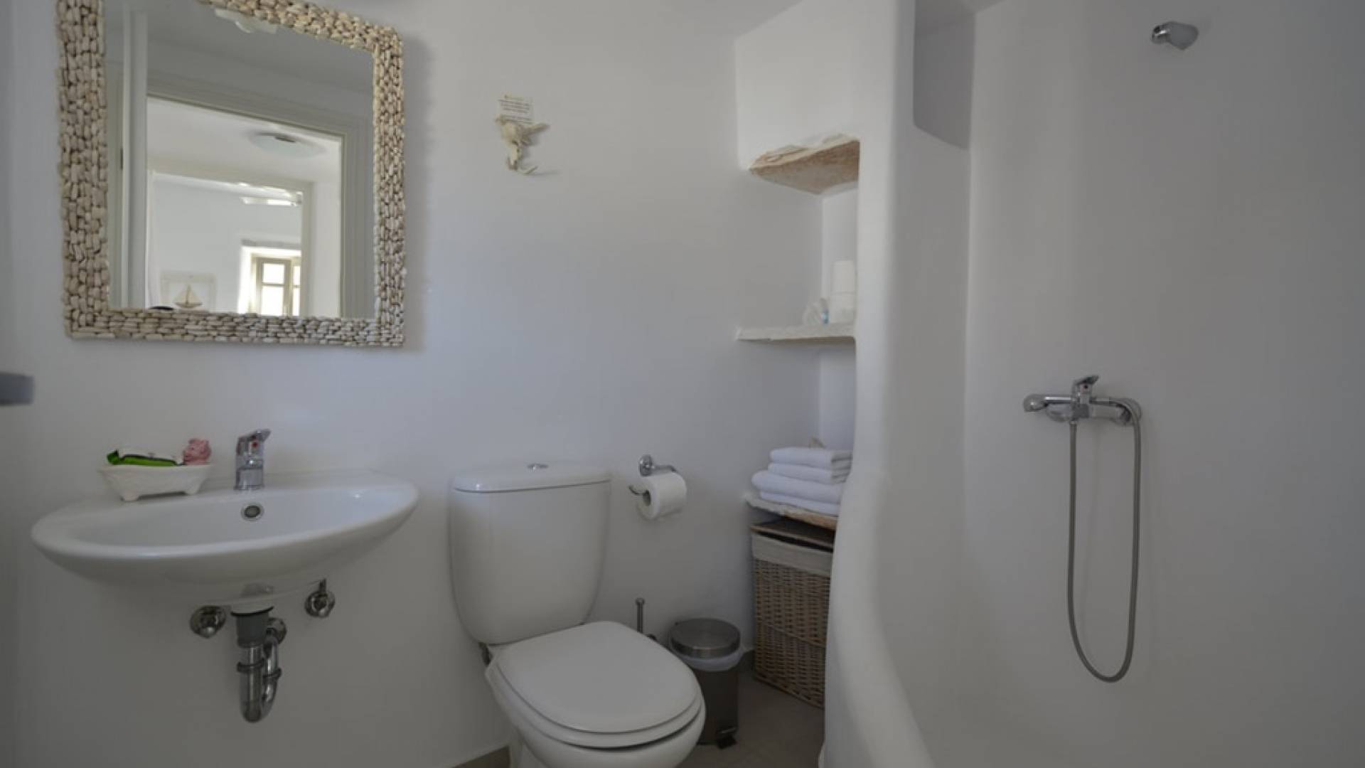 Pebbles Villa is a residence of 180m2. It has a spacious living room, fully equipped kitchen, dining room, 2 double bedrooms, 2 twin bedrooms and 3 bathrooms. It can accommodate 8 persons. Pebbles Villa has three spacious shaded verandas with indoor and outdoor dining areas and a private BBQ. It shares the pool, the garden and the parking with the three other Villas. Pebbles Villa is just in front of the common pool and has a breathtaking view of the sea and the island of Naxos!