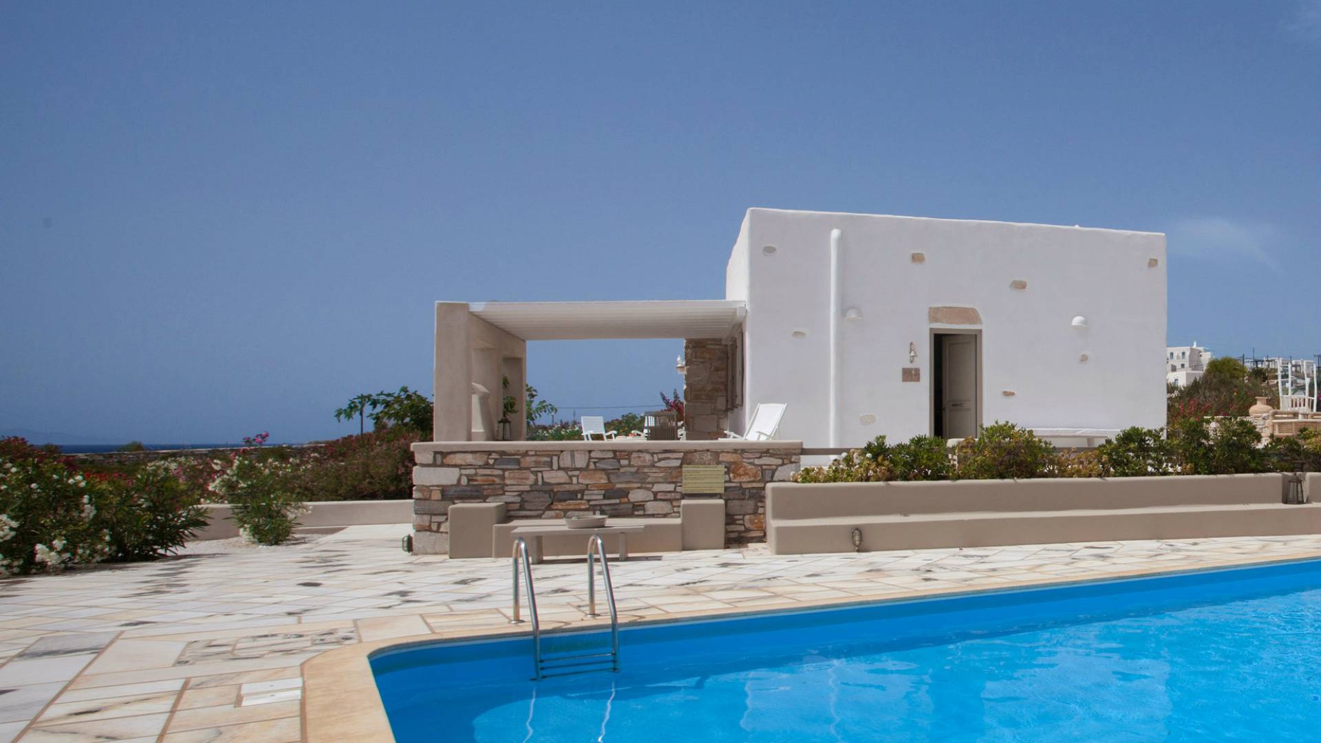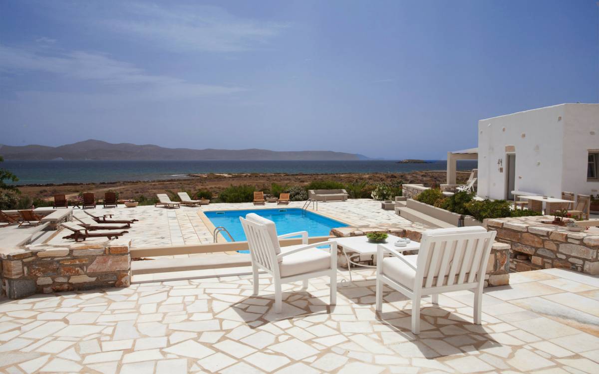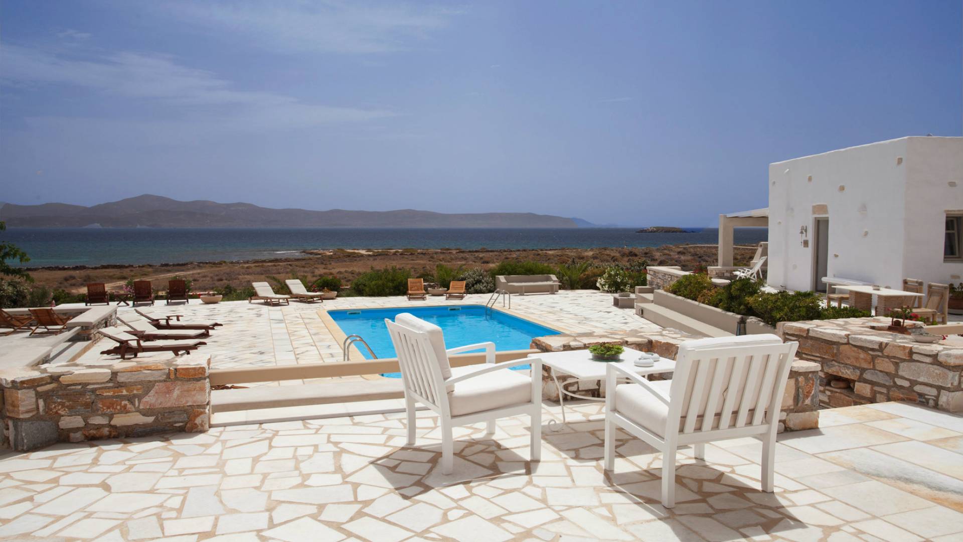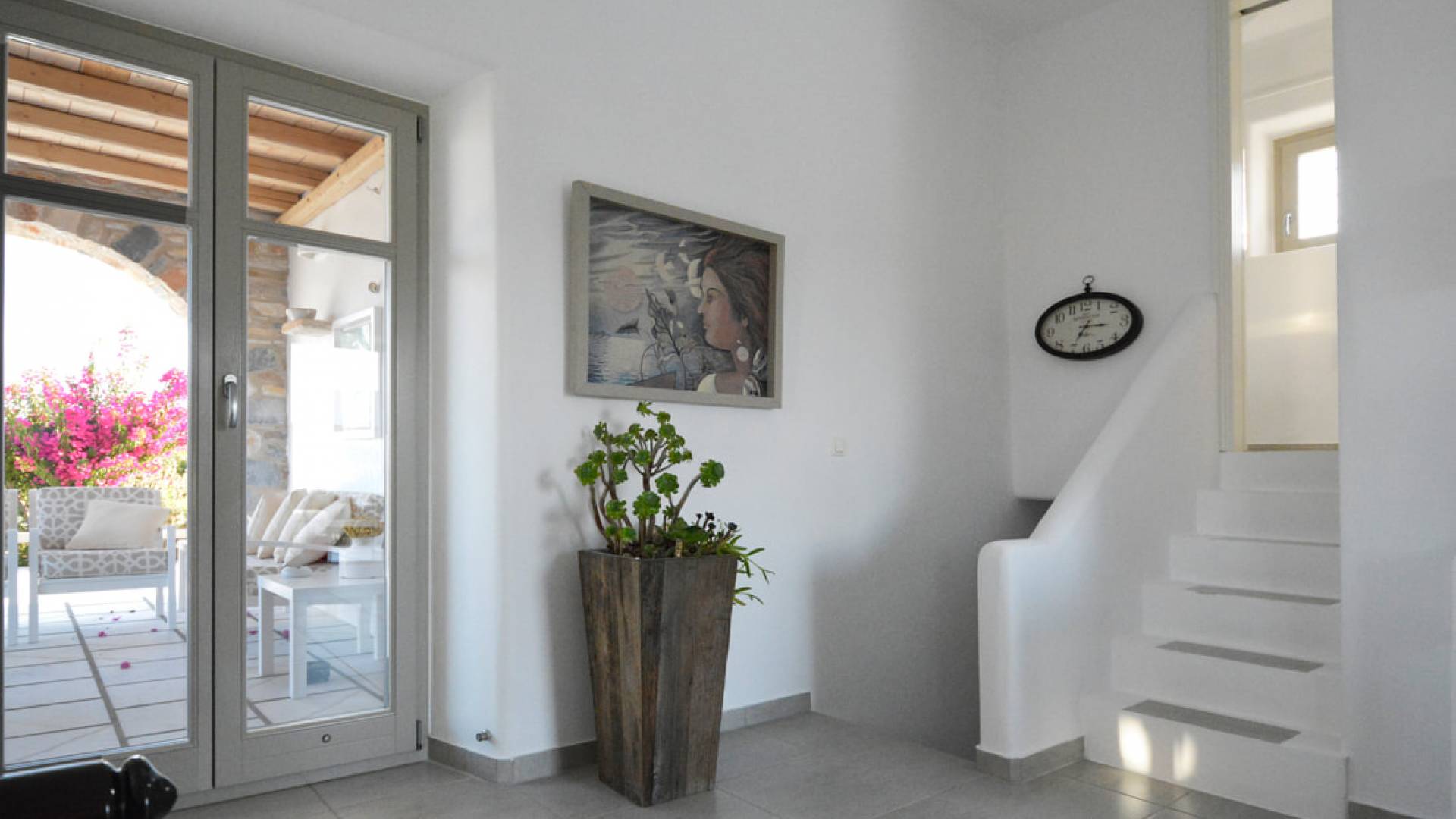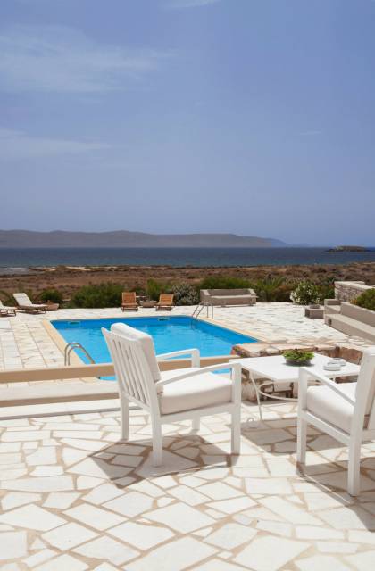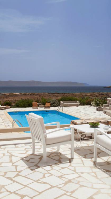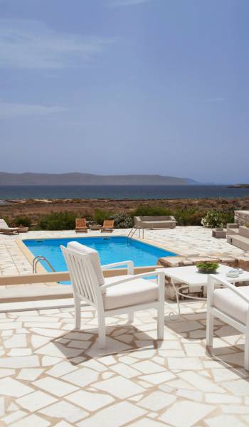 The internal, as well as the external spaces, are drawn with fineness and luxury. The interiors are equipped with beautiful furniture and unique pieces of art. All villas have an open view of the sea and the island of Naxos from every place you choose to sit and can offer you real relaxation. The complex offers also a big garden, parking facilities as well as a large common yard with a large swimming pool.