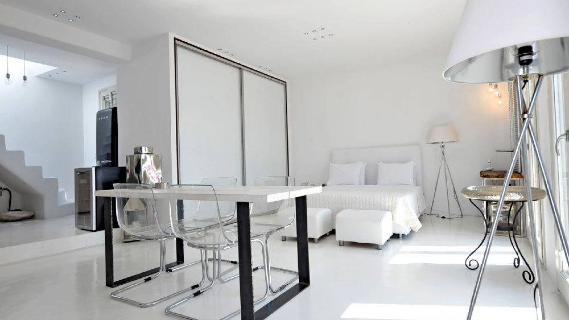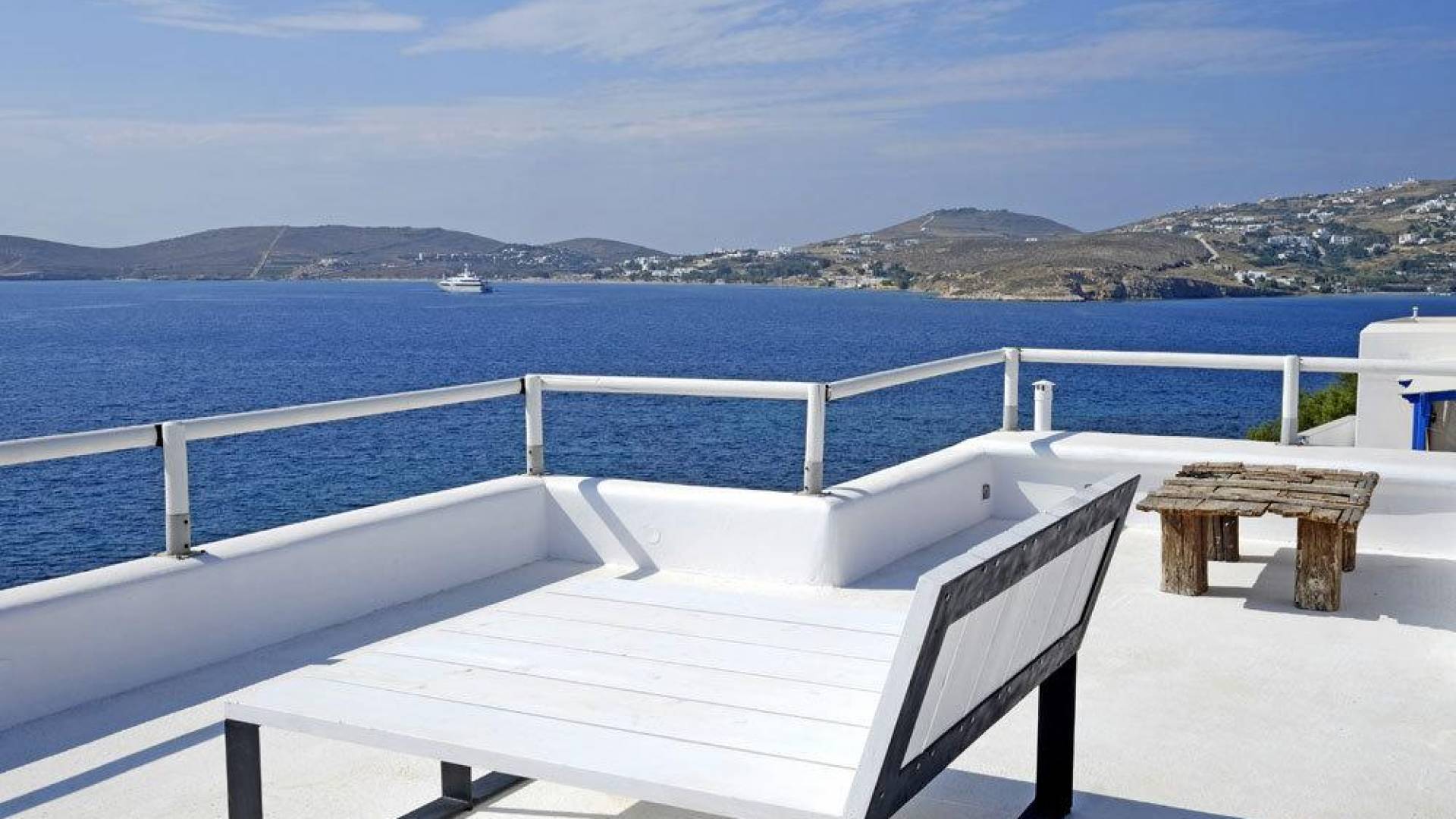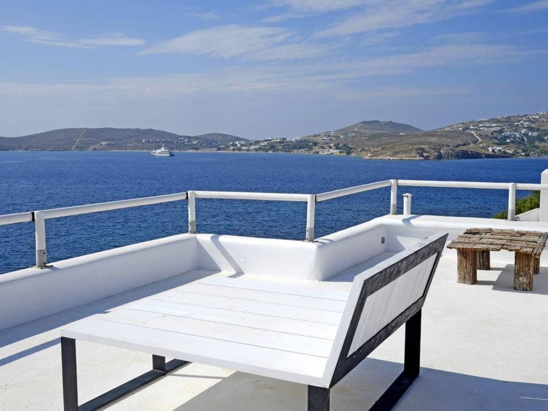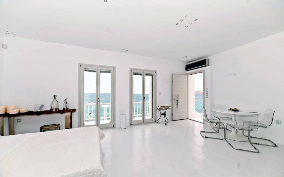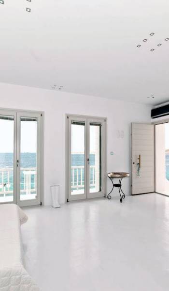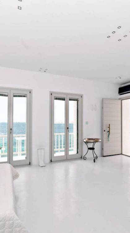 Villa Kastro is one storey property 60 sq.m, suitable for 2 adults and 1 child. Villa Kastro is decorated in a minimal style and has 1 double bed and wardrobe in the same area with the fully equipped kitchenette. It provides a beautiful bathroom with a shower and Jacuzzi. It has a nice and very comfortable balcony with an unobstructed sea view and a unique terrace at the top (with interior steps) with a breathtaking view of the Aegean Sea and sunset view which will compensate the most demanding tenant.