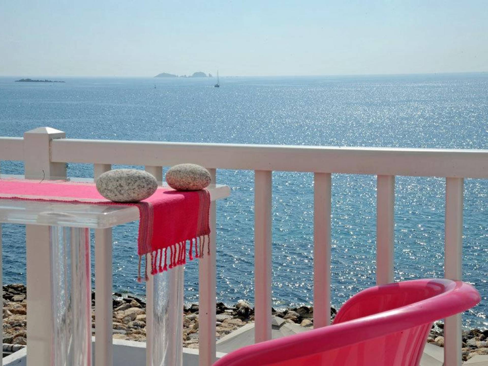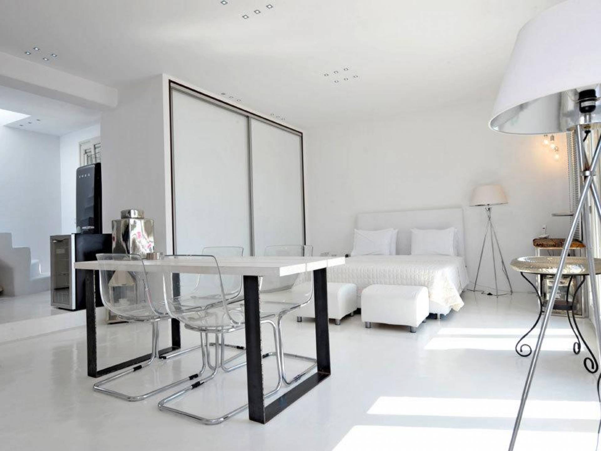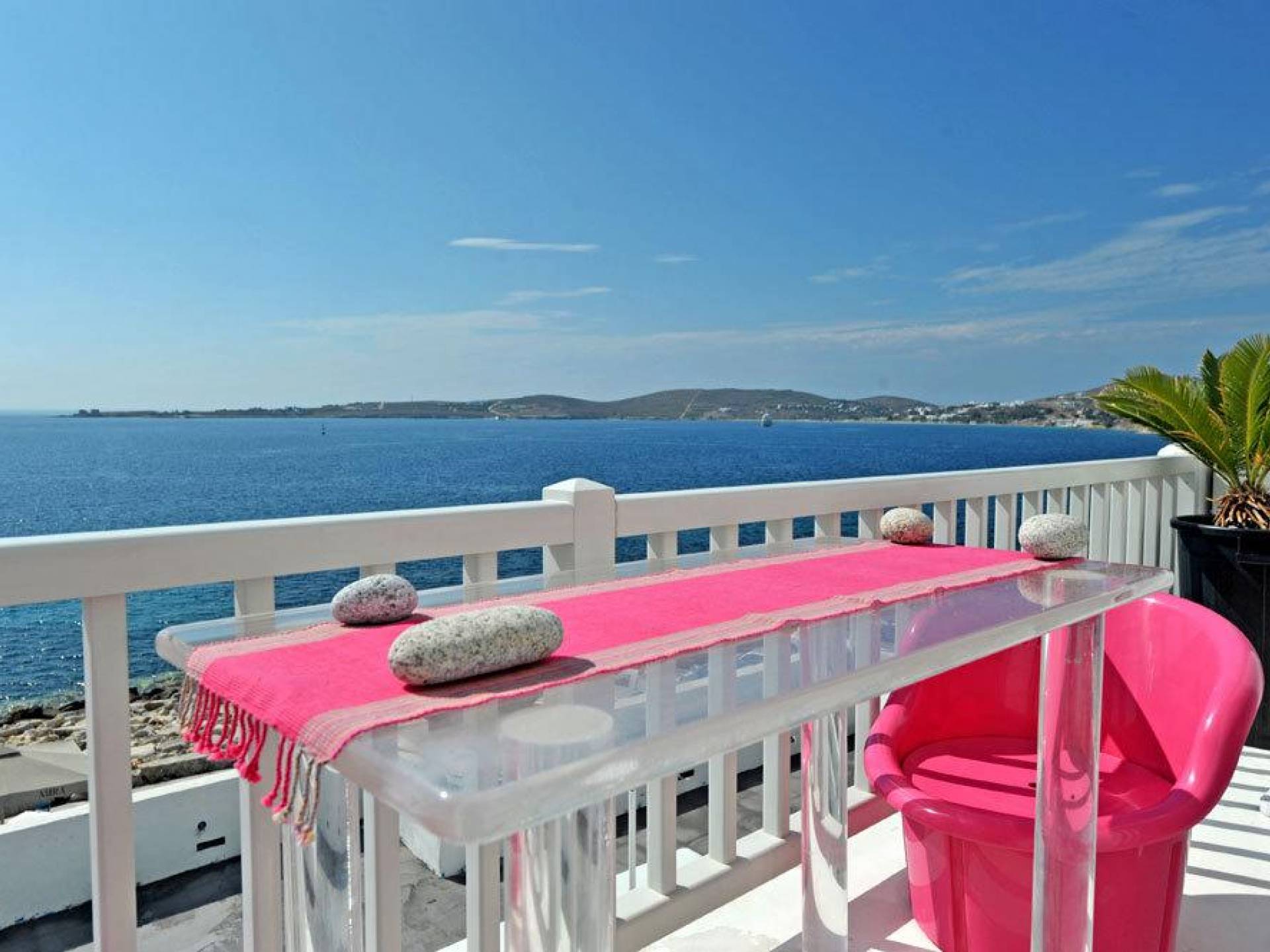 Villa Kastro is one storey property 60 sq.m, suitable for 2 adults and 1 child. Villa Kastro is decorated in a minimal style and has 1 double bed and wardrobe in the same area with the fully equipped kitchenette. It provides a beautiful bathroom with a shower and Jacuzzi. It has a nice and very comfortable balcony with an unobstructed sea view and a unique terrace at the top (with interior steps) with a breathtaking view of the Aegean Sea and sunset view which will compensate the most demanding tenant.
