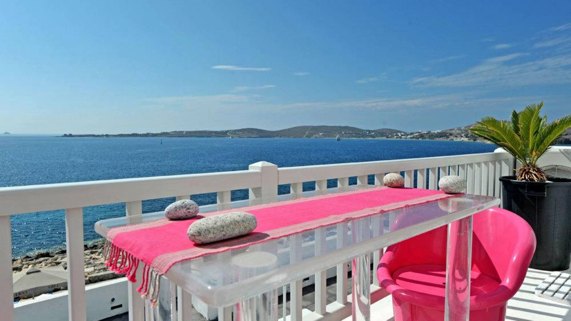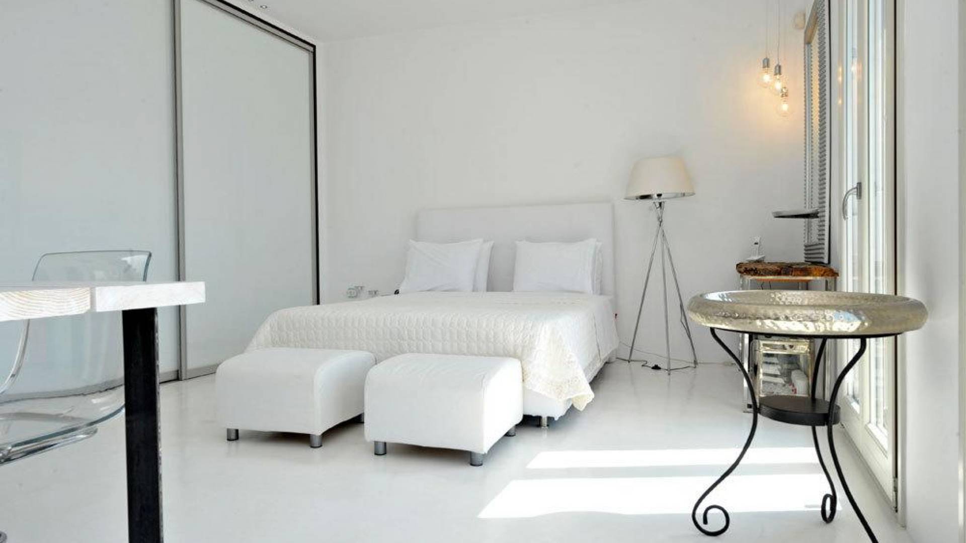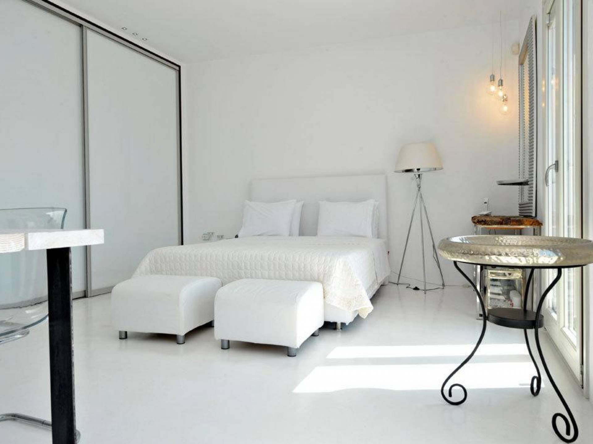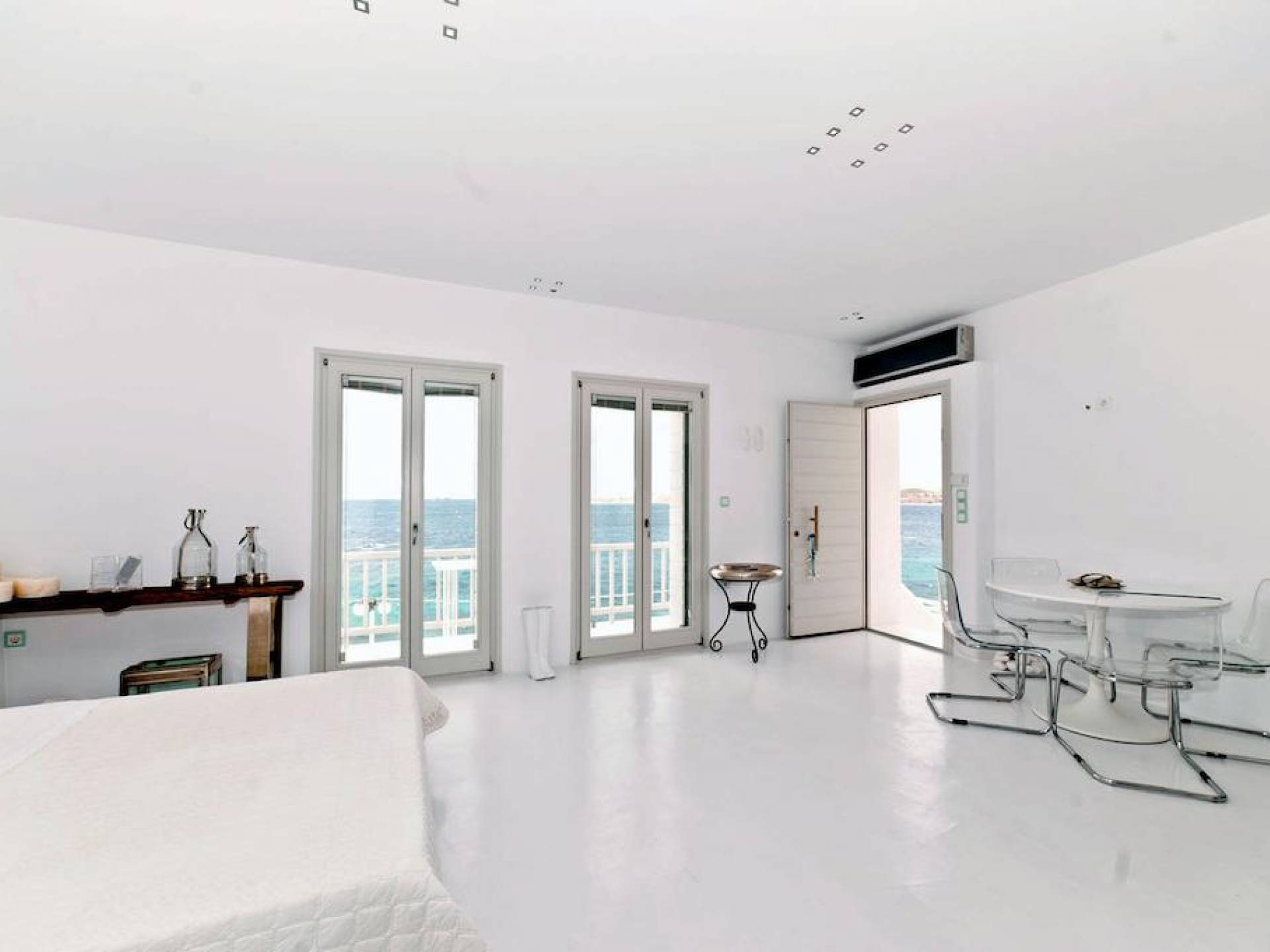 Villa Kastro is one storey property 60 sq.m, suitable for 2 adults and 1 child. Villa Kastro is decorated in a minimal style and has 1 double bed and wardrobe in the same area with the fully equipped kitchenette. It provides a beautiful bathroom with a shower and Jacuzzi. It has a nice and very comfortable balcony with an unobstructed sea view and a unique terrace at the top (with interior steps) with a breathtaking view of the Aegean Sea and sunset view which will compensate the most demanding tenant.