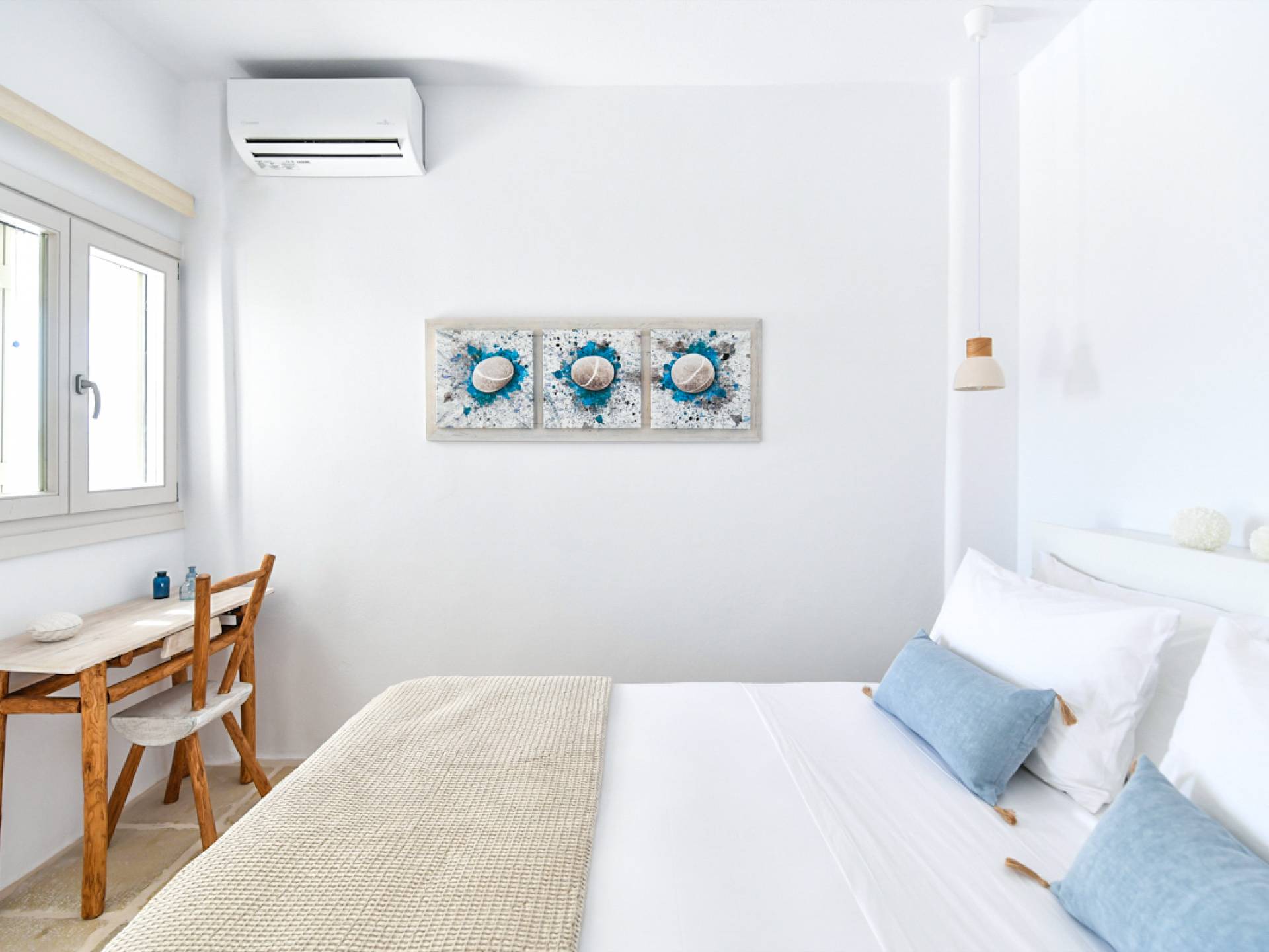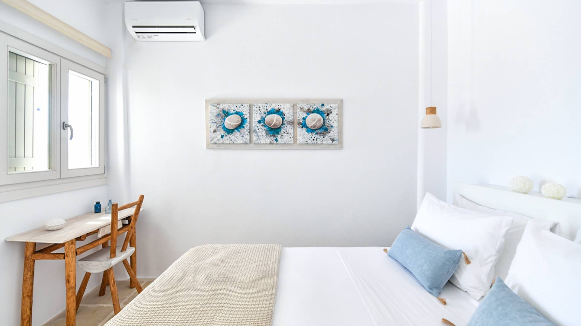 Bliss in Aethras’ living room can accommodate up to 6 guests with a 42 inch Smart TV flanked by a fully-equipped kitchen with a dining table for 6 and a WC. The kitchen and the living room have direct access to Aethra’s 2 unique furnished terraces which offer breathtaking views to Antiparos.