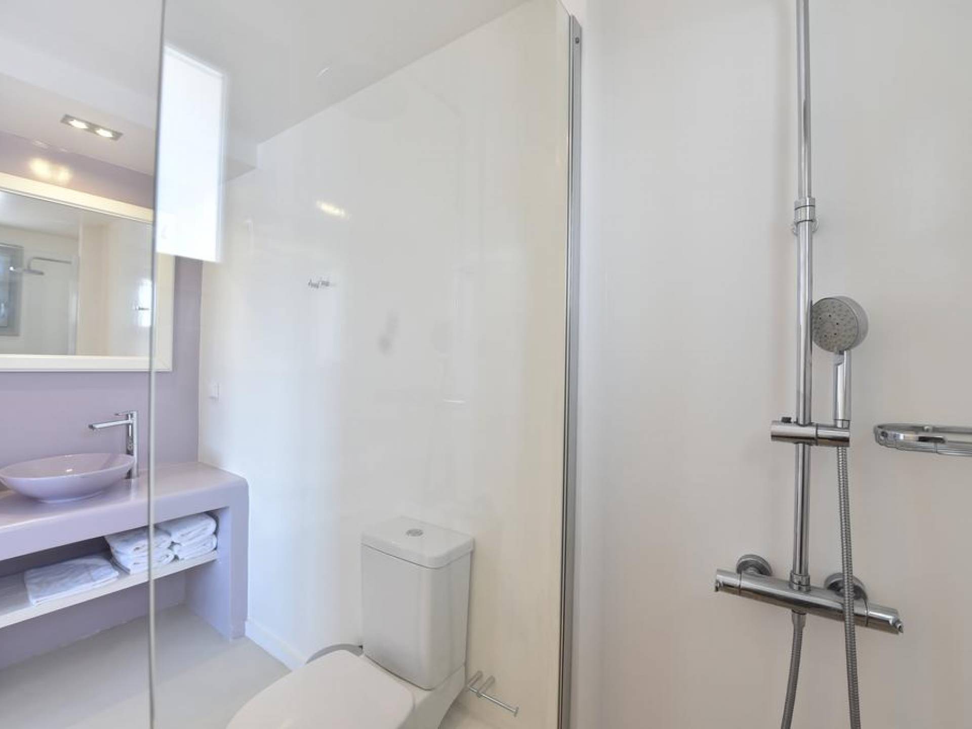 The 130 sq meters Ambassador Junior Villa is a 3 bedroom villa comfortably fitted for 6 people. It is located on the left corner of the building with a unique view of the sea, and Santa Maria beach. Junior Villa has a balcony as well as a veranda both equipped with quality exclusive furniture. The ground level is consisting of 1 bedroom with en-suite bathroom, a kitchen with a dining area, and a living area with stunning views from the large window. The second floor has 2 bedrooms and a very spacious bathroom.