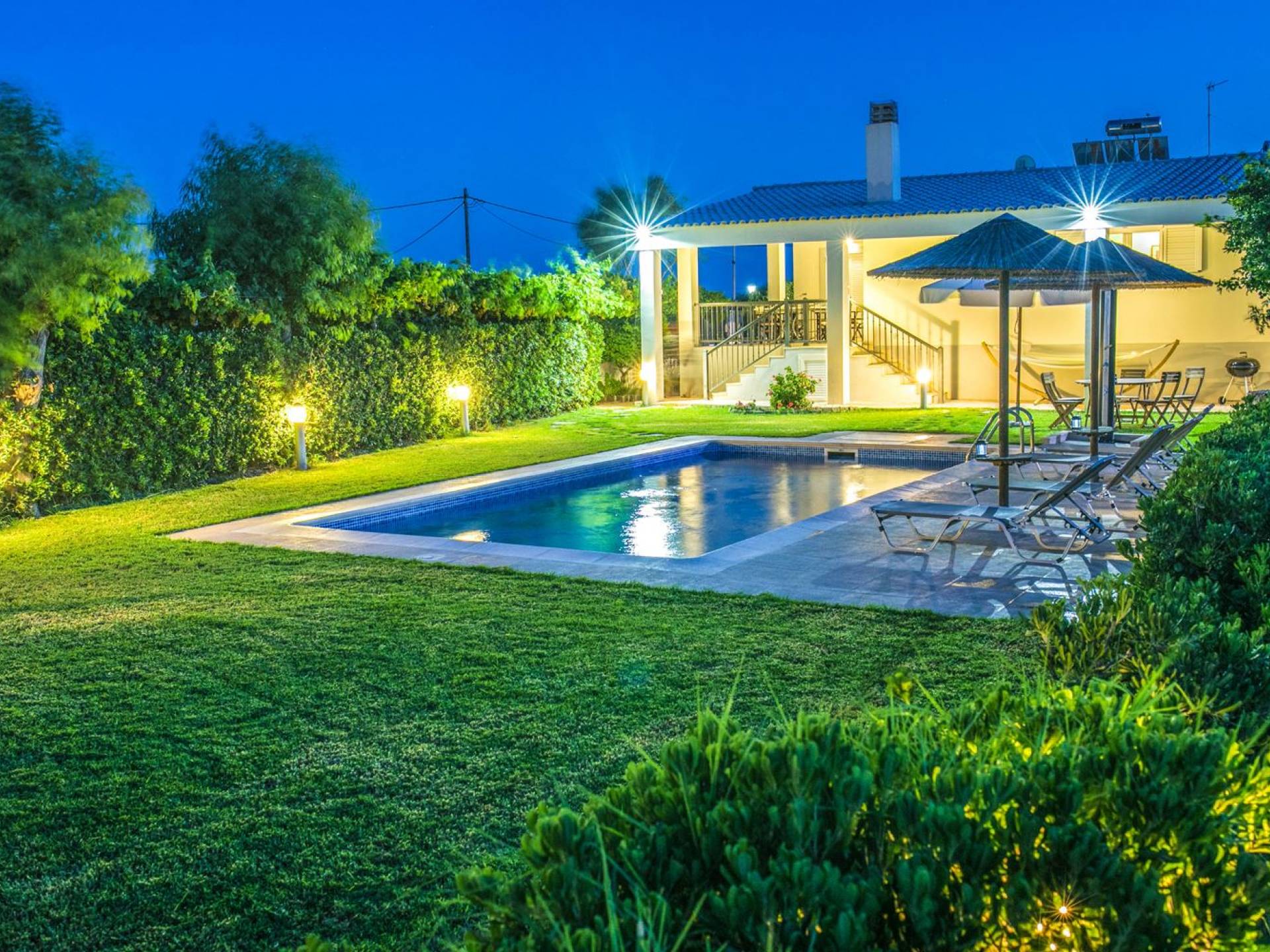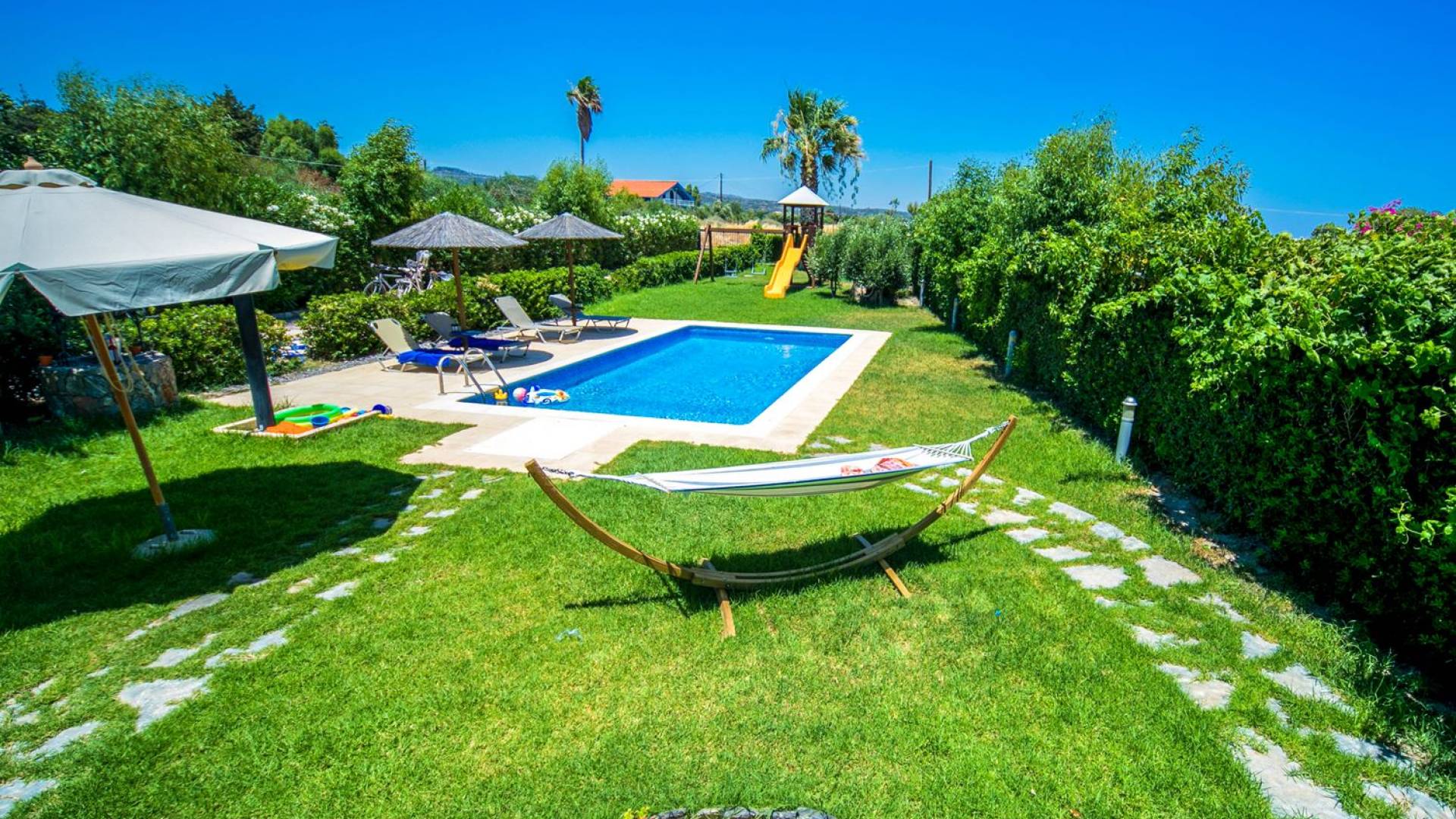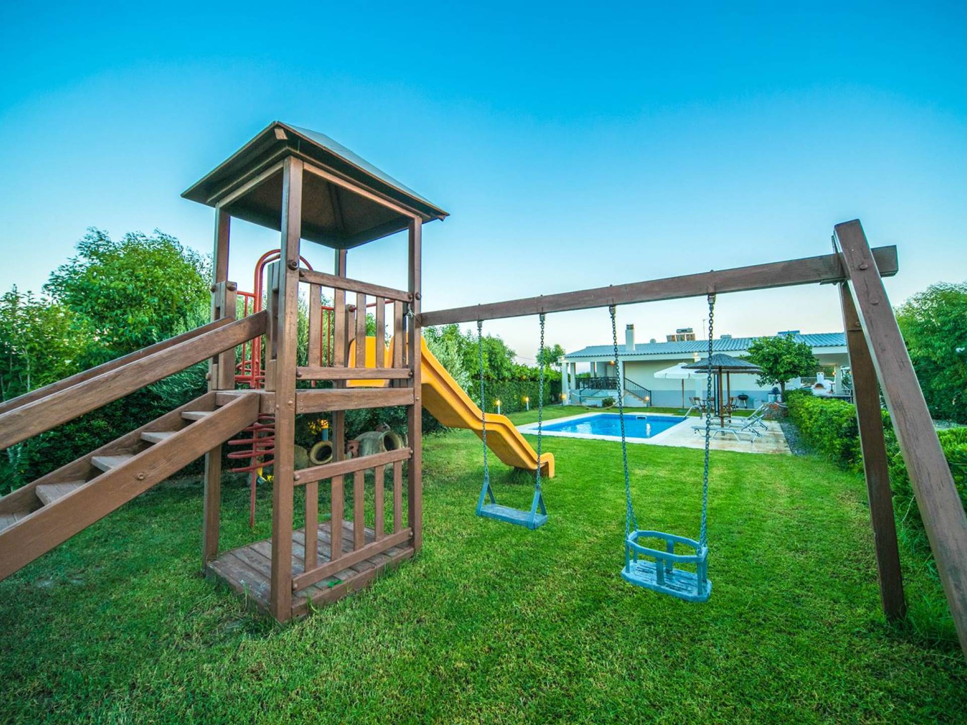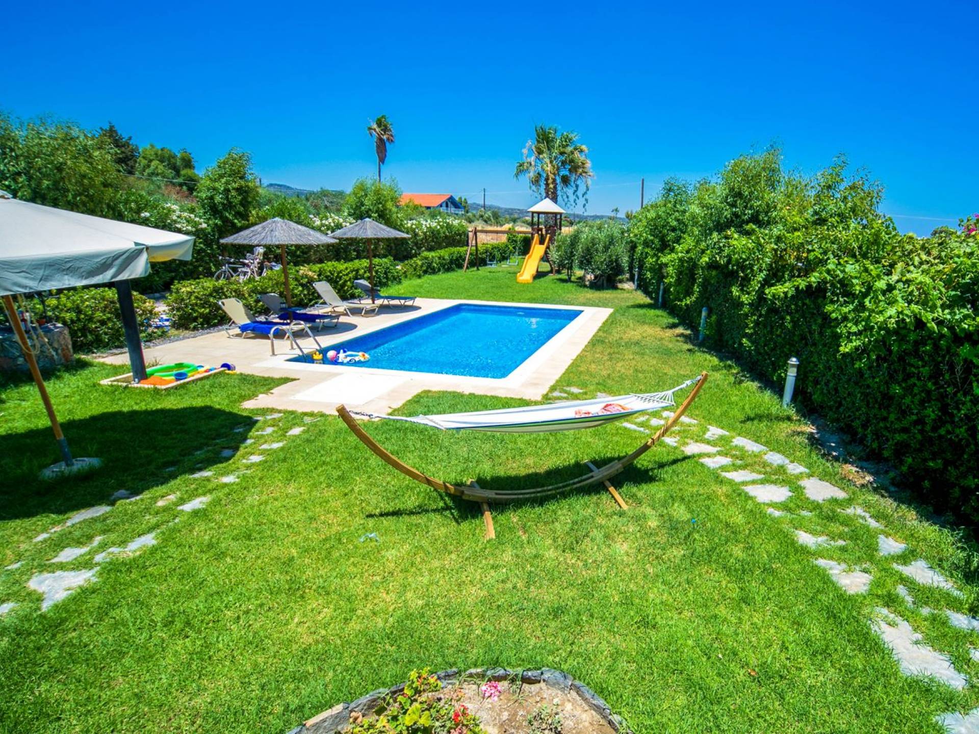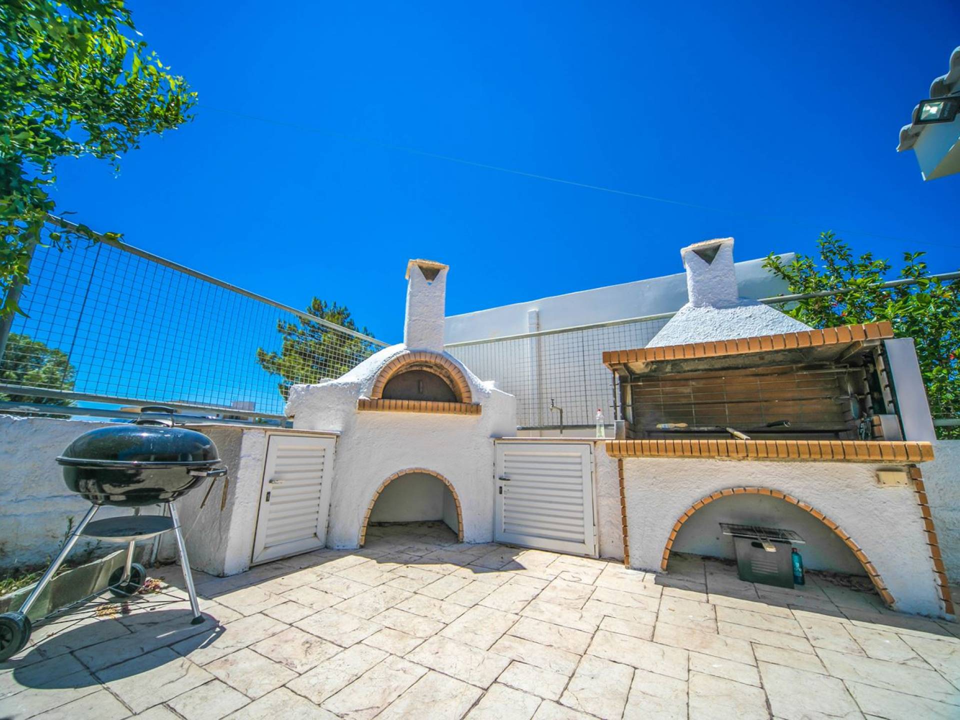 The property is set in the garden ground with native vegetation, large lawn areas, mature trees, a totally new swimming pool, a playground, and a built-in BBQ place. A modernly designed home offers guests the chance to relax inside watching tv or sitting on the veranda overlooking the Mediterranean Sea. The garden is ideal for children to play with and for adults to sunbathe. The extra mobile BBQ and the dining table in the garden is easy solution for lunch or dinner.