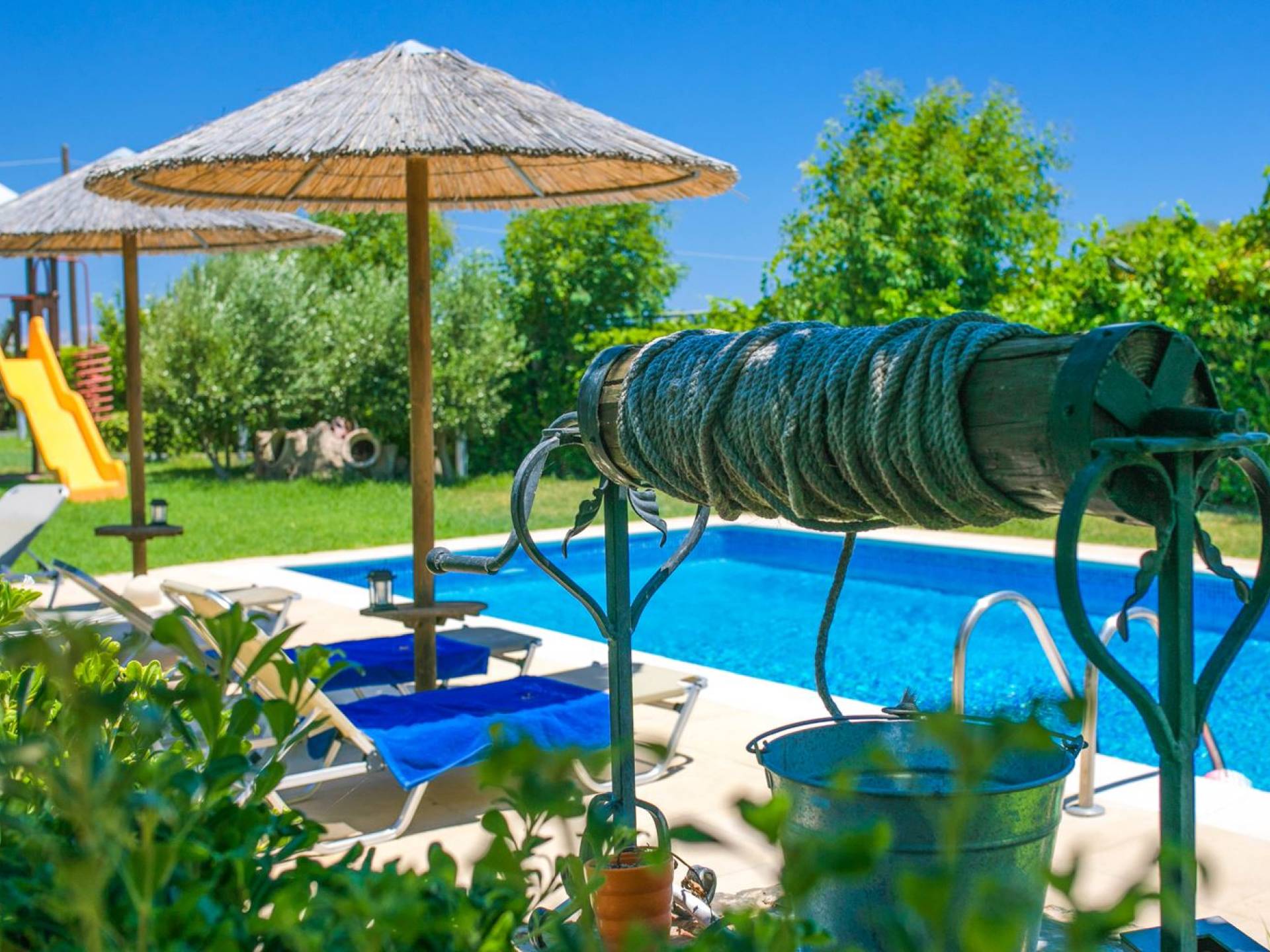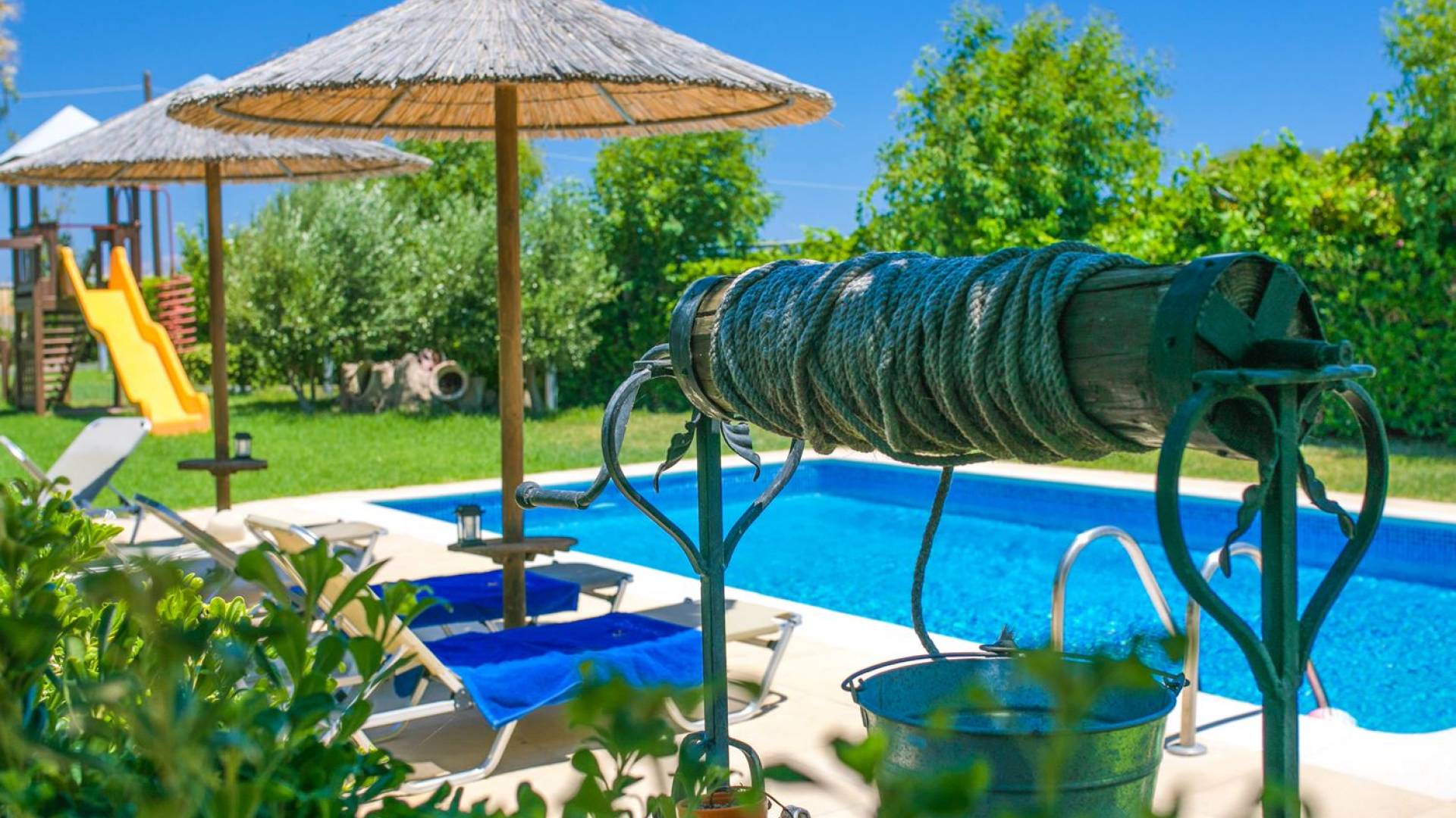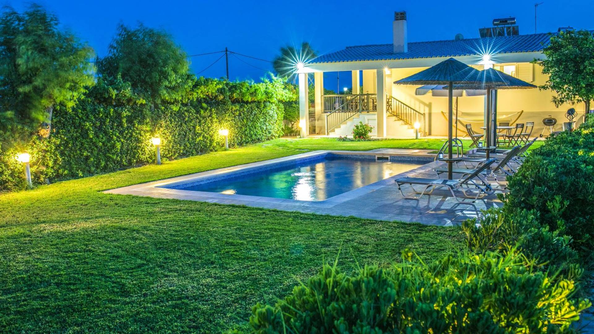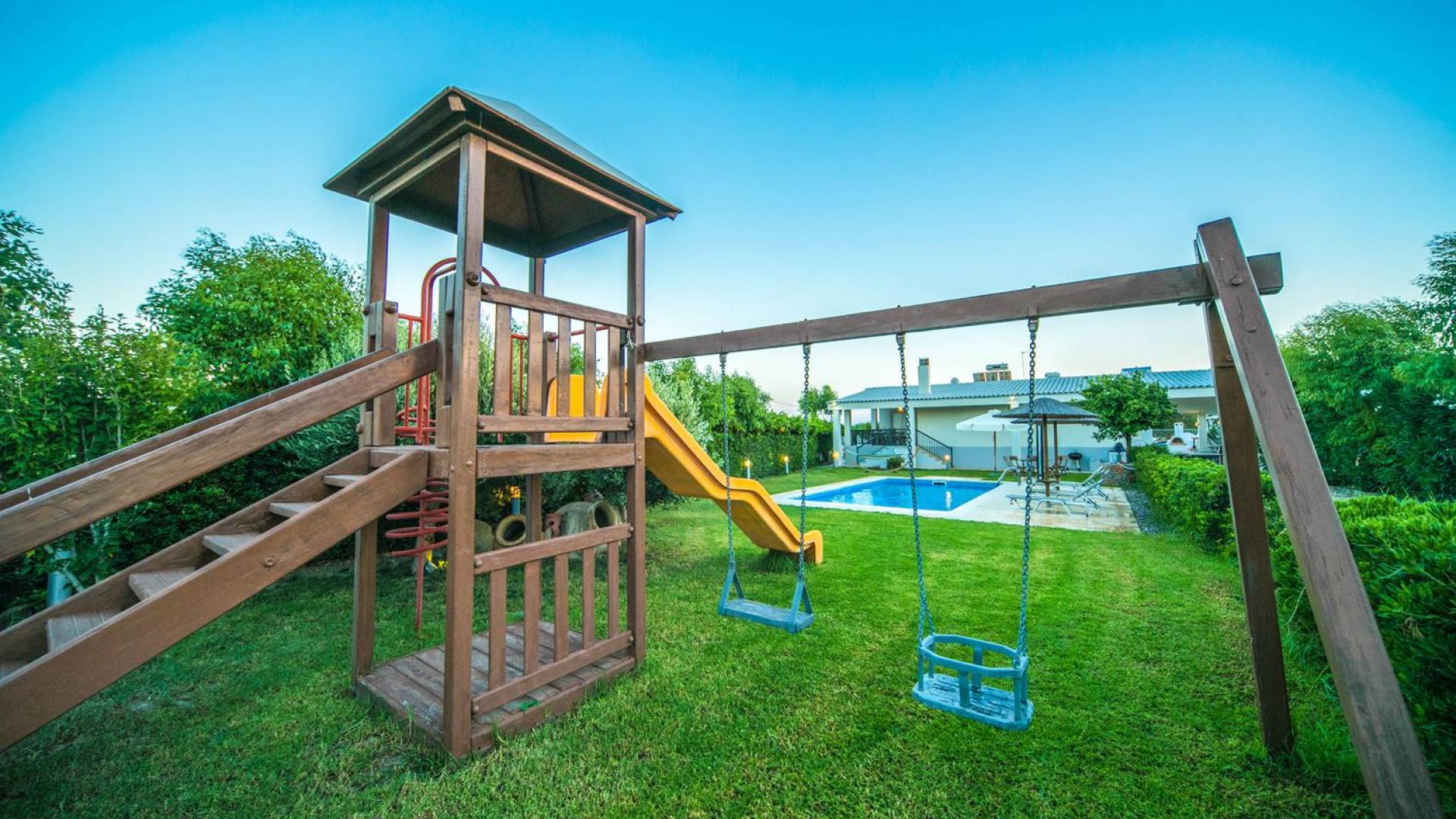 The property is set in the garden ground with native vegetation, large lawn areas, mature trees, a totally new swimming pool, a playground, and a built-in BBQ place. A modernly designed home offers guests the chance to relax inside watching tv or sitting on the veranda overlooking the Mediterranean Sea. The garden is ideal for children to play with and for adults to sunbathe. The extra mobile BBQ and the dining table in the garden is easy solution for lunch or dinner.