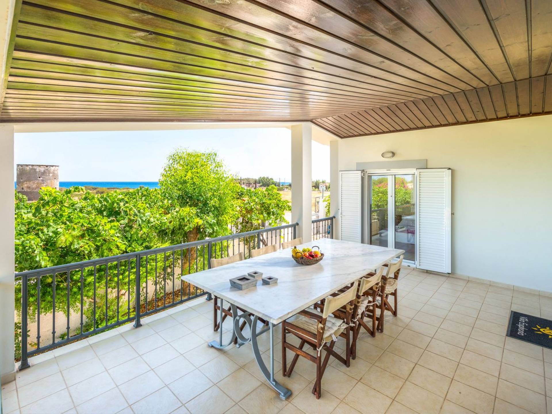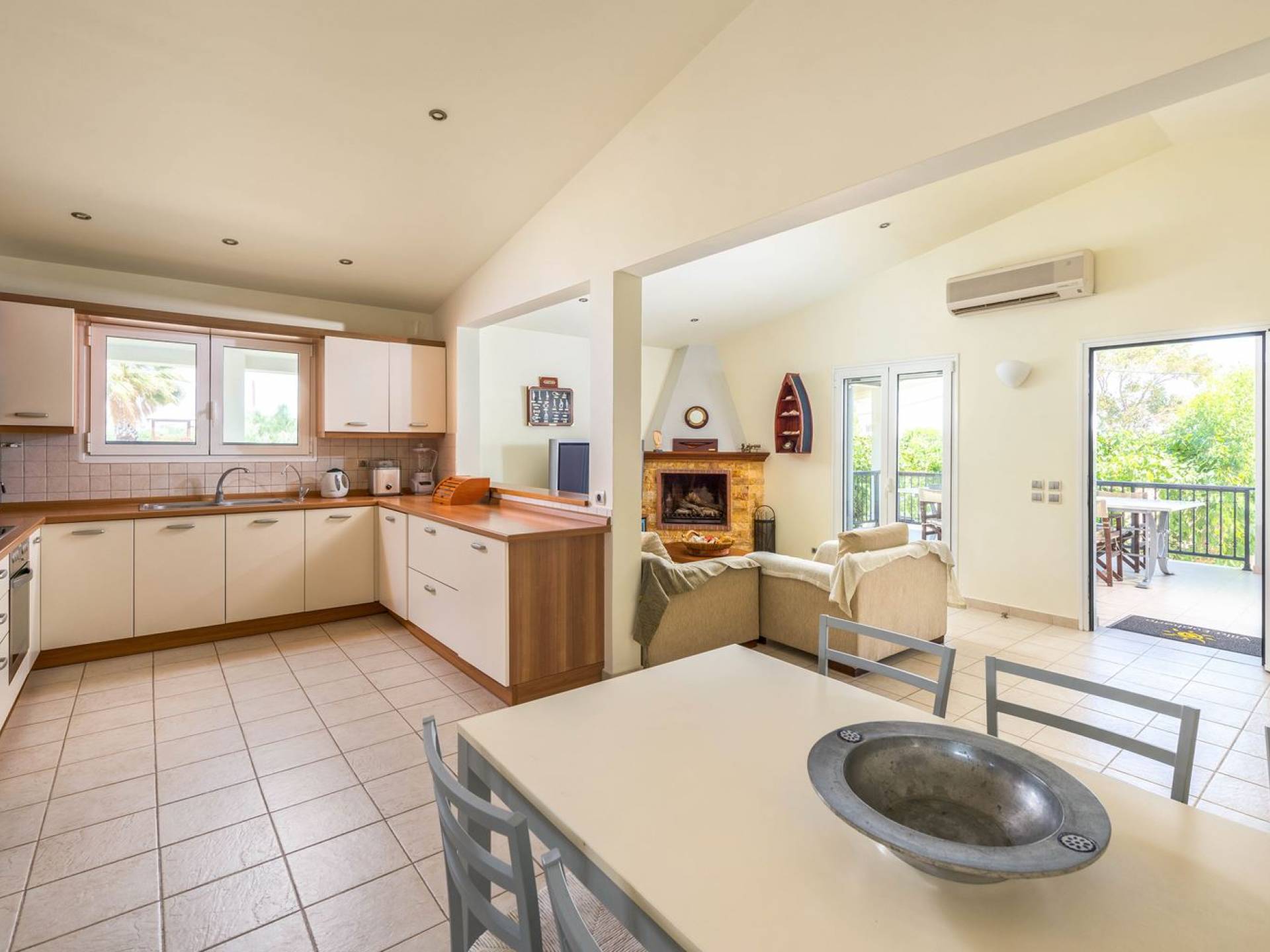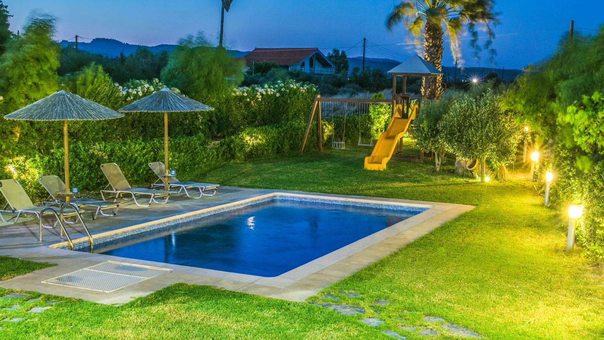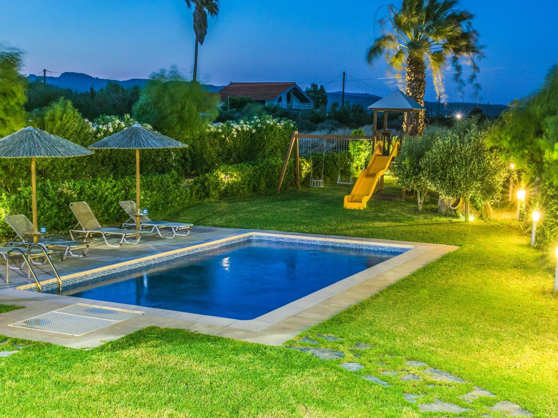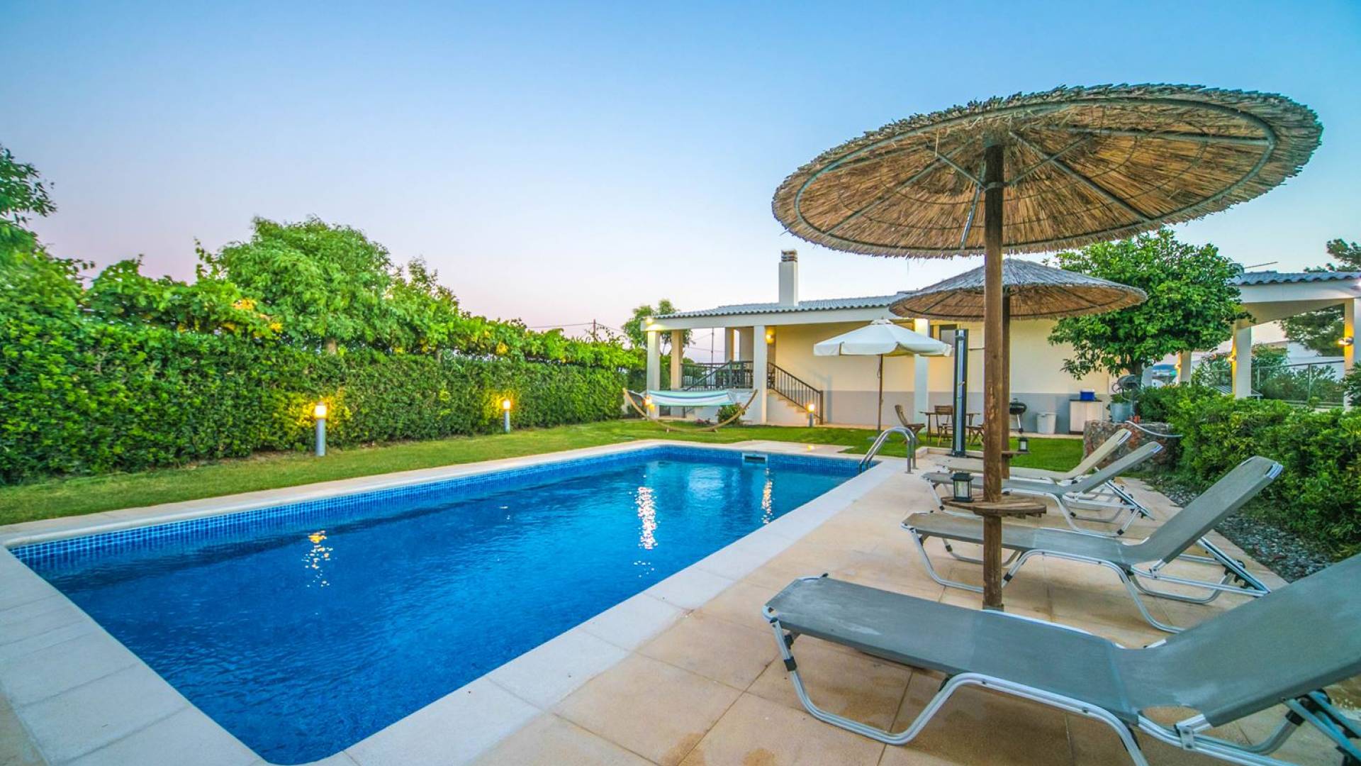 The property is set in the garden ground with native vegetation, large lawn areas, mature trees, a totally new swimming pool, a playground, and a built-in BBQ place. A modernly designed home offers guests the chance to relax inside watching tv or sitting on the veranda overlooking the Mediterranean Sea. The garden is ideal for children to play with and for adults to sunbathe. The extra mobile BBQ and the dining table in the garden is easy solution for lunch or dinner.