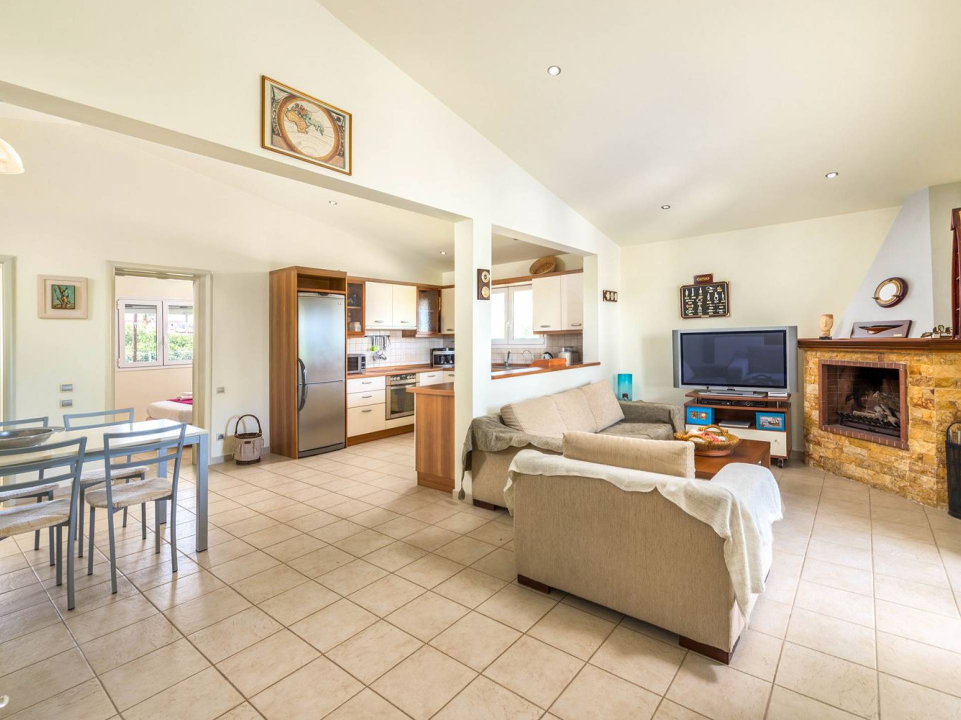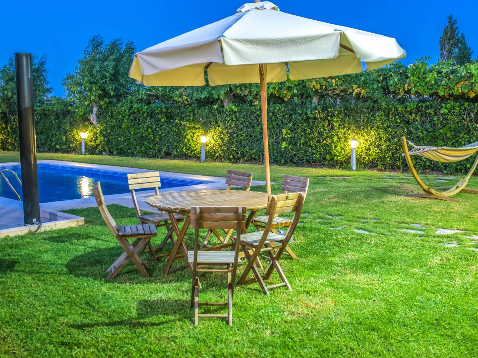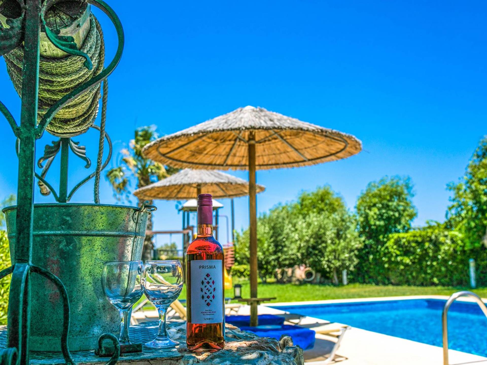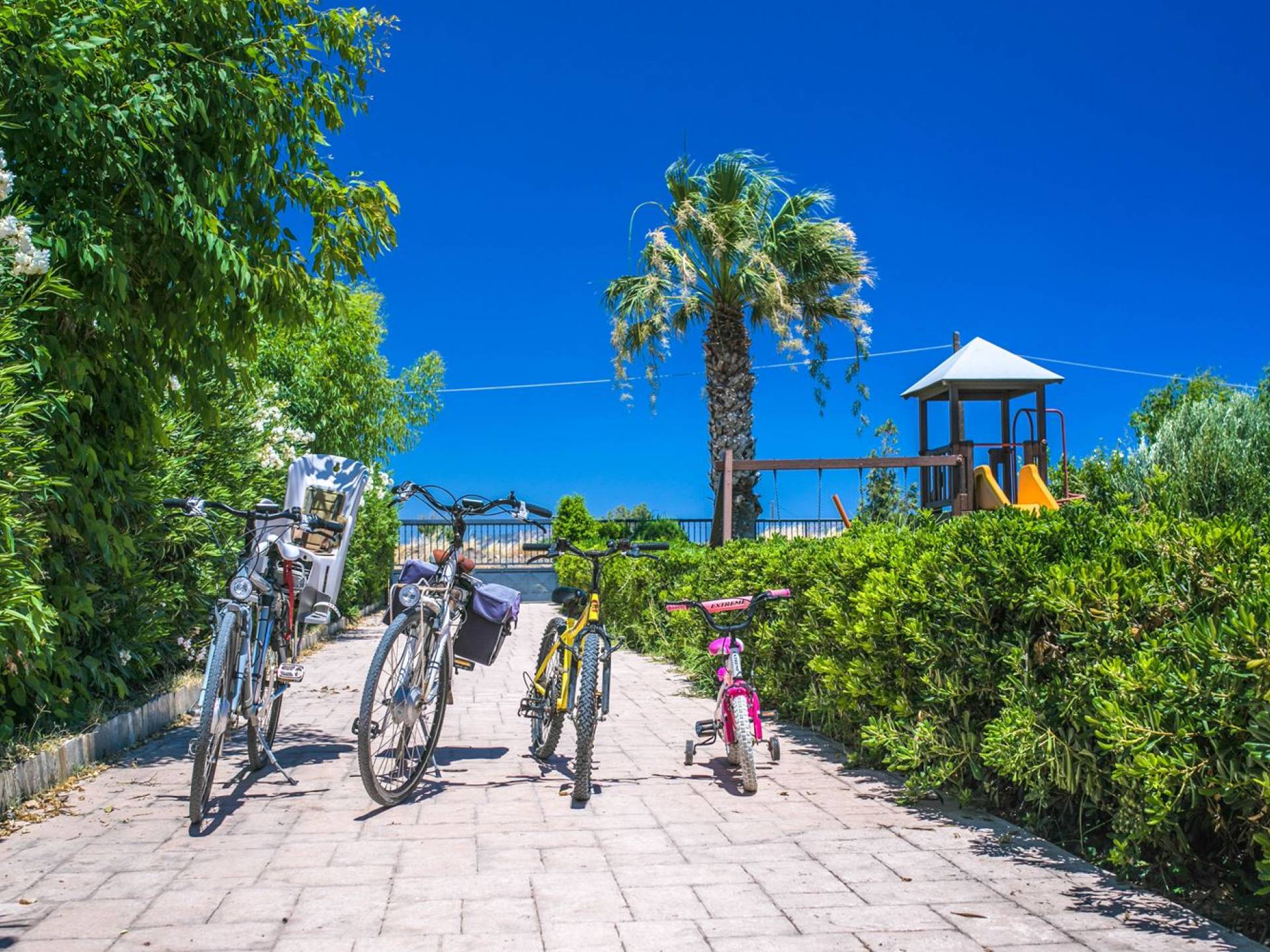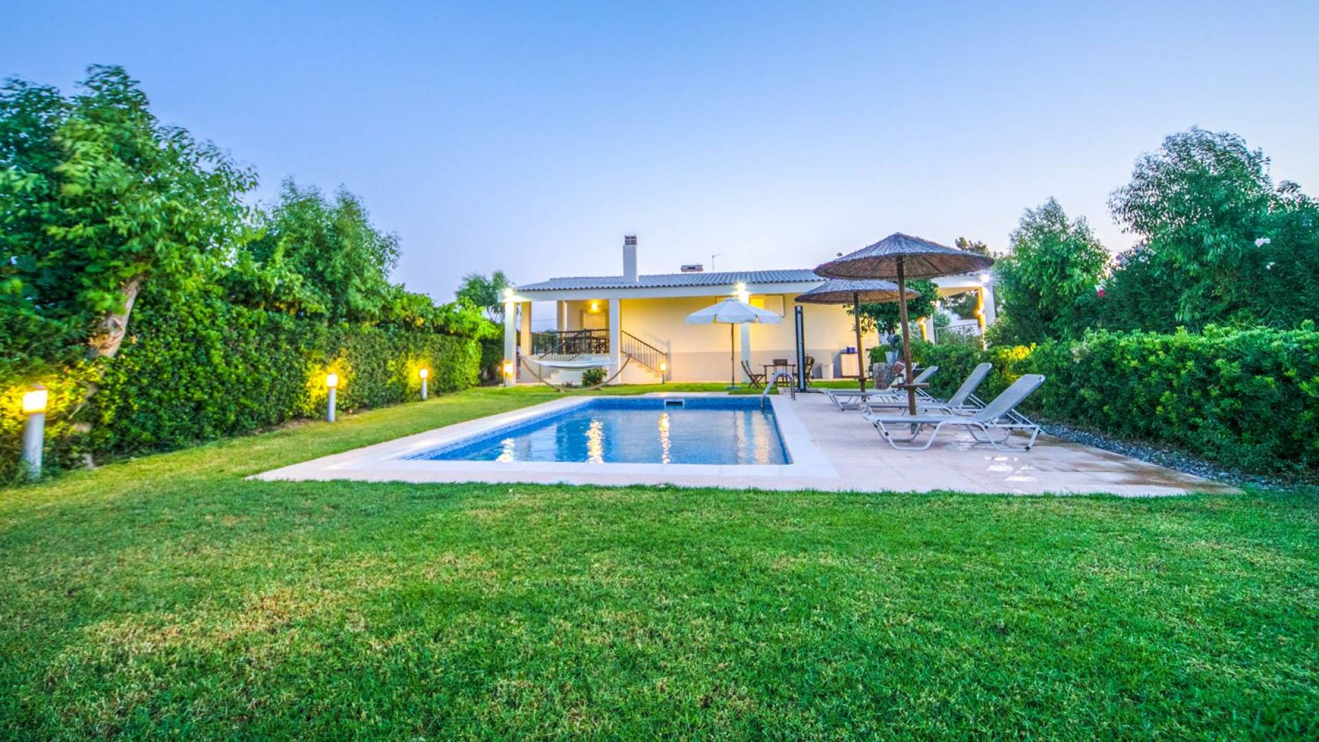 The property is set in the garden ground with native vegetation, large lawn areas, mature trees, a totally new swimming pool, a playground, and a built-in BBQ place. A modernly designed home offers guests the chance to relax inside watching tv or sitting on the veranda overlooking the Mediterranean Sea. The garden is ideal for children to play with and for adults to sunbathe. The extra mobile BBQ and the dining table in the garden is easy solution for lunch or dinner.
