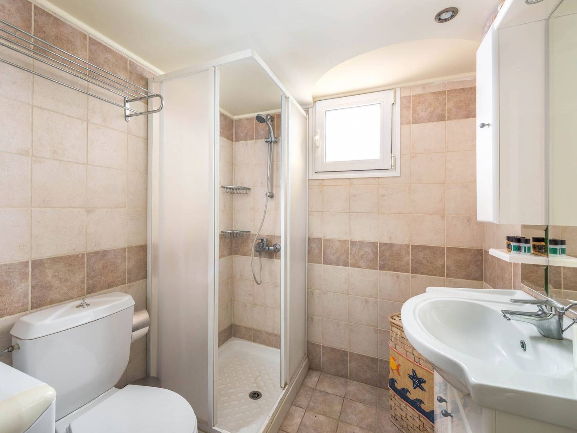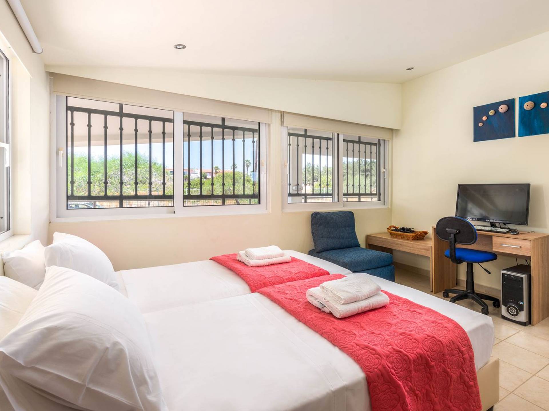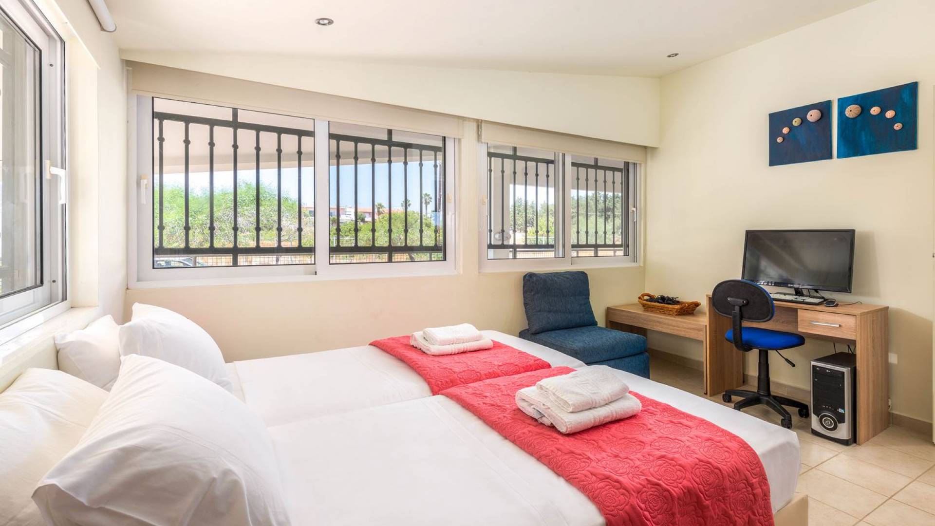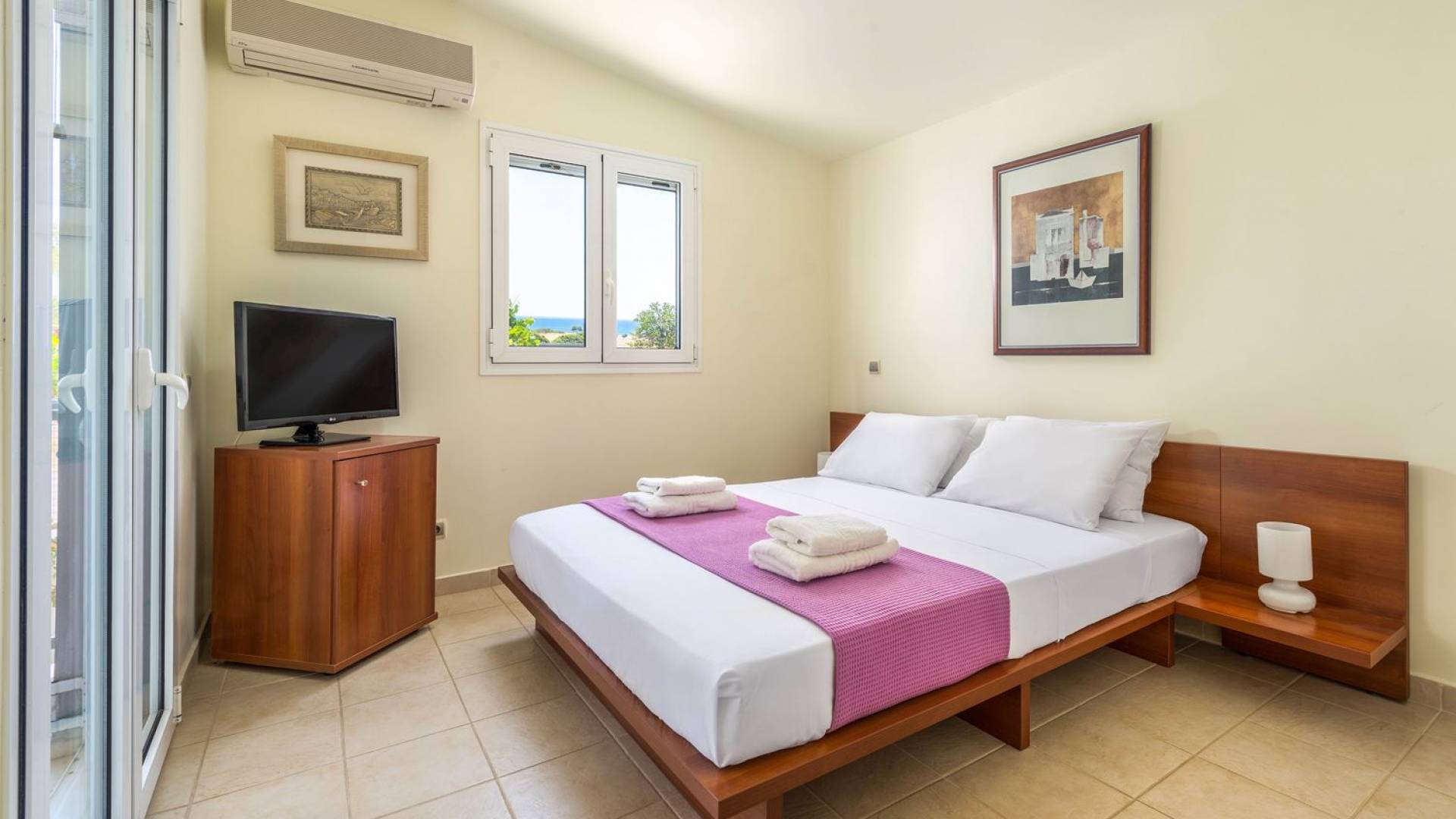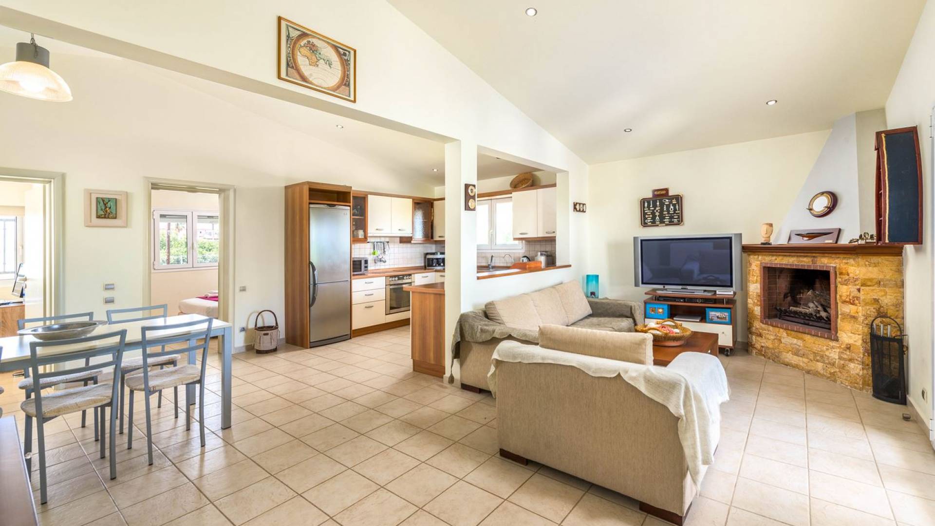 The property is set in the garden ground with native vegetation, large lawn areas, mature trees, a totally new swimming pool, a playground, and a built-in BBQ place. A modernly designed home offers guests the chance to relax inside watching tv or sitting on the veranda overlooking the Mediterranean Sea. The garden is ideal for children to play with and for adults to sunbathe. The extra mobile BBQ and the dining table in the garden is easy solution for lunch or dinner.