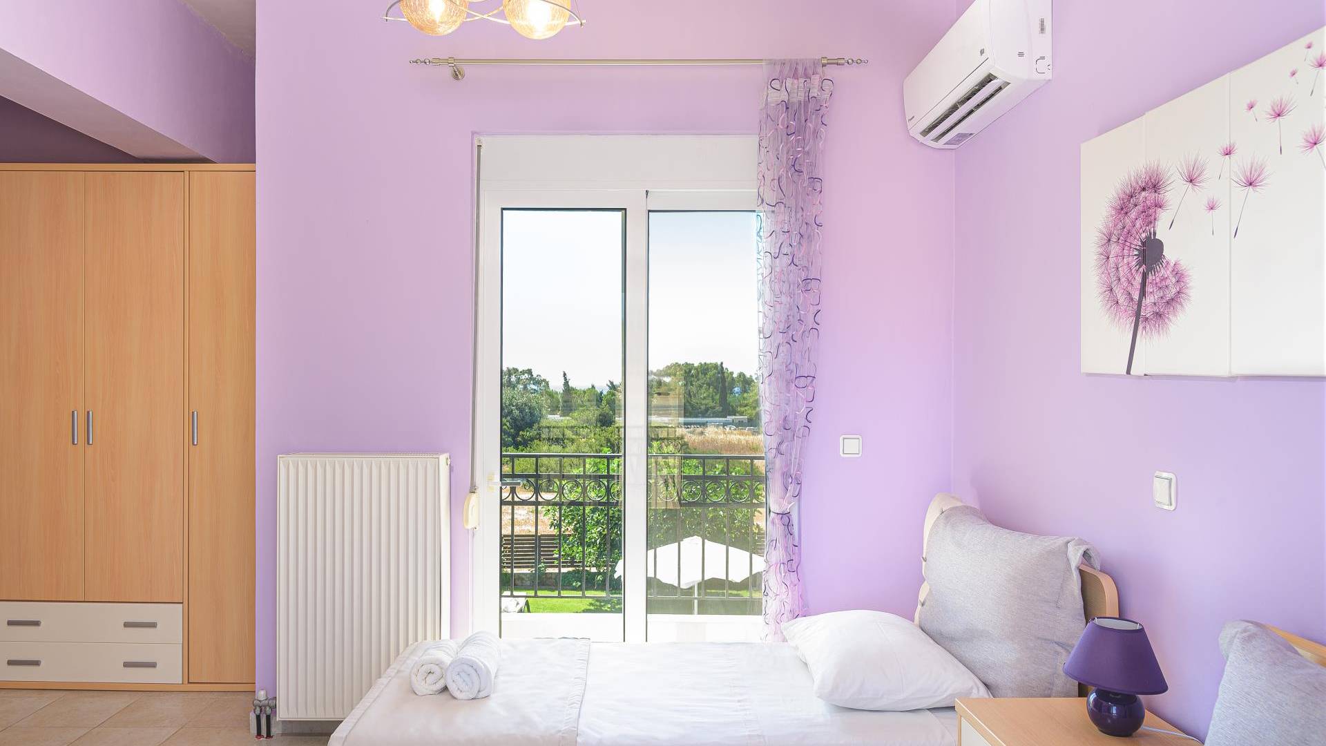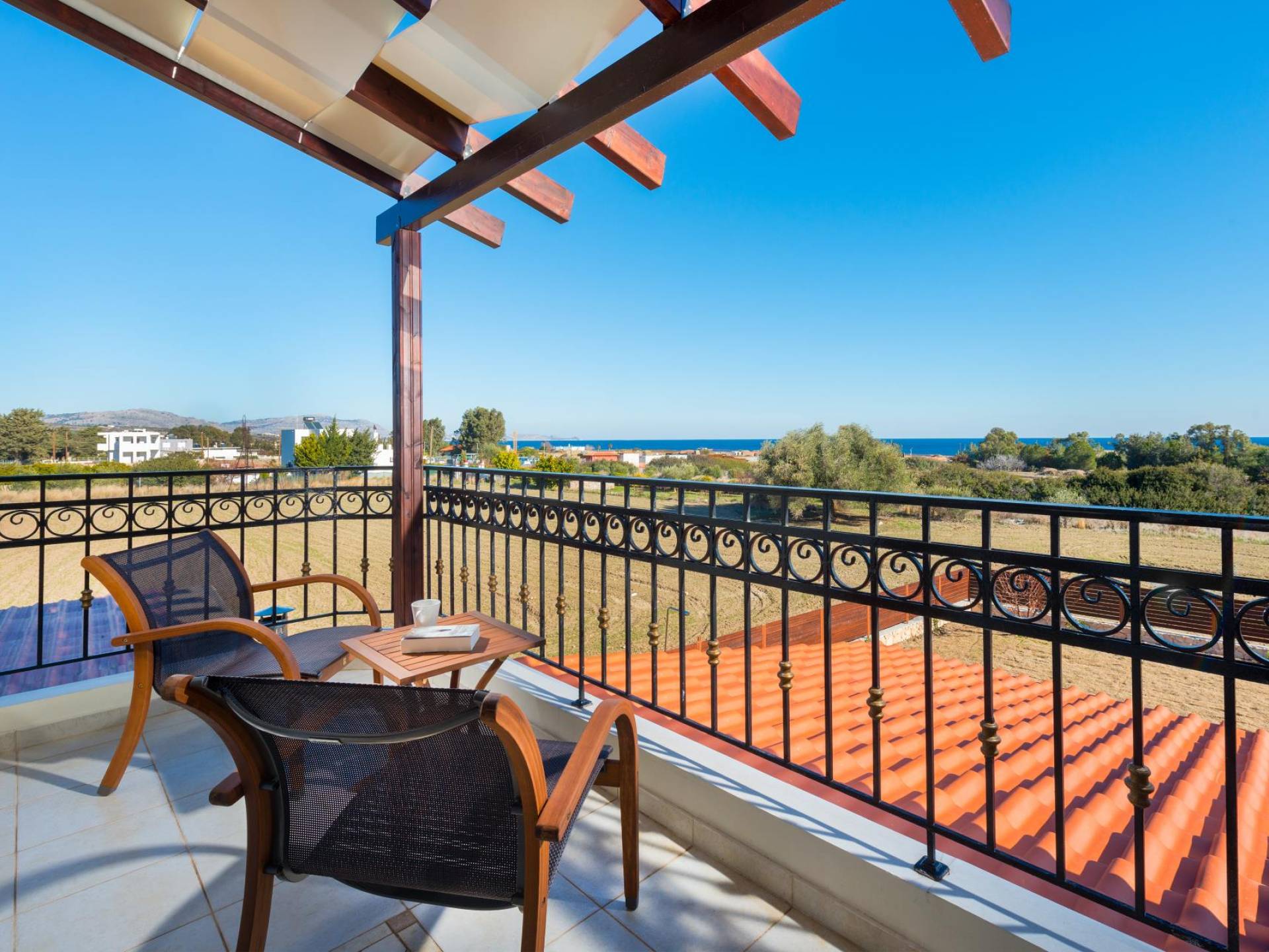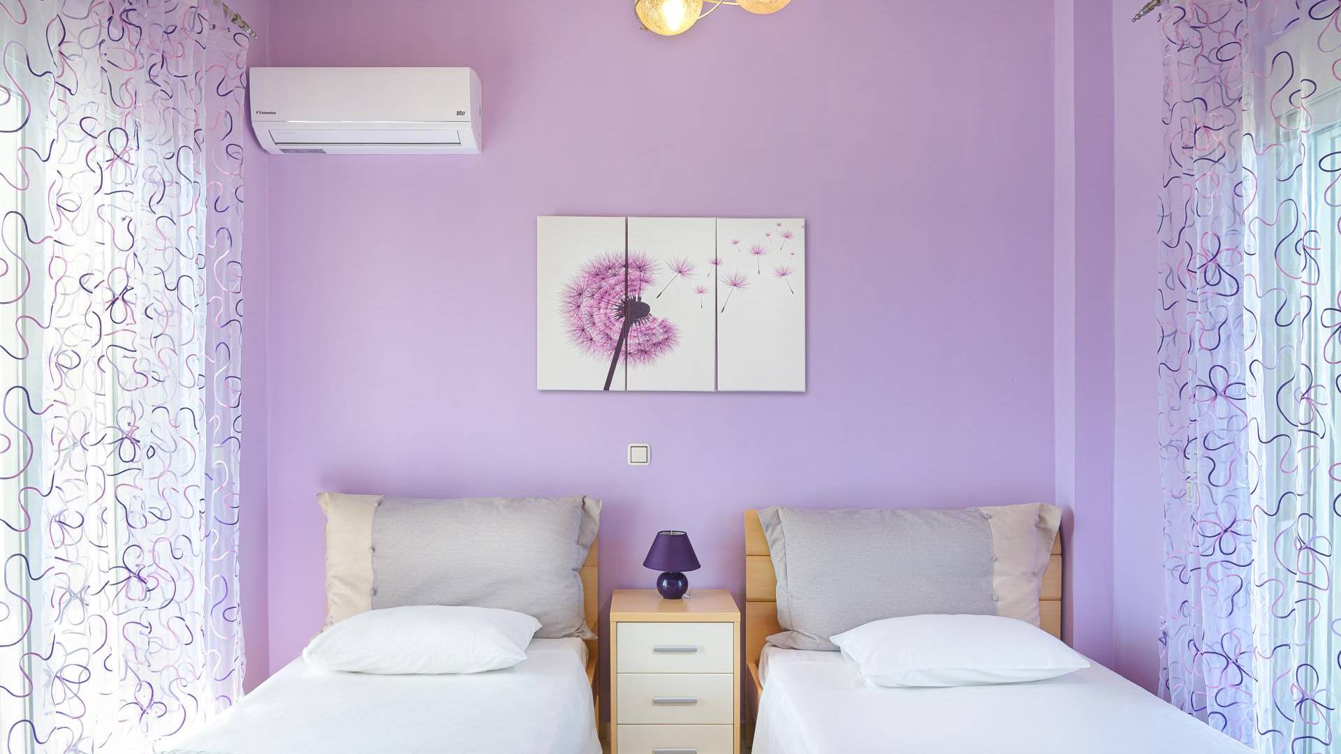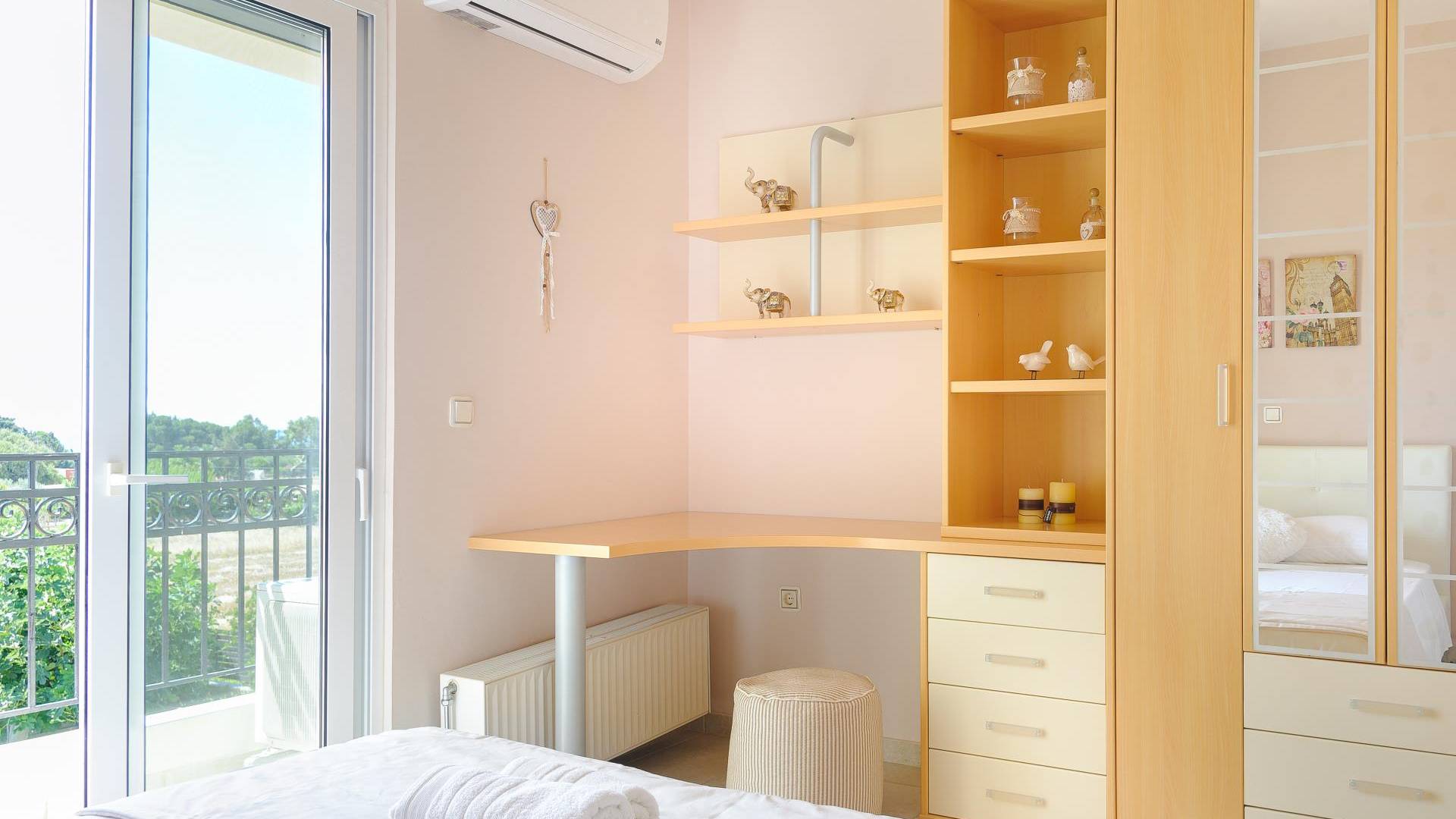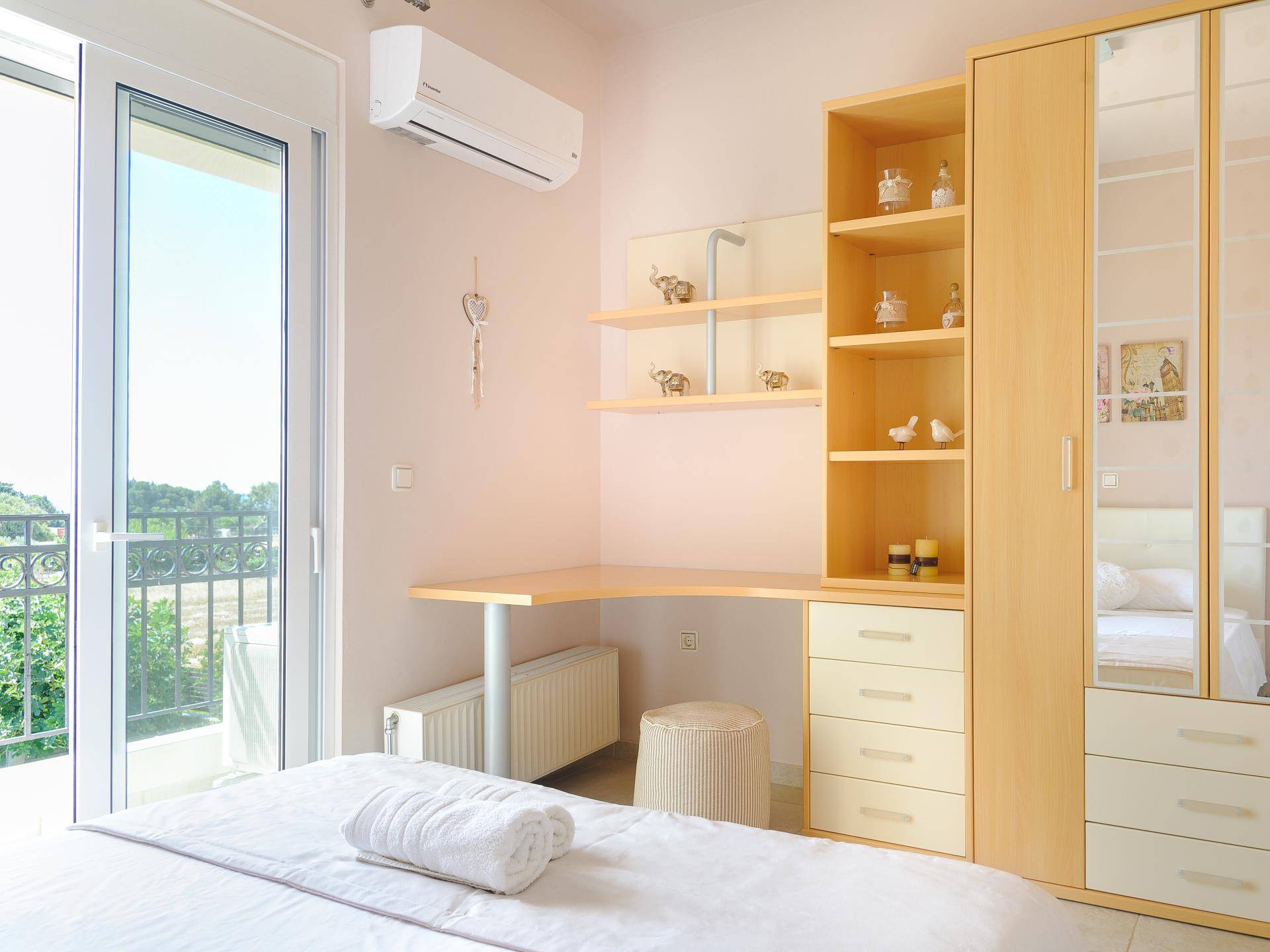 On the first floor, guests will find the master bedroom with a queen-size bed, a private WC with a shower, and a wardrobe with a full-size mirror. This bedroom has also a lovely covered balcony where guests can relax at the comfortable chairs overlooking the sea. it is provided with a plasma TV of 32''. At the same level, there are 2 more bedrooms with single beds and furnished with luminous colors. Finally, guests can find a large bathroom with a bathtub. All rooms have balconies on both sides, overlooking the sea and the garden with a pool or the garden.