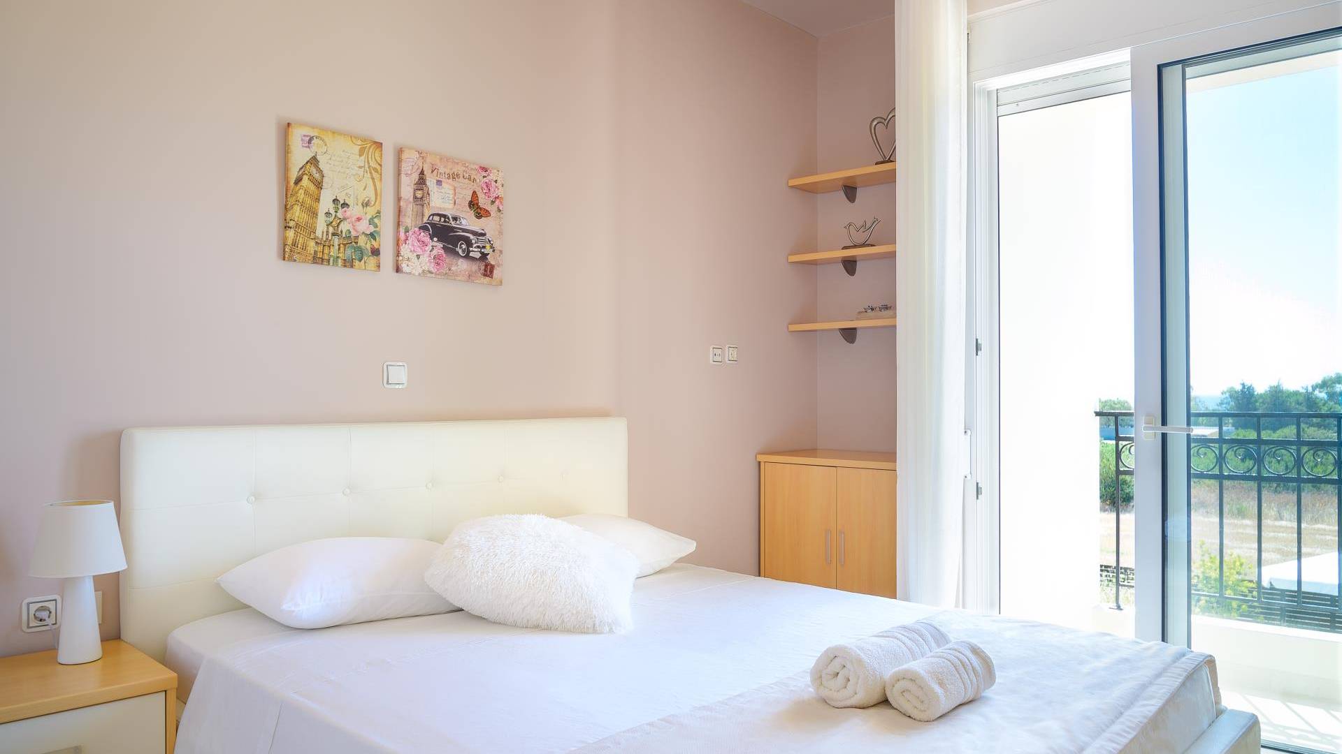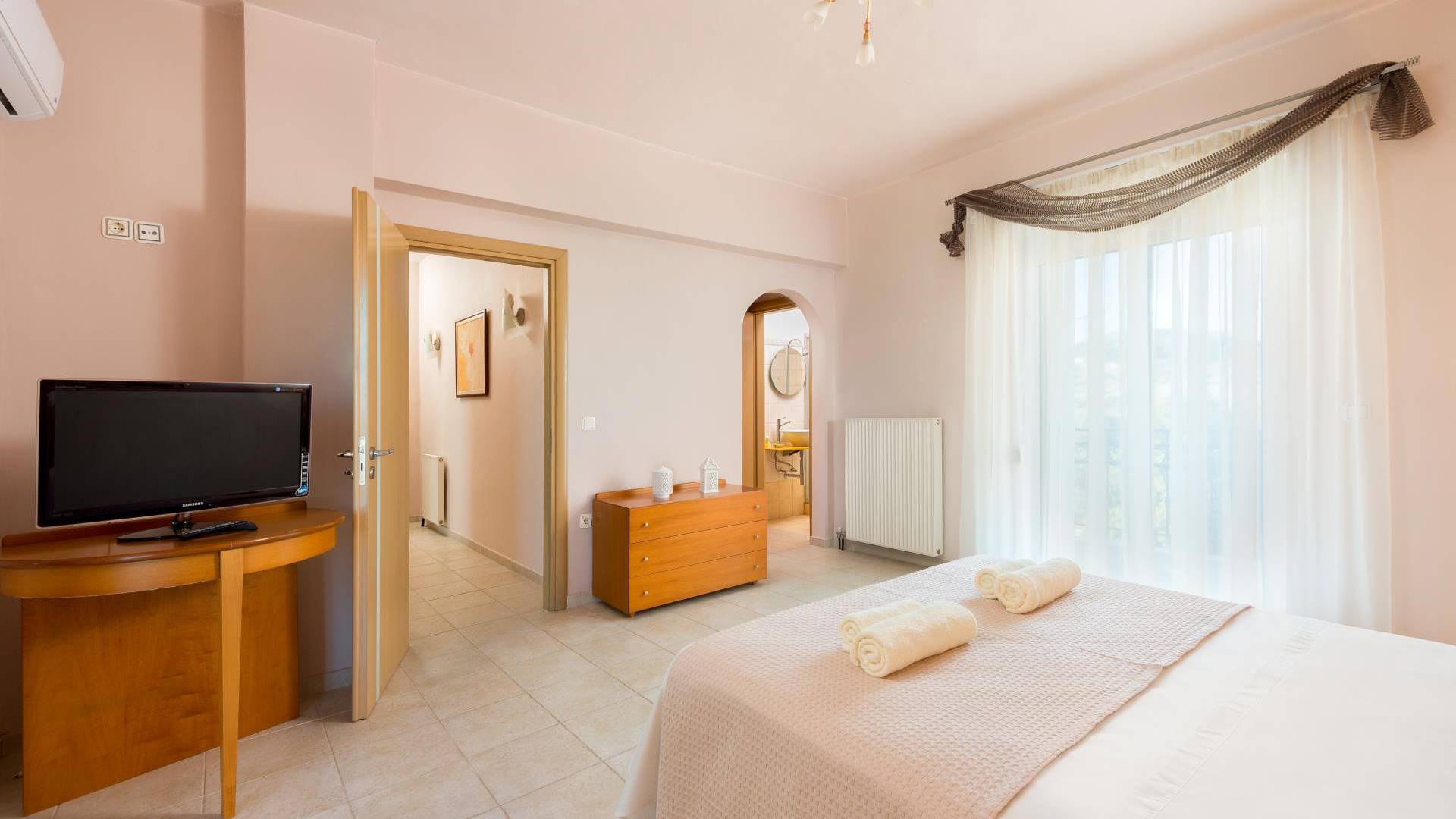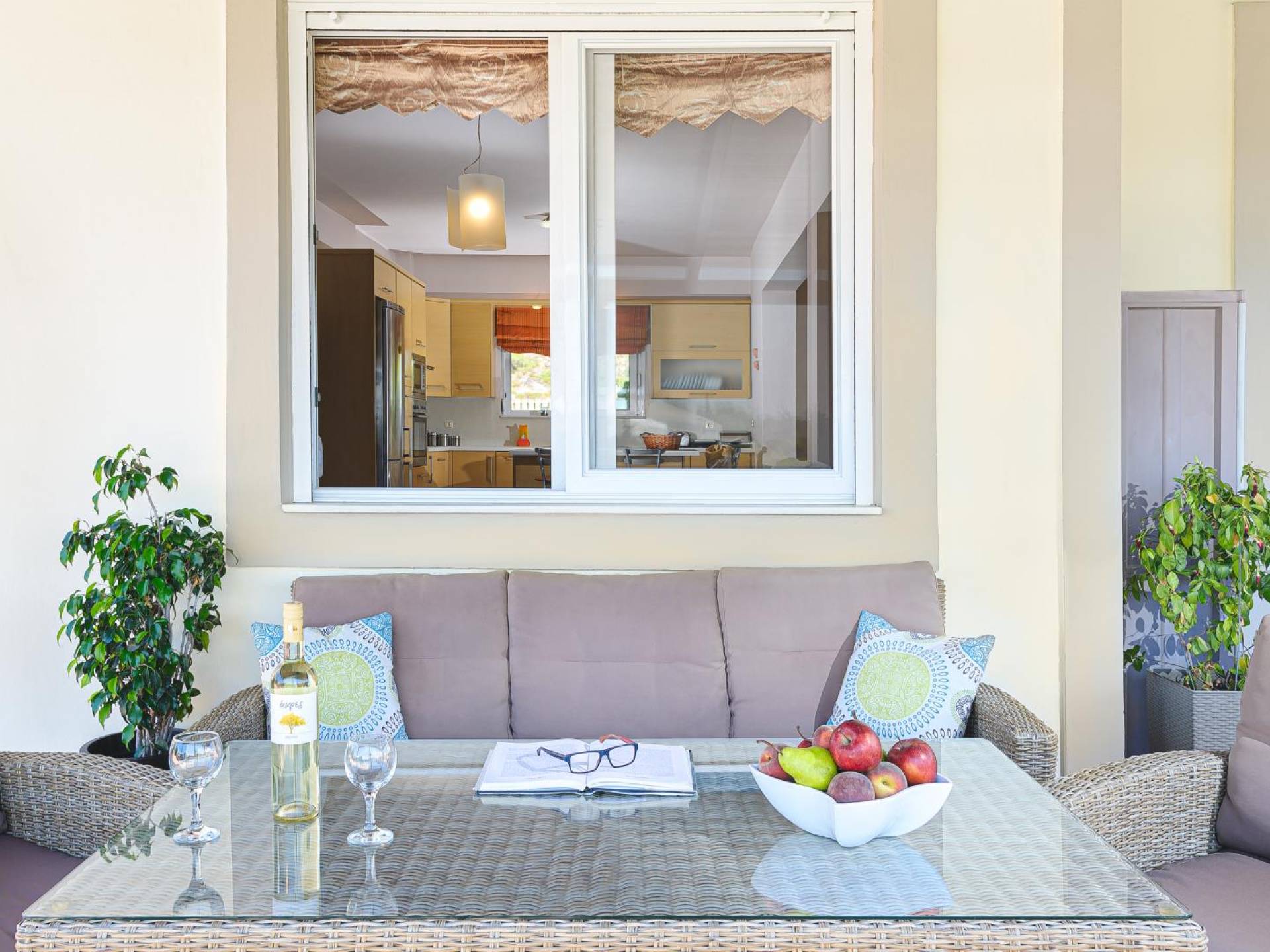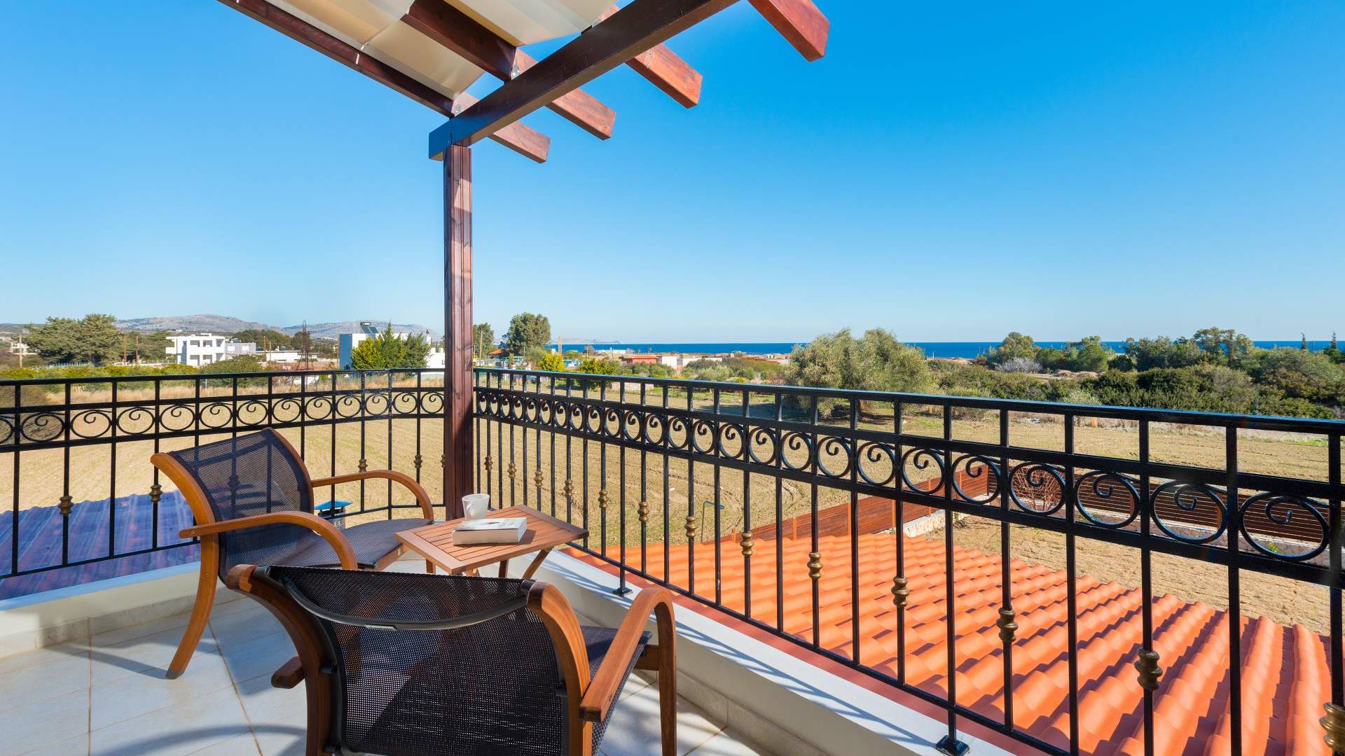 On the first floor, guests will find the master bedroom with a queen-size bed, a private WC with a shower, and a wardrobe with a full-size mirror. This bedroom has also a lovely covered balcony where guests can relax at the comfortable chairs overlooking the sea. it is provided with a plasma TV of 32''. At the same level, there are 2 more bedrooms with single beds and furnished with luminous colors. Finally, guests can find a large bathroom with a bathtub. All rooms have balconies on both sides, overlooking the sea and the garden with a pool or the garden.