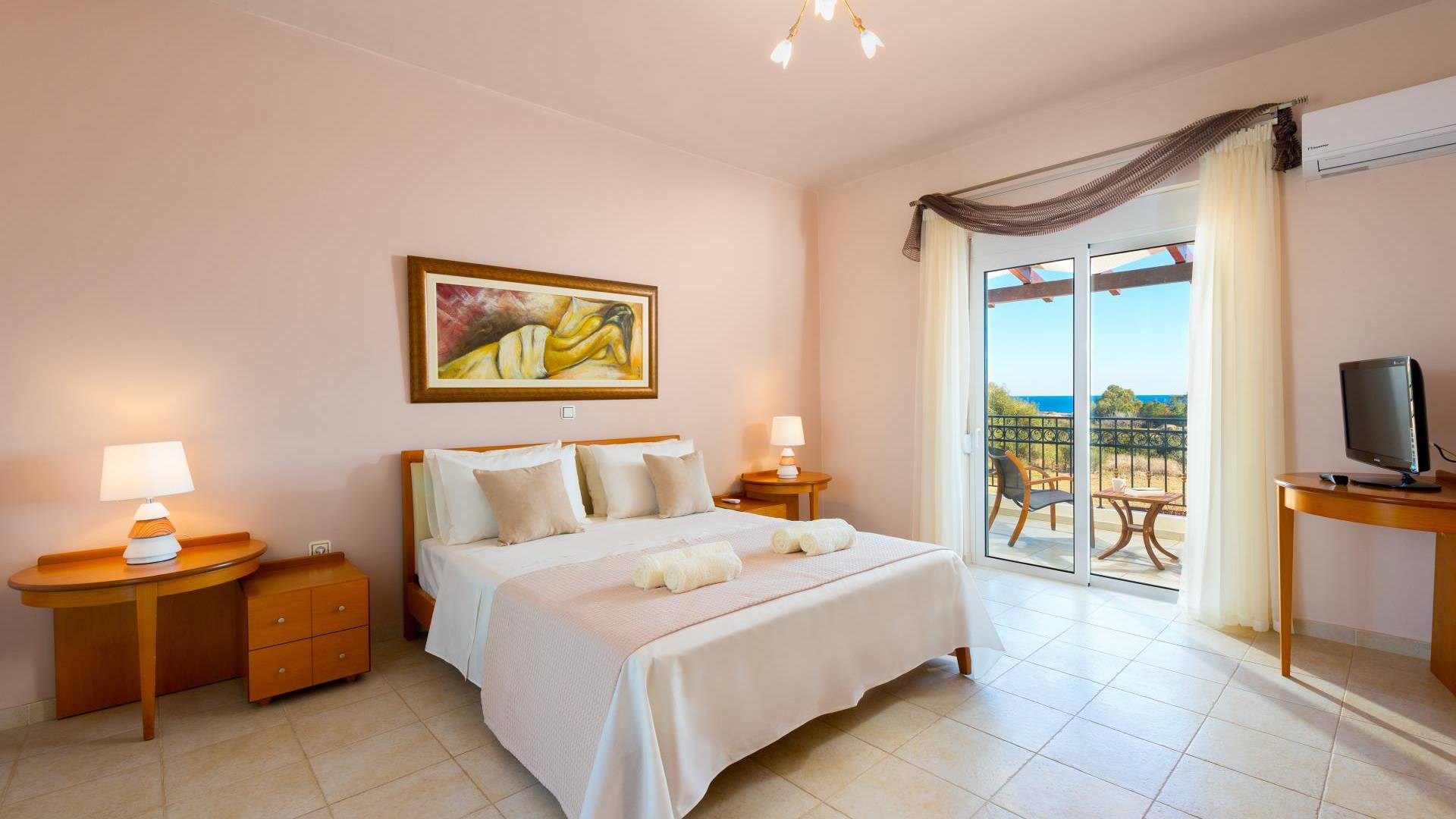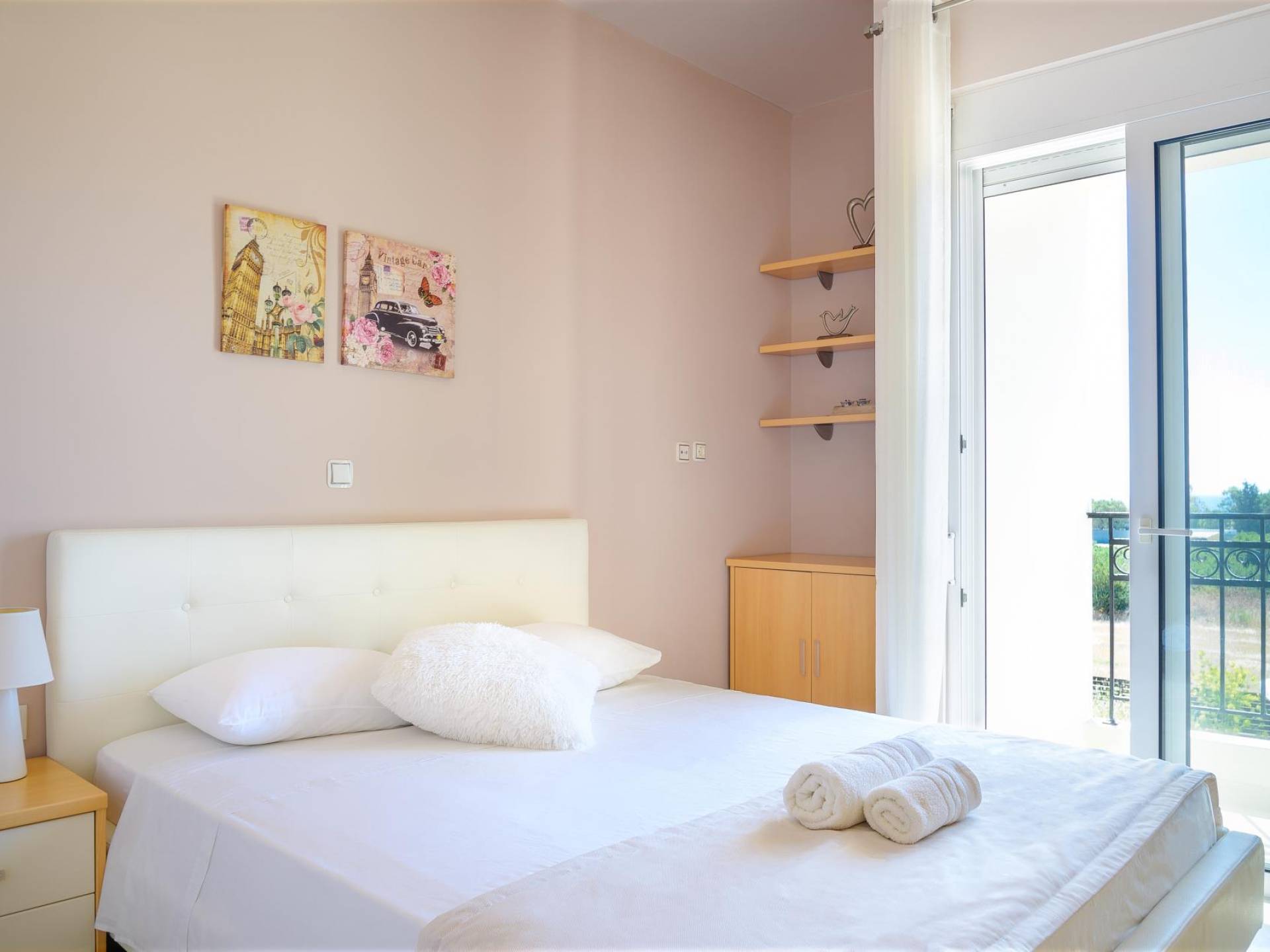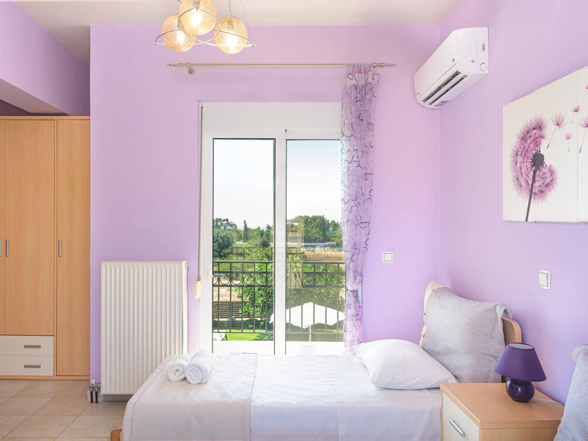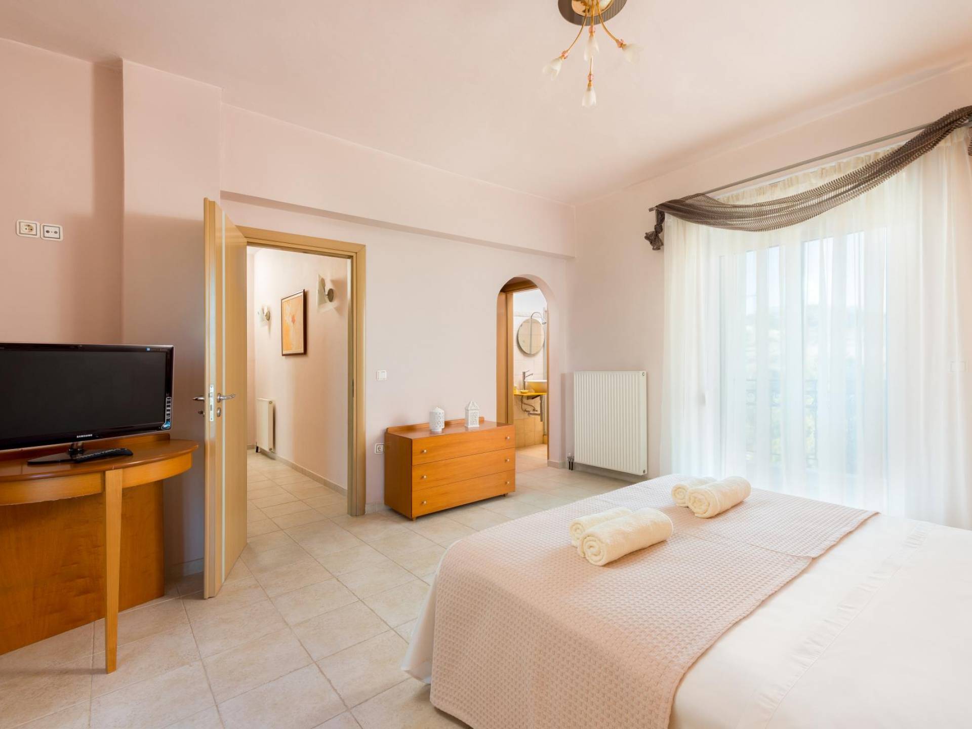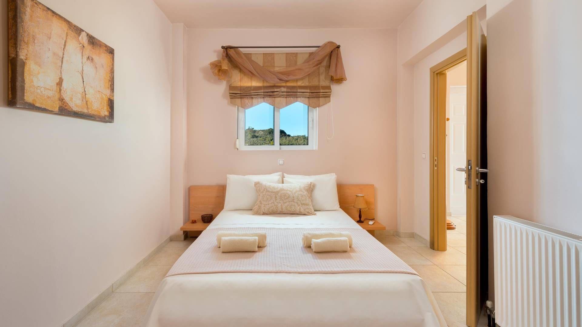 On the first floor, guests will find the master bedroom with a queen-size bed, a private WC with a shower, and a wardrobe with a full-size mirror. This bedroom has also a lovely covered balcony where guests can relax at the comfortable chairs overlooking the sea. it is provided with a plasma TV of 32''. At the same level, there are 2 more bedrooms with single beds and furnished with luminous colors. Finally, guests can find a large bathroom with a bathtub. All rooms have balconies on both sides, overlooking the sea and the garden with a pool or the garden.