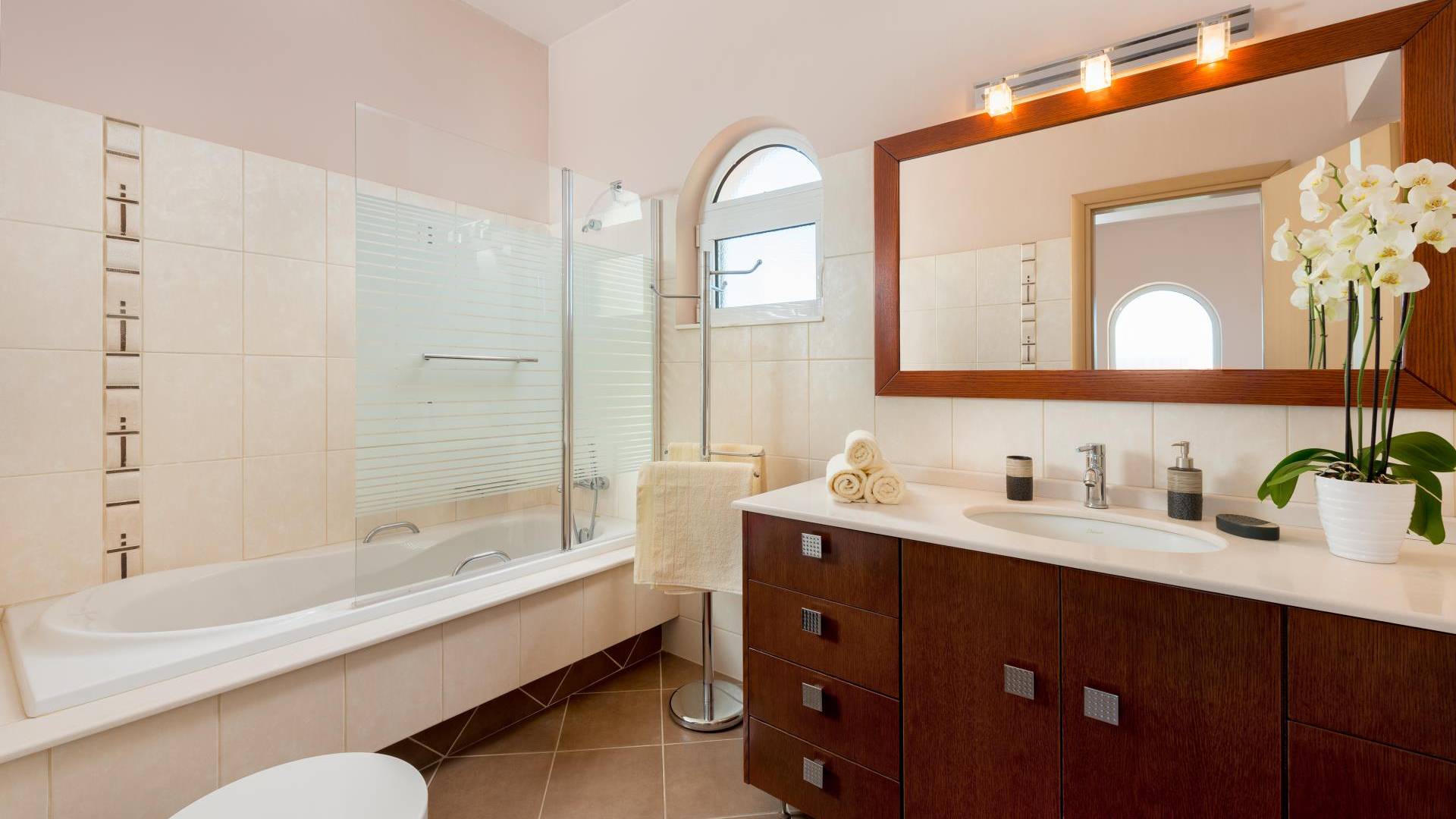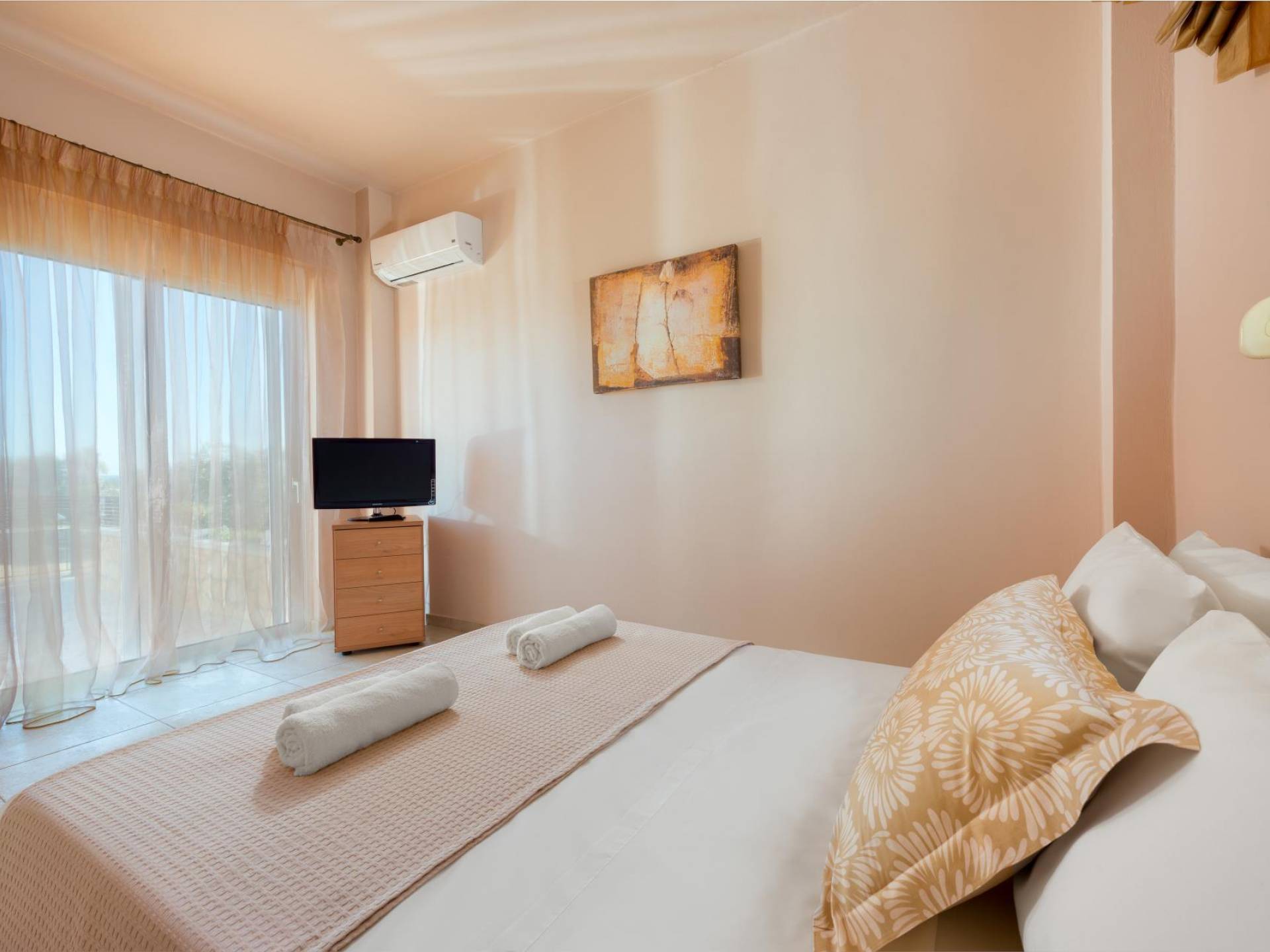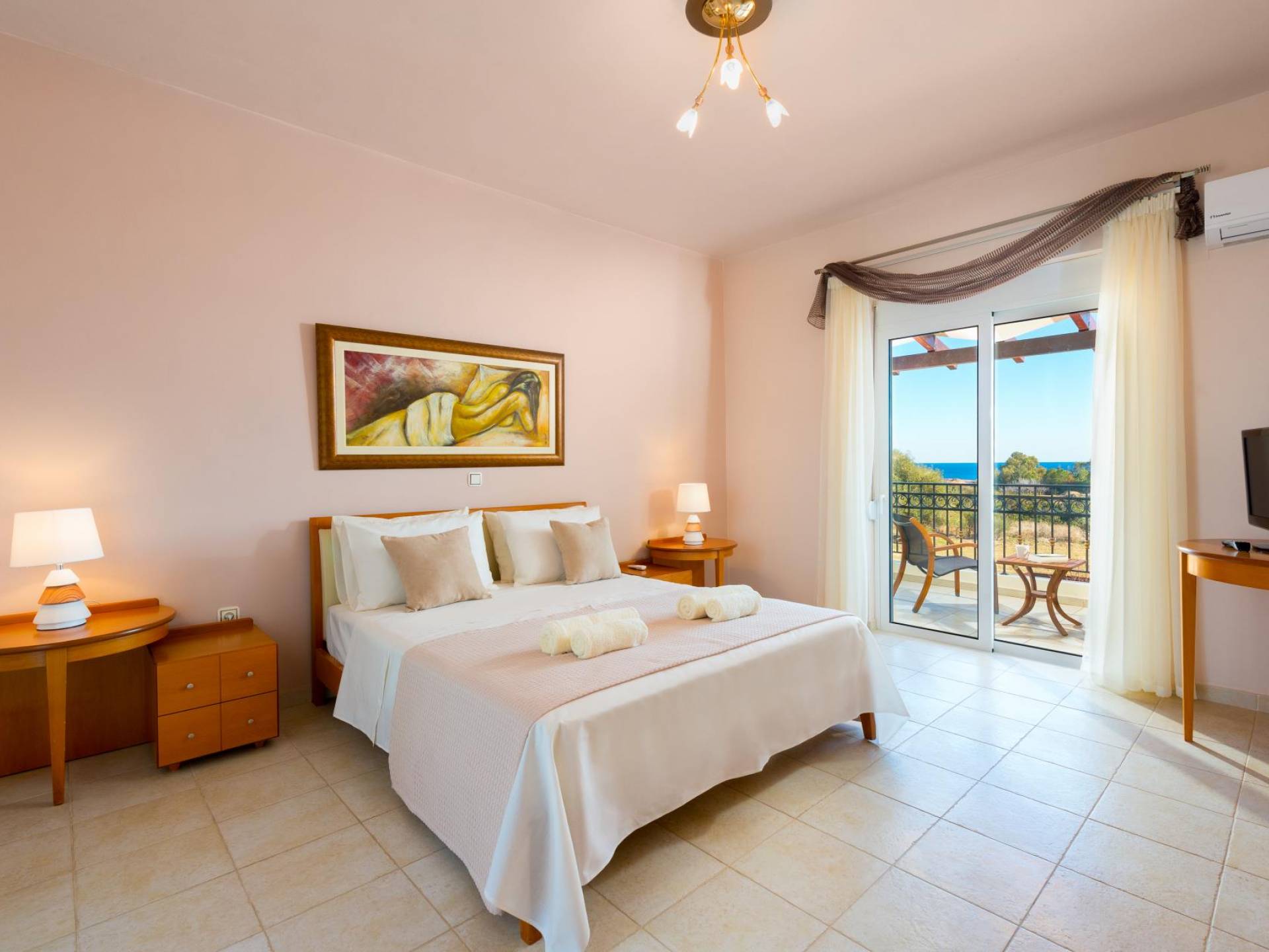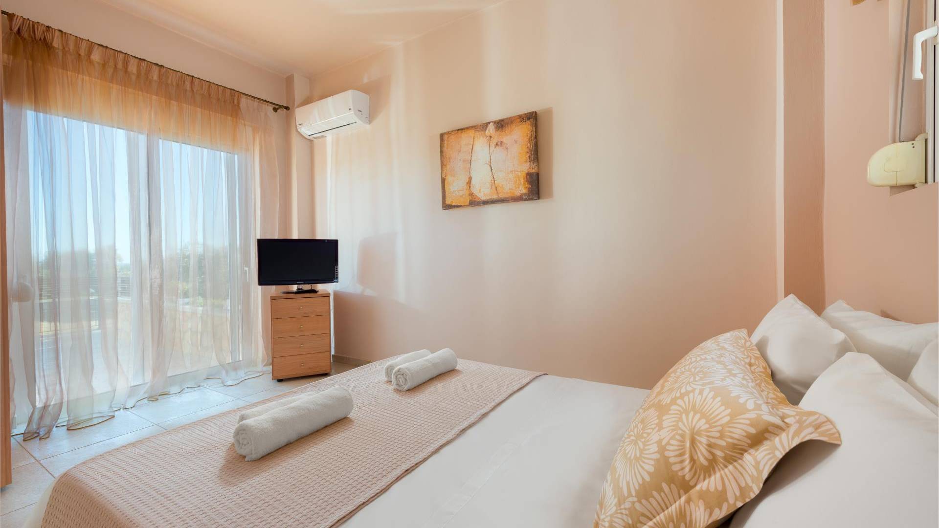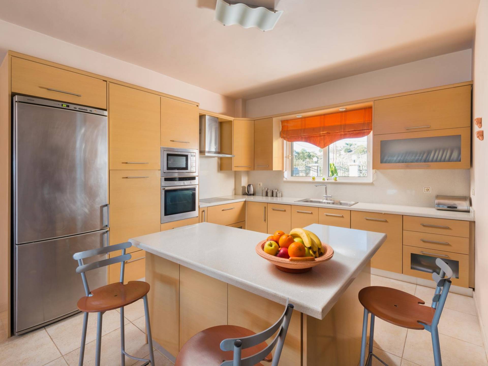 On the first floor, guests will find the master bedroom with a queen-size bed, a private WC with a shower, and a wardrobe with a full-size mirror. This bedroom has also a lovely covered balcony where guests can relax at the comfortable chairs overlooking the sea. it is provided with a plasma TV of 32''. At the same level, there are 2 more bedrooms with single beds and furnished with luminous colors. Finally, guests can find a large bathroom with a bathtub. All rooms have balconies on both sides, overlooking the sea and the garden with a pool or the garden.