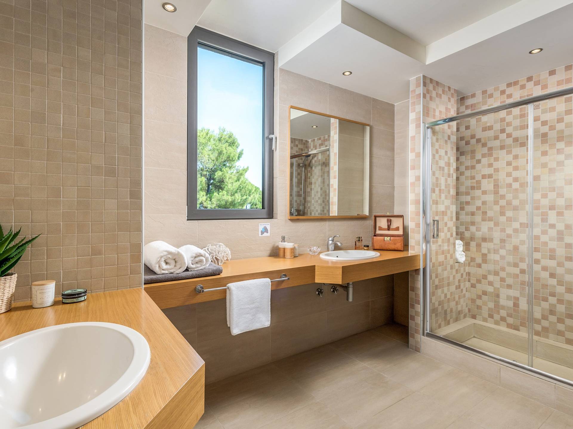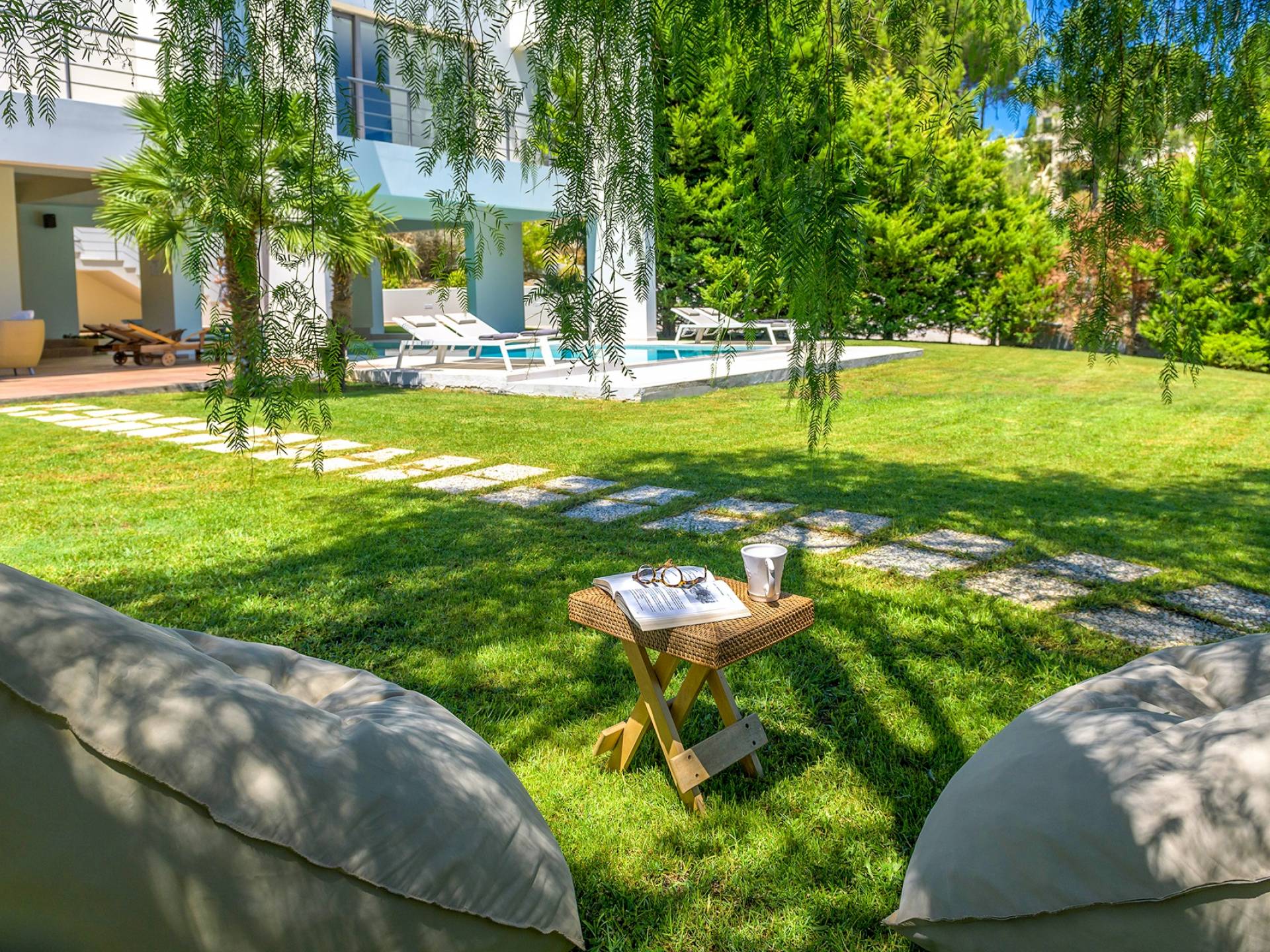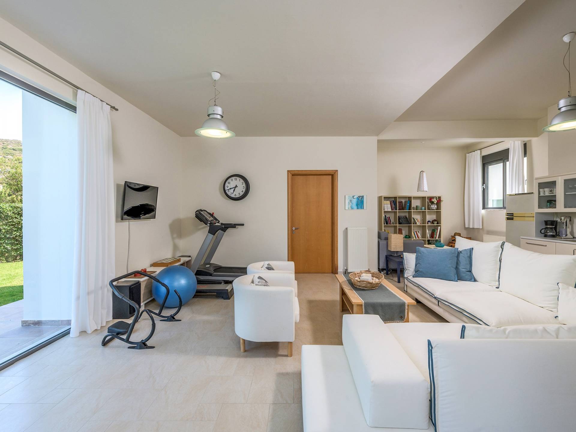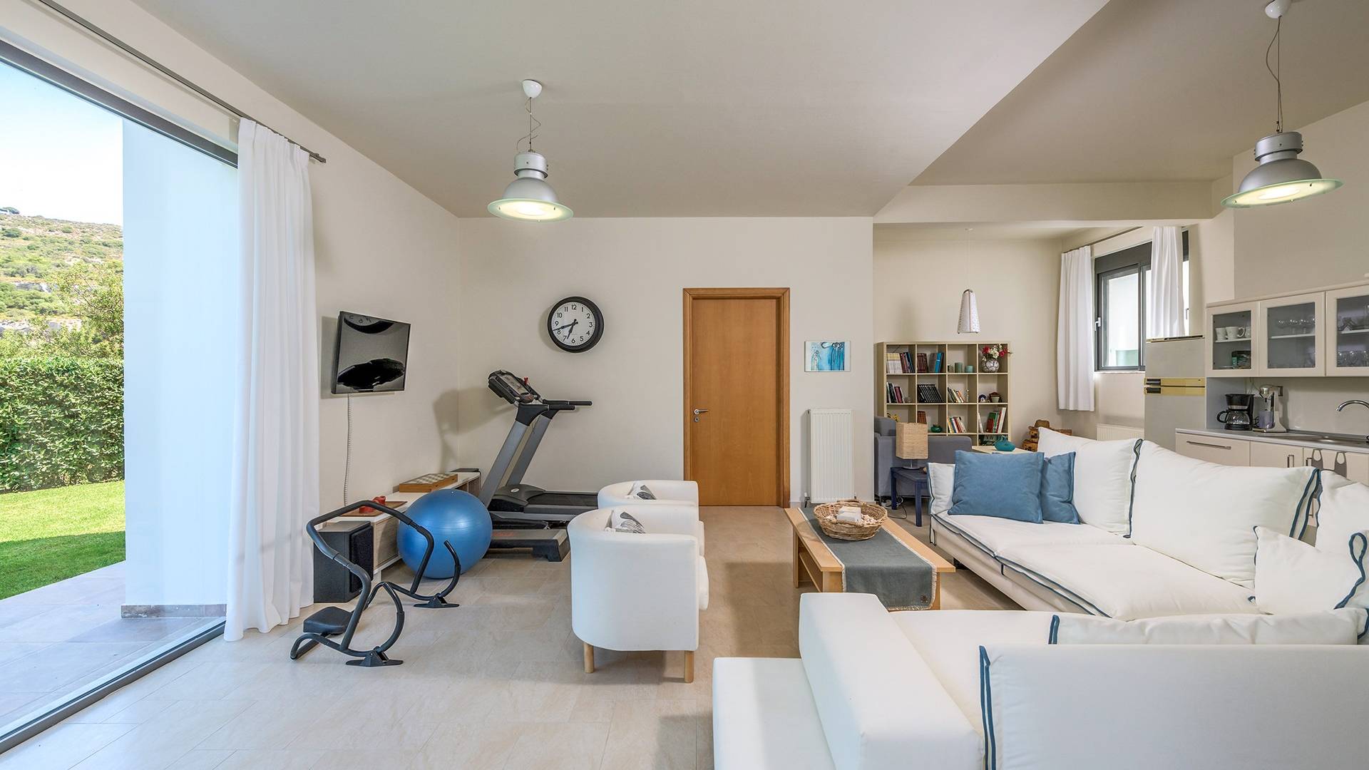 This beautifully crafted villa has 4 fully air-conditioned bedrooms, 3 double-bedded rooms, and 1 with twin beds. Also, there’s a comfy double sofa bed in the living room. Two of the bedrooms include ensuite bathrooms with showers. There’s another bathroom with a bathtub as well as a WC, all of great utility and comfort. There’s a fully equipped open plan kitchen, suitable for any meal preparation. Guests will find a friendly sitting area along with the living room that has a screen TV. There’s free Wi-Fi access throughout the property. The decoration is absolutely relaxing and peaceful with the warm colors and the minimal style.