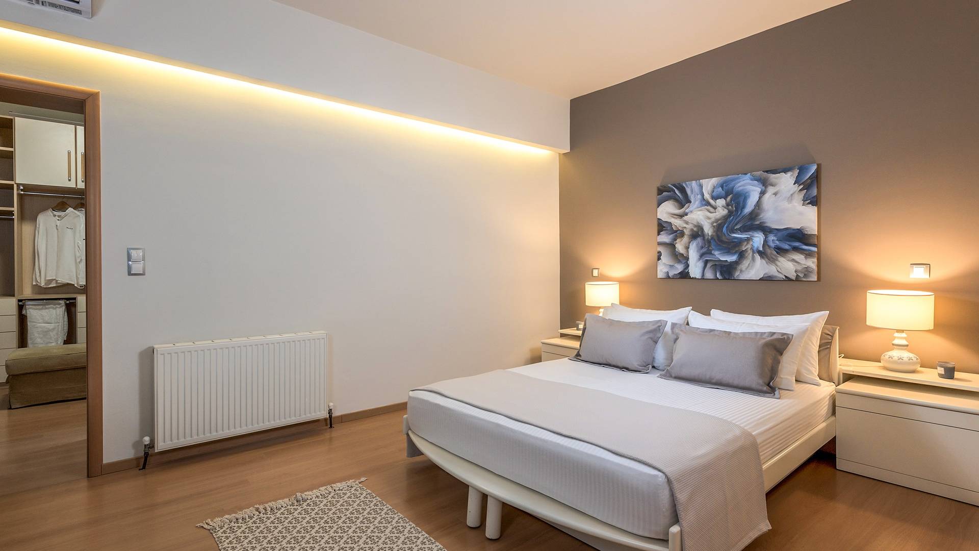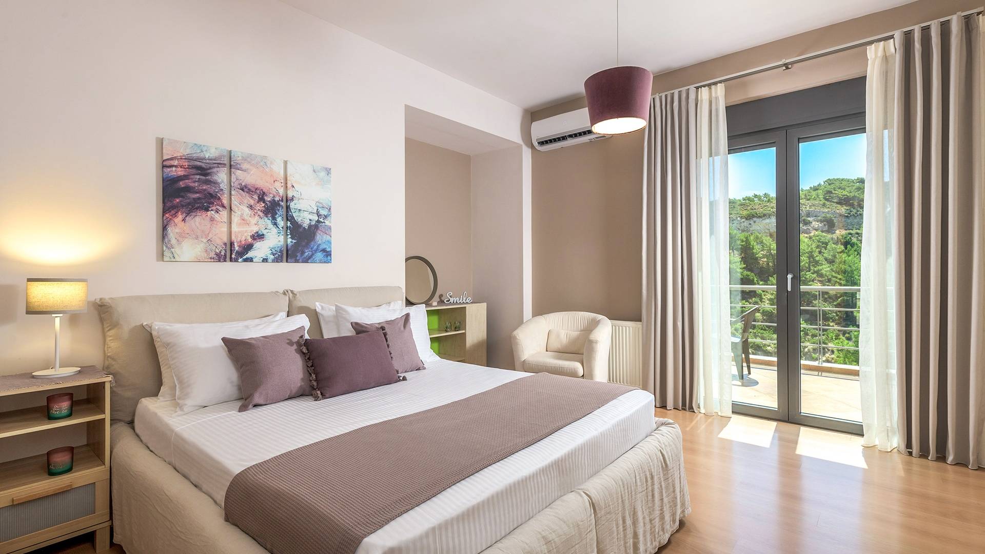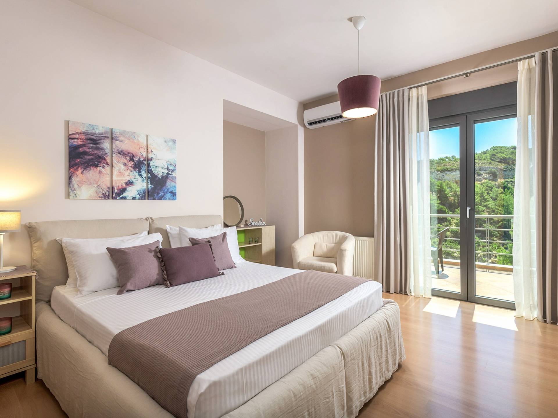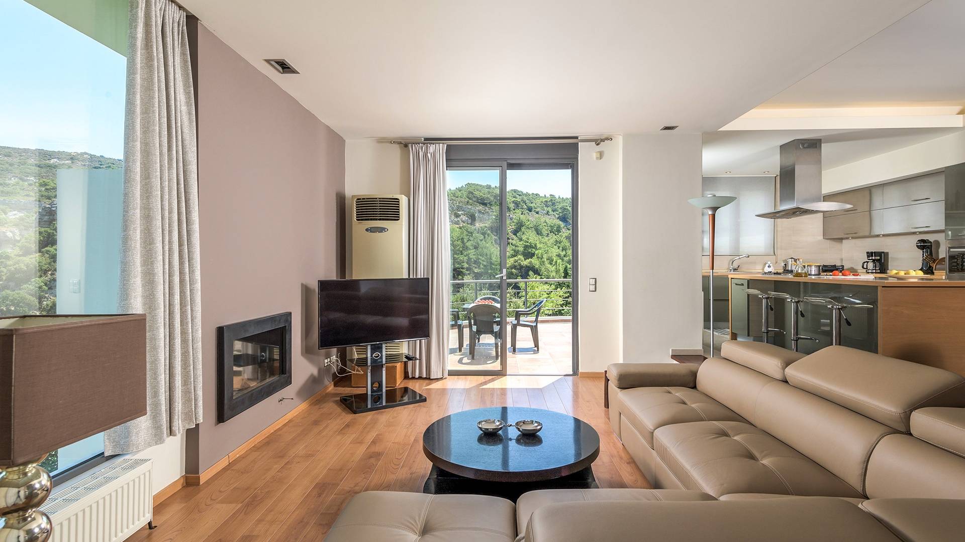 The broad balcony makes the ideal spot for enjoying the sea view and the magnificent sunset in the evening hours. Outdoors, there’s the private swimming pool with its sunbeds for your ultimate relaxation under the Aegean sun. Also, there’s a BBQ installation and a sitting area to enjoy a gathering with your loved ones. With its amazing views, this exclusive property offers an optimum position to enjoy the sunlight and the utmost privacy. Ixian Hilltop Villa is a modernly designed home offering to its guests a wide range of indoor and outdoor amenities that give the opportunity for relaxing and enjoyable holidays.