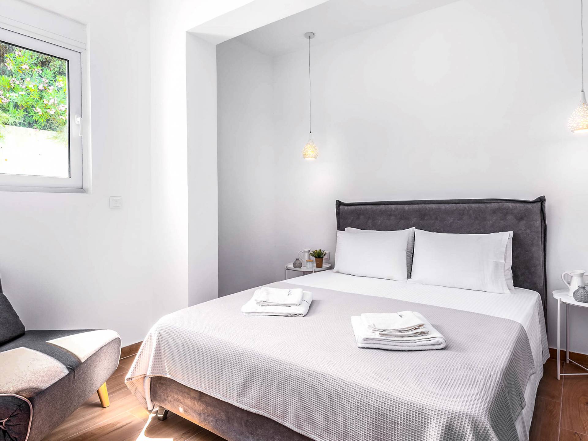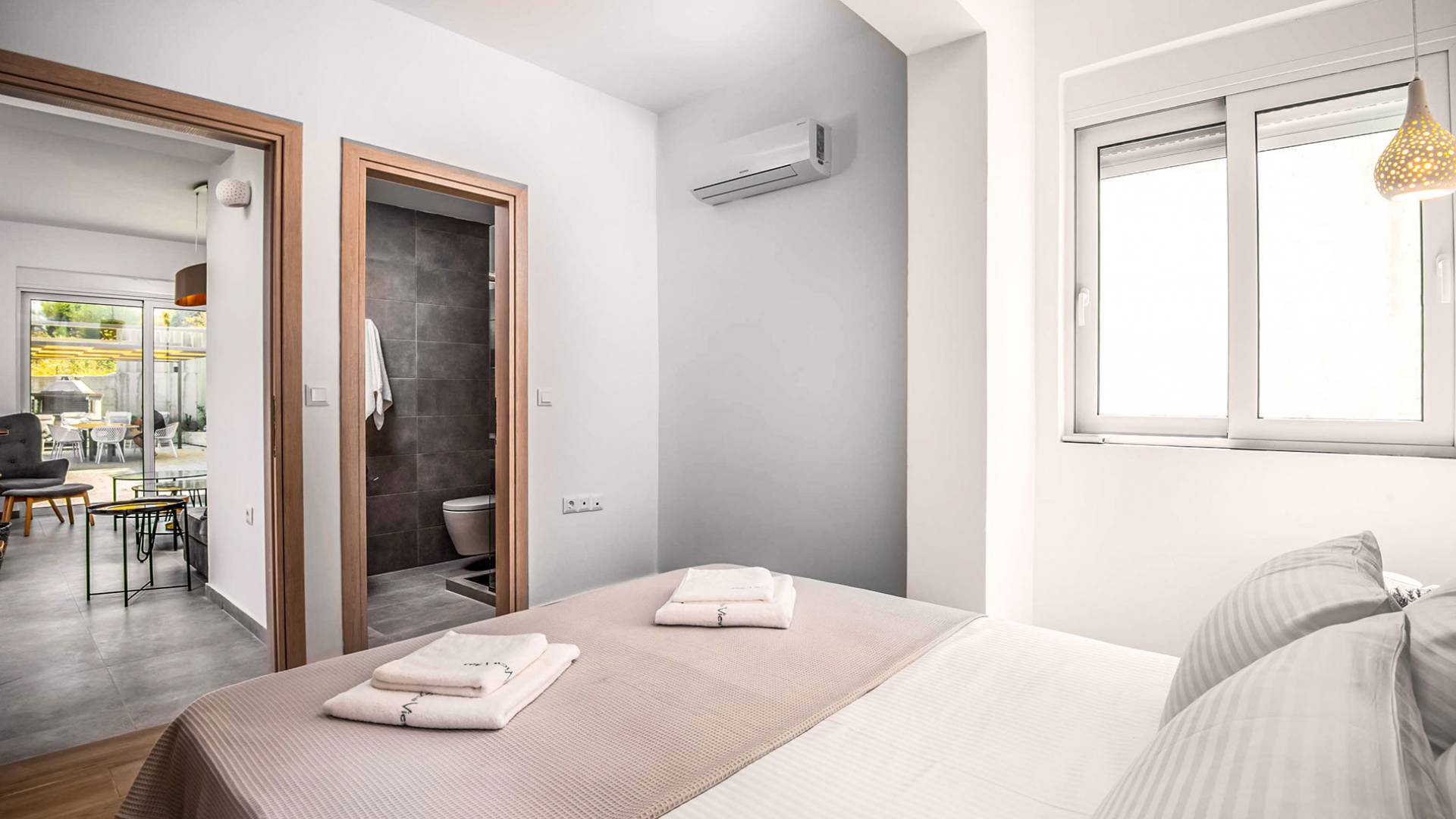 The property is 180 qm2 with 4 bedrooms with double beds, 4 bathrooms and 1 wc, a separate spacious fully equipped kitchen, and an open plan living room and dining area. Each of the rooms throughout the villa leads to its’ own balcony with a garden view, pool view, and an amazing sea view . The garden is fenced all the way around the property and has a private entrance to the parking space. The entire villa is fully air-conditioned.