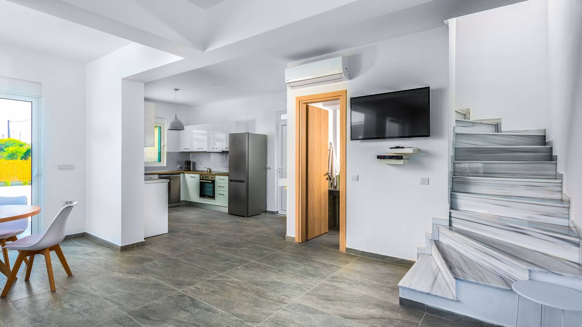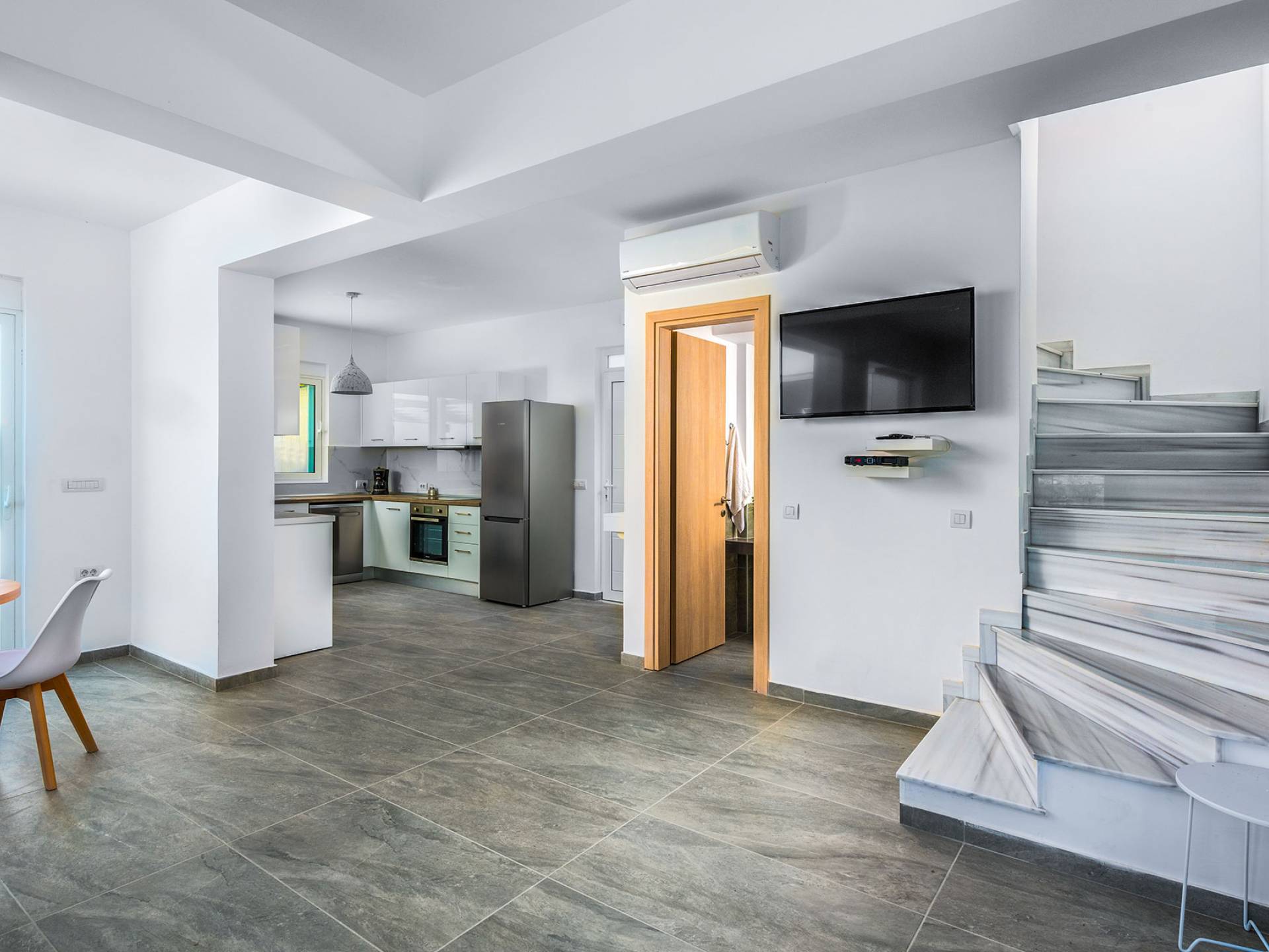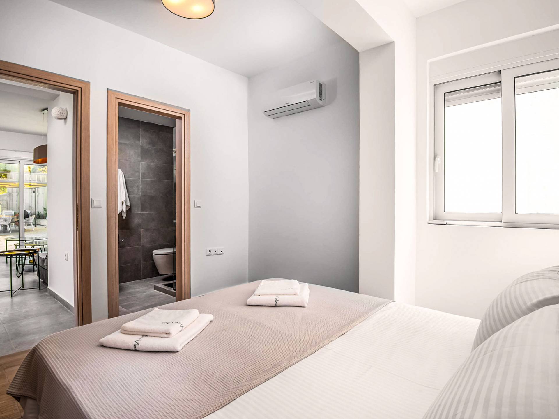 One of the properties is 180 qm2 with 4 bedrooms with double beds, 4 bathrooms and 1 wc, a separate spacious fully equipped kitchen, and an open plan living room and dining area. Each of the rooms throughout the villa leads to its’ own balcony with a garden view, pool view, and an amazing sea view. The garden is fenced all the way around the property and has a private entrance to the parking space. The entire villa is fully air-conditioned.