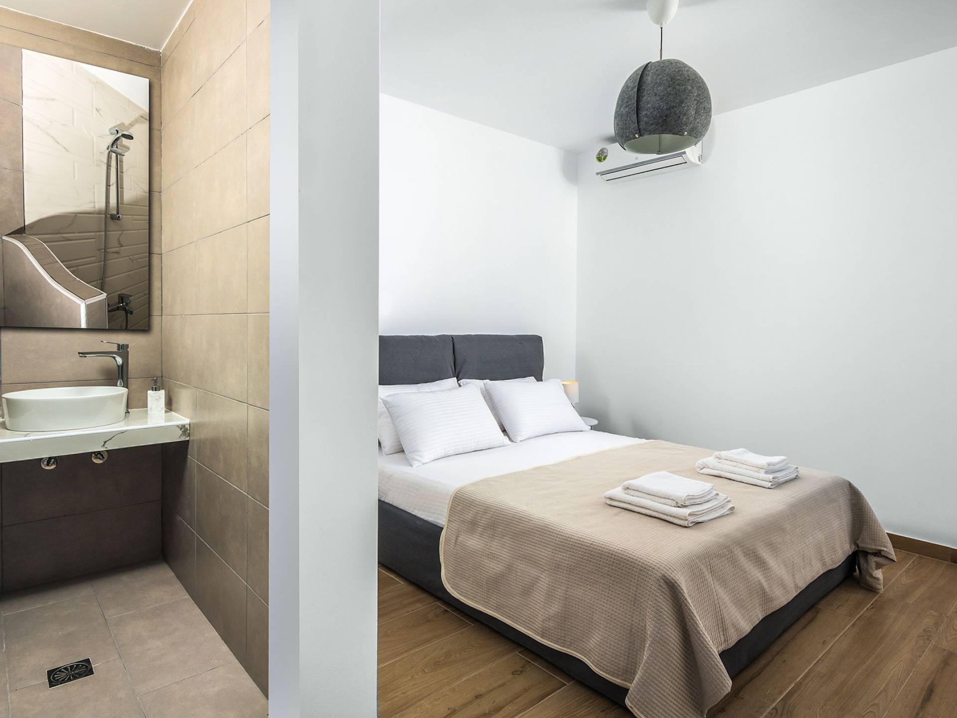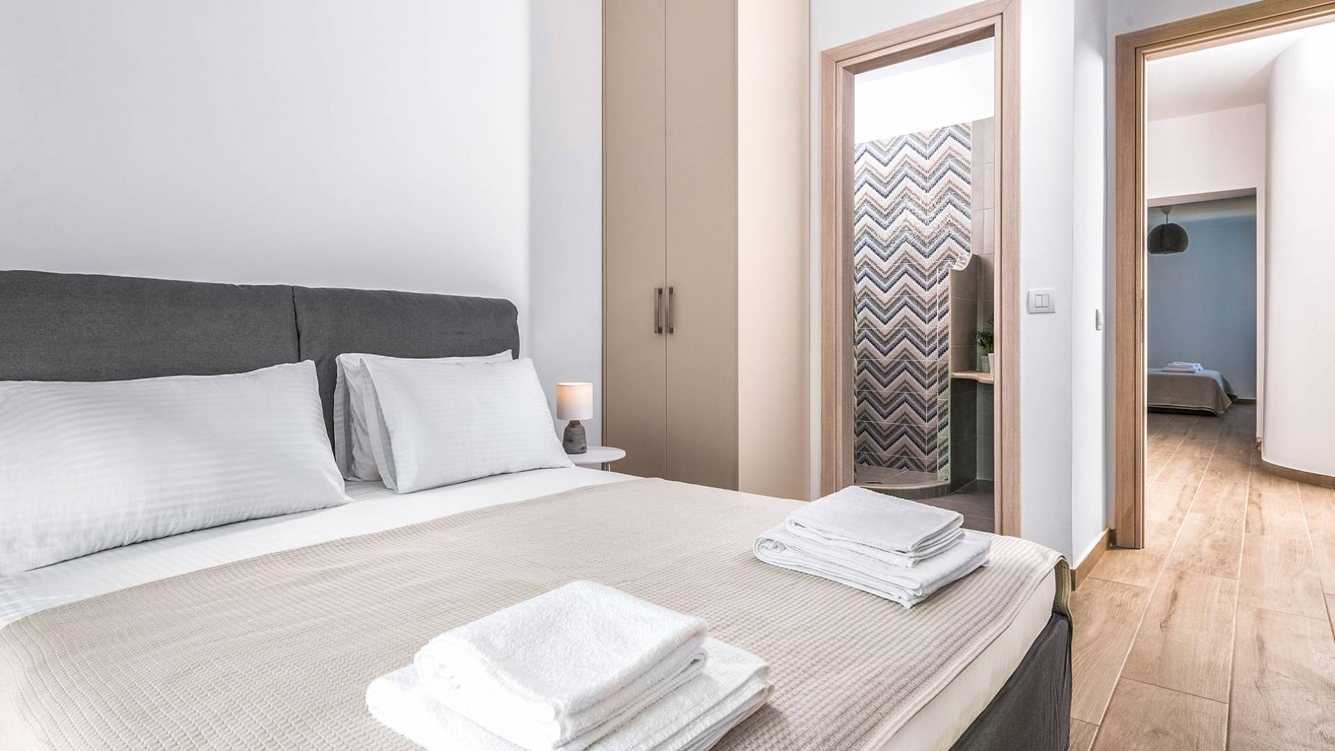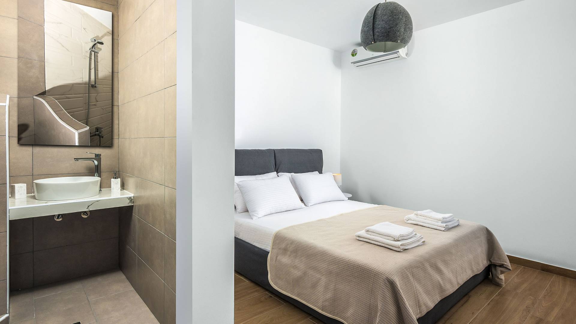 One of the properties is 180 qm2 with 4 bedrooms with double beds, 4 bathrooms and 1 wc, a separate spacious fully equipped kitchen, and an open plan living room and dining area. Each of the rooms throughout the villa leads to its’ own balcony with a garden view, pool view, and an amazing sea view. The garden is fenced all the way around the property and has a private entrance to the parking space. The entire villa is fully air-conditioned.