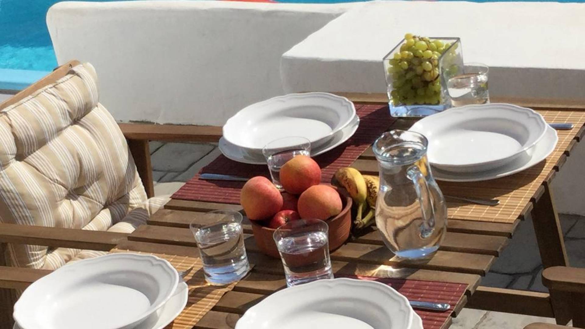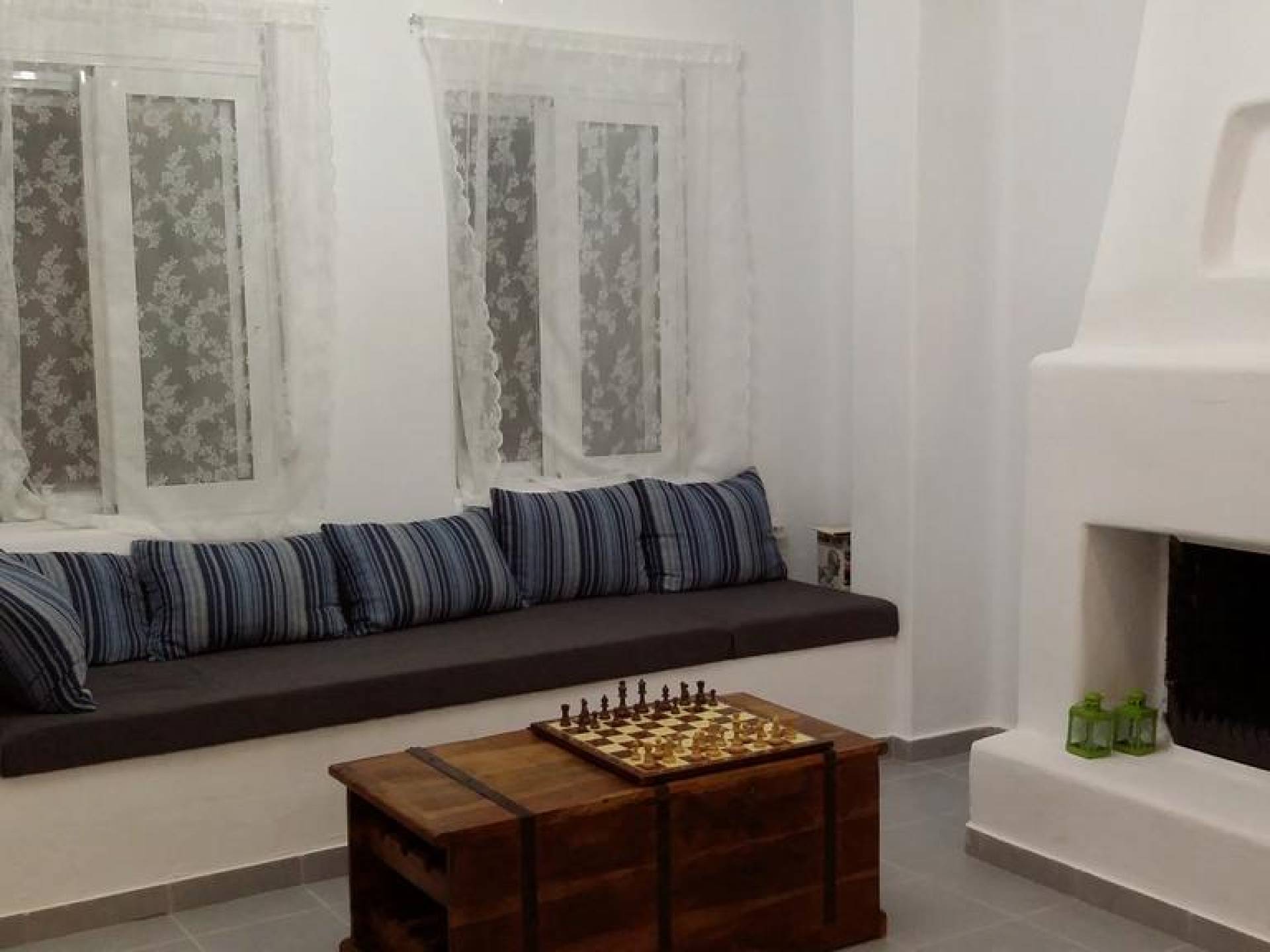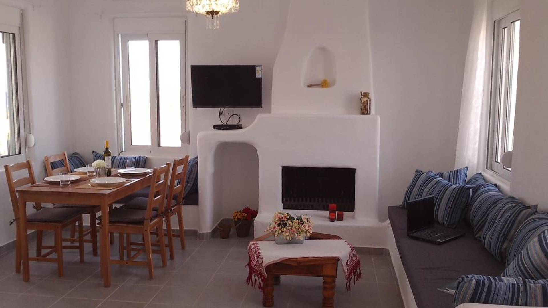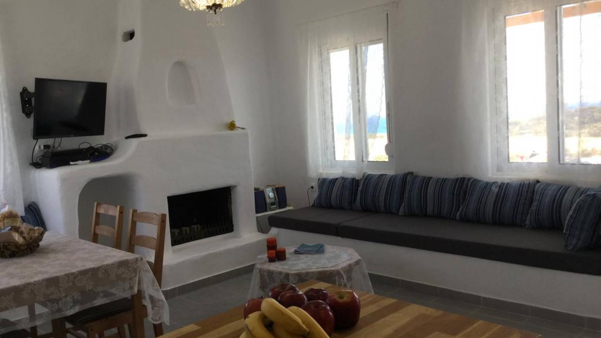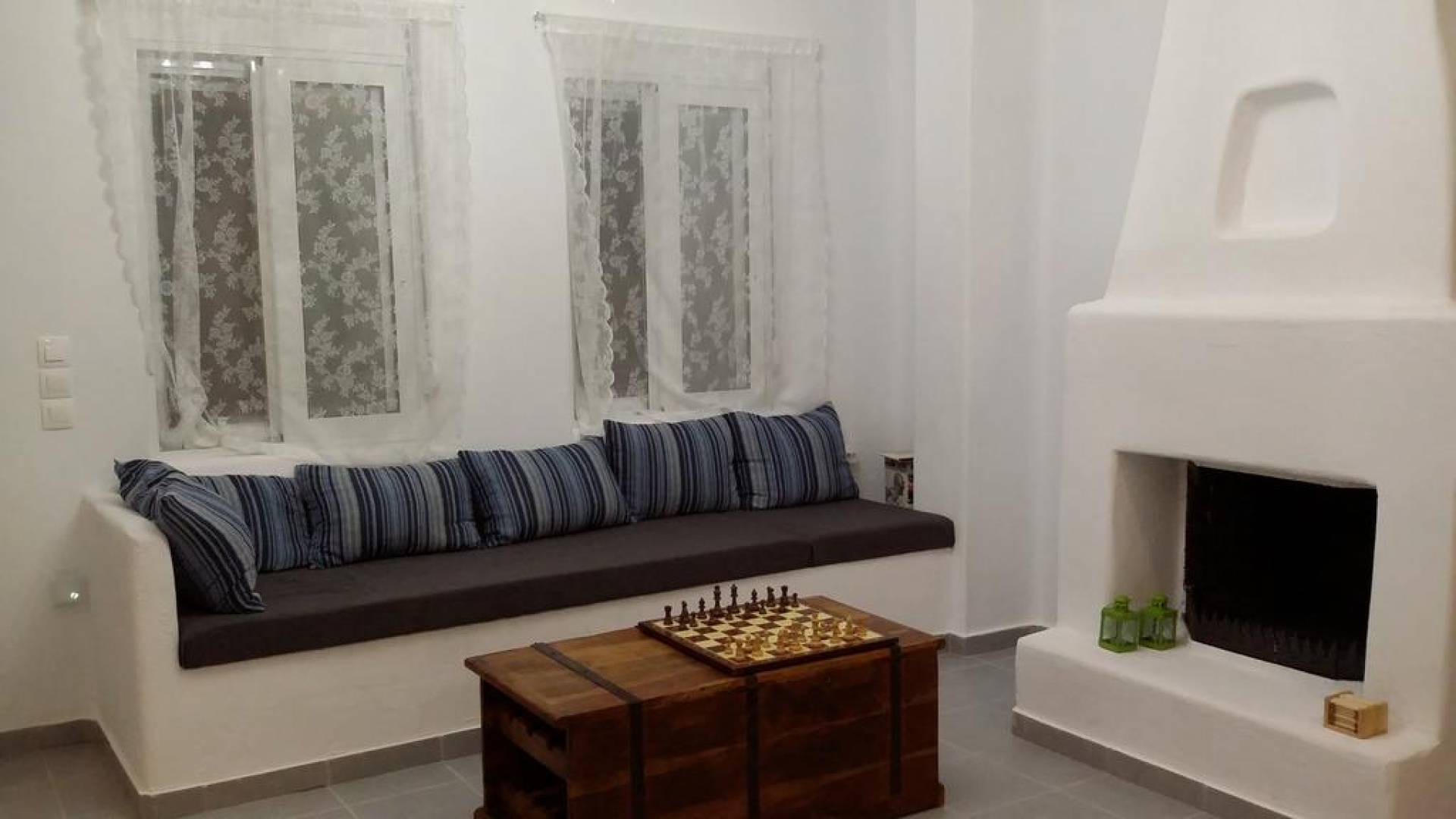 The fully equipped kitchen in each of the houses is open to the living room. The kitchen is equipped with a fridge and freezer, oven, ceramic cooktops, microwave oven, washing machine, dishwasher, filter coffee machine, electric kettle, toaster, blender, hand-mixer, Italian espresso coffee maker, kitchenware, cutlery, tableware and a big number of kitchen tools. Iron facilities are also provided. The living room in each house, boasting an antique chandelier, has a 32inch LCD satellite TV, a dining table with chairs and two traditionally built sofas with a coffee table in front of the traditional fireplace. Books, games, CDs/DVDs for adults and children are available. The big sofa can comfortably accommodate an extra person. Sun/shade terraces with tables, chairs, a barbeque and barbeque facilities offer uninterrupted sea views.