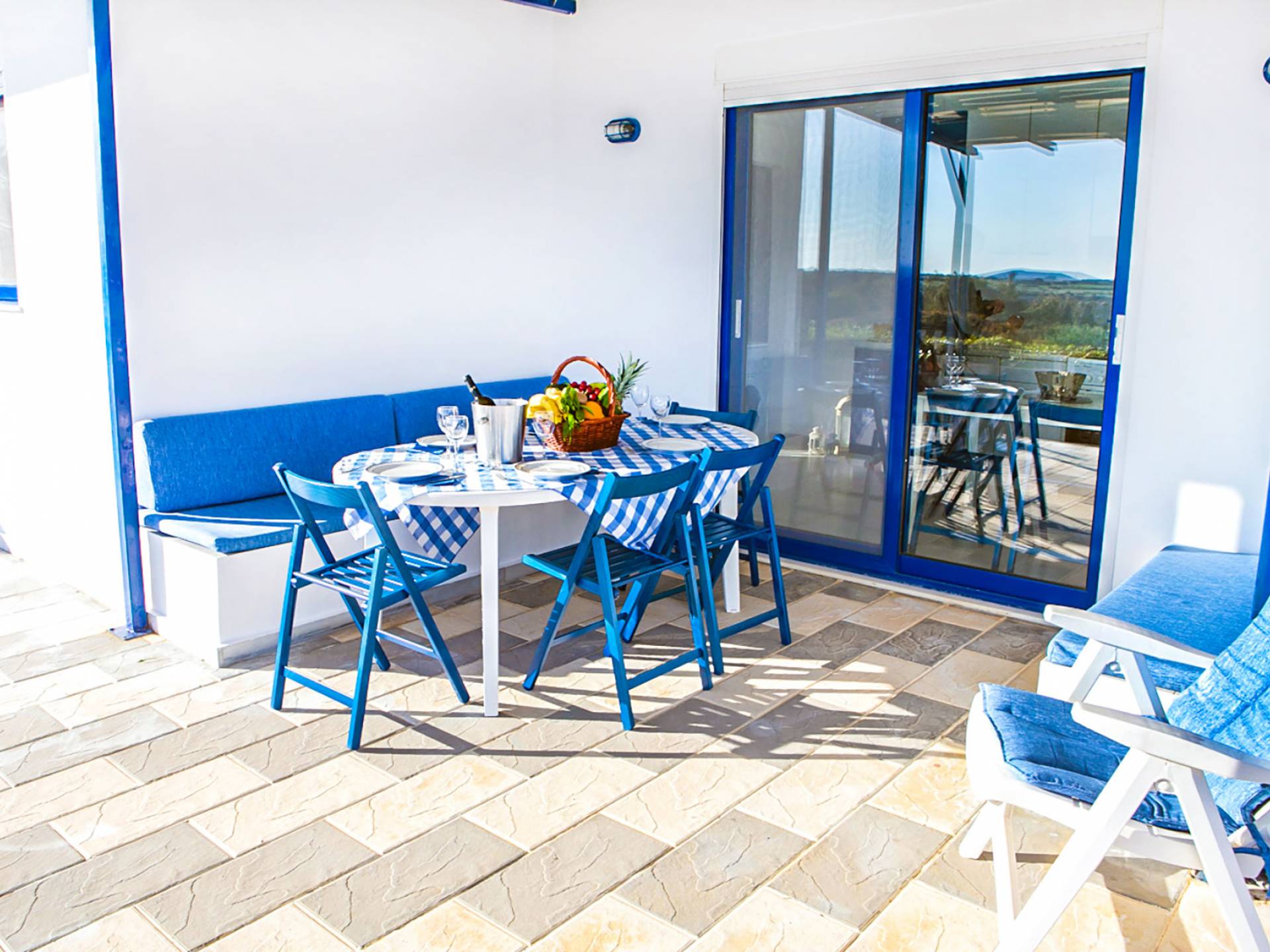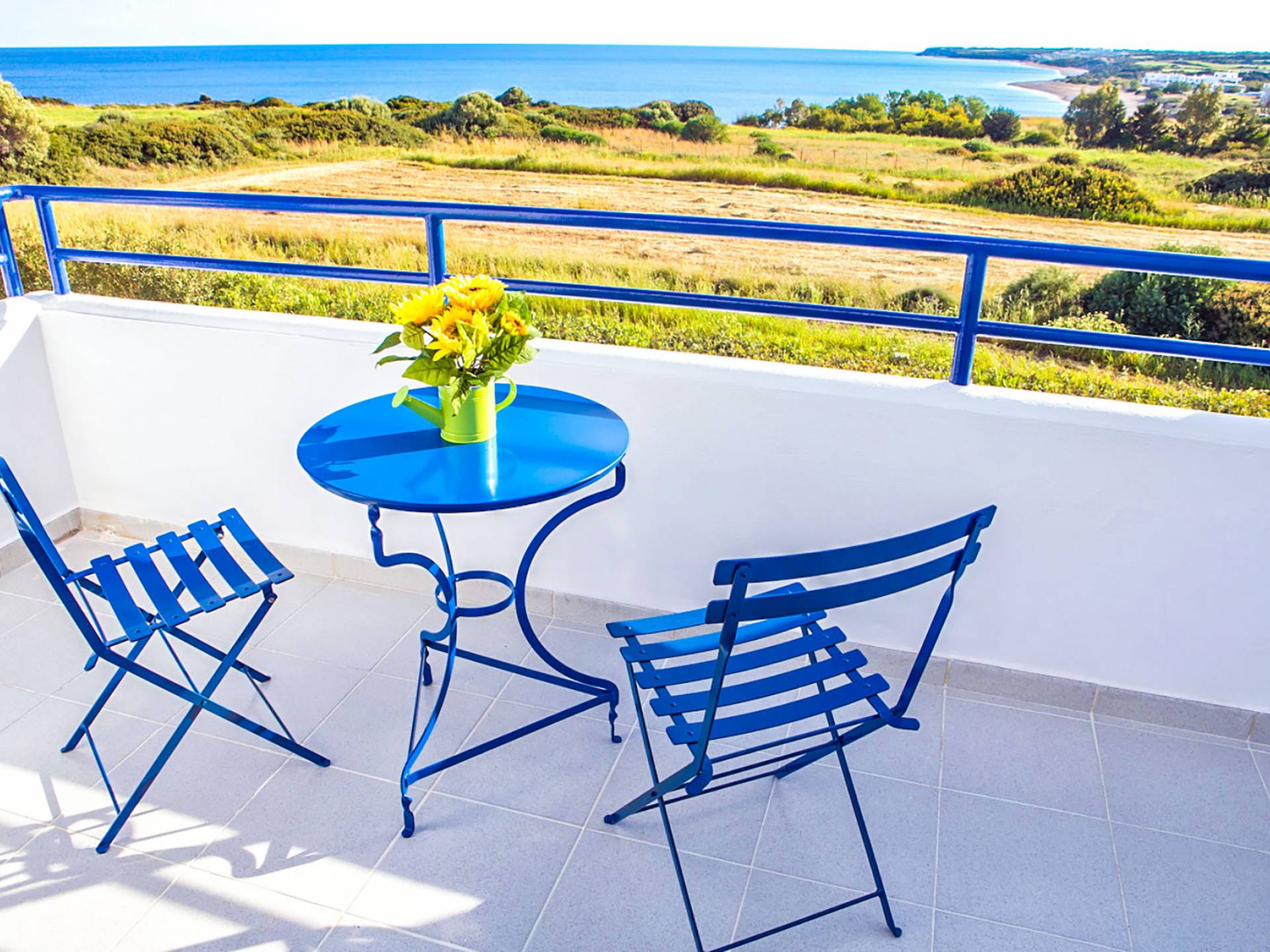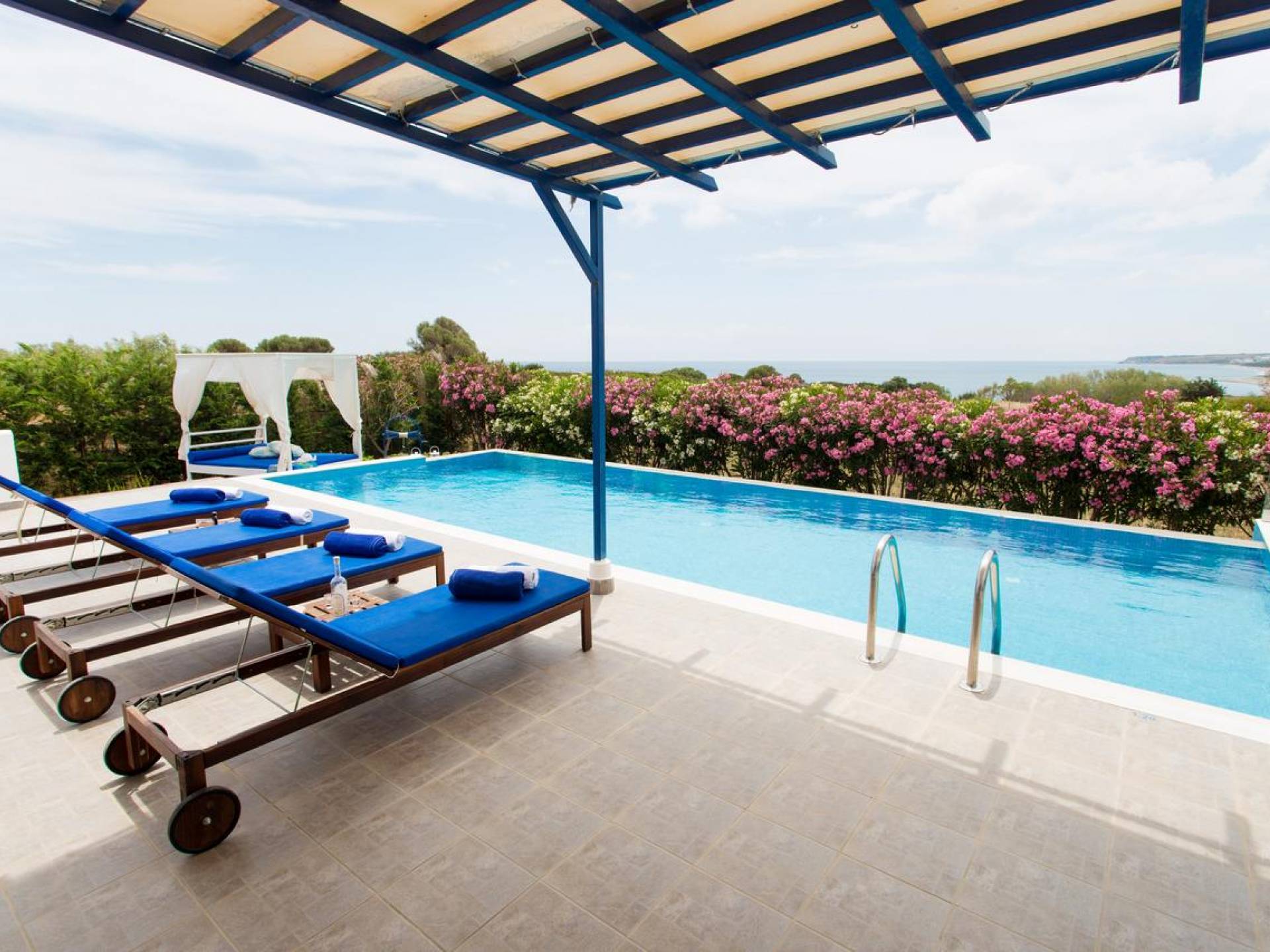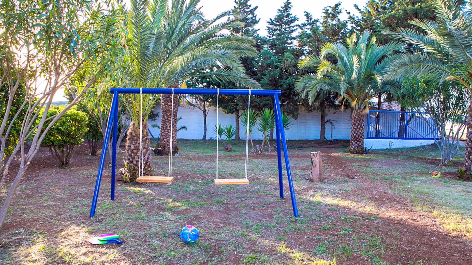 Directly in front of the kitchen lies a large covered patio with a pergola. There awaits a comfortable outdoor lounge area with two traditionally built seating benches and a dining room for eight people. Next to it, the amazing swimming pool area where you can spend most of the day facing the amazing beach and the crystal clear waters of the sea. Commode deck chairs and umbrellas are in the pool and help you to enjoy the warmth of the Sun of Rhodes.