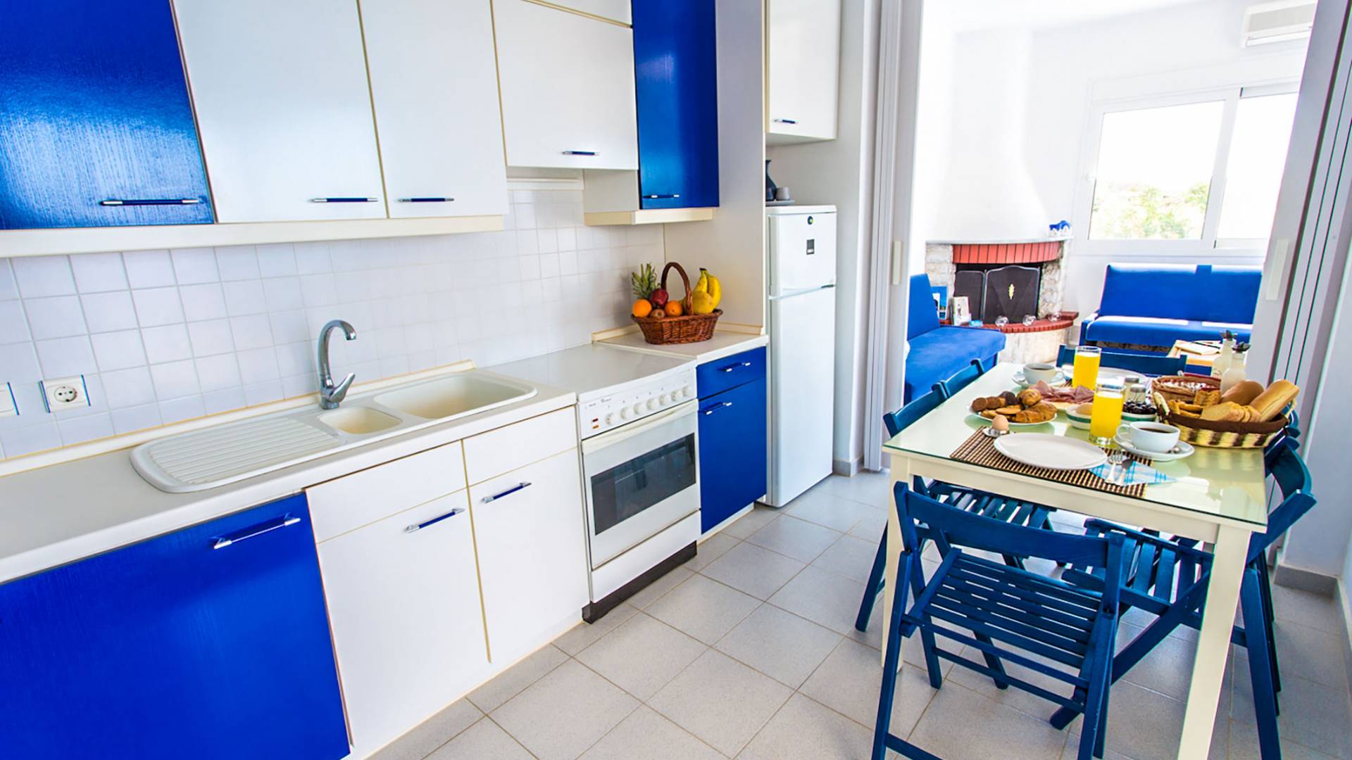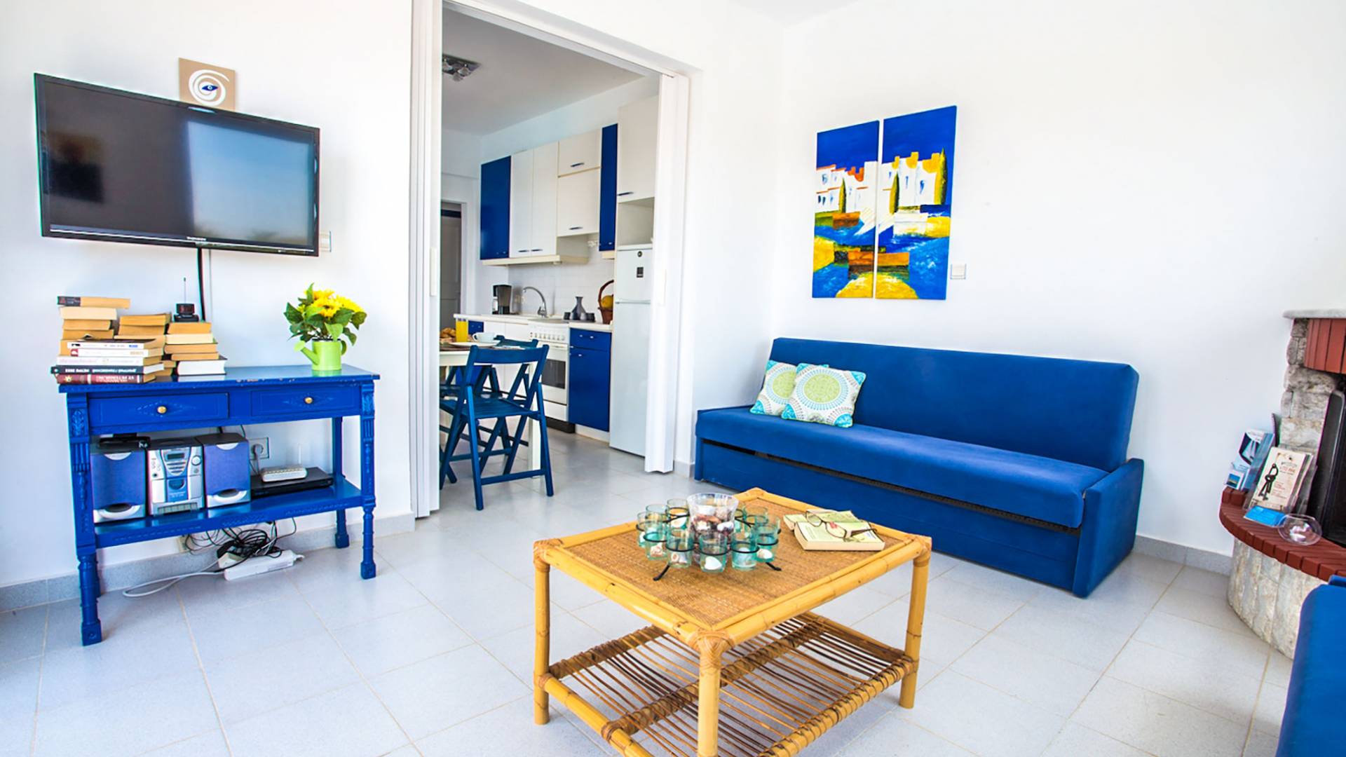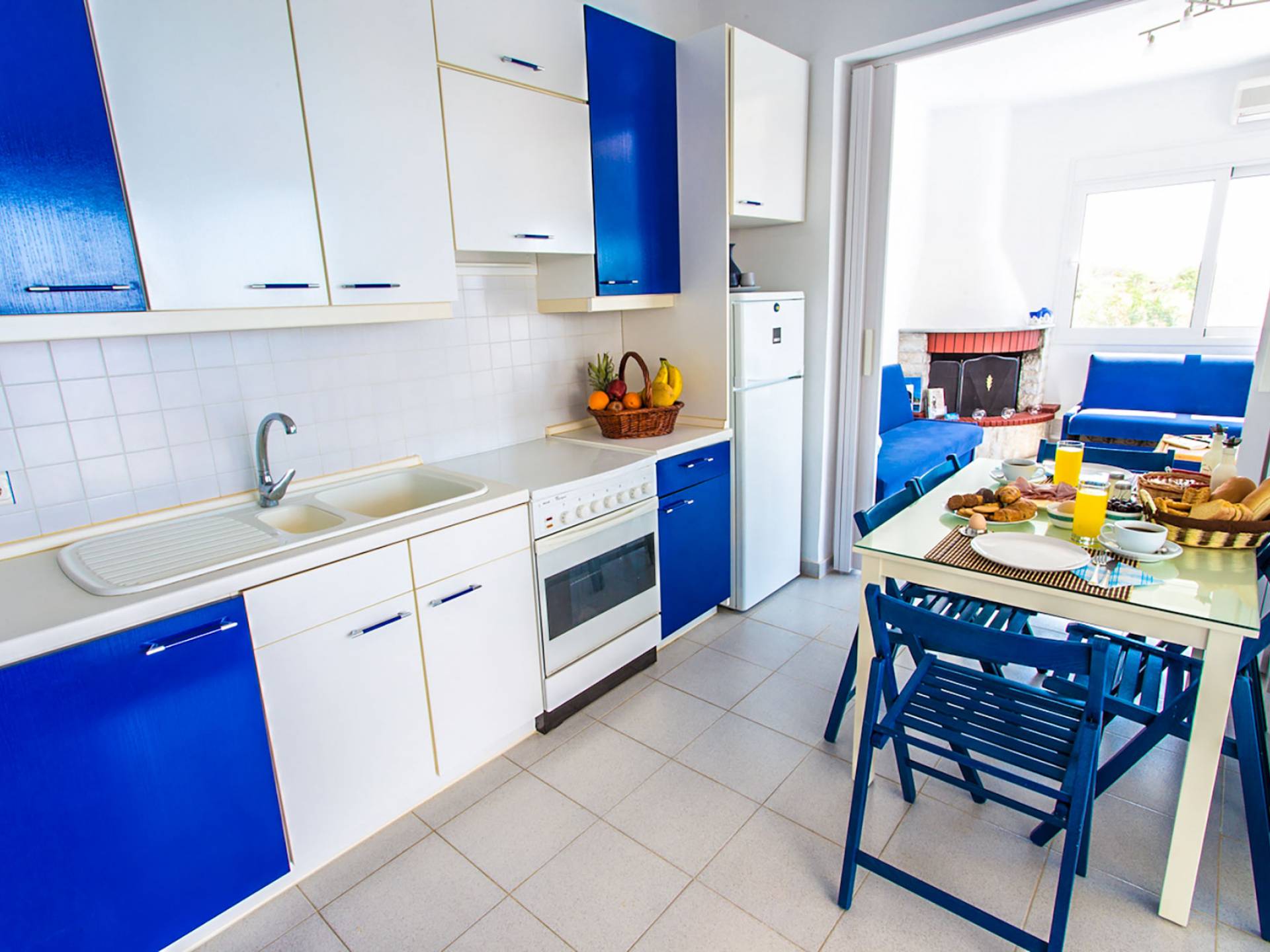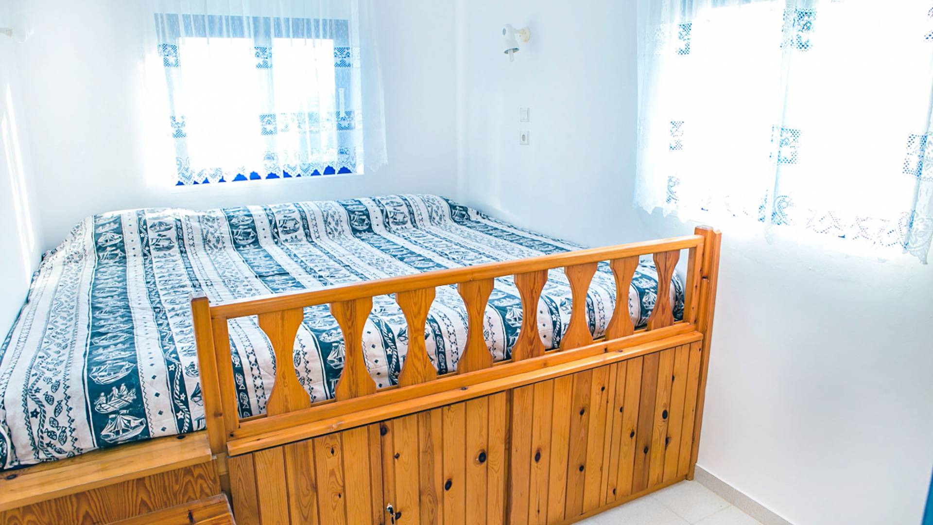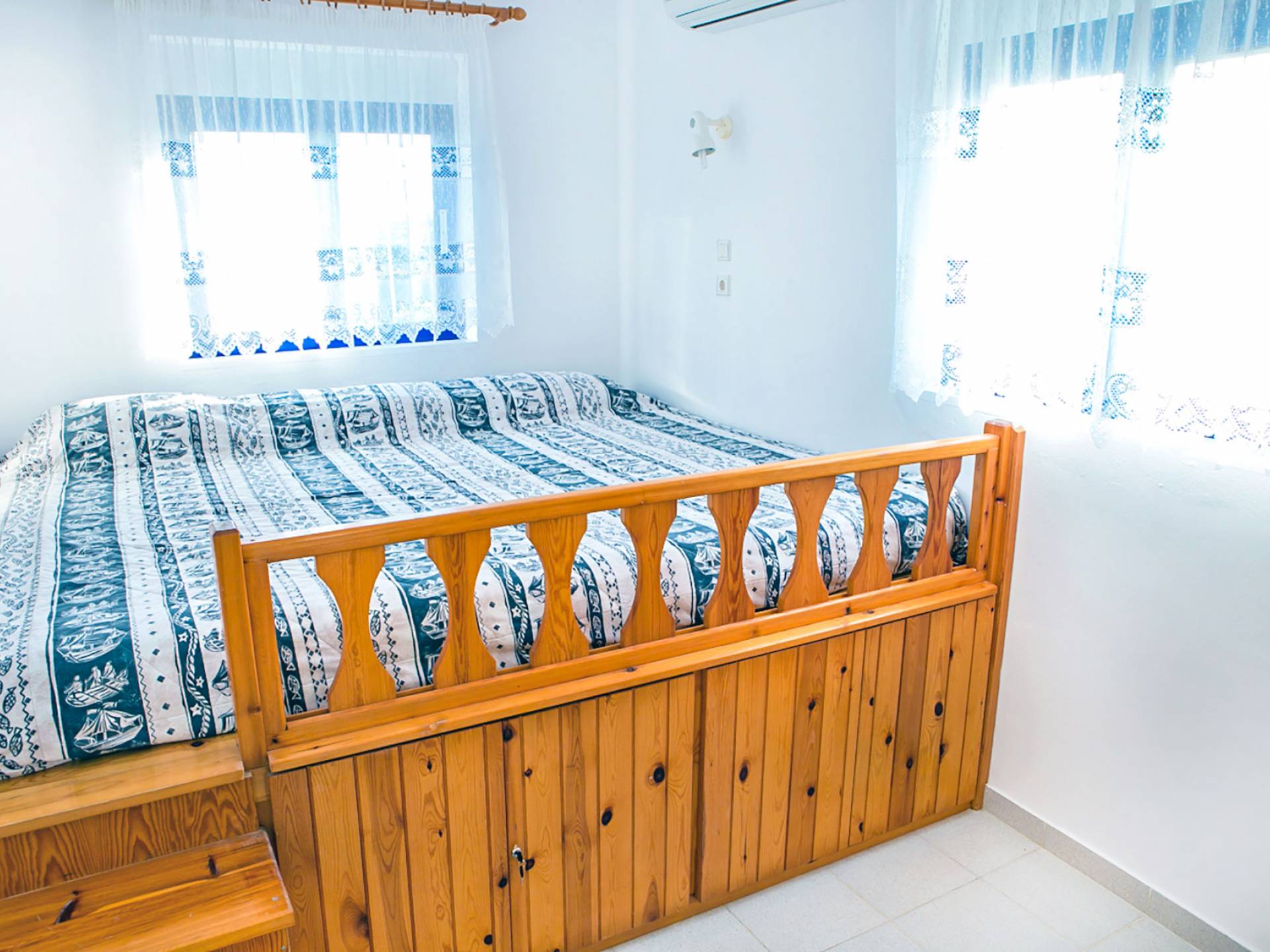 The ground floor includes the kitchen adjoining a dining area that flows onto a spacious living room. The kitchen is fully equipped with cooking facilities, an oven, a fridge, and a washing machine. The large dining table can sit up to 8 people. Next to the dining area, a comfortable lounge includes 2 modern sofa beds (which turn into 2 single beds) next to the fireplace and across from the large windows overlooking the pool area and the amazing garden and sea views. Here you can sit and relax while enjoying your favorite movies on the large TV or listening to music over a cup of tea or a nice drink. The large windows allow you to enjoy throughout the day the infinite blue of the sea and the beauty of the Greek sky and sun. A sliding door is fitted to separate the living room from the kitchen and offer privacy whenever people are sleeping in the sofa beds. The ground floor also offers a large air-conditioned bedroom and a WC and shower room. A traditionally built bed called ‘Soufas’ (bigger than a super king size bed) can sleep a family of 2 adults and 2 children or alternatively 4 children. The fully fitted wardrobe offers enough space for the guests to use for their clothes.