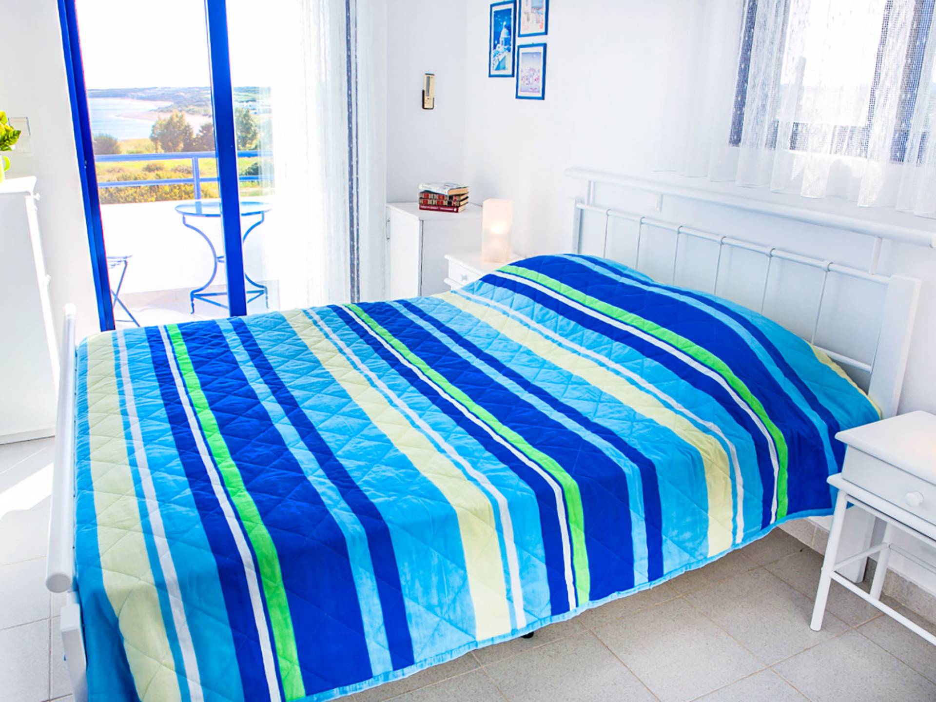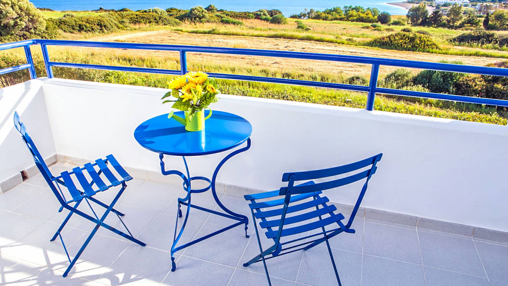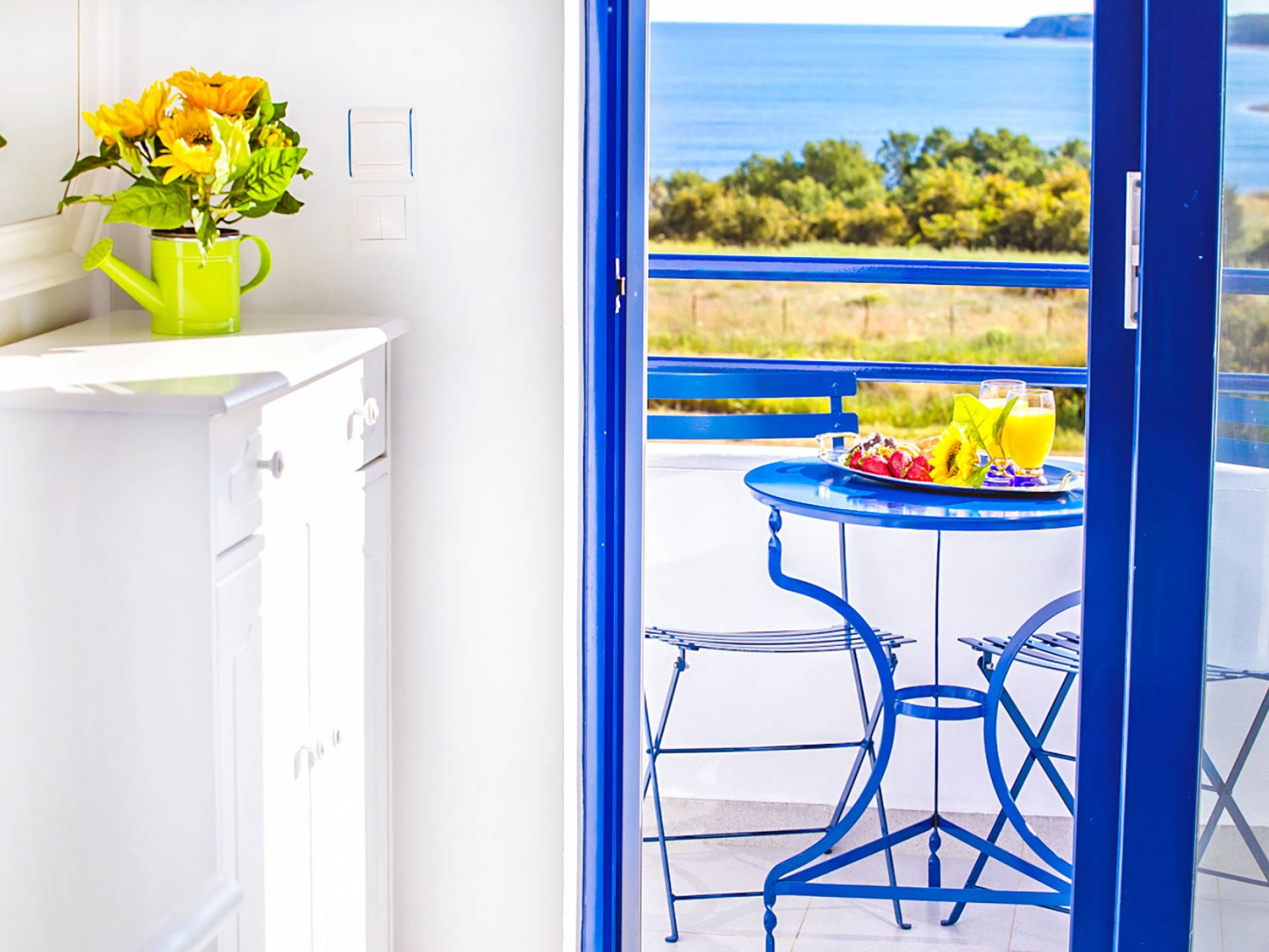 Moving up to the first floor, there are 2 air-conditioned double bedrooms and a WC and shower room. One bedroom includes a king-size bed, fitted wardrobe, and a TV. The second bedroom offers two single beds and a uniquely built wooden ‘loft bed where 2 adults or teenagers can sleep. Fitted wardrobes provide even more space for visitors. All around the first floor, there are balconies with fantastic views to the garden and the sea where you can sit and enjoy your breakfast or a nice relaxing drink during sunset.