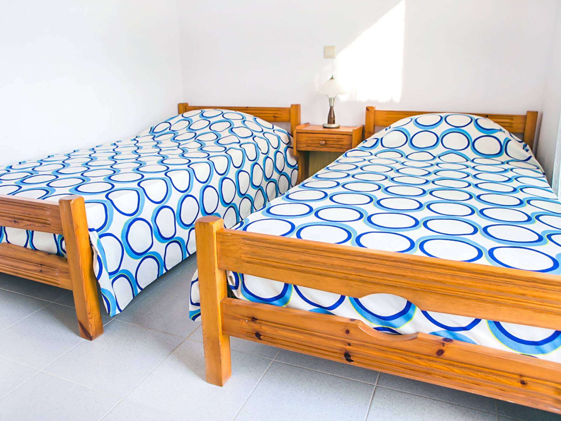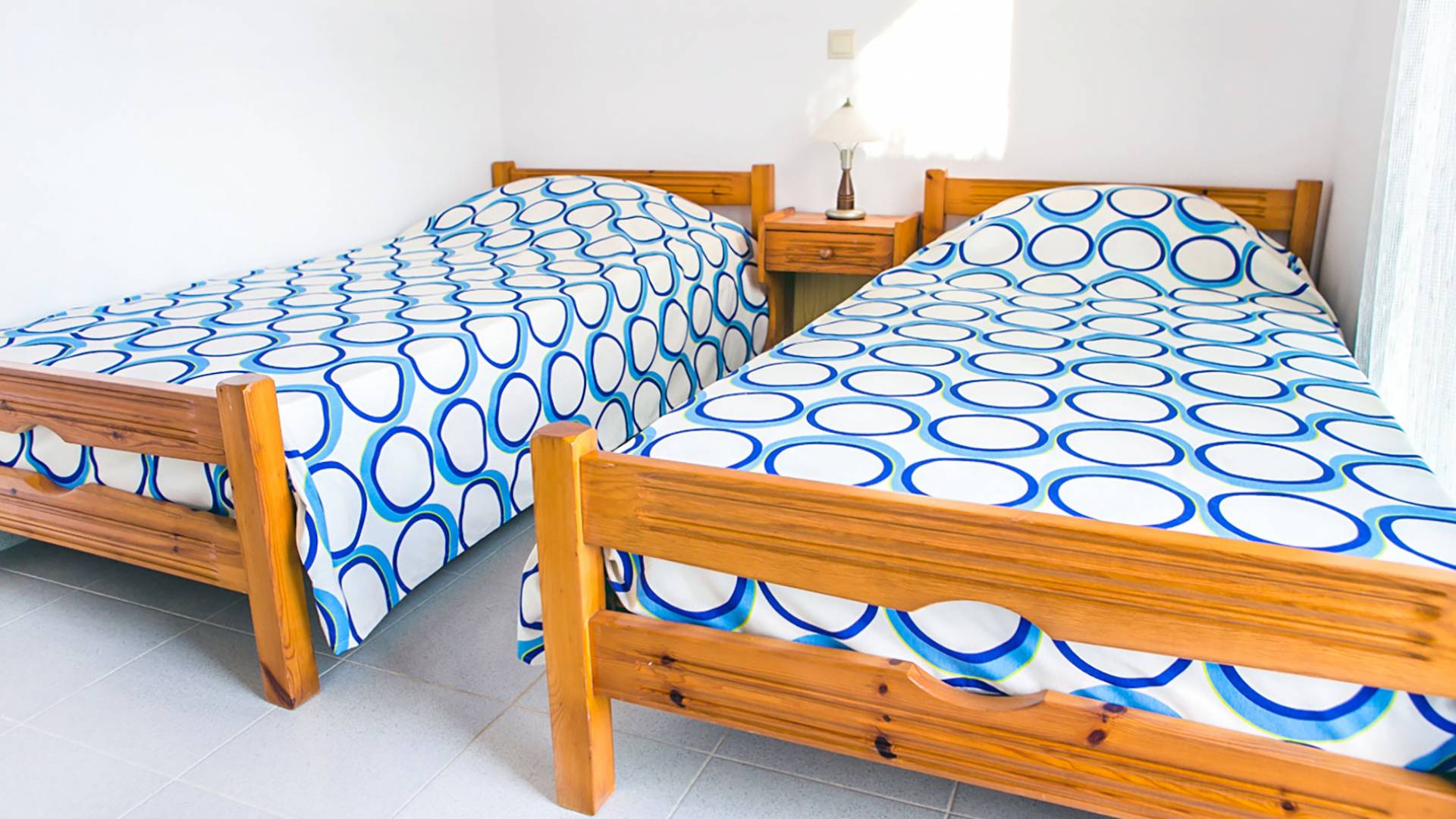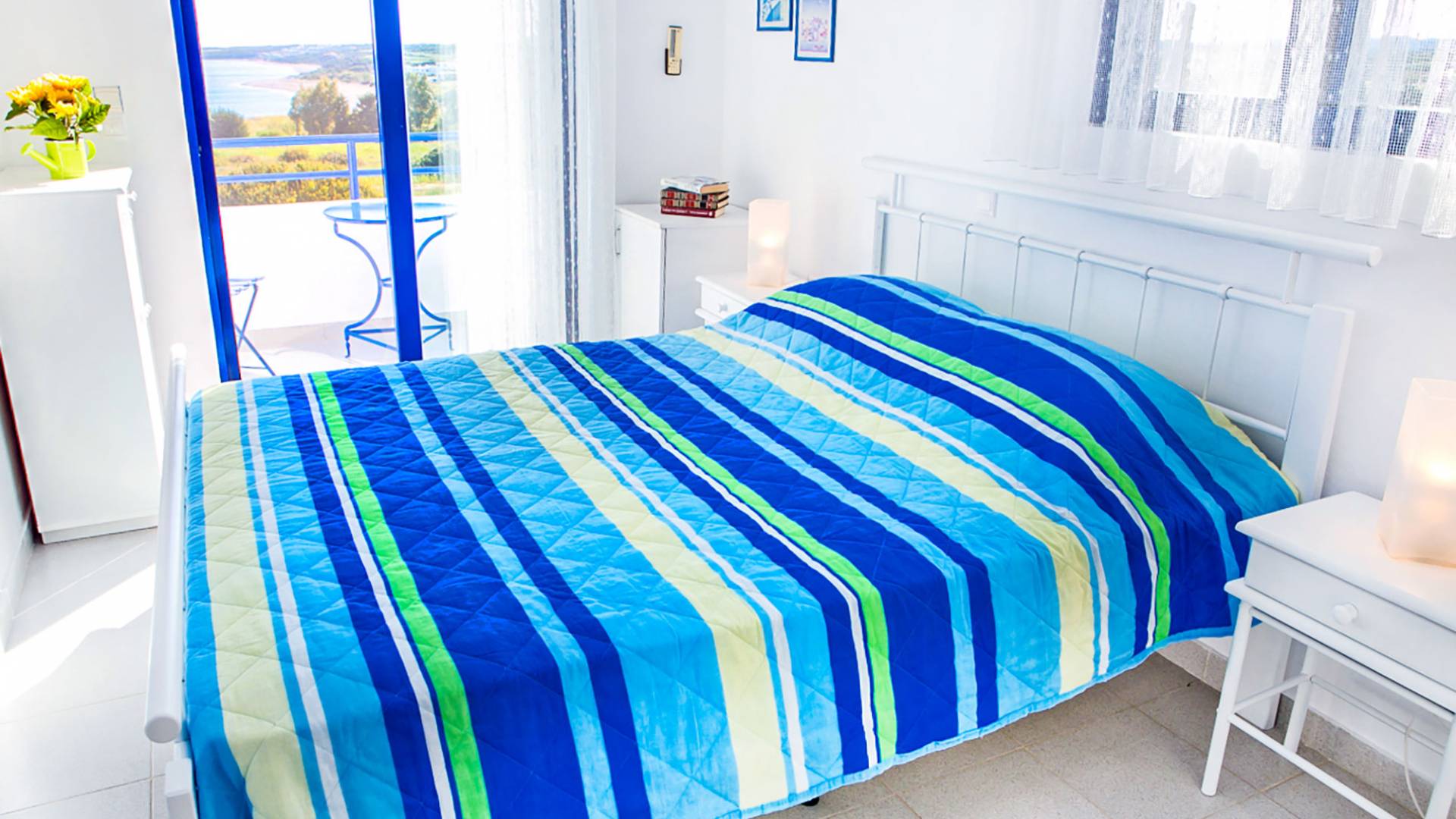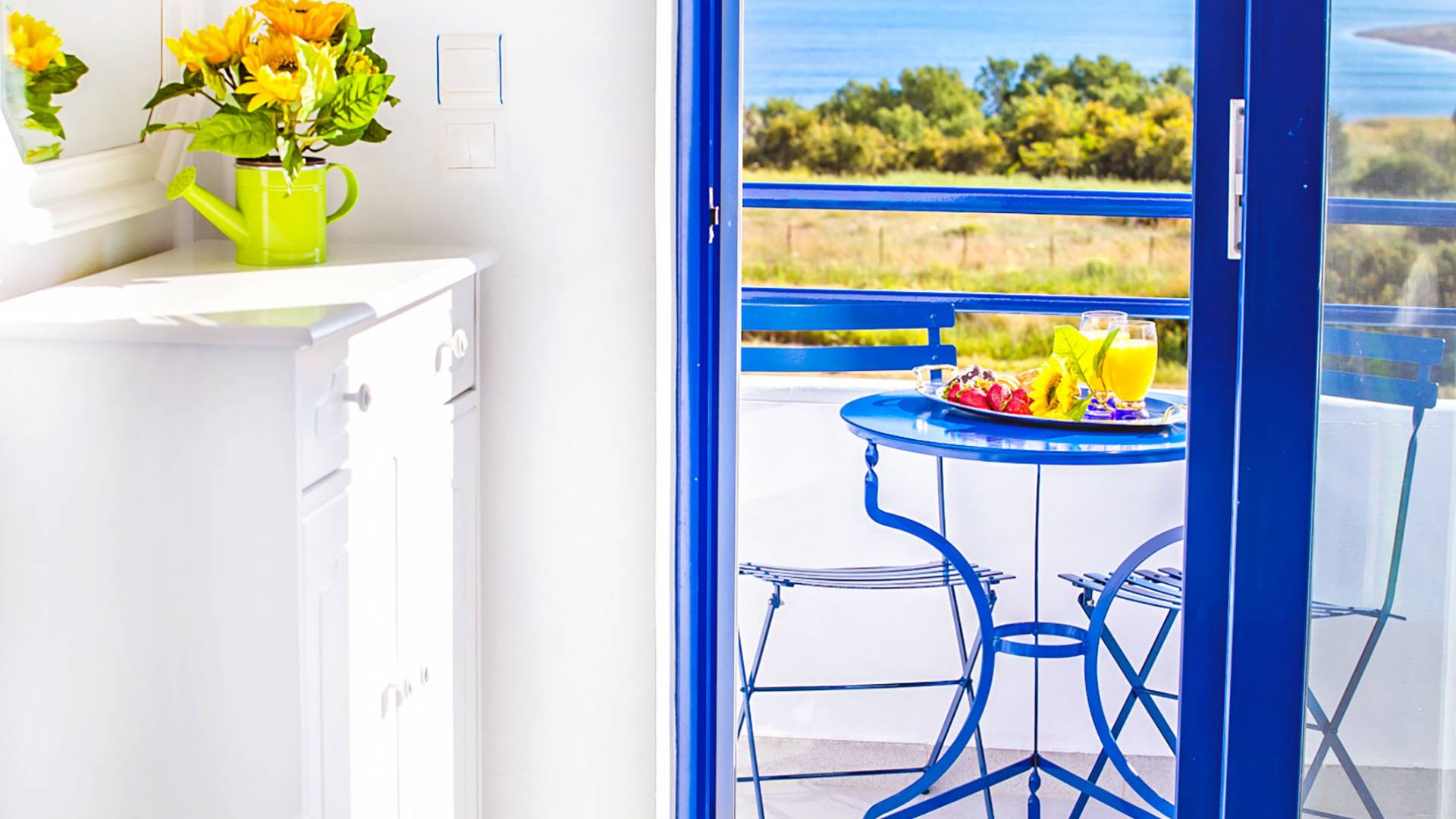 Moving up to the first floor, there are 2 air-conditioned double bedrooms and a WC and shower room. One bedroom includes a king-size bed, fitted wardrobe, and a TV. The second bedroom offers two single beds and a uniquely built wooden ‘loft bed where 2 adults or teenagers can sleep. Fitted wardrobes provide even more space for visitors. All around the first floor, there are balconies with fantastic views to the garden and the sea where you can sit and enjoy your breakfast or a nice relaxing drink during sunset.