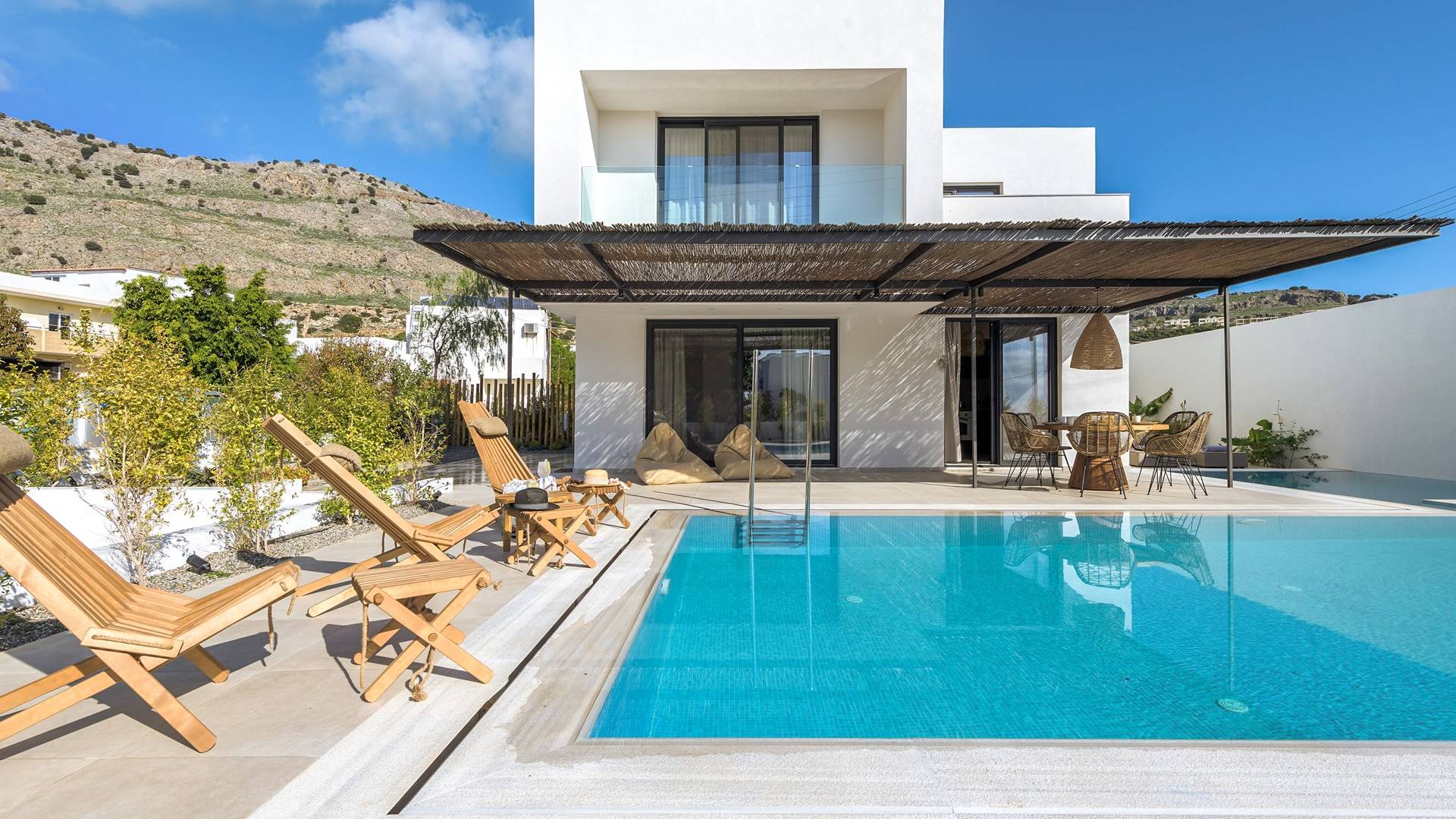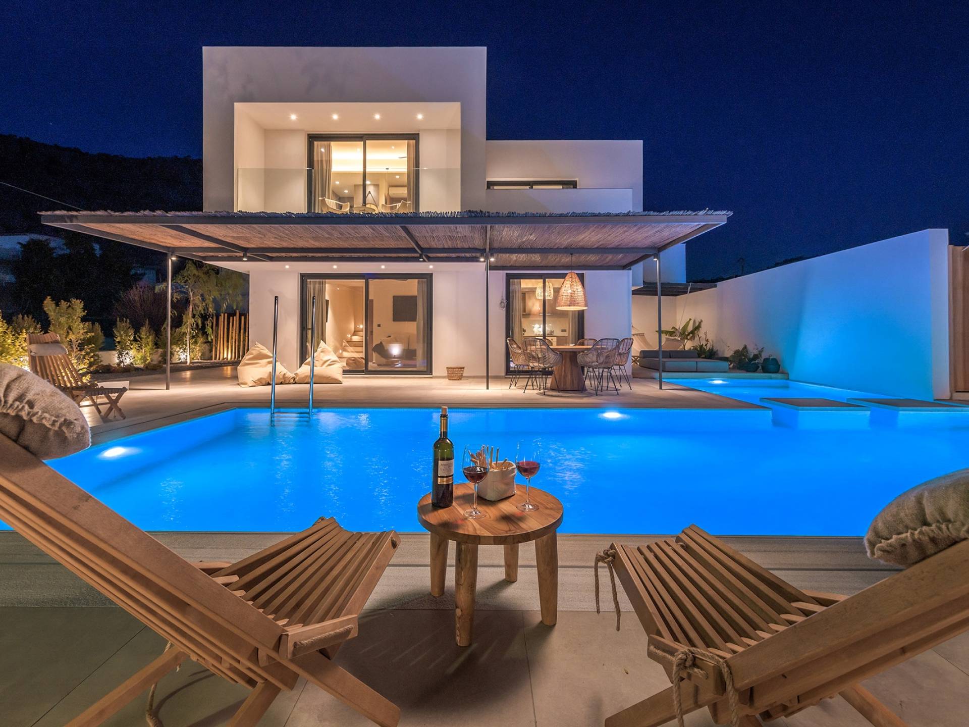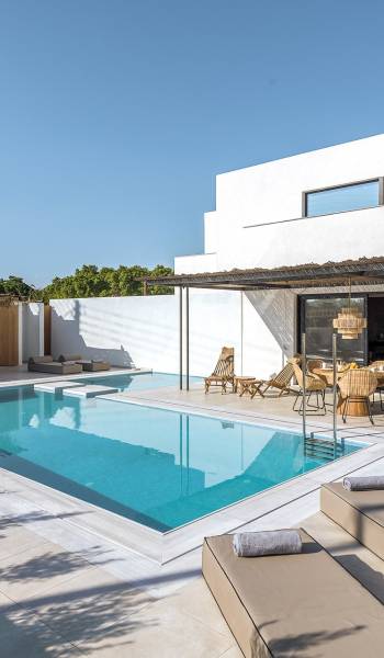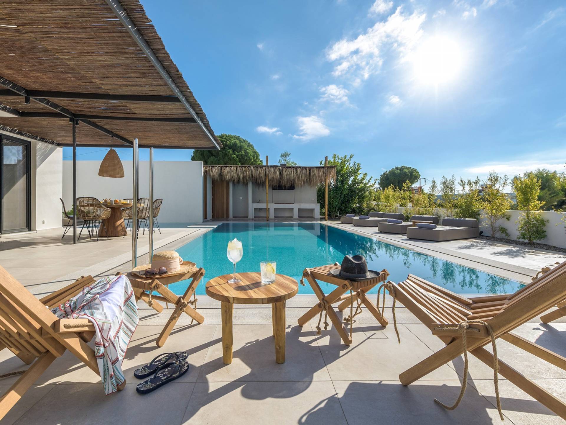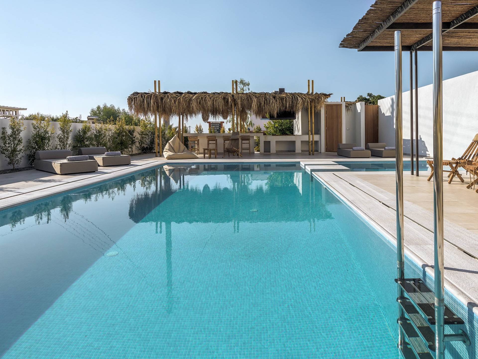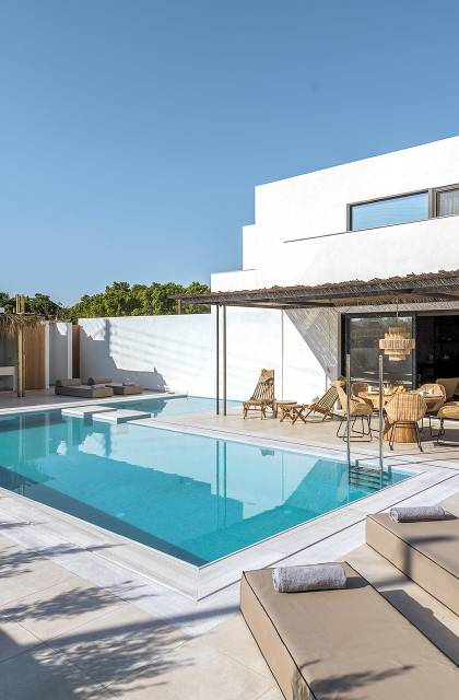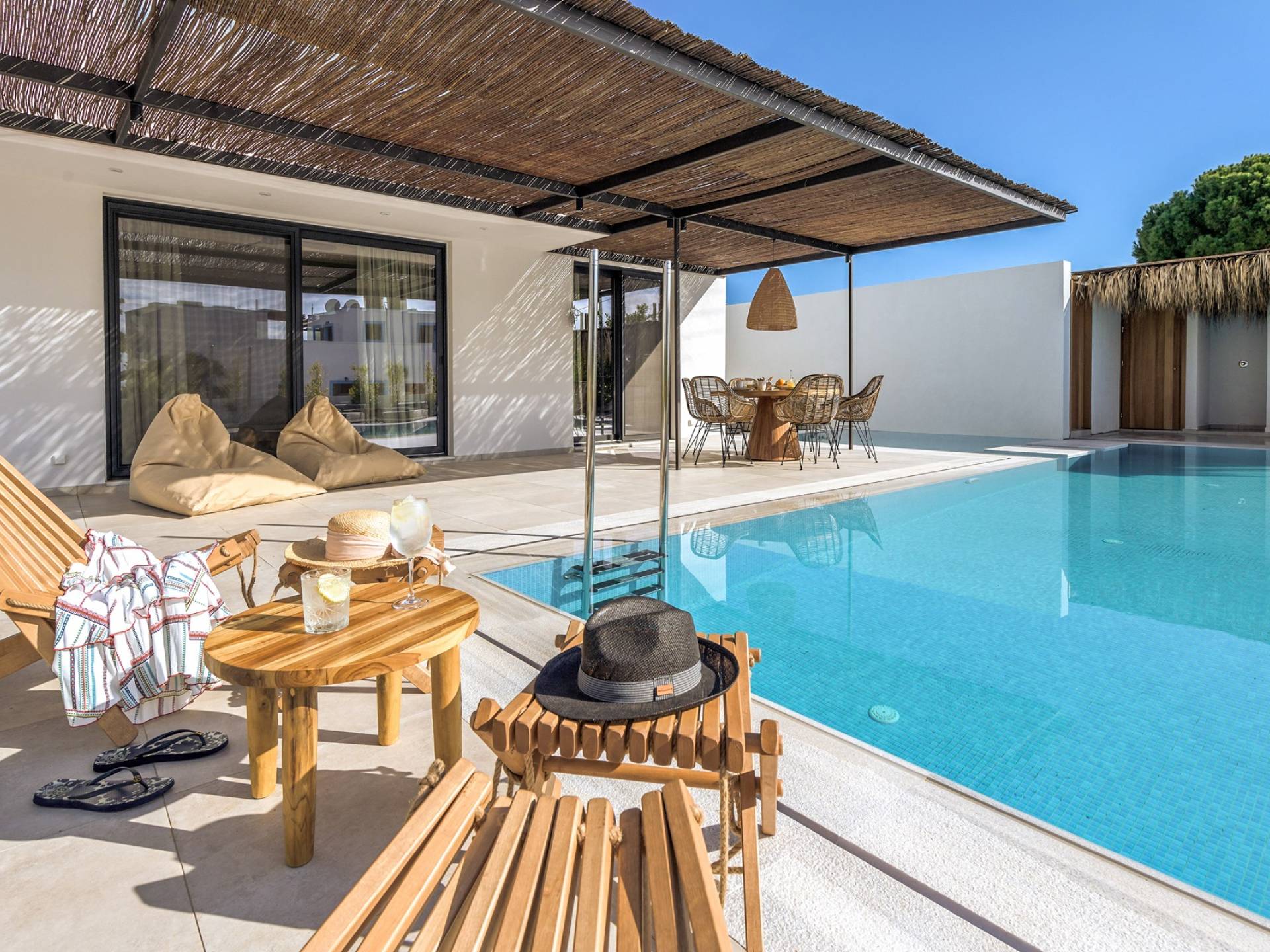 Both Villas feature 3 wonderful bedrooms with ensuite bathrooms and beautiful balconies, some of them offer a sea view. Four of the bedrooms have double beds and the other two have 2 single beds, all of them are fully air-conditioned. The modern living room combines luxurious comforts with a clear sense of home. The care that was put to the design of the property was meant to create a welcoming ambiance with a warm modern décor. The classy kitchen is fully equipped with every amenity you may need and is complemented by the BBQ facility outside, for you to indulge in culinary. Guests can enjoy free Wi-Fi access throughout the property. Outdoors, you will find the two amazing private swimming pools along with their stylish sunbeds. There, you can enjoy the summer sun; without a doubt, you’ll get the island feeling. The surrounding of the tastefully designed pool is quite pleasant, with a sitting area allowing you to enjoy any meal with your loved ones.