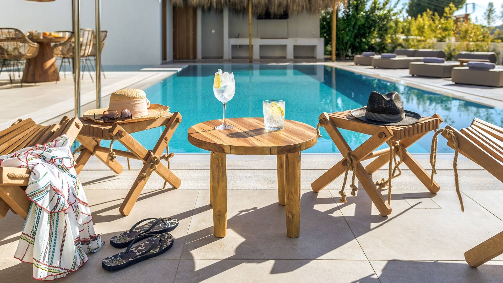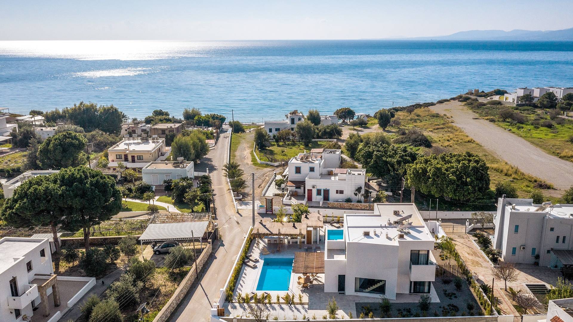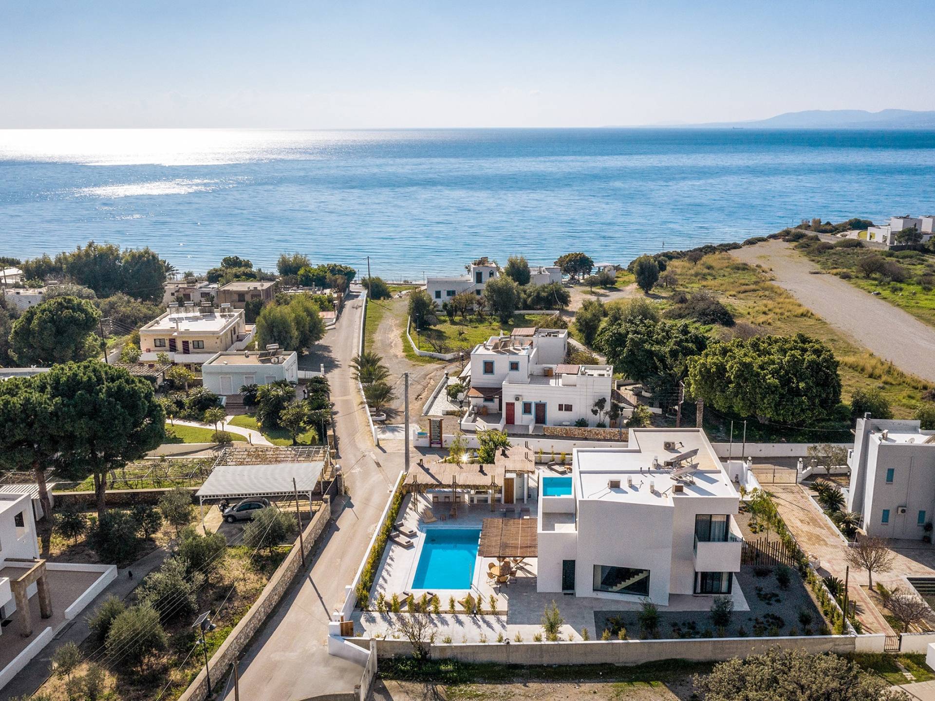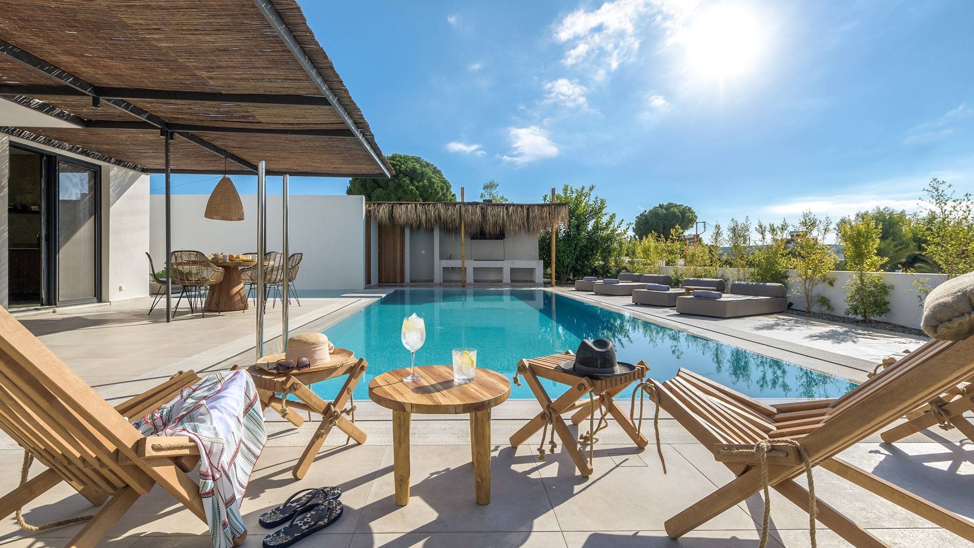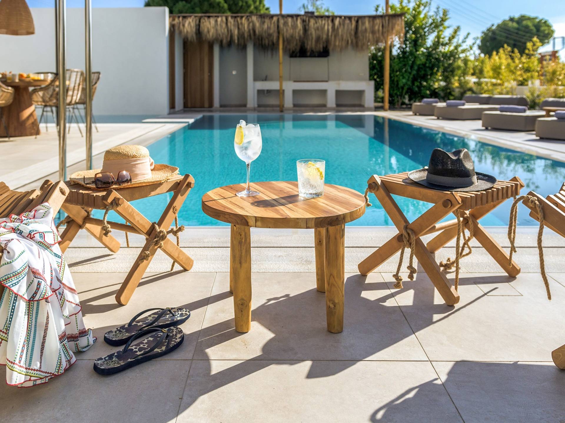 Both Villas feature 3 wonderful bedrooms with ensuite bathrooms and beautiful balconies, some of them offer a sea view. Four of the bedrooms have double beds and the other two have 2 single beds, all of them are fully air-conditioned. The modern living room combines luxurious comforts with a clear sense of home. The care that was put to the design of the property was meant to create a welcoming ambiance with a warm modern décor. The classy kitchen is fully equipped with every amenity you may need and is complemented by the BBQ facility outside, for you to indulge in culinary. Guests can enjoy free Wi-Fi access throughout the property. Outdoors, you will find the two amazing private swimming pools along with their stylish sunbeds. There, you can enjoy the summer sun; without a doubt, you’ll get the island feeling. The surrounding of the tastefully designed pool is quite pleasant, with a sitting area allowing you to enjoy any meal with your loved ones.