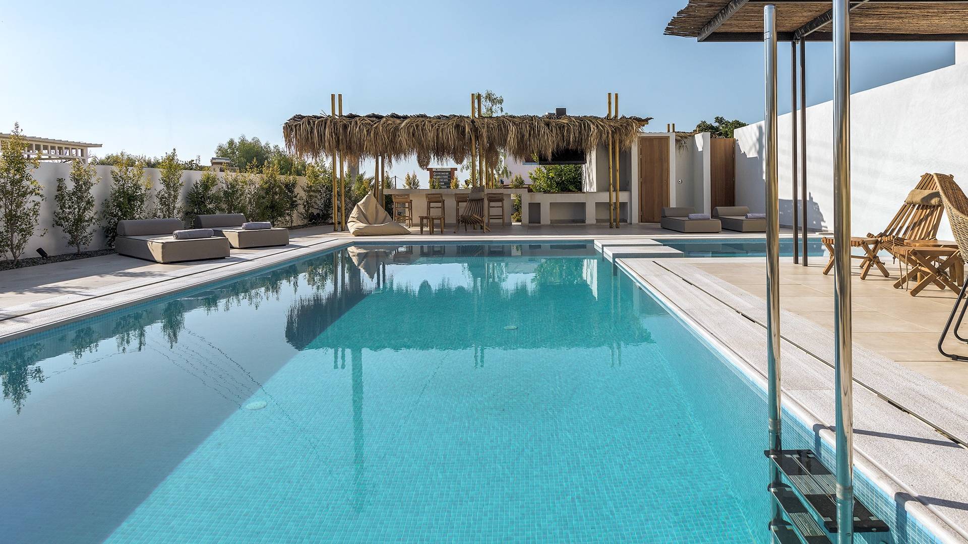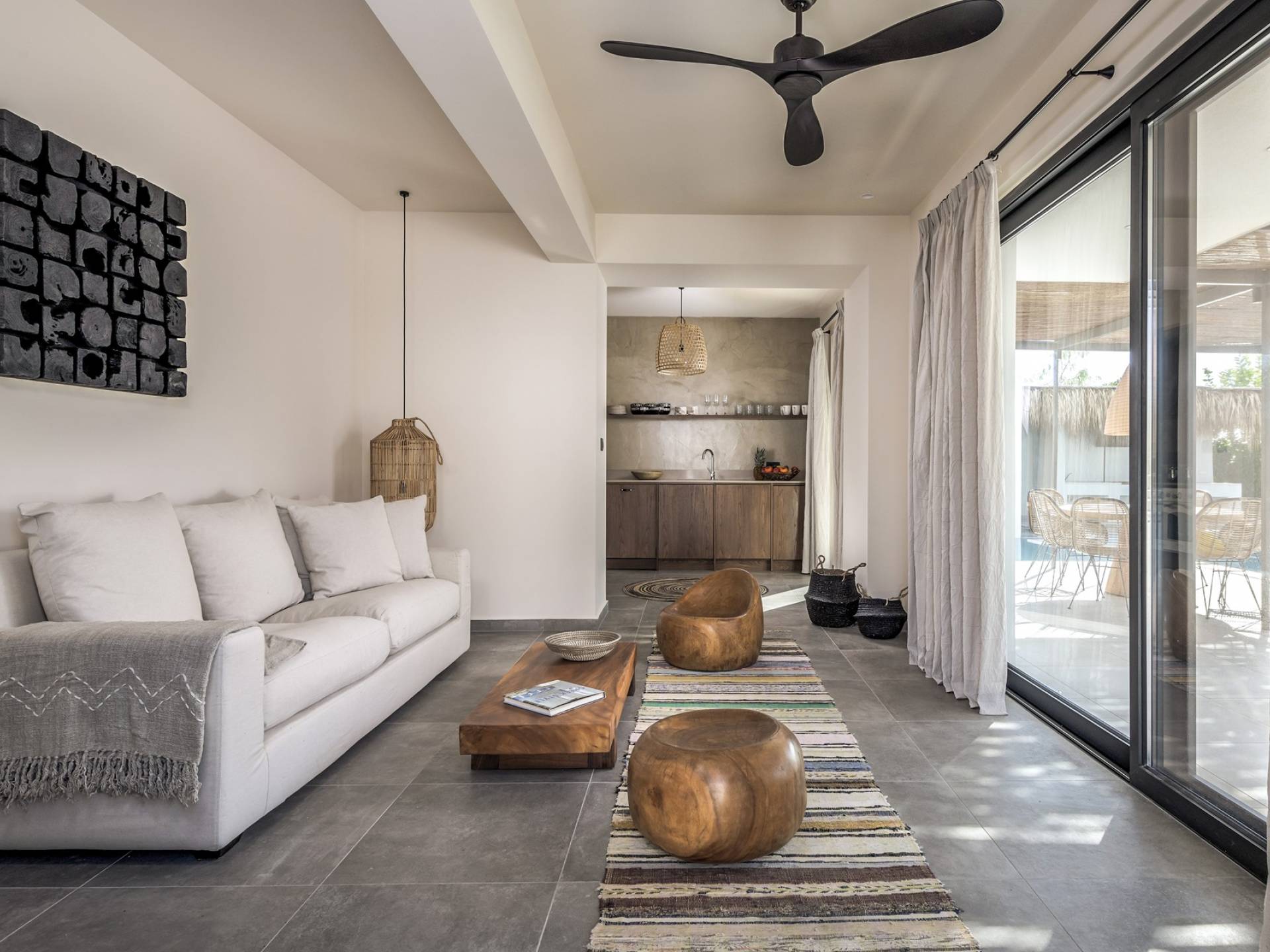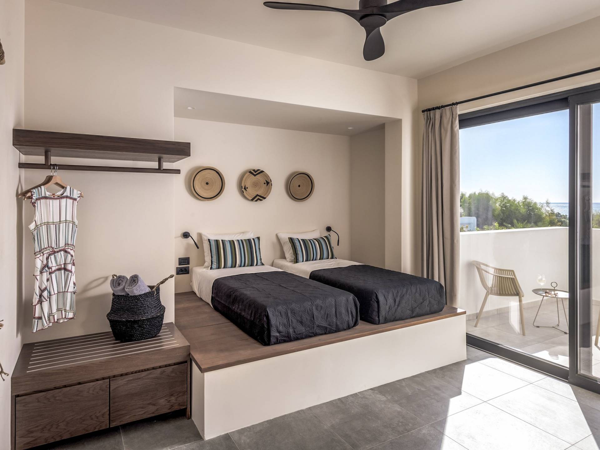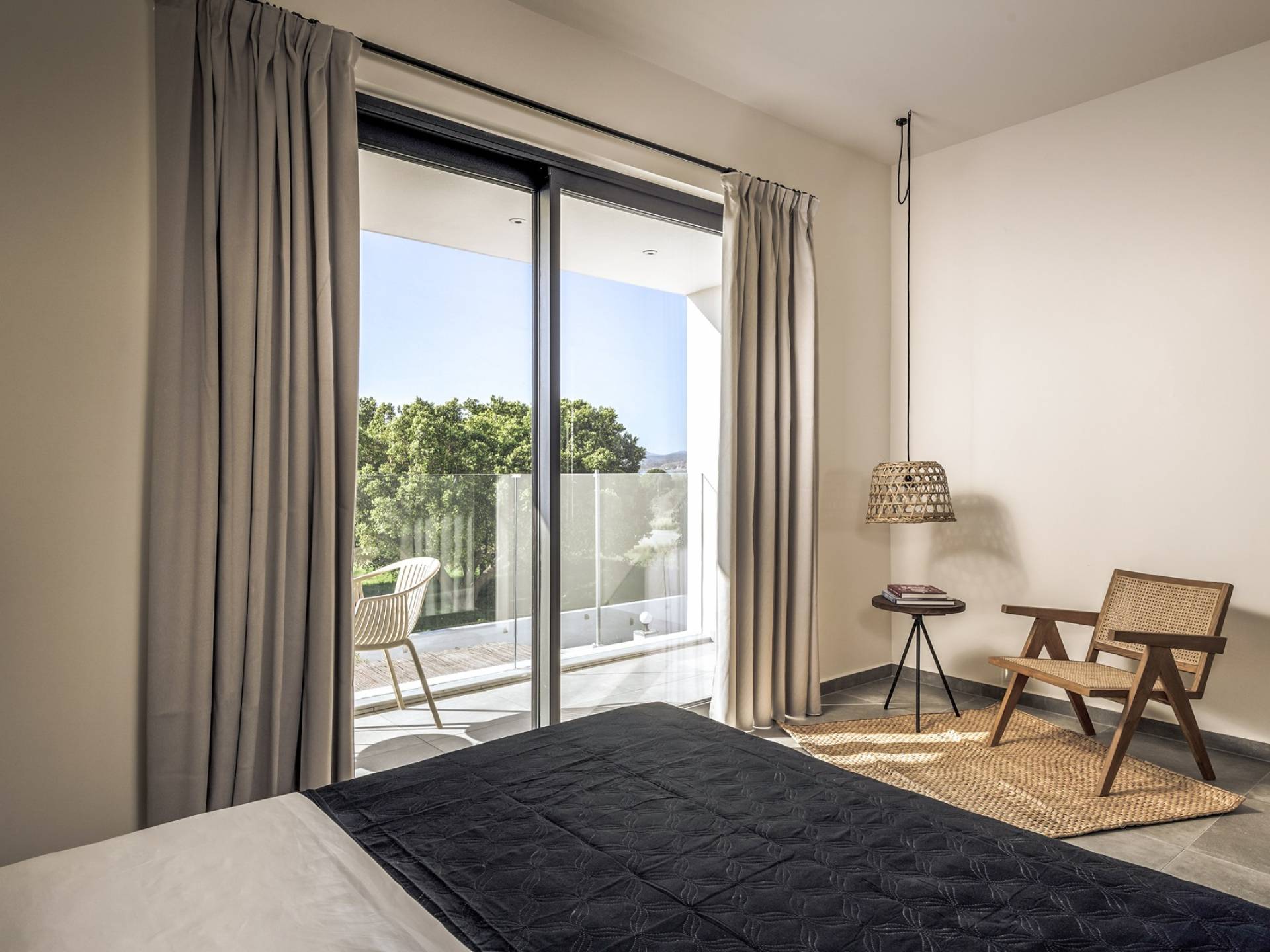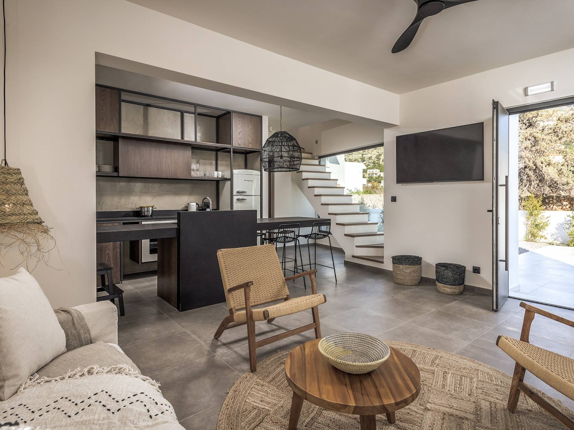 Both Villas feature 3 wonderful bedrooms with ensuite bathrooms and beautiful balconies, some of them offer a sea view. Four of the bedrooms have double beds and the other two have 2 single beds, all of them are fully air-conditioned. The modern living room combines luxurious comforts with a clear sense of home. The care that was put to the design of the property was meant to create a welcoming ambiance with a warm modern décor. The classy kitchen is fully equipped with every amenity you may need and is complemented by the BBQ facility outside, for you to indulge in culinary. Guests can enjoy free Wi-Fi access throughout the property. Outdoors, you will find the two amazing private swimming pools along with their stylish sunbeds. There, you can enjoy the summer sun; without a doubt, you’ll get the island feeling. The surrounding of the tastefully designed pool is quite pleasant, with a sitting area allowing you to enjoy any meal with your loved ones.