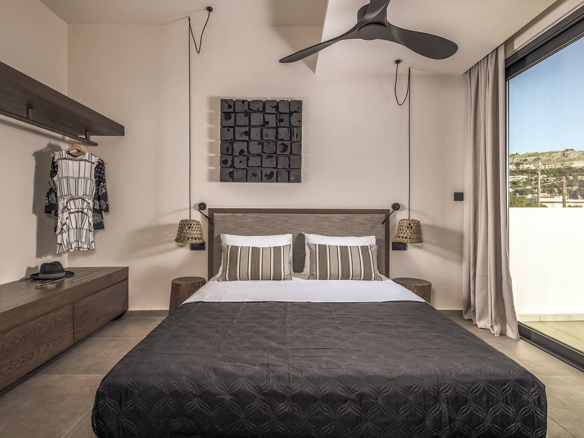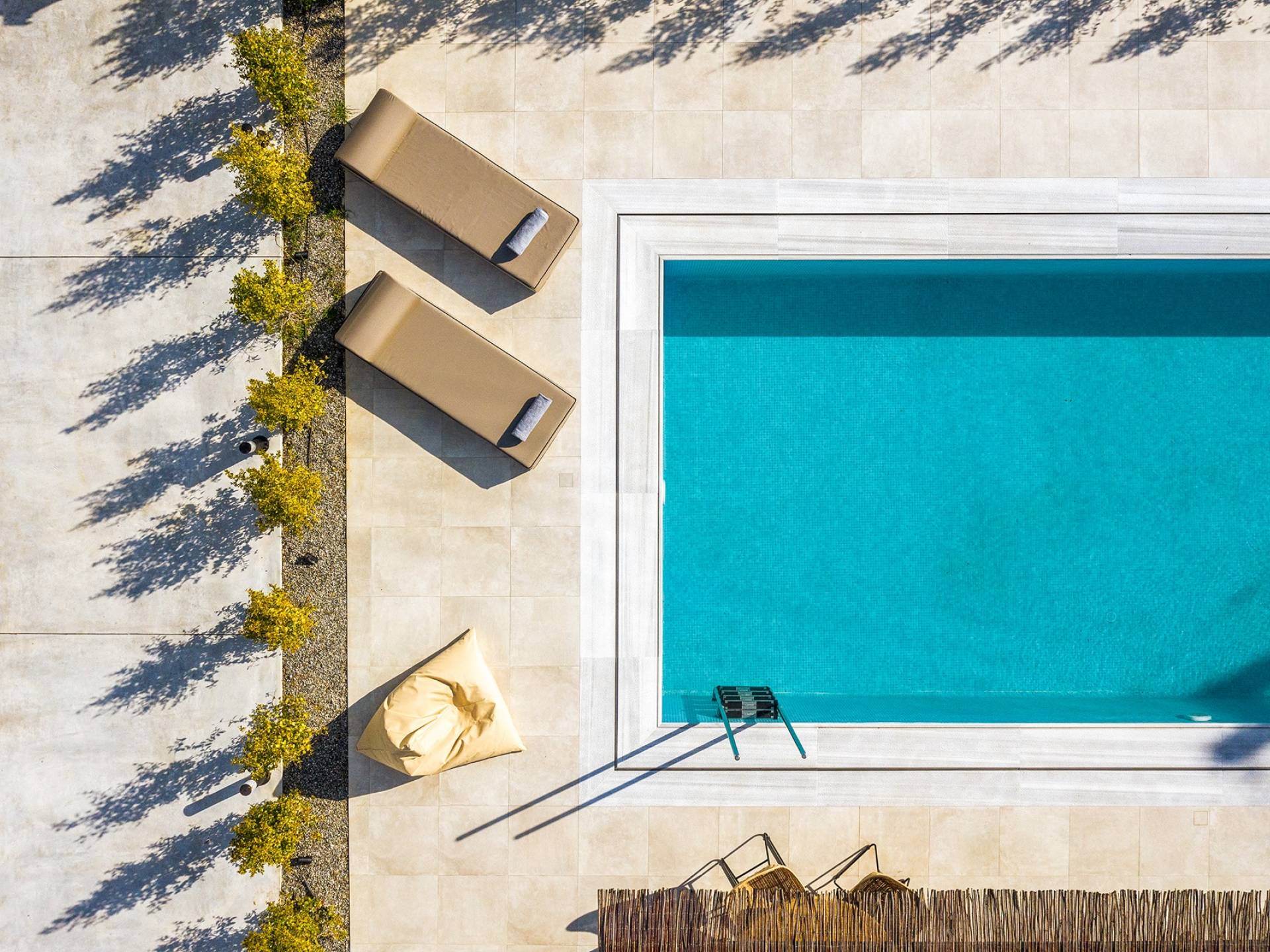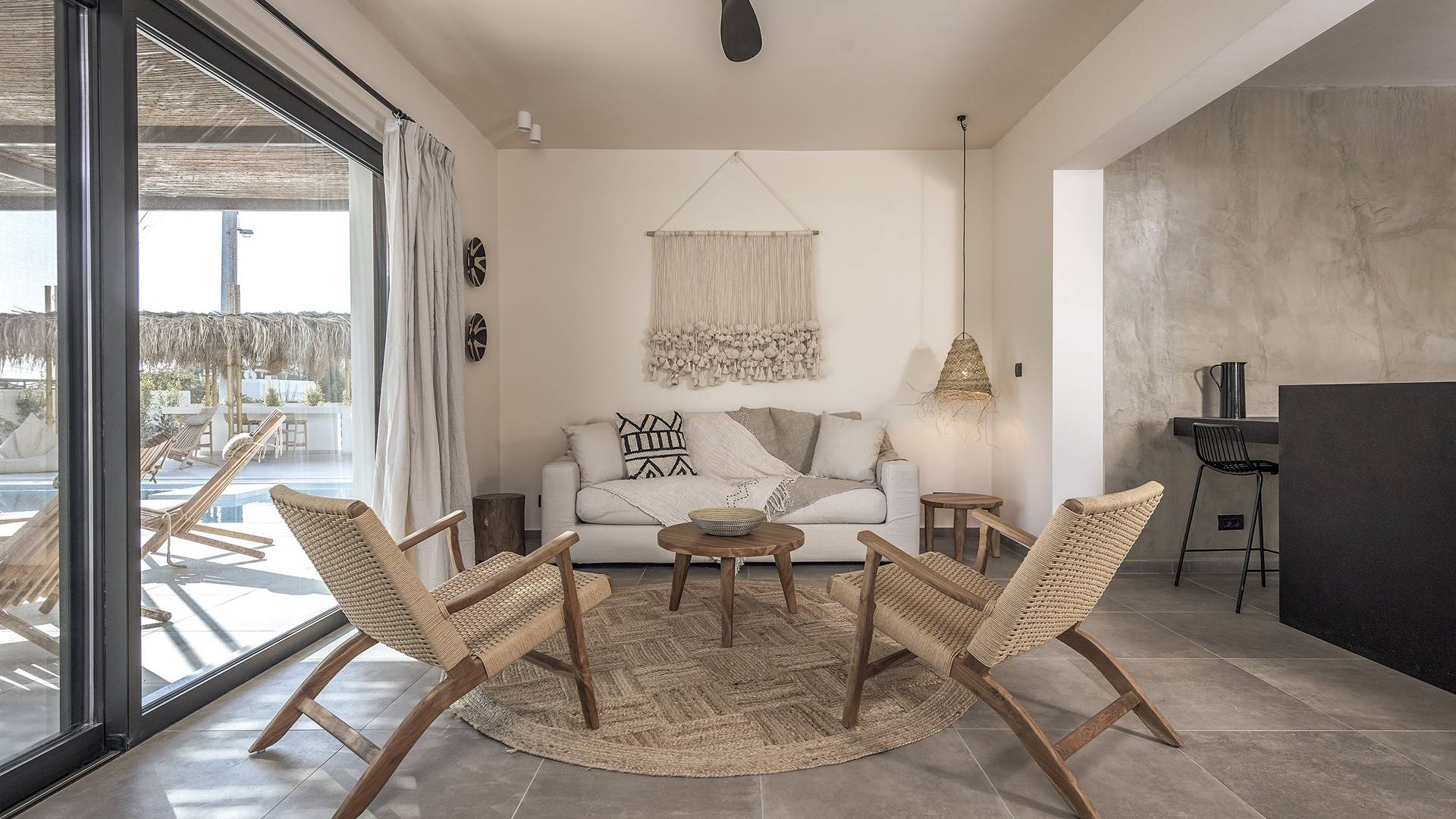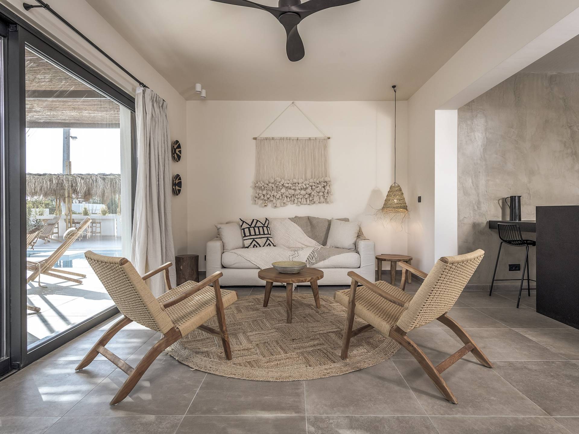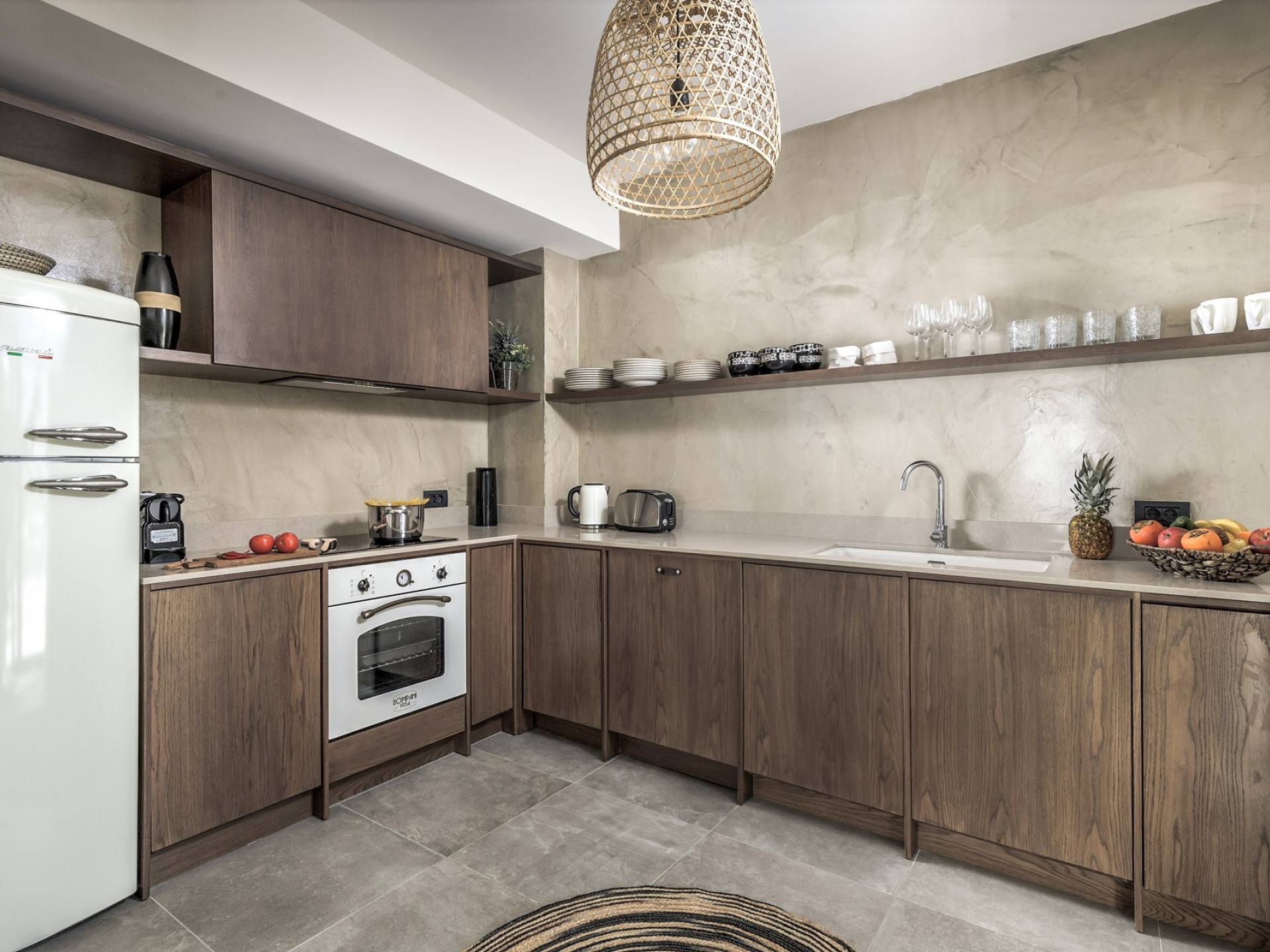 Both Villas feature 3 wonderful bedrooms with ensuite bathrooms and beautiful balconies, some of them offer a sea view. Four of the bedrooms have double beds and the other two have 2 single beds, all of them are fully air-conditioned. The modern living room combines luxurious comforts with a clear sense of home. The care that was put to the design of the property was meant to create a welcoming ambiance with a warm modern décor. The classy kitchen is fully equipped with every amenity you may need and is complemented by the BBQ facility outside, for you to indulge in culinary. Guests can enjoy free Wi-Fi access throughout the property. Outdoors, you will find the two amazing private swimming pools along with their stylish sunbeds. There, you can enjoy the summer sun; without a doubt, you’ll get the island feeling. The surrounding of the tastefully designed pool is quite pleasant, with a sitting area allowing you to enjoy any meal with your loved ones.