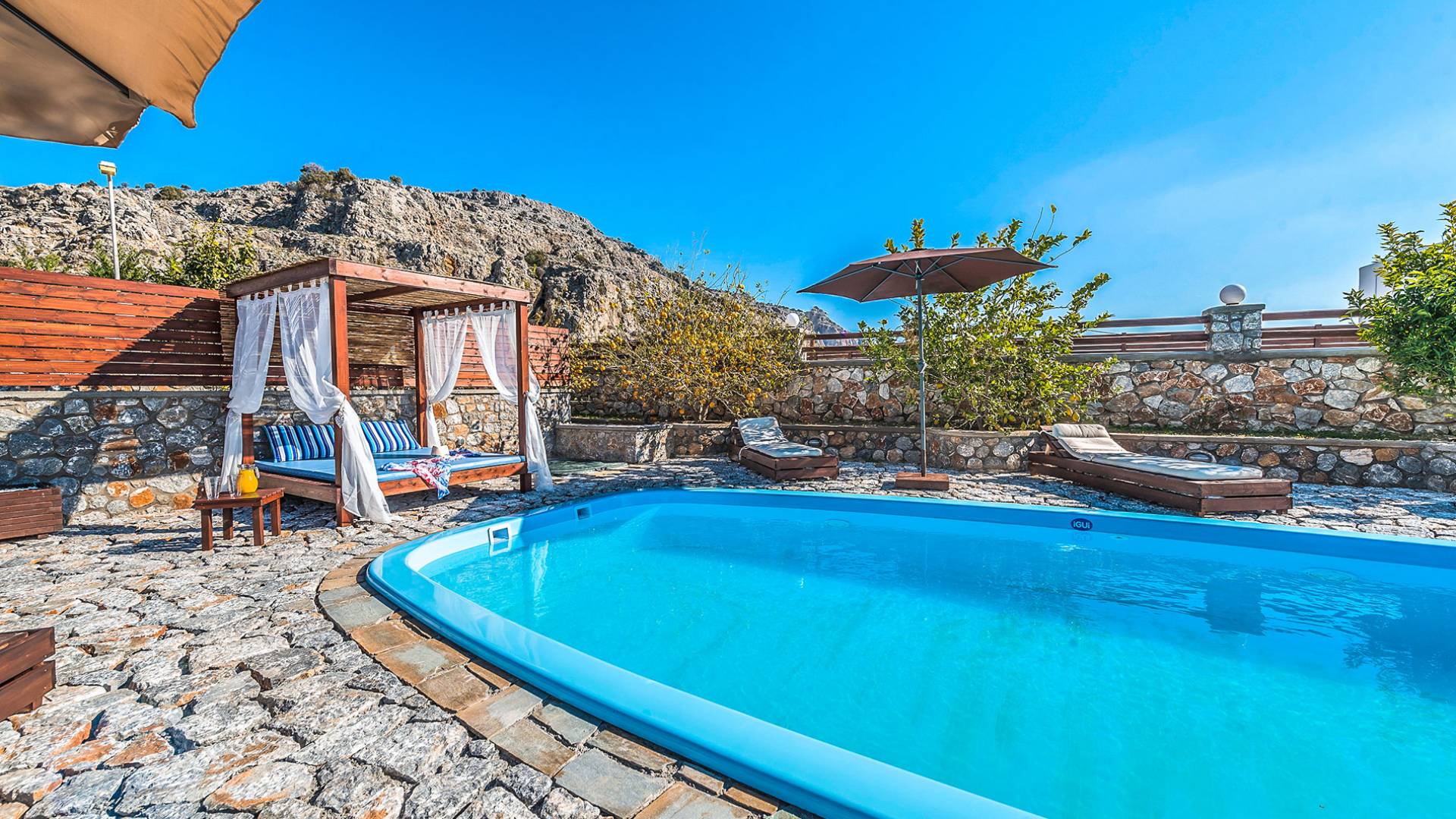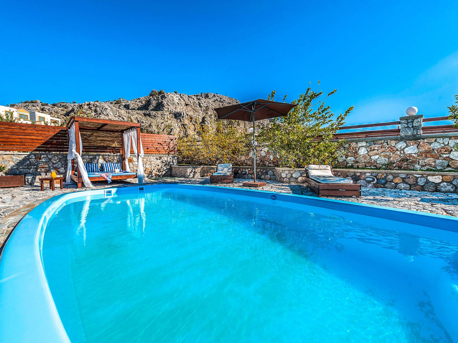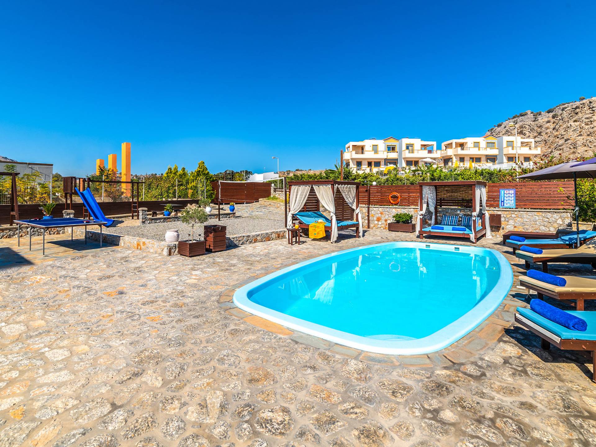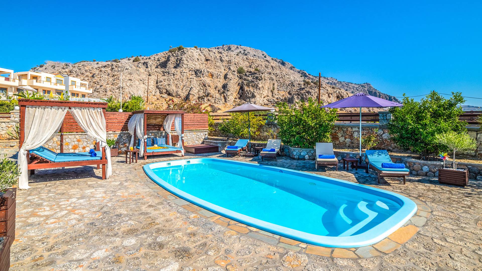 Villa Maripaul Rhodes is a luxury villa rental with 4 bedrooms and a private pool. Maripaul Villa is an ideal property for families and groups of friends of up to 8 members, seeking a relaxing holiday near the sea. The villa has 1 master bedroom with its’ private sitting area and access to a balcony, 3 more bedrooms with large double beds, a flat-screen TV in every bedroom, a comfortable living room with flat-screen TV and satellite channels, a large dining area, and a fully equipped kitchen with stove, fridge, oven, microwave, dishwasher, washing machine, water boiler, coffee maker, toaster, etc. There are two bathrooms, one with a bathtub and one with a shower.