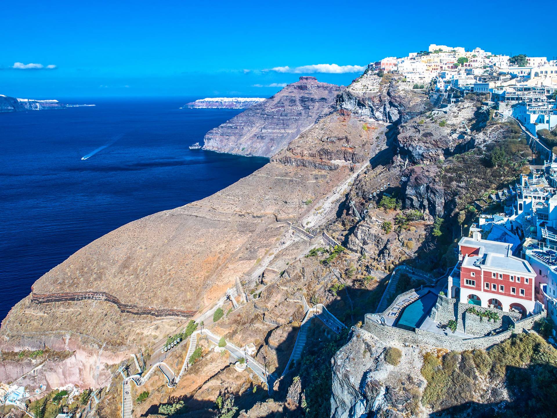 show more detailsFira Santorini is the capital of Santorini, Greece located at the west side of the island, 10 km away from the main port of Athinios. Built on a cliff, at a height of 260 meters, it offers a breathtaking panoramic view of the volcano. The town of Fira gets very busy during the high season. It is a typical Cycladic village with charming whitewashed houses, with blue doors and windows and small labyrinth-like paved alleys. Most of its beautiful buildings are of Venetian architecture, including some blue domed churches and colorful verandas that open up an incredible view of the volcano and the world famous sunset of Santorini. Fira is the commercial center of the island with all kinds of shops, great restaurants, cafes, bars and night clubs. The caldera is considered the highlight of Santorini. For those into history, a visit to the Archaeological Museum is a must do. The town includes numerous churches and monasteries worth visiting such as Agios Minas, the cathedral of Ipapanti, the cathedral of Christ, the monastery of Panagia ton Dominikanidon, and others. Fira also has a port that is only used for cruise boats. From there, boats can take visitors for a tour to the volcano of Nea and Palia Kameni.