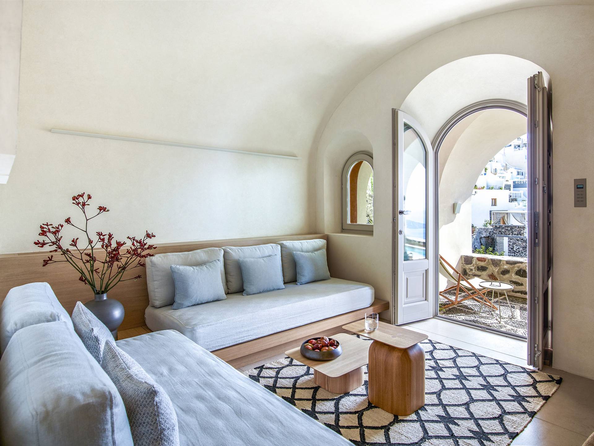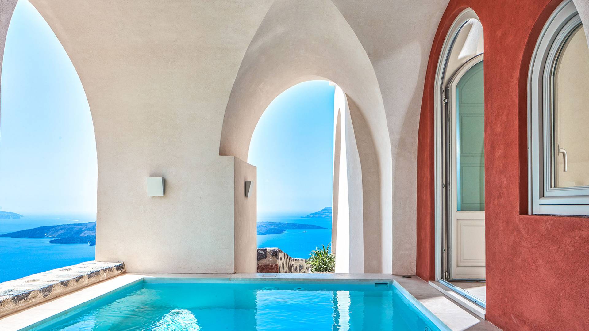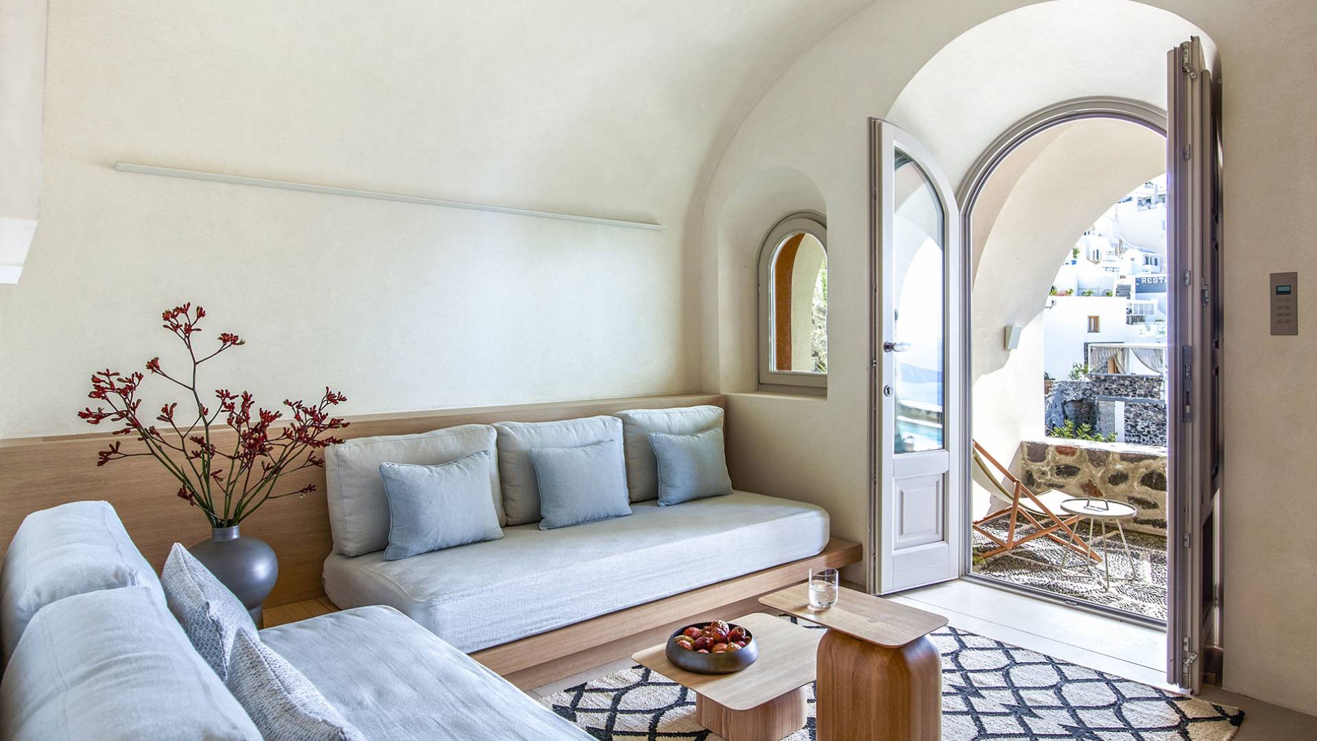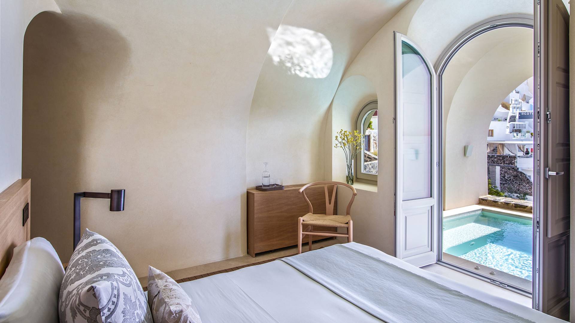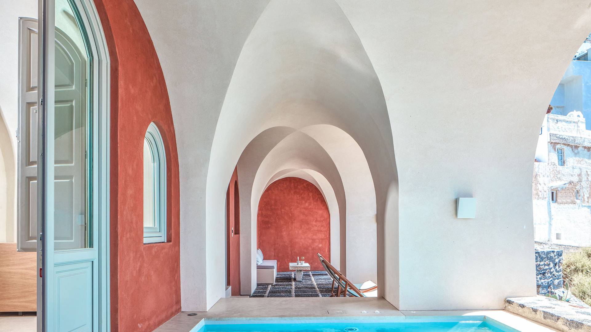 Terra Suite at Villa Bordeaux Santorini is a luxury suite rental with 1 bedroom and a private pool. Covering an area of 60 square meters, the Terra Suite features an elegant living room with sofa beds with views to the sea and the caldera, a large boudoir, a spacious bathroom and a steam/hammam room for hours of complete repose. Esteemed guests are welcome to fully unwind on the king-size bed of the master bedroom offering direct access to the private veranda with the plunge pool and sunbeds from where the views to the caldera and the volcanic islands are simply breath-taking. Inspired by the eternal element of life, earth, the Terra Suite offers a natural haven for esteemed guests.