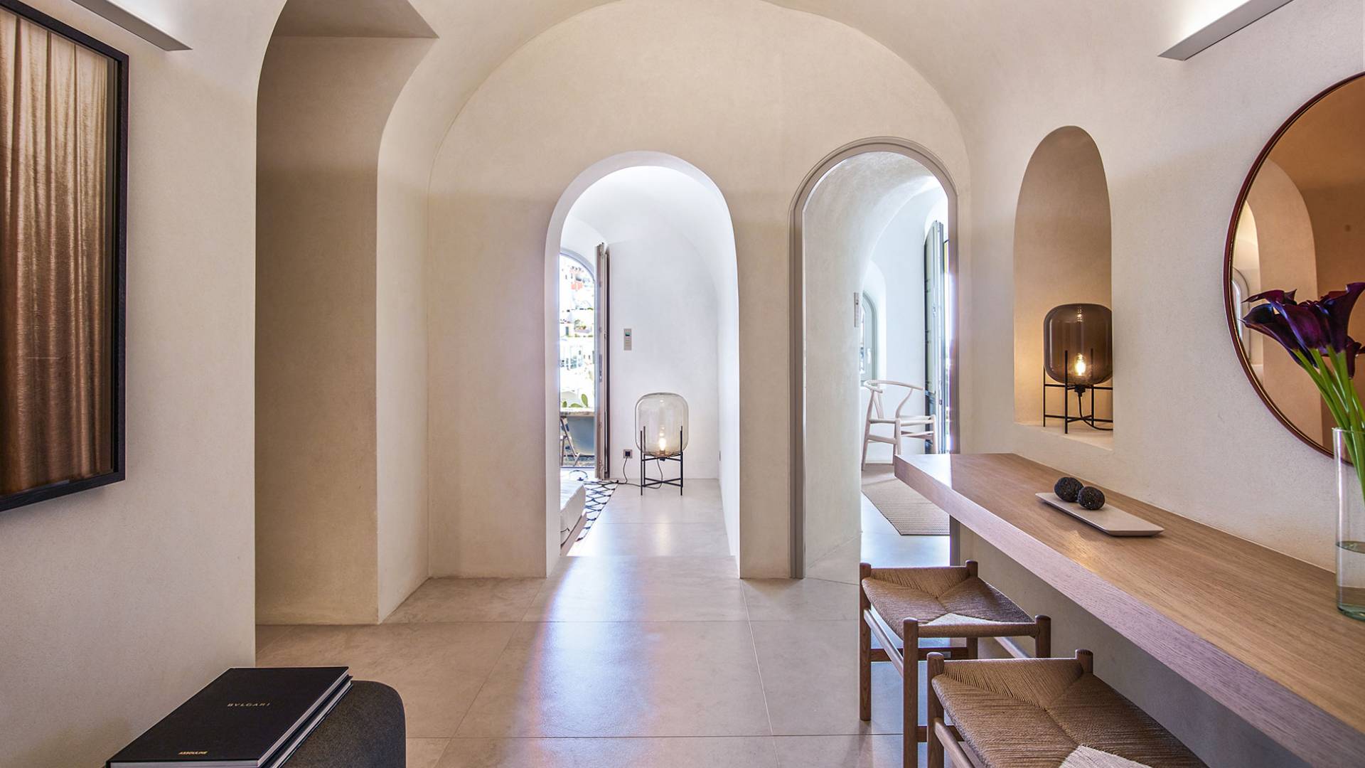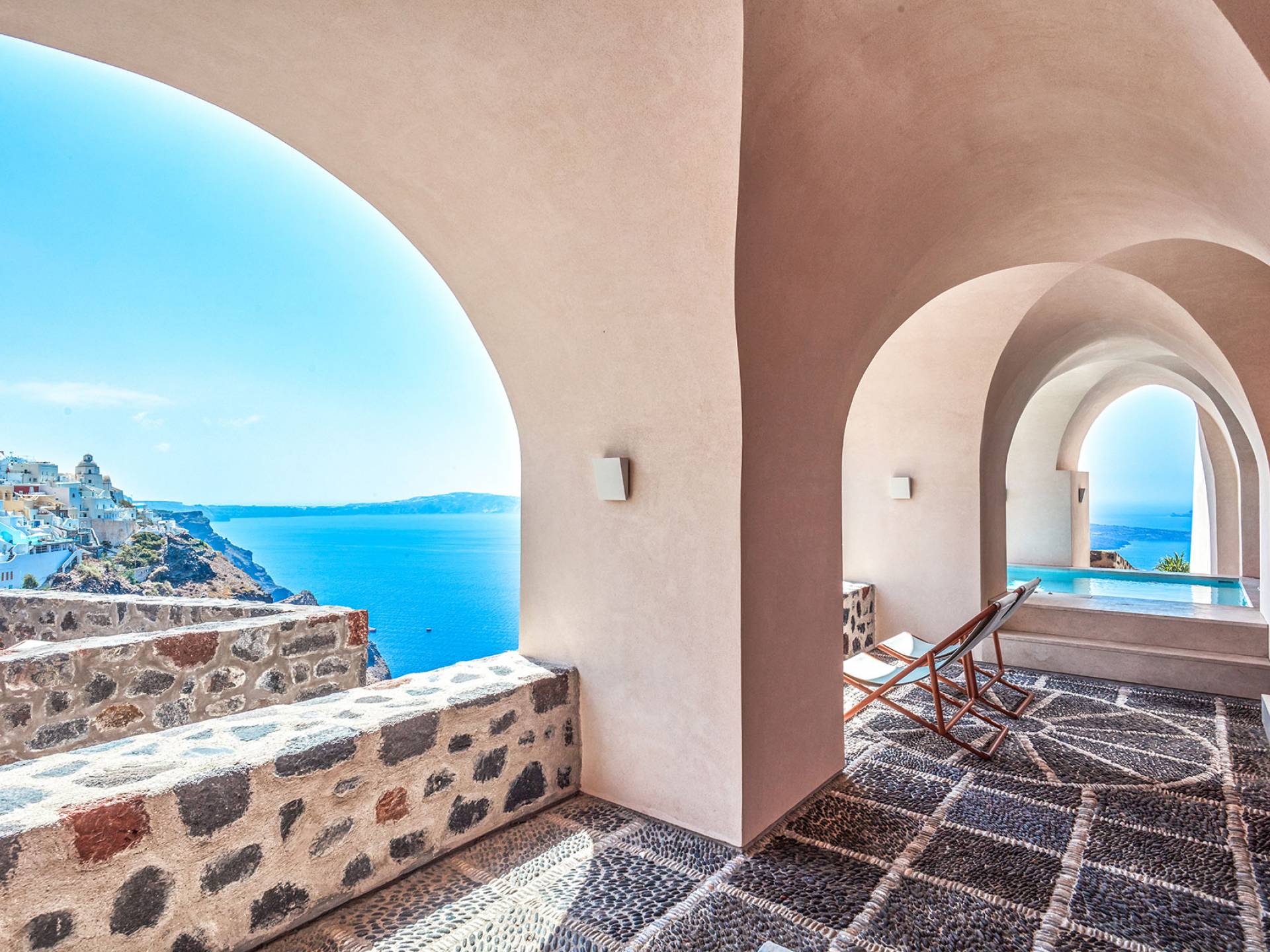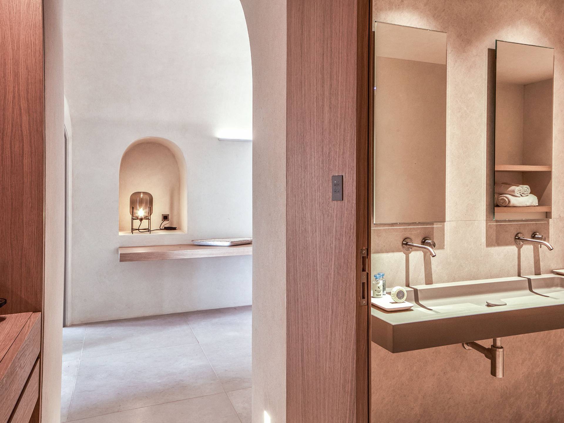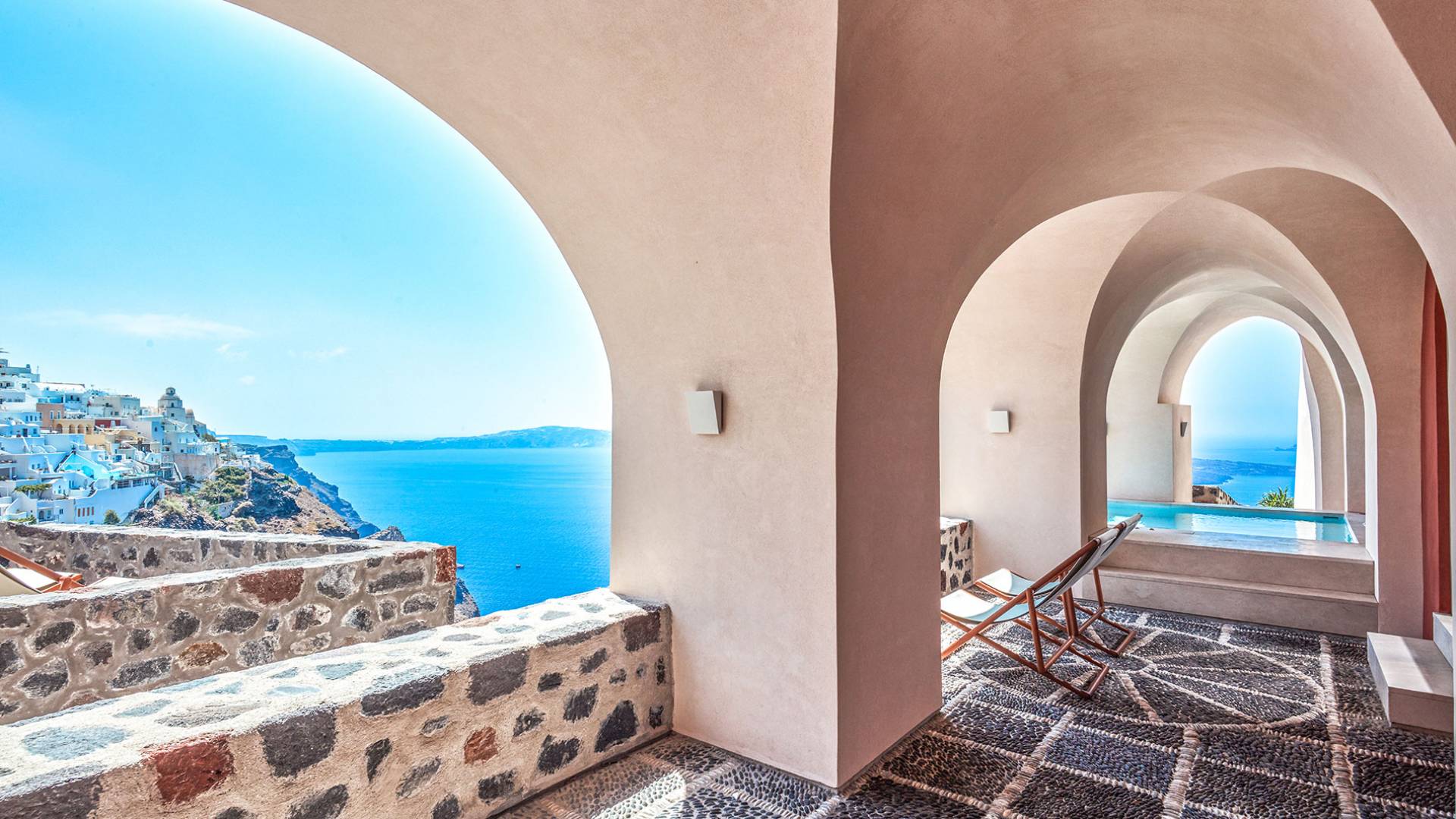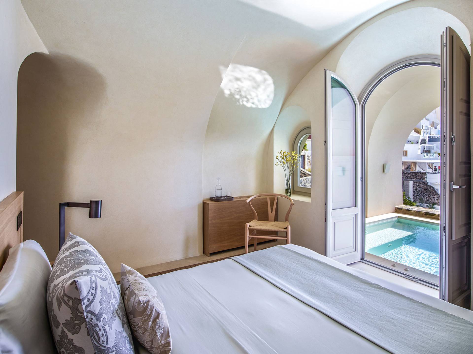 Terra Suite at Villa Bordeaux Santorini is a luxury suite rental with 1 bedroom and a private pool. Covering an area of 60 square meters, the Terra Suite features an elegant living room with sofa beds with views to the sea and the caldera, a large boudoir, a spacious bathroom and a steam/hammam room for hours of complete repose. Esteemed guests are welcome to fully unwind on the king-size bed of the master bedroom offering direct access to the private veranda with the plunge pool and sunbeds from where the views to the caldera and the volcanic islands are simply breath-taking. Inspired by the eternal element of life, earth, the Terra Suite offers a natural haven for esteemed guests.