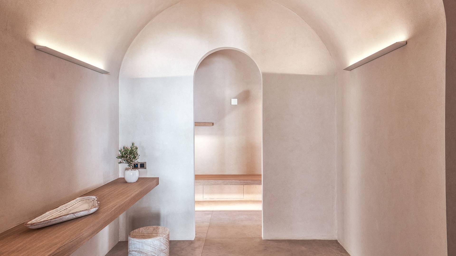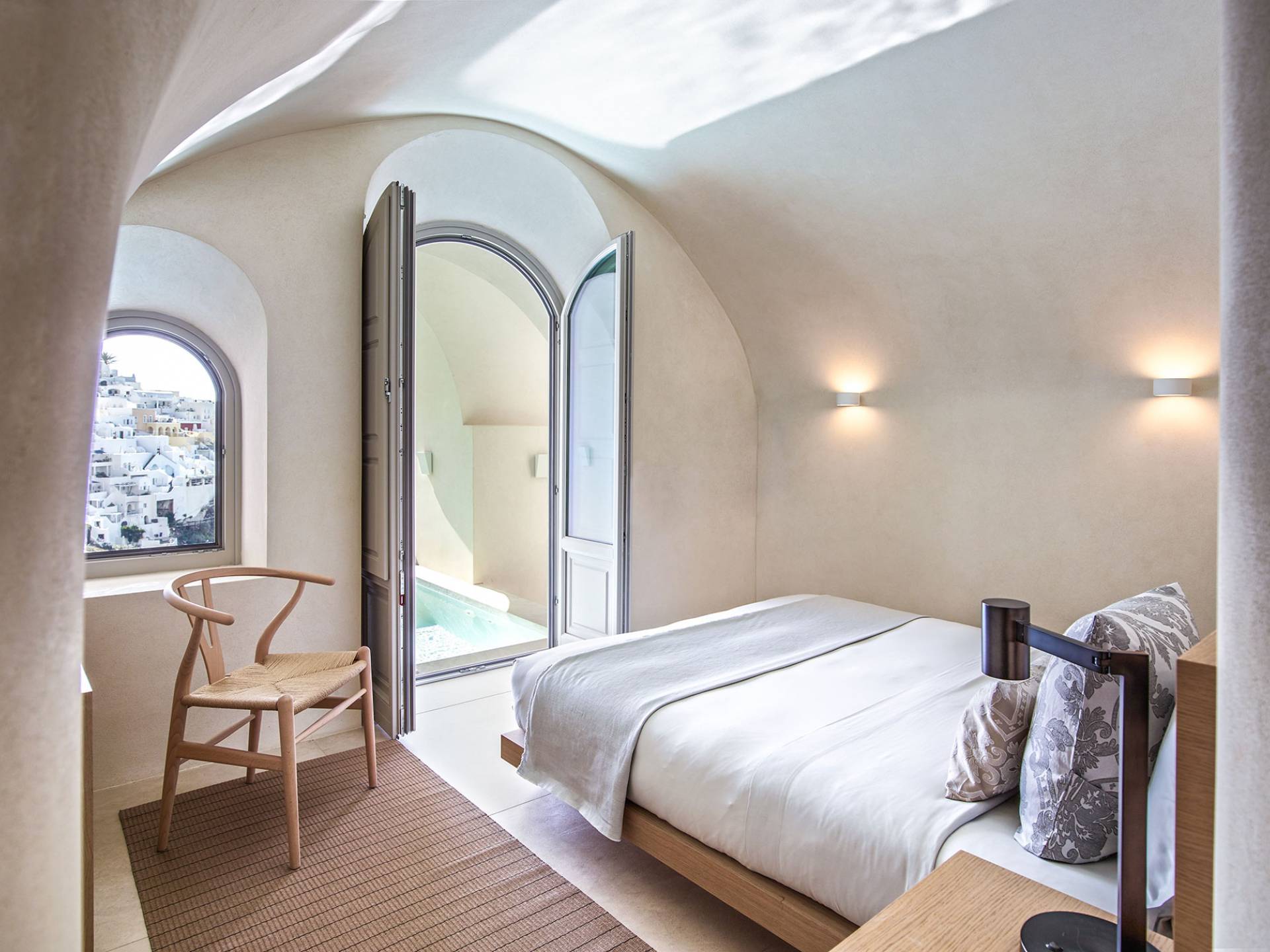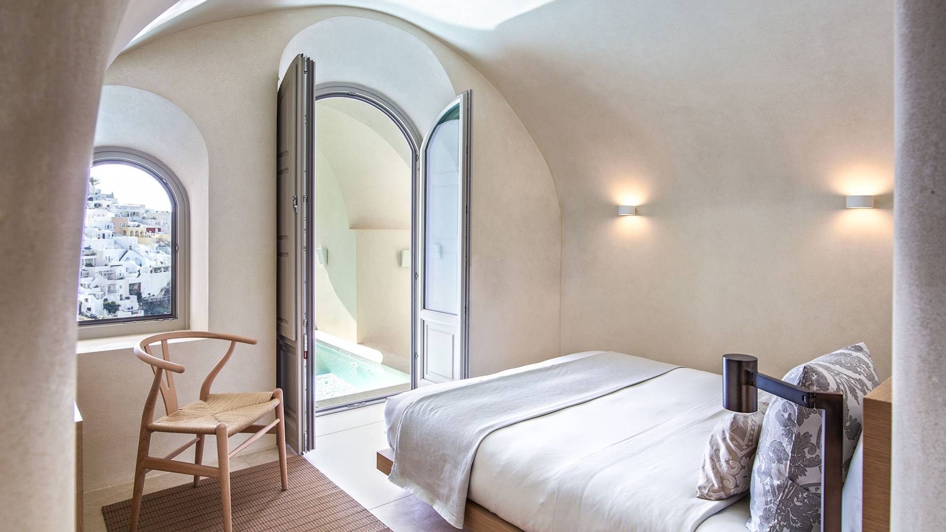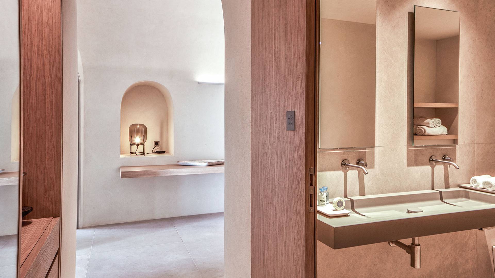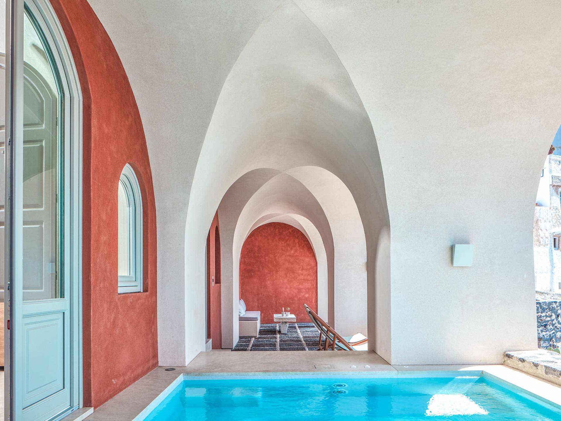 Terra Suite at Villa Bordeaux Santorini is a luxury suite rental with 1 bedroom and a private pool. Covering an area of 60 square meters, the Terra Suite features an elegant living room with sofa beds with views to the sea and the caldera, a large boudoir, a spacious bathroom and a steam/hammam room for hours of complete repose. Esteemed guests are welcome to fully unwind on the king-size bed of the master bedroom offering direct access to the private veranda with the plunge pool and sunbeds from where the views to the caldera and the volcanic islands are simply breath-taking. Inspired by the eternal element of life, earth, the Terra Suite offers a natural haven for esteemed guests.