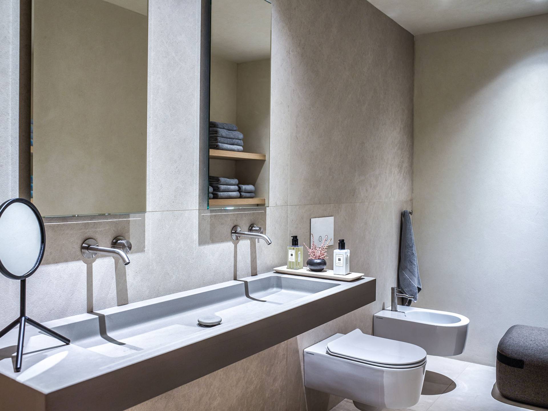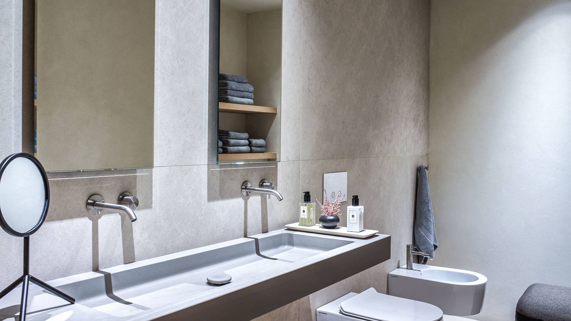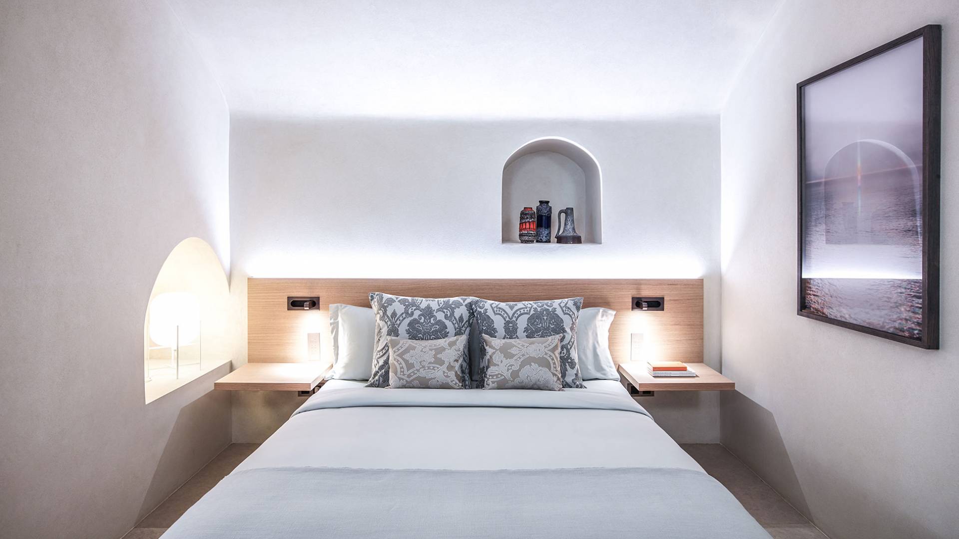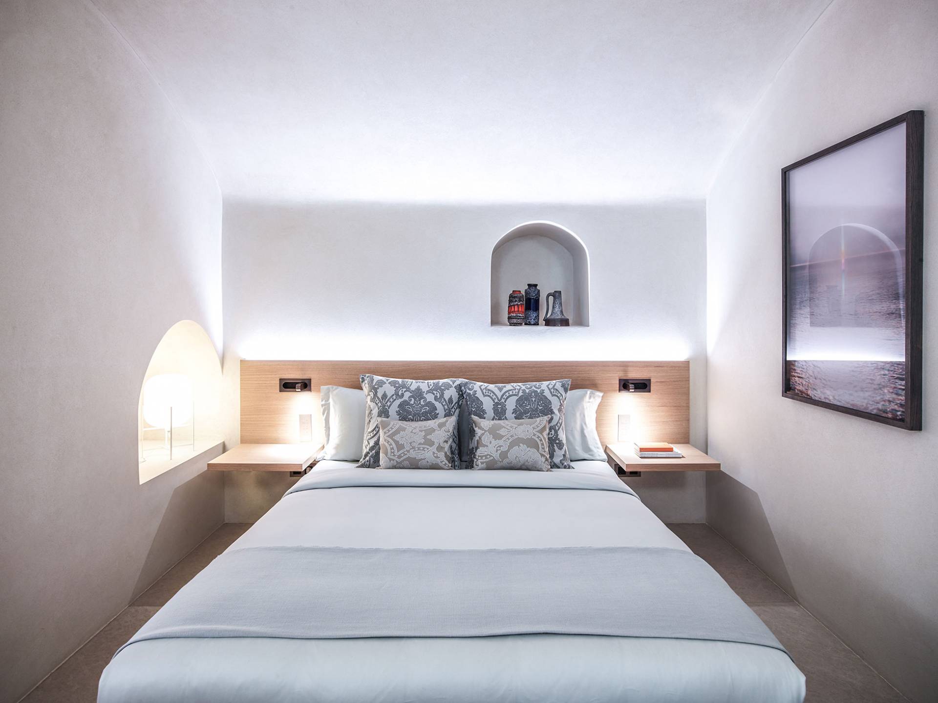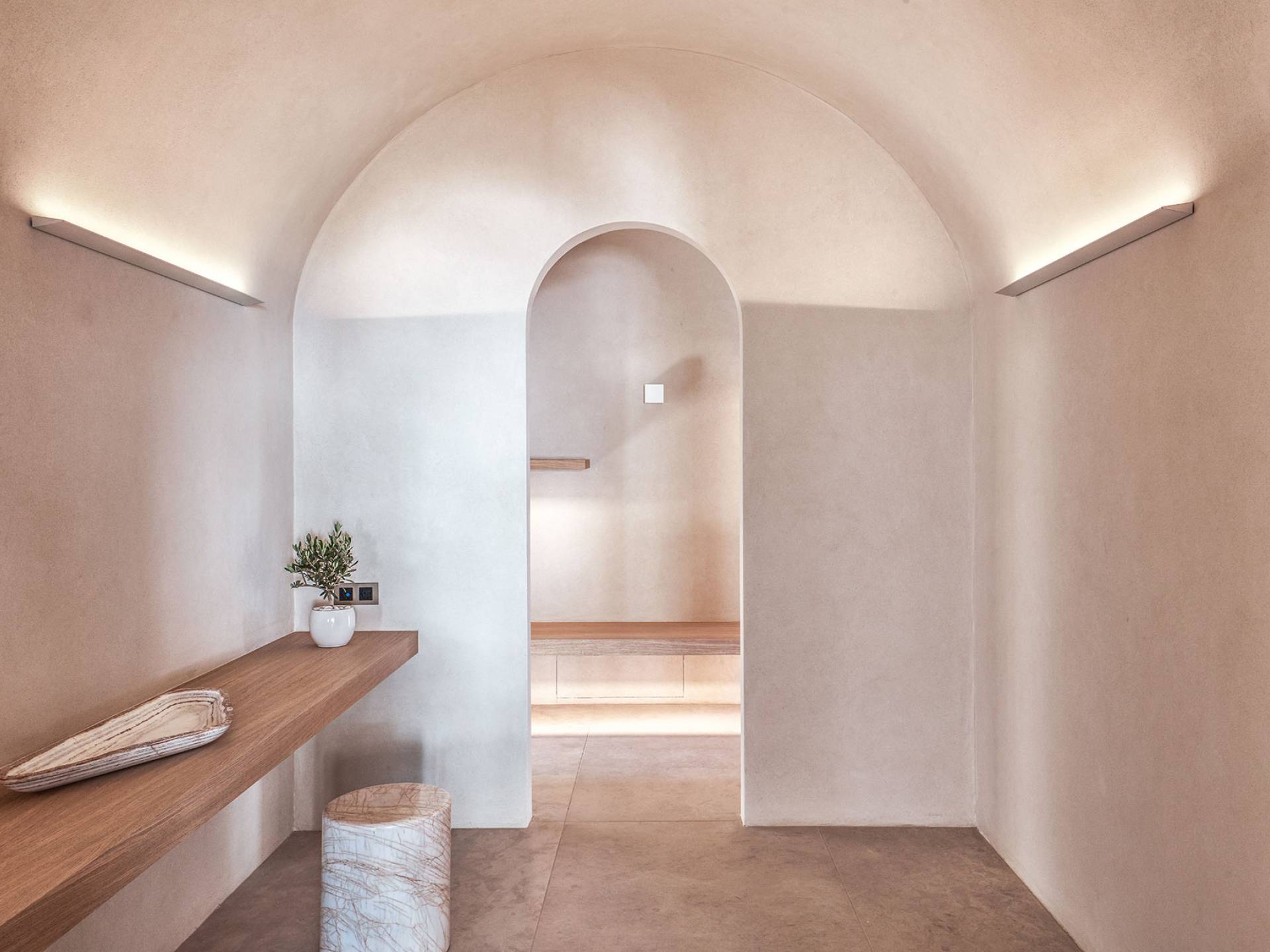 Terra Suite at Villa Bordeaux Santorini is a luxury suite rental with 1 bedroom and a private pool. Covering an area of 60 square meters, the Terra Suite features an elegant living room with sofa beds with views to the sea and the caldera, a large boudoir, a spacious bathroom and a steam/hammam room for hours of complete repose. Esteemed guests are welcome to fully unwind on the king-size bed of the master bedroom offering direct access to the private veranda with the plunge pool and sunbeds from where the views to the caldera and the volcanic islands are simply breath-taking. Inspired by the eternal element of life, earth, the Terra Suite offers a natural haven for esteemed guests.
