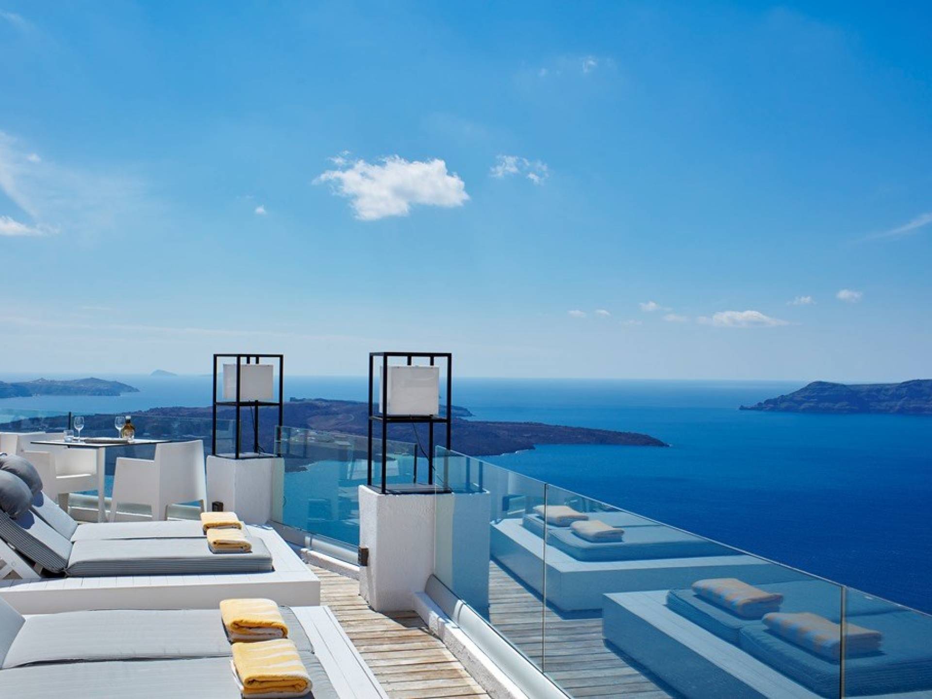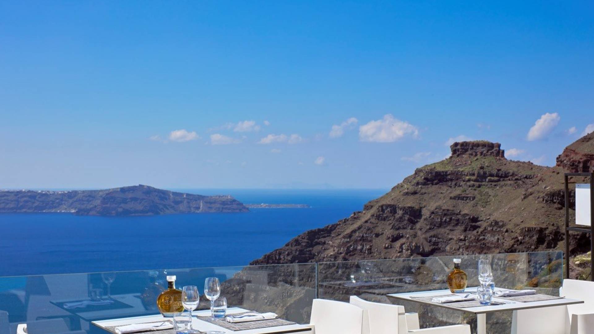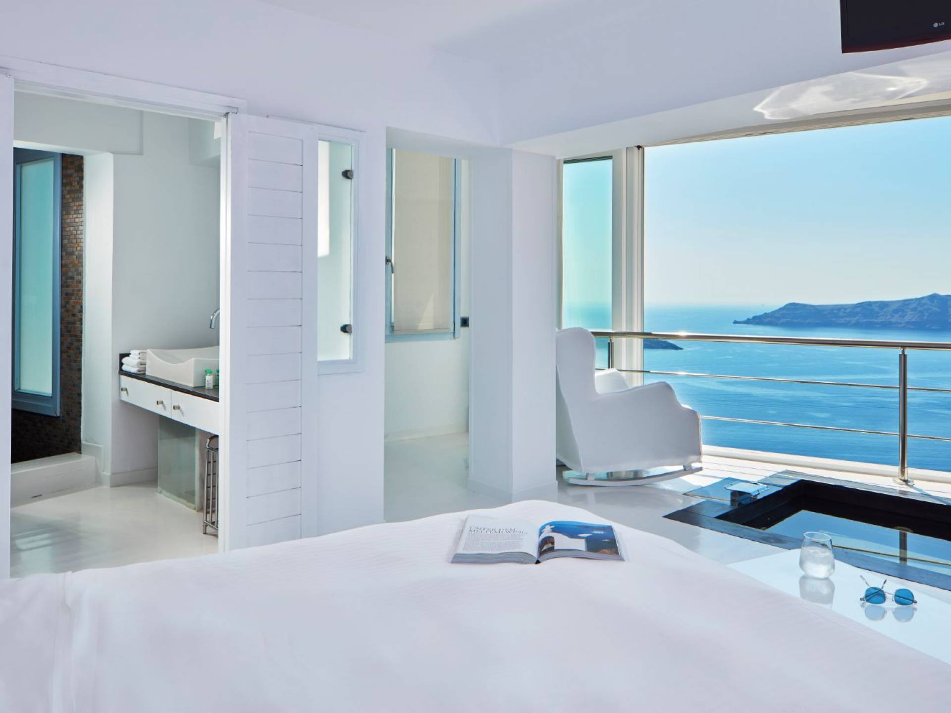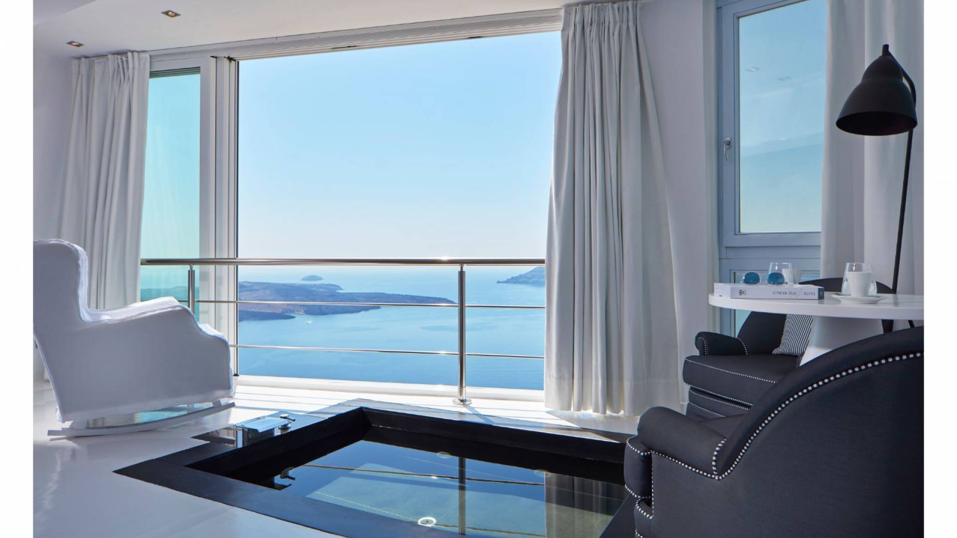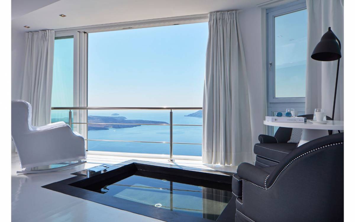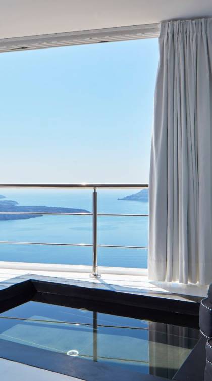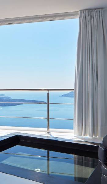 Providing pure romance within a divinely decadent whole, the sumptuous Sun Rocks Experience Suites, pampering open-plan bedrooms, open up into marvelous, inventive living areas. The enticing black, sunken marble Jacuzzi sits beneath floor-to-ceiling windows and brings the incredible views of the Caldera and the Aegean Sea right into the suites themselves.