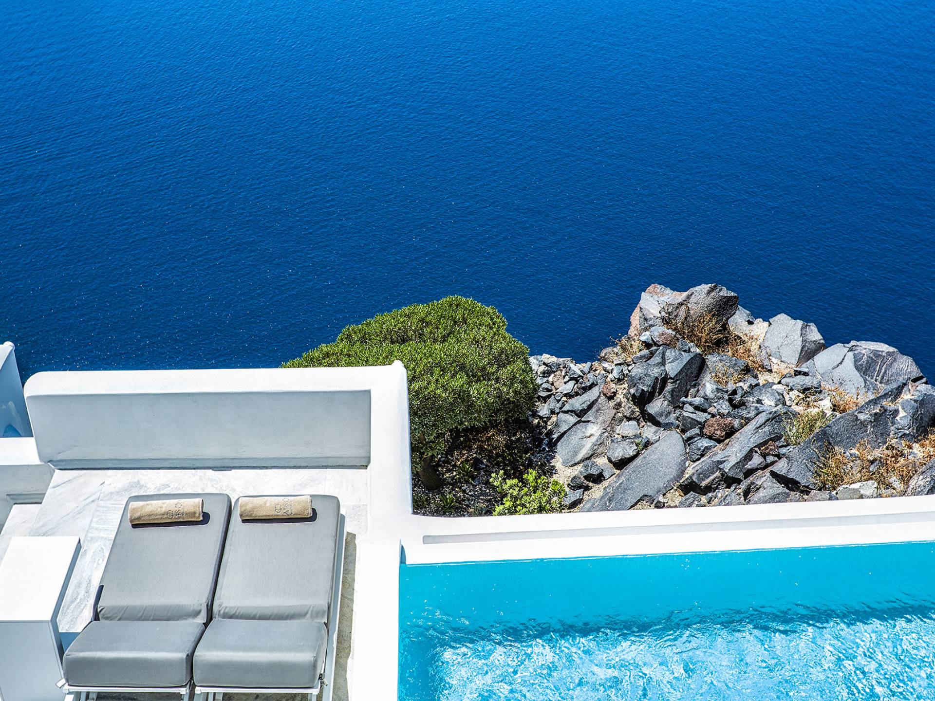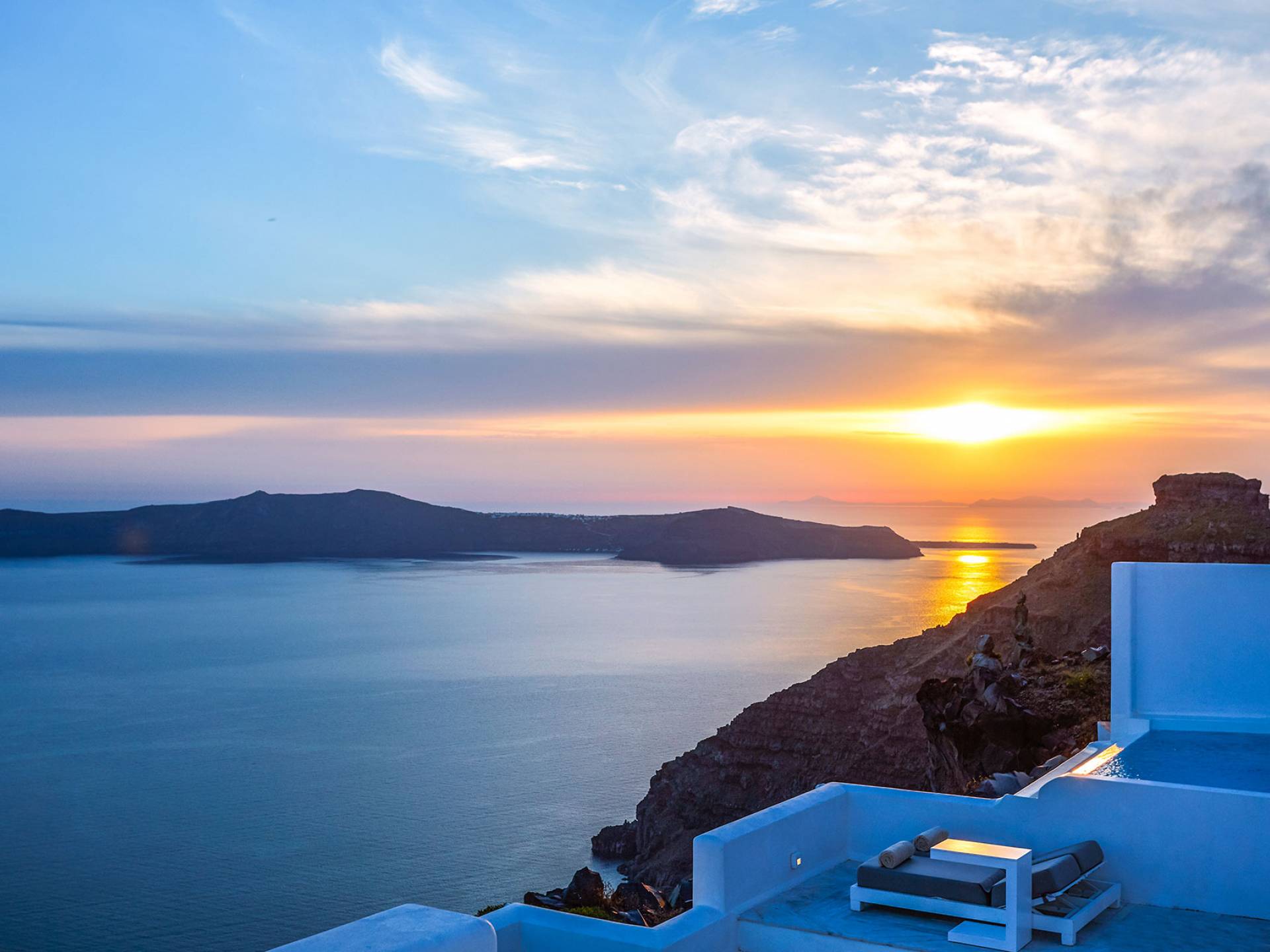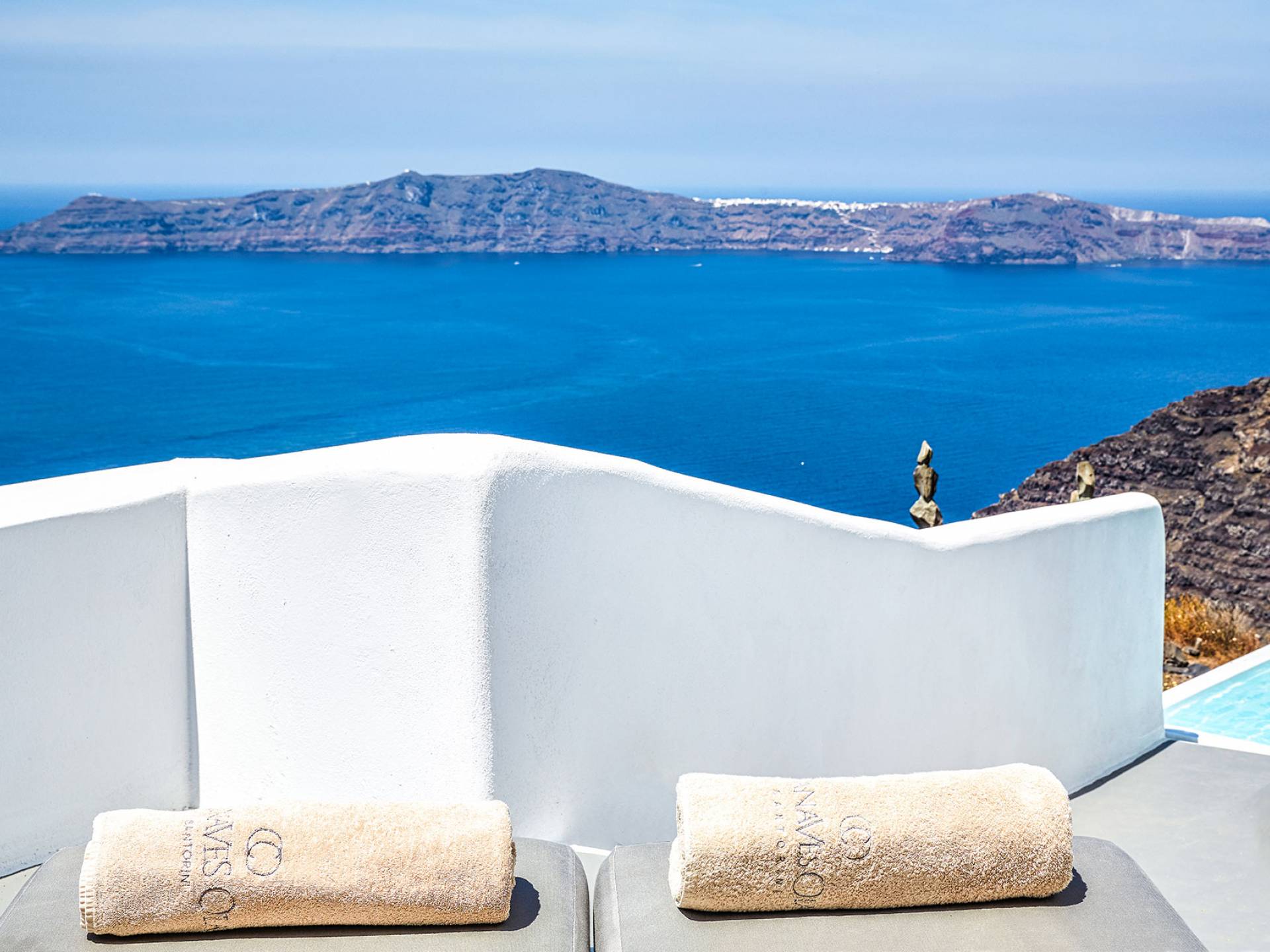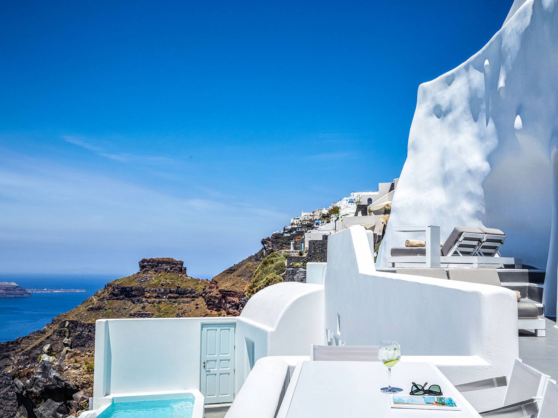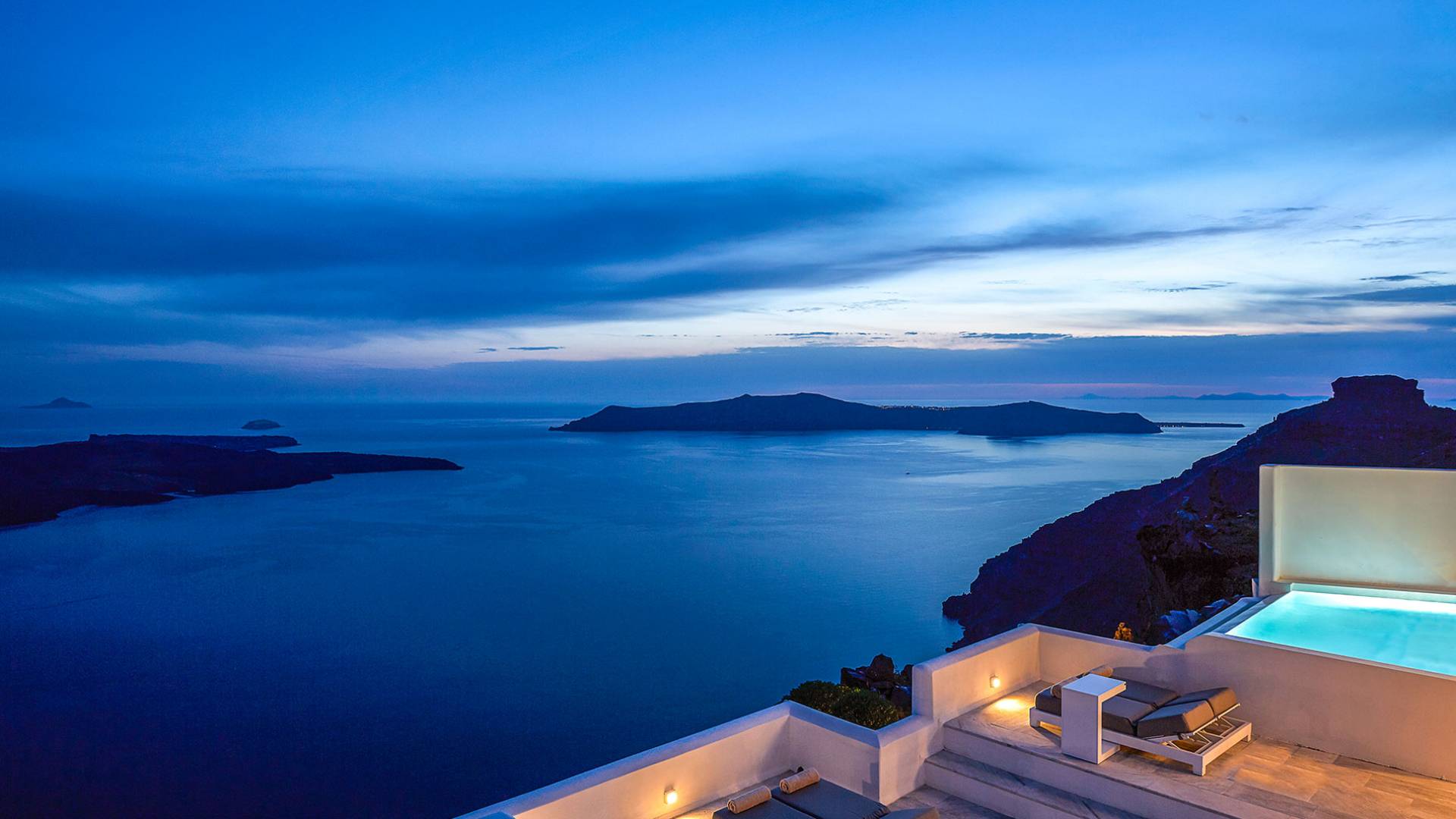 Alongside all the VIP amenities and services you could wish for, you will find your own private hot tub on your balcony. The Two Bedroom Villa with Outdoor Plunge Pool and Caldera View will be the perfect place to unwind in a calm and private setting; it offers spectacular unobstructed views to the volcano, Skaros Rock and the sunset and a hot tub in the balcony.