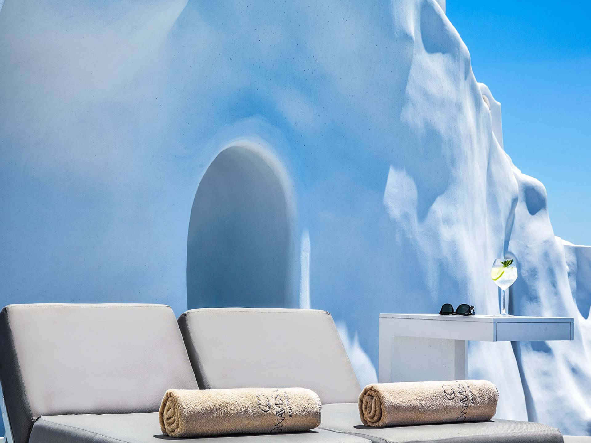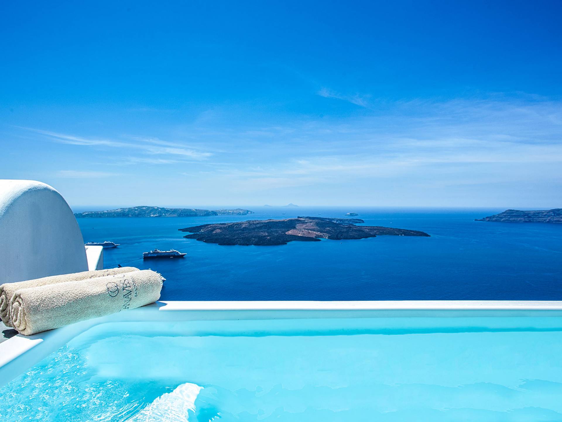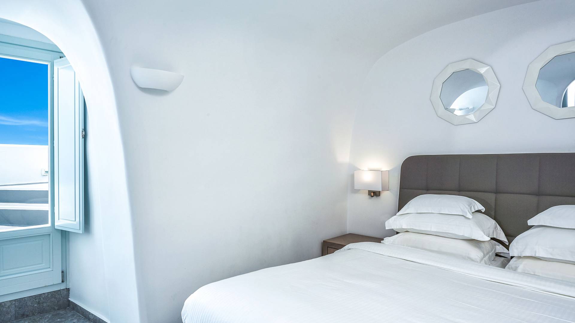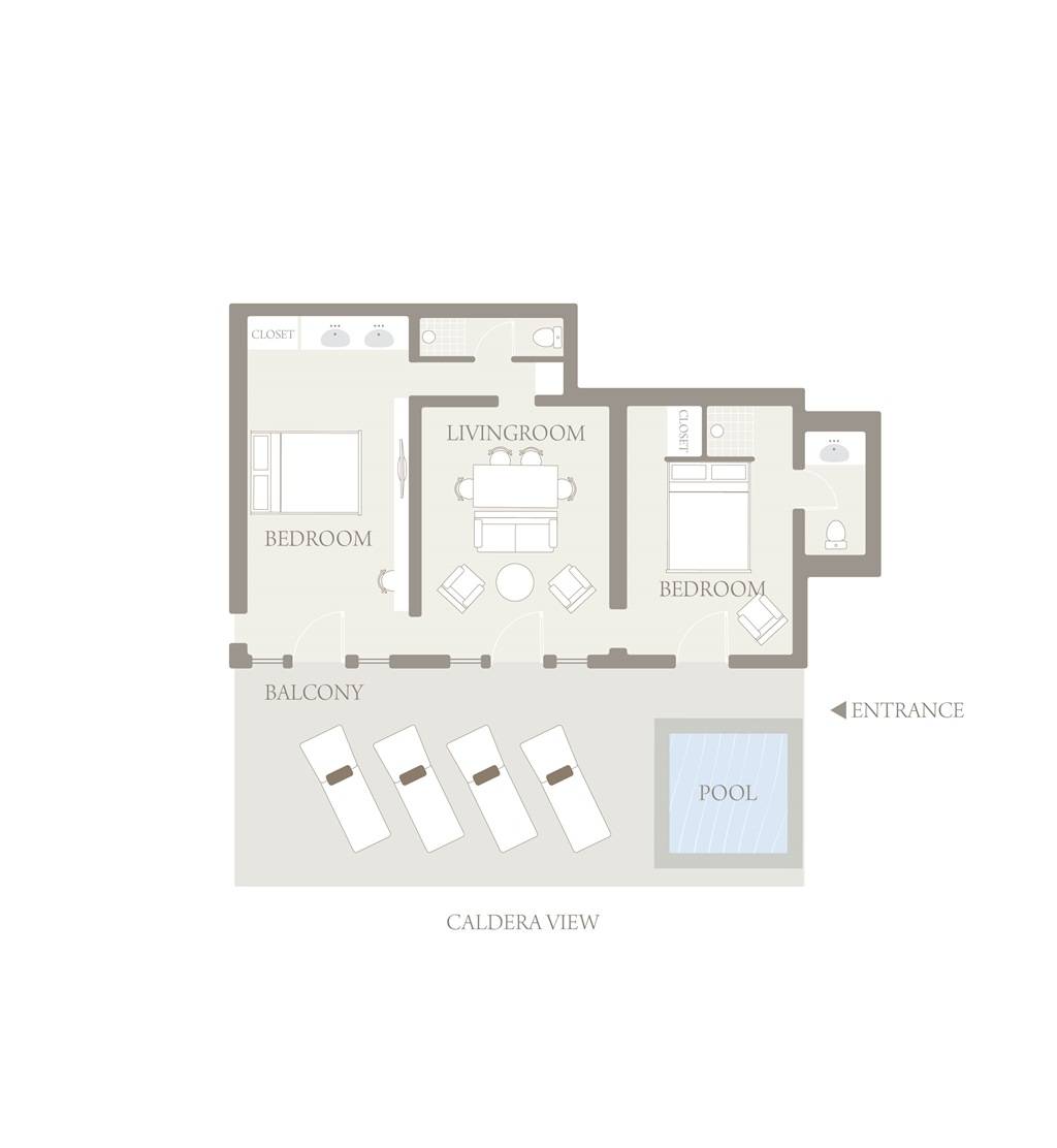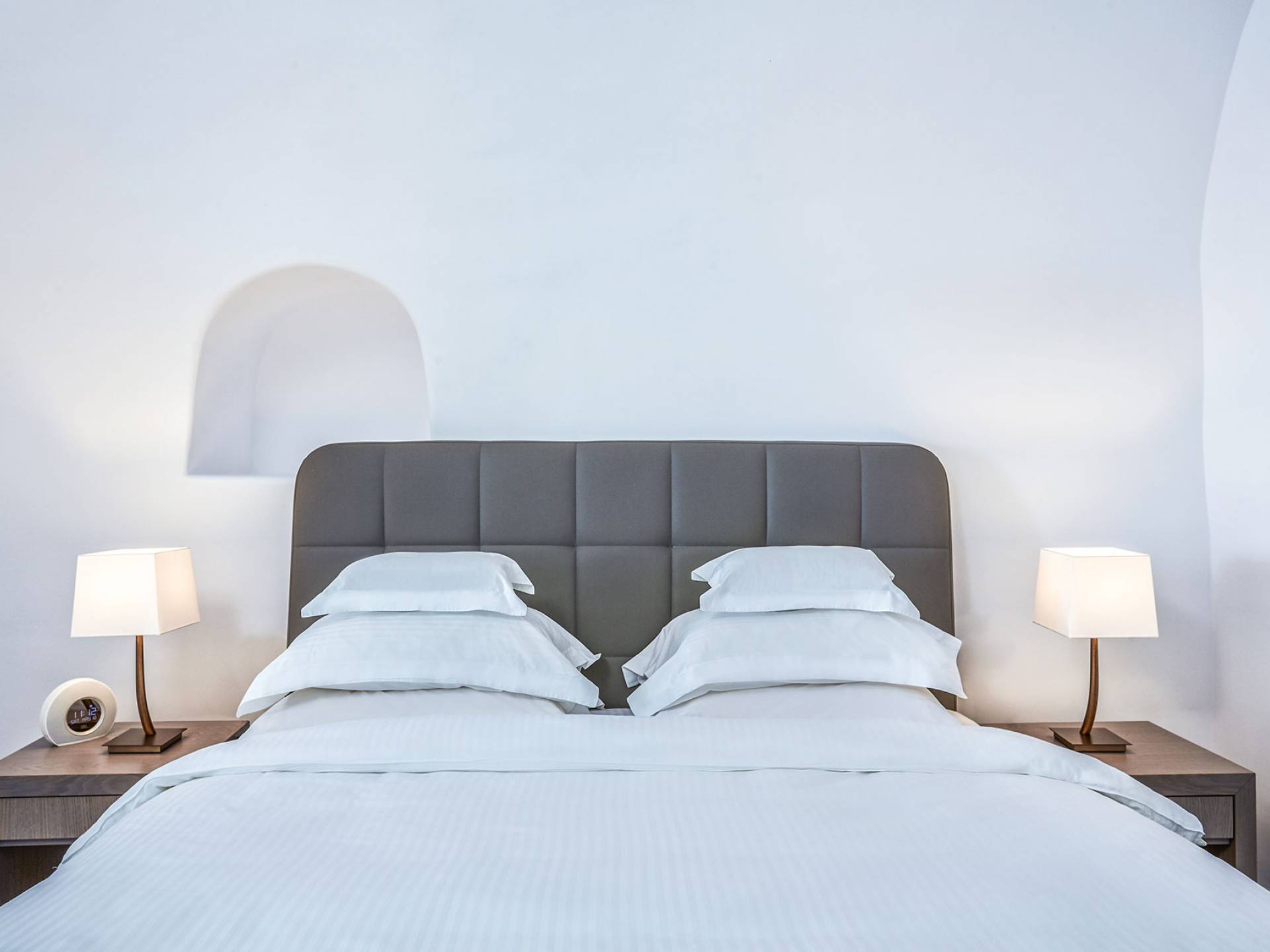 Alongside all the VIP amenities and services you could wish for, you will find your own private hot tub on your balcony. The Two Bedroom Villa with Outdoor Plunge Pool and Caldera View will be the perfect place to unwind in a calm and private setting; it offers spectacular unobstructed views to the volcano, Skaros Rock and the sunset and a hot tub in the balcony.