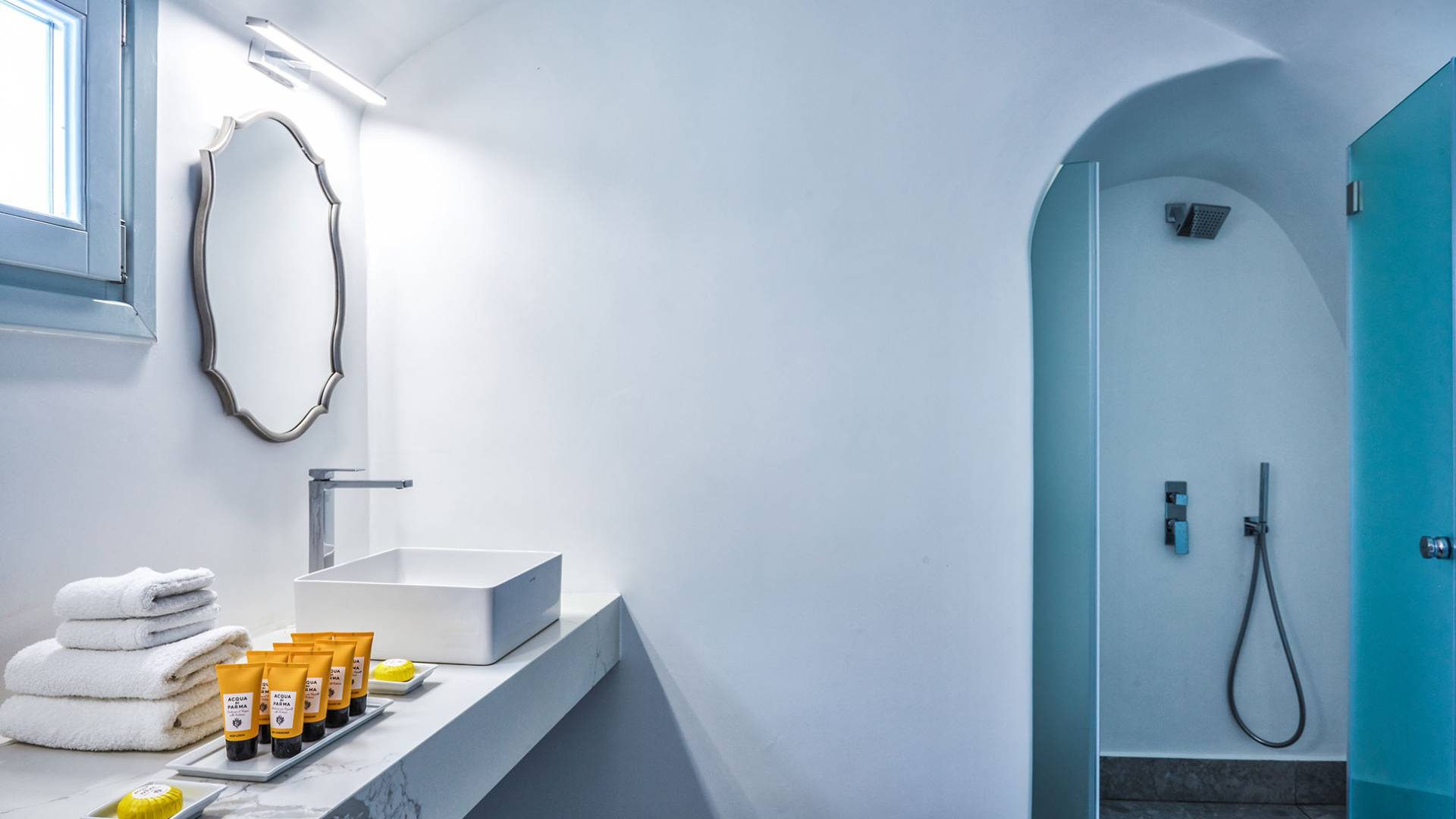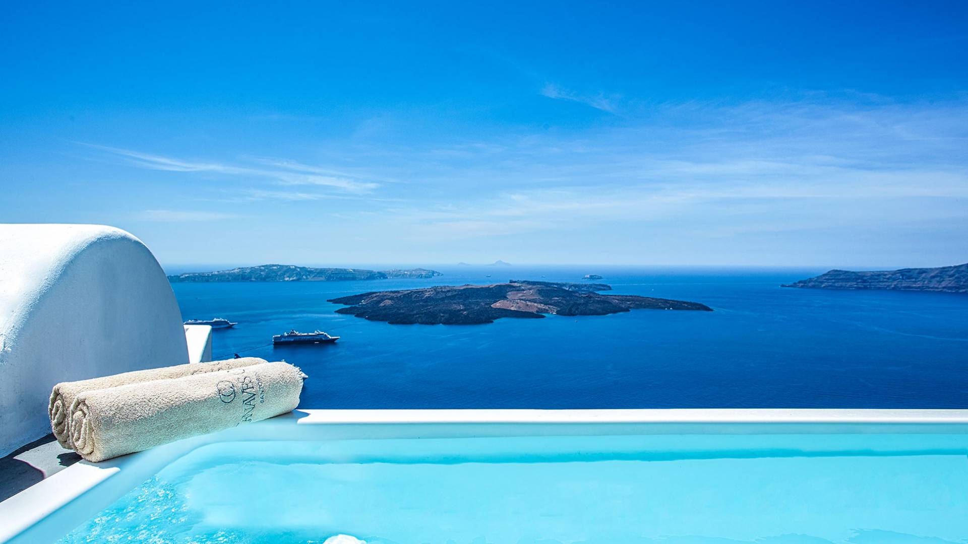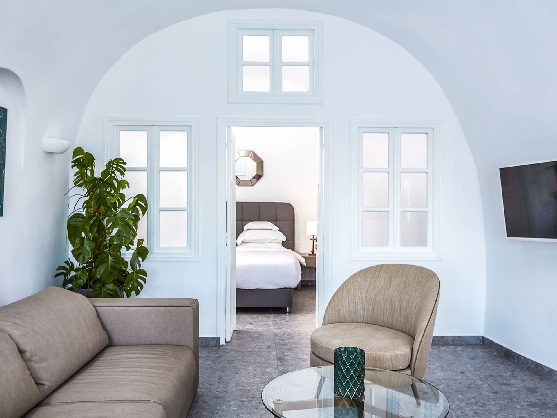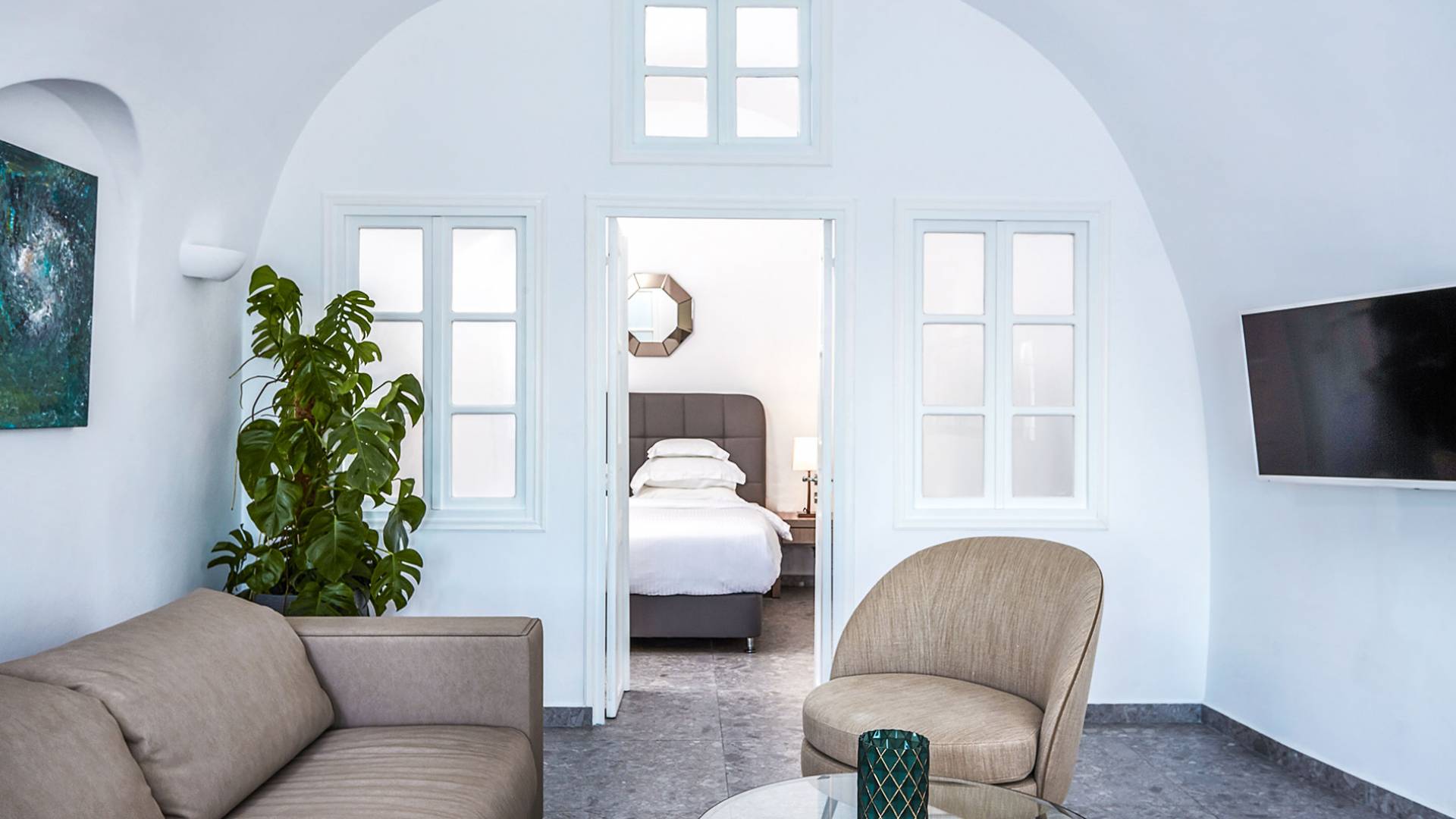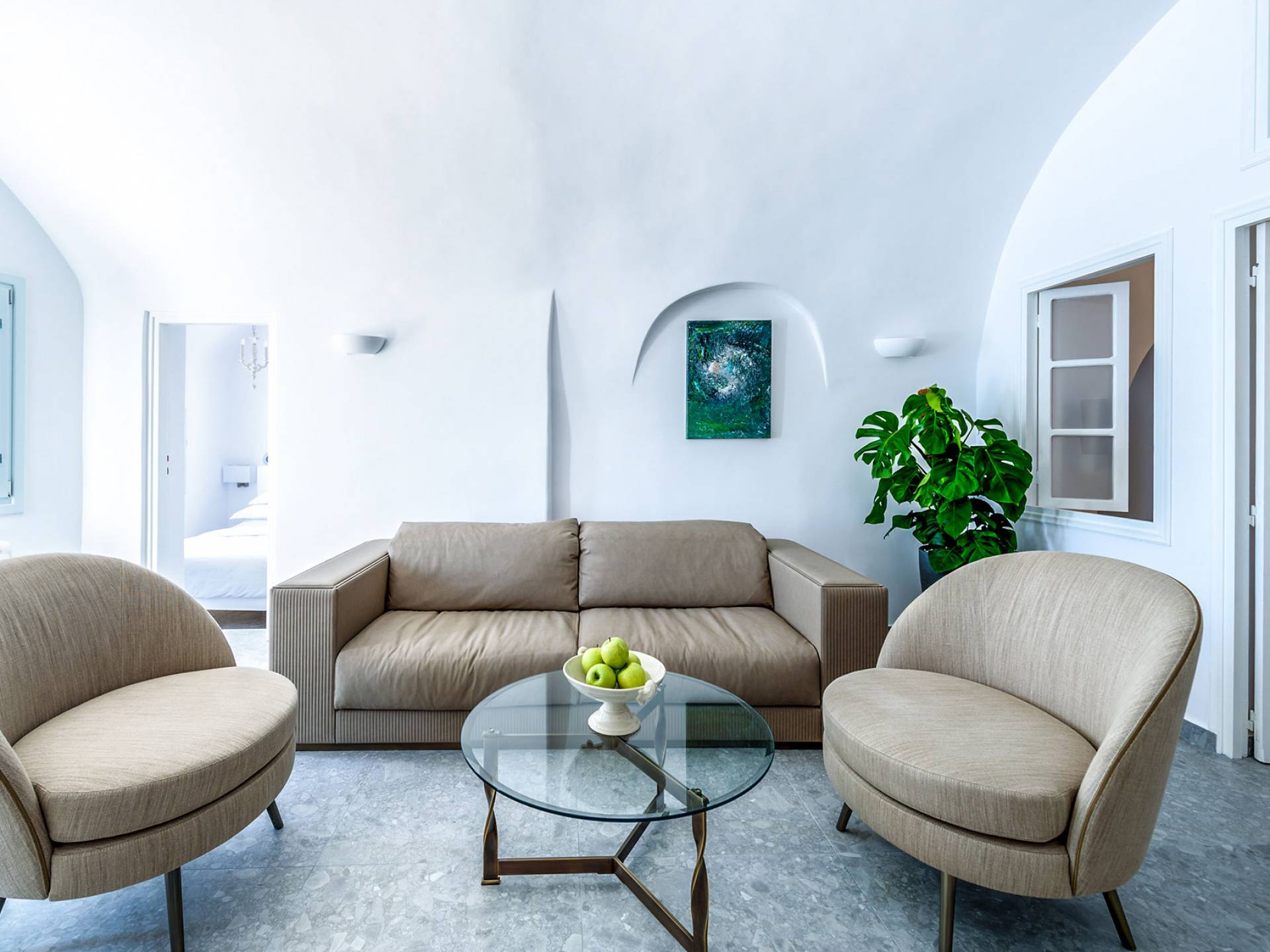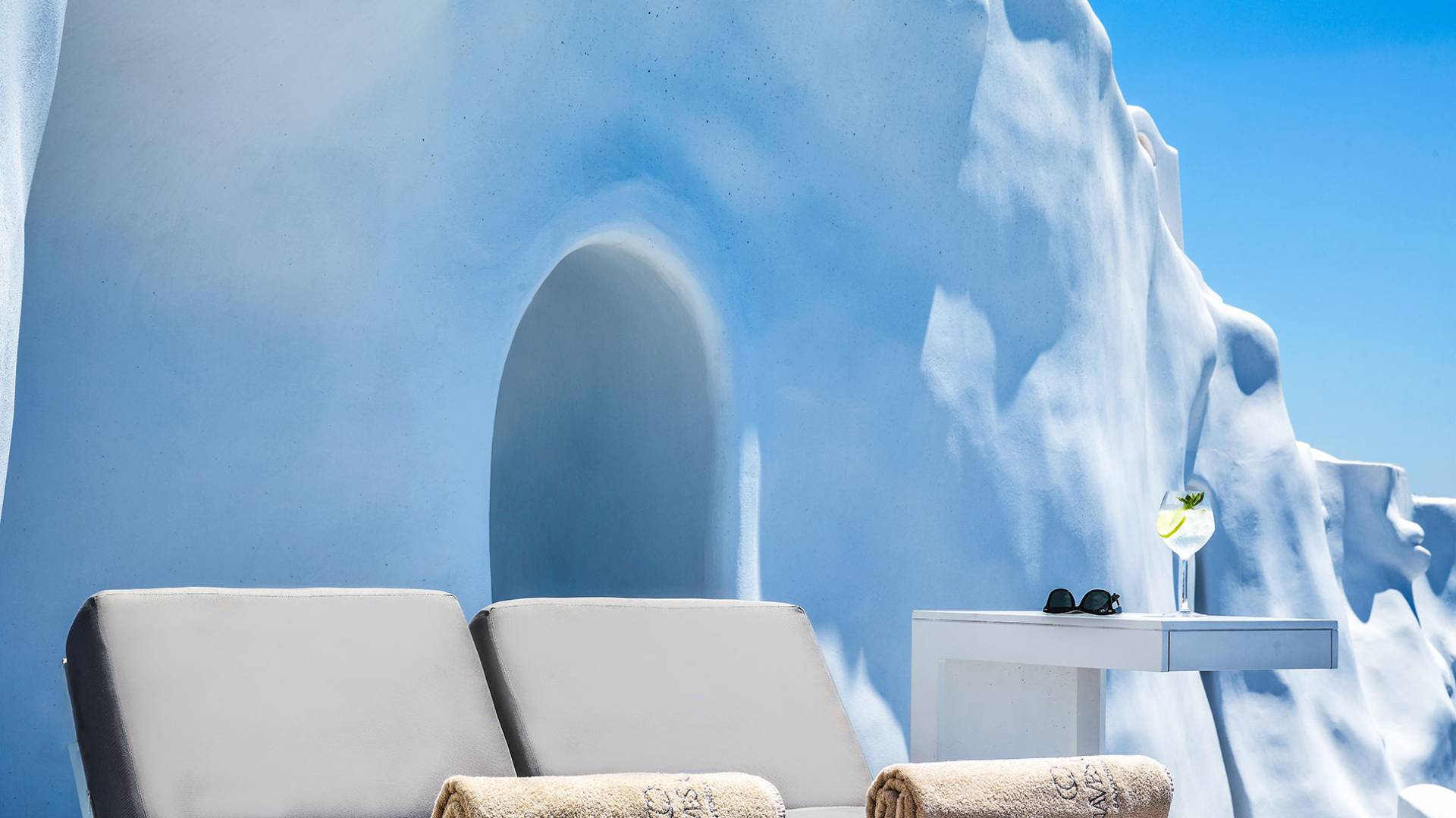 Alongside all the VIP amenities and services you could wish for, you will find your own private hot tub on your balcony. The Two Bedroom Villa with Outdoor Plunge Pool and Caldera View will be the perfect place to unwind in a calm and private setting; it offers spectacular unobstructed views to the volcano, Skaros Rock and the sunset and a hot tub in the balcony.