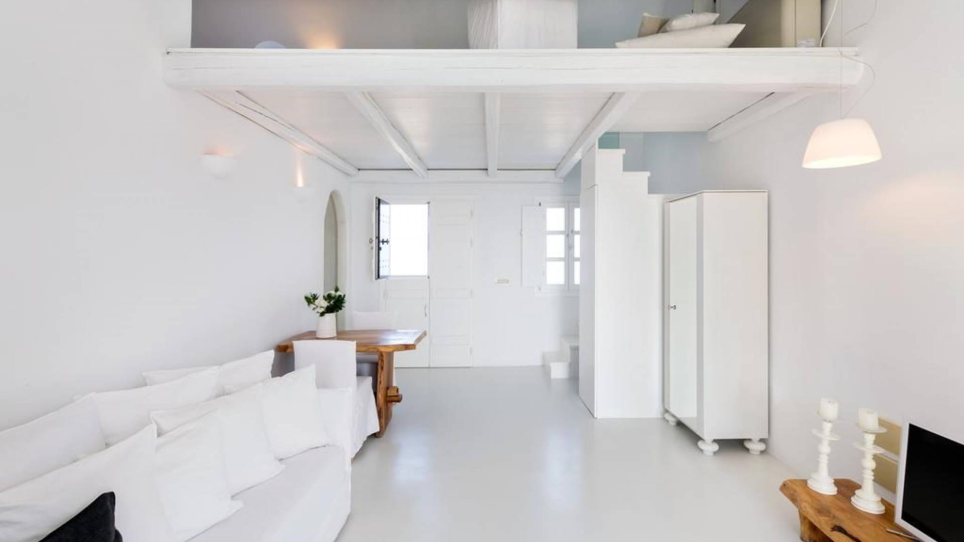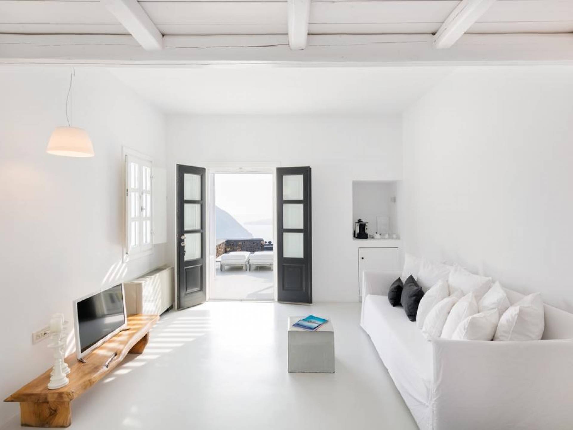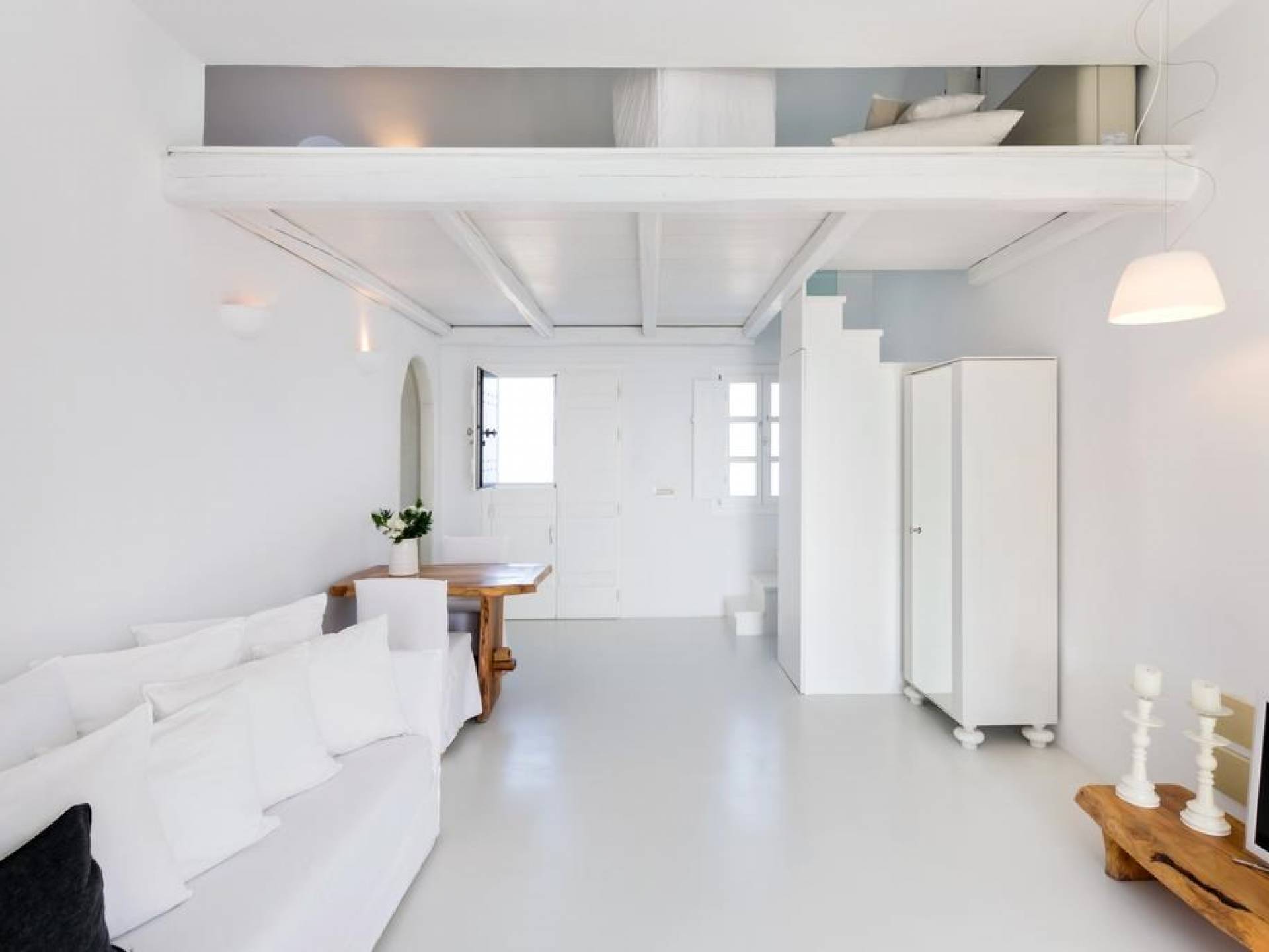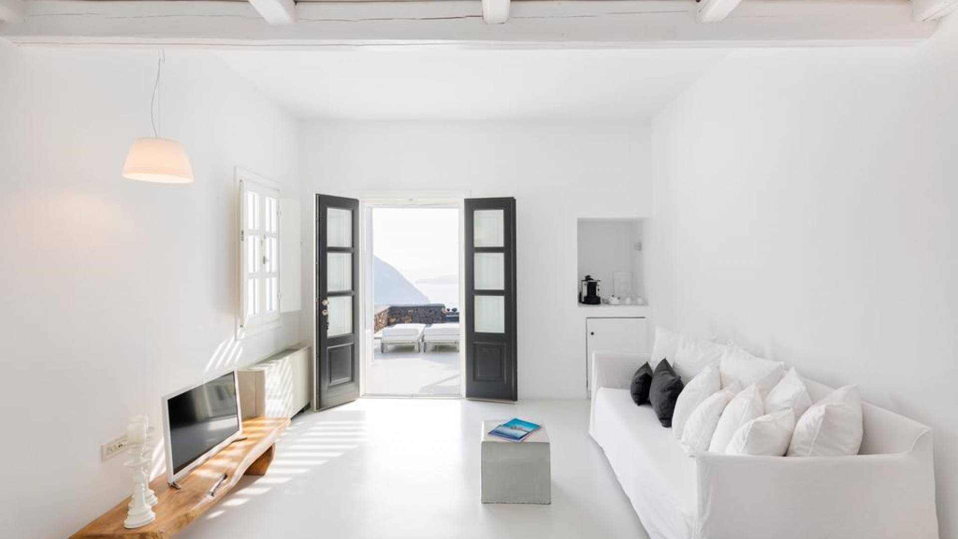 Luxury accommodation with a generous living space of 45 sq m (485 sq ft). Bedroom with Queen size bed in the loft area, living-dining room, bathroom with shower, and spacious private veranda with stunning western views of the Aegean Sea, the caldera, the volcano, and the amazing sunset. Can accommodate 2 guests.