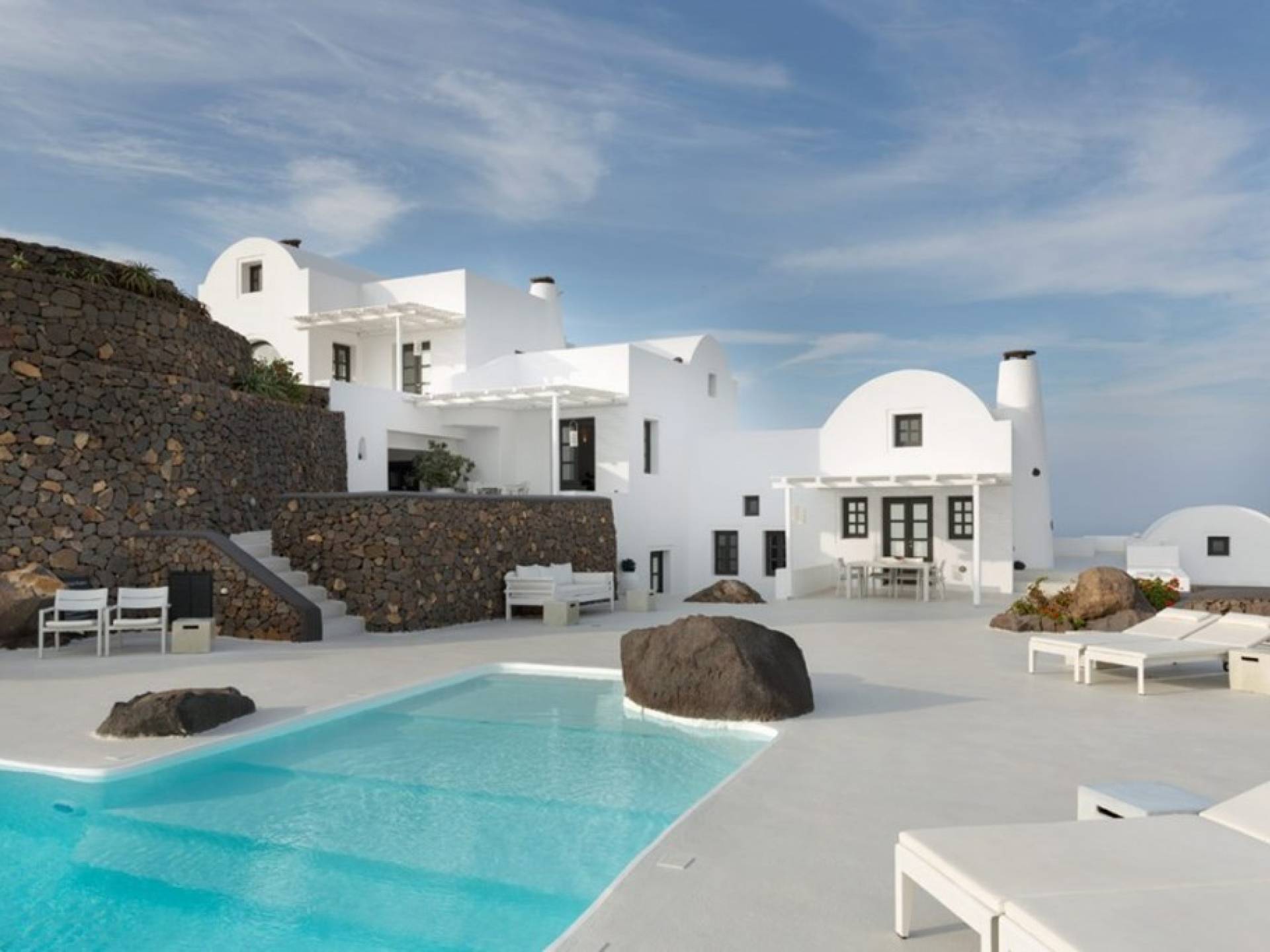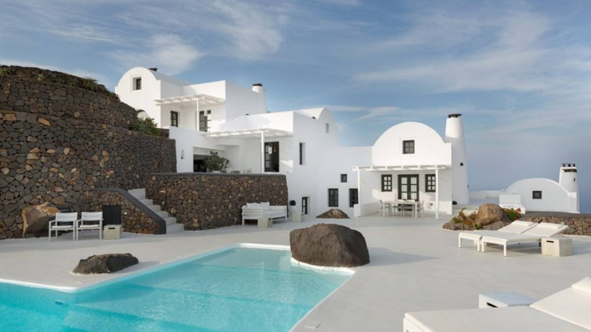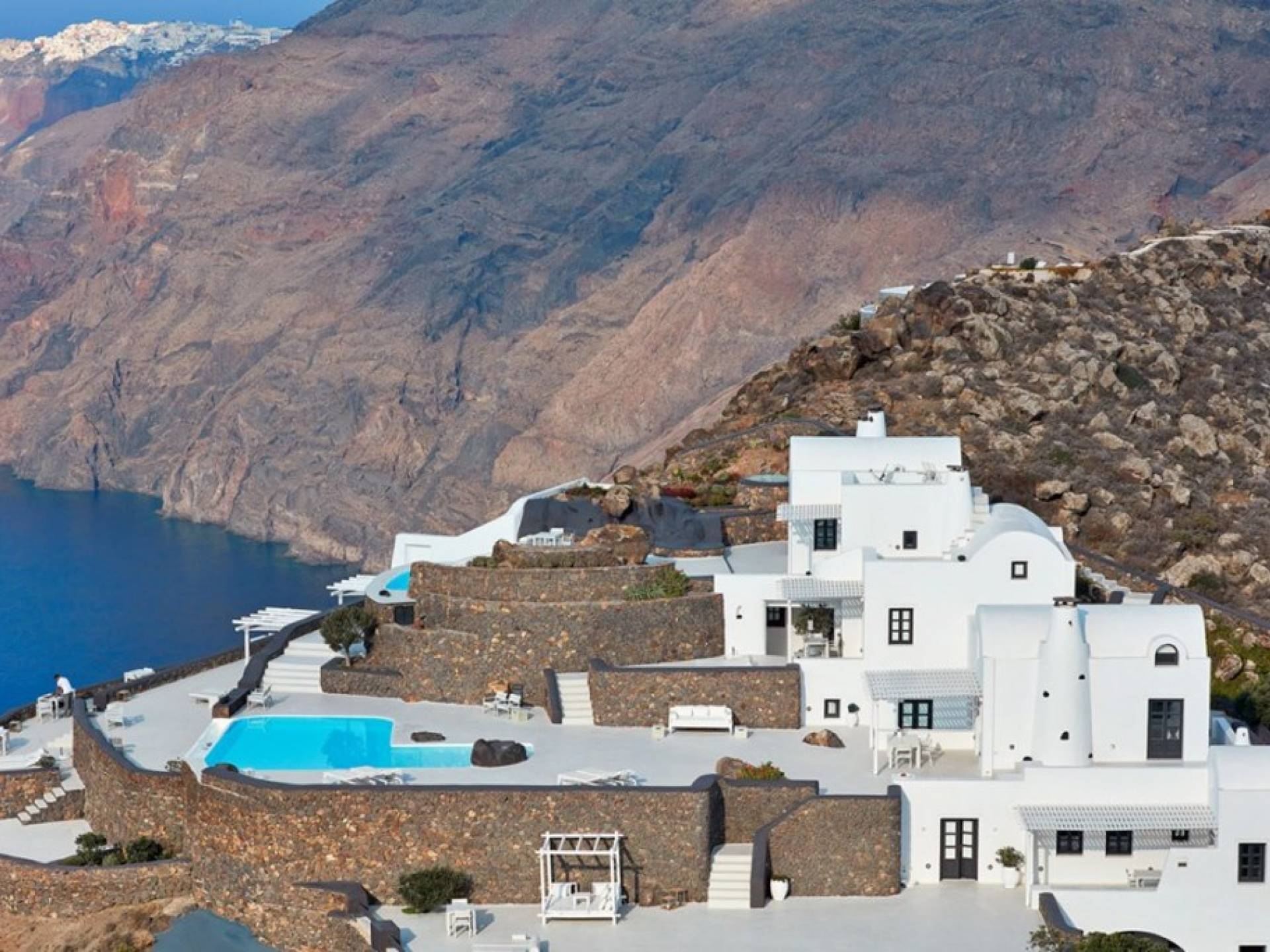 The location of Aenaon Villas Santorini is unique! At the top of a steep slope, in the northern part of the island where the rock was carved to offer incredible panoramic views, including the deep blue Aegean Sea, the volcano’s famous caldera, and the world’s most breathtaking sunset. Built right on the ancient path that connects Oia with Imerovigli and Fira, it overlooks the beautiful beaches spanning the east coast of the island. Blending brilliant whitewashed surfaces with the island’s age-old volcanic stone has created the traditional complex of luxurious villas whose beautiful stonework evokes a feeling of rough grandeur. The result proves that respect for tradition can coexist in perfect harmony with the luxuries of modern amenities.