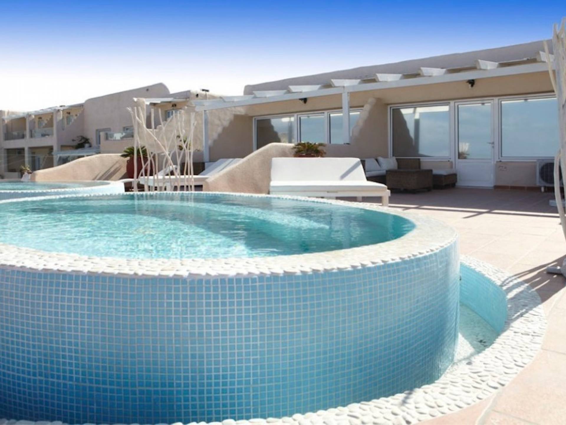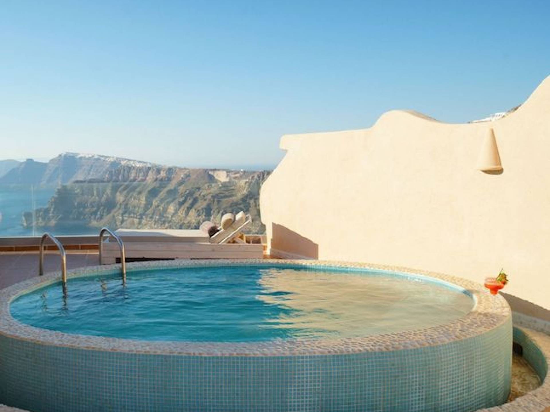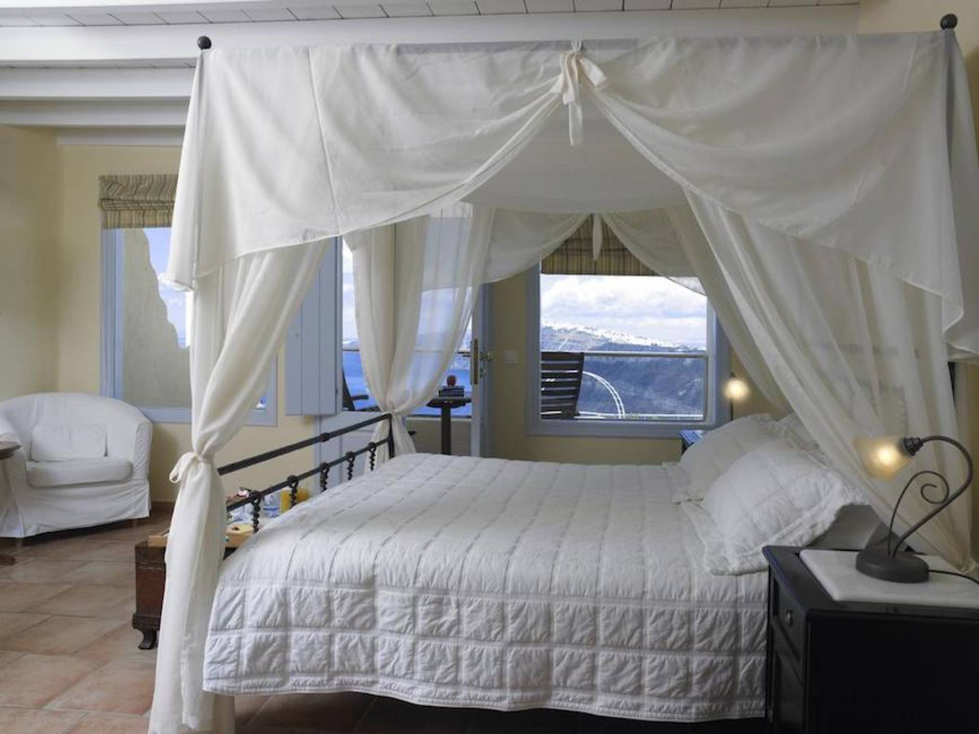 Spacious bedroom and bathtub overlooking the caldera, living room, bathroom with shower, panoramic large veranda with private pool with sea view.
