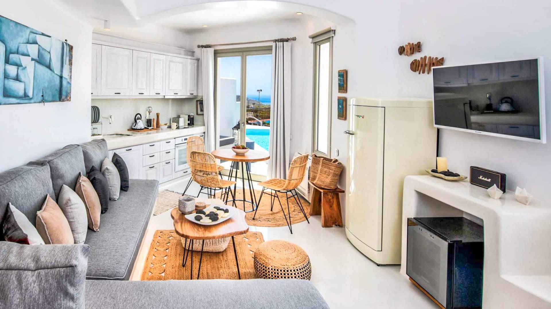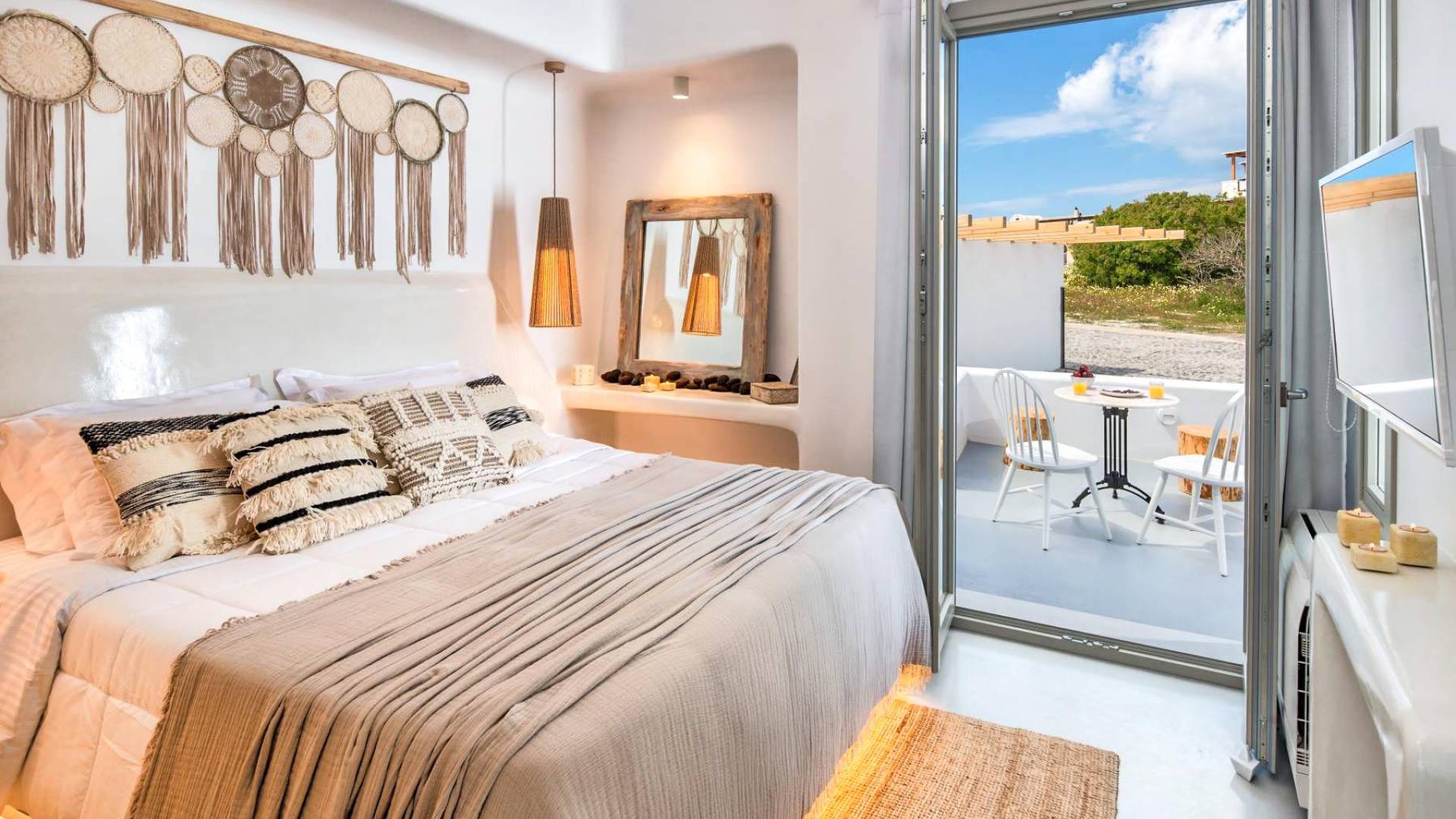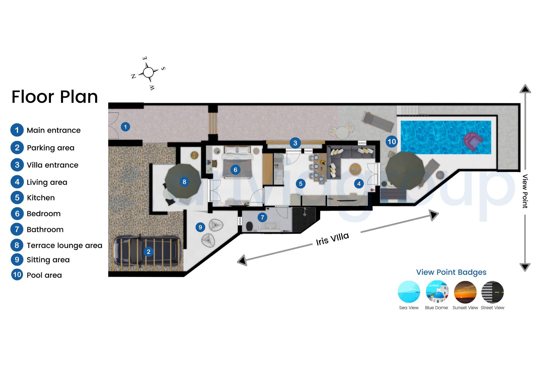 Villa Iris Santorini is a private villa that celebrates the grandeur of the Santorinian landscape, villa Iris offers a beautiful open plan sitting and dining area with traditionally built sofas that can accommodate extra person, a fully equipped kitchen with a regular size fridge and kitchenware, a flat-screen TV, a well-sized bedroom and a bathroom with a walk-in shower. On the patio that feels like floating over the landscape, you can sip on a crisp Santorinian white wine on your sunbeds by your private plunge pool or enjoy your meals in the privacy of your outdoor dining area. Access to the villa is very easy. A private entrance and a free private parking area are also provided.