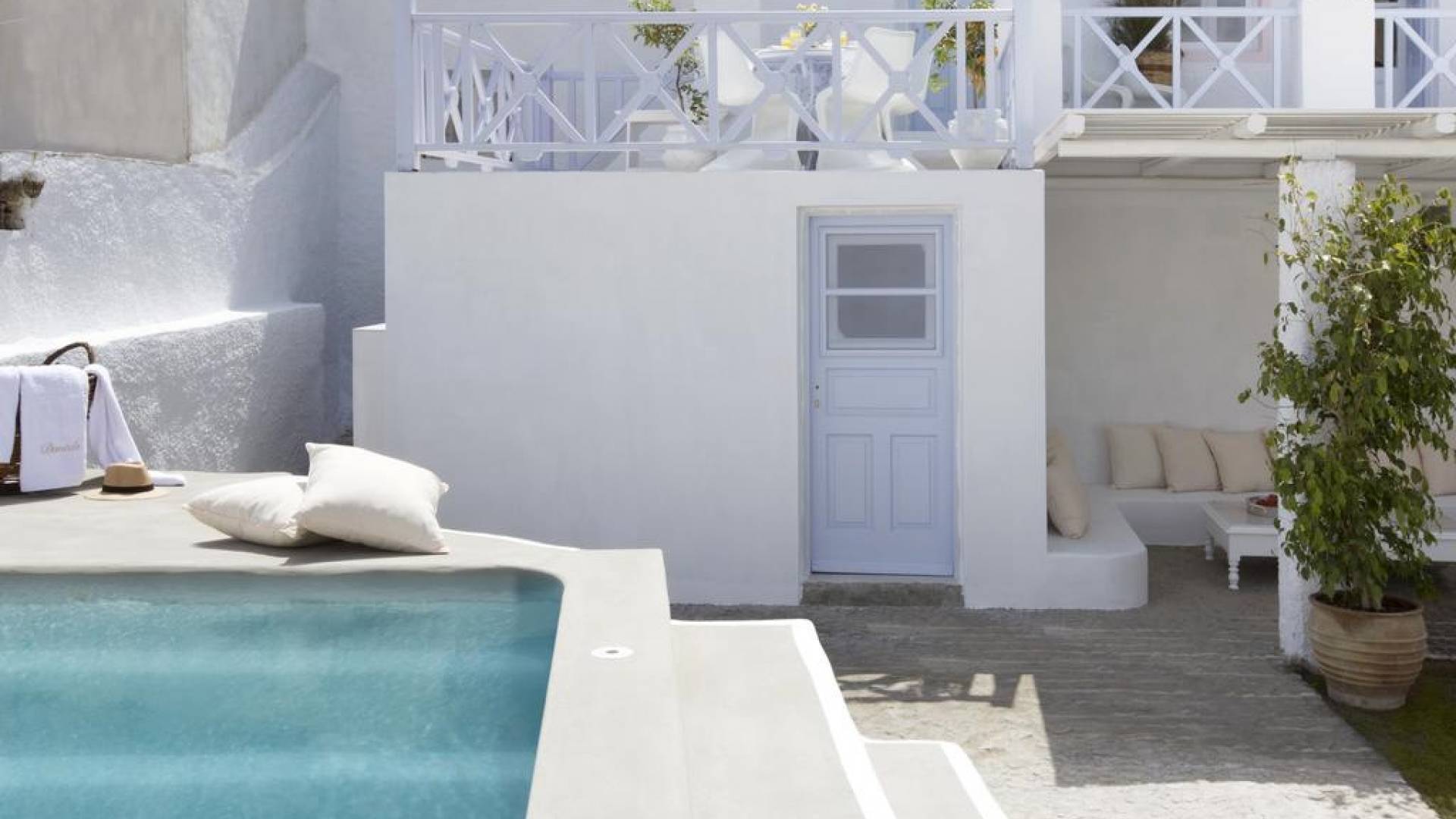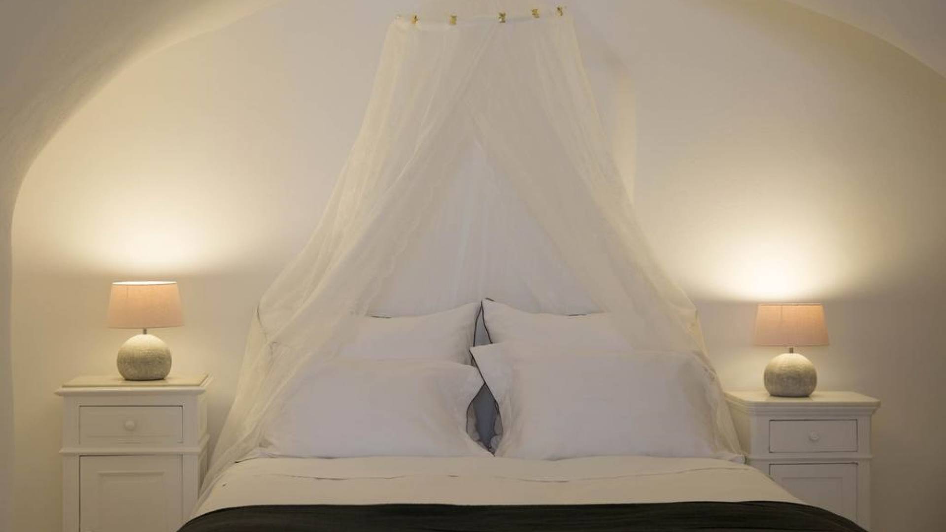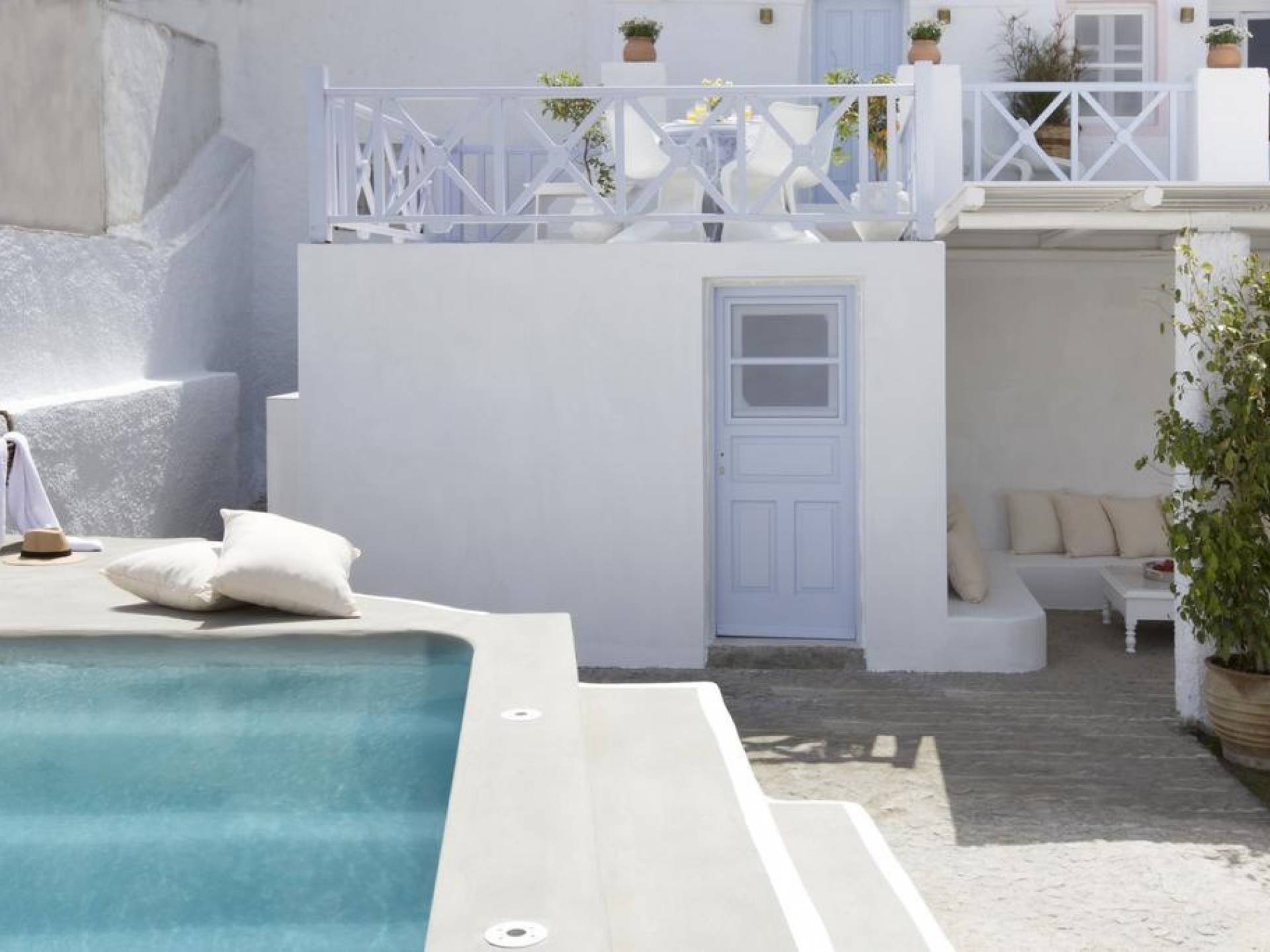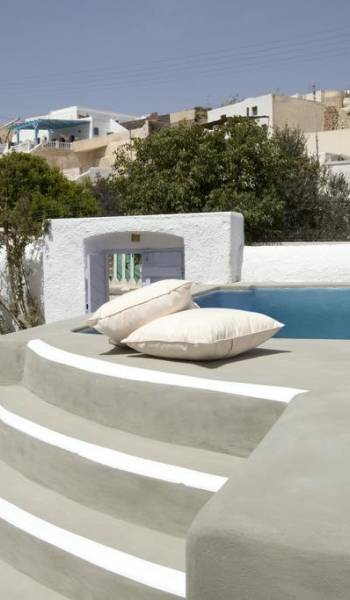Blue Residence at Dantelo Santorini is a luxury villa rental with 2 bedrooms and a private pool. The Blue Residence accommodates up to 8 persons, spreading all on one level, with two main entrances, as the plot is situated between two cobbled streets. Elements such as the original timber doors and shutters, the poured concrete flooring, the domed ceilings, the canava cave rooms, and the cobbled verandas have been preciously safeguarded as both physical & stylistic remnants of the island's cultural heritage. During the summer, the blue residence offers a cool paradise amidst the sun-drenched village, whether you spent time under the shade of the jasmine pergola, plunging in the water pool, or simply relaxing in one of the exquisite settings, indoor or outdoor. During the coolest months, the warm pool water is the best way to unwind after a day of adventure on the island.