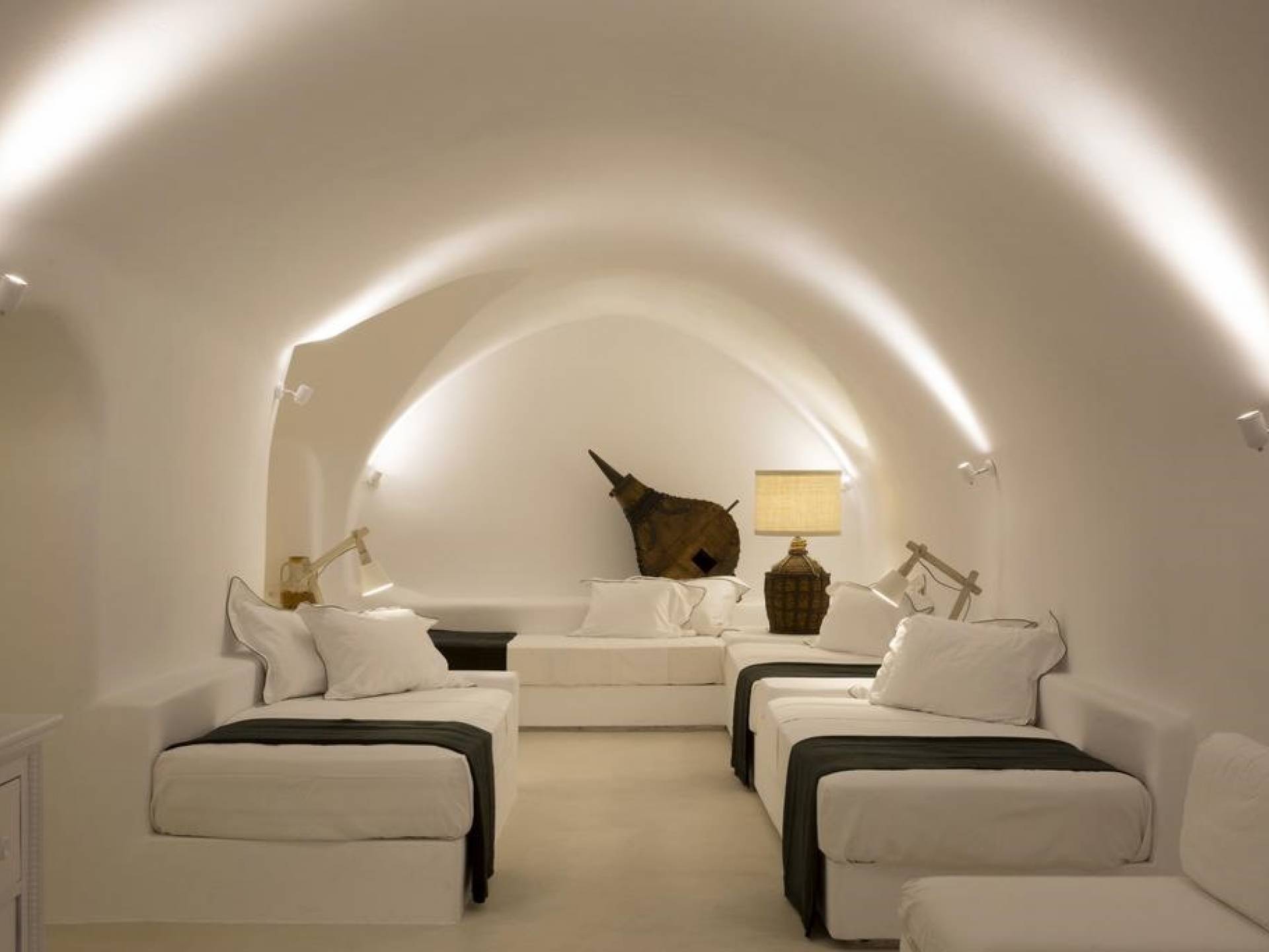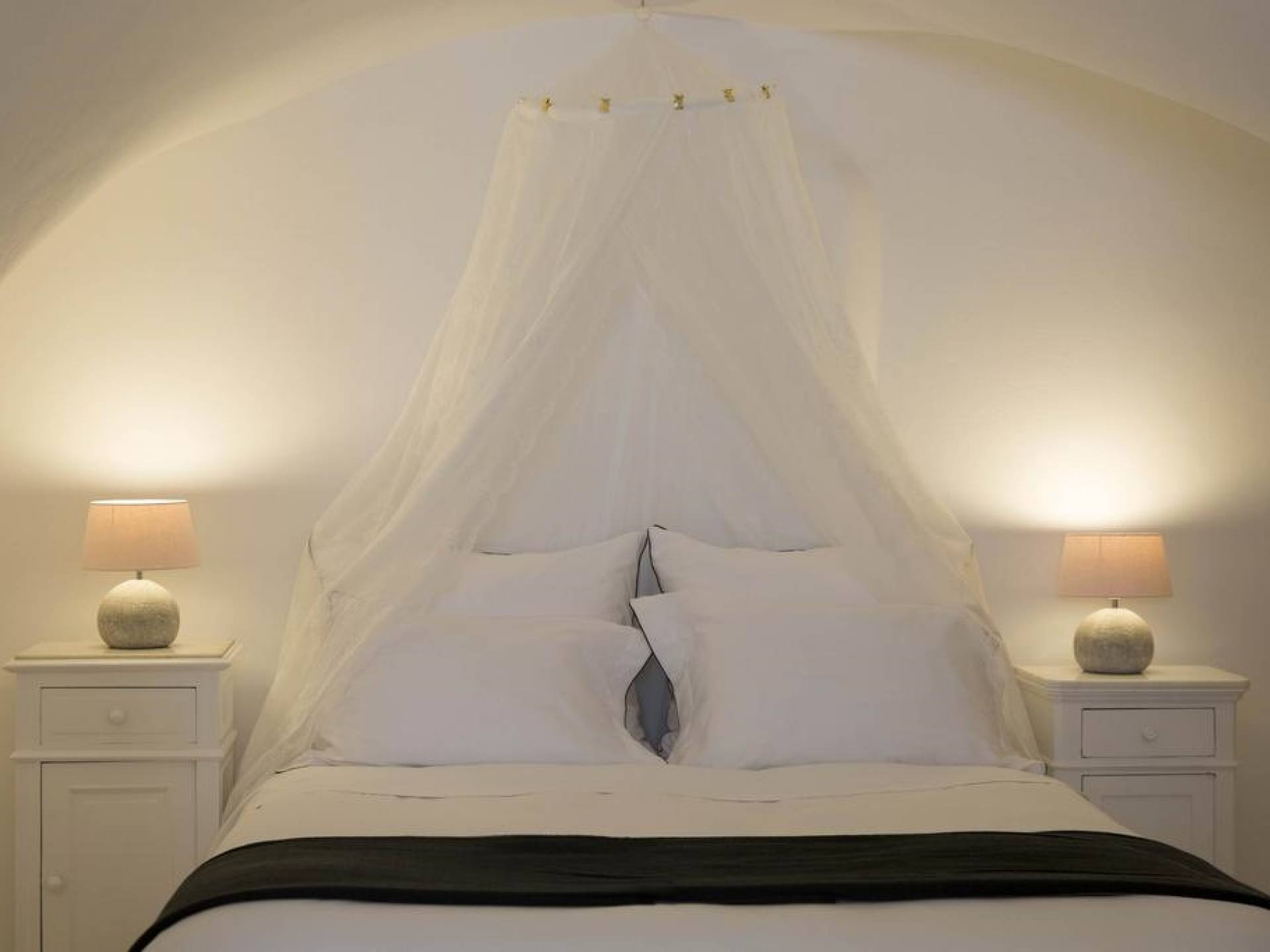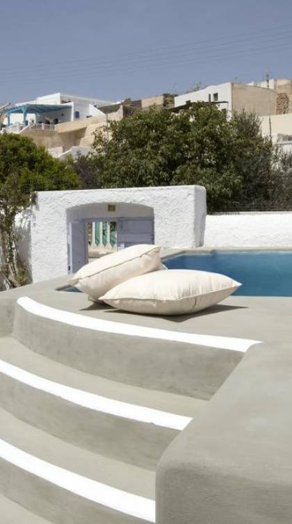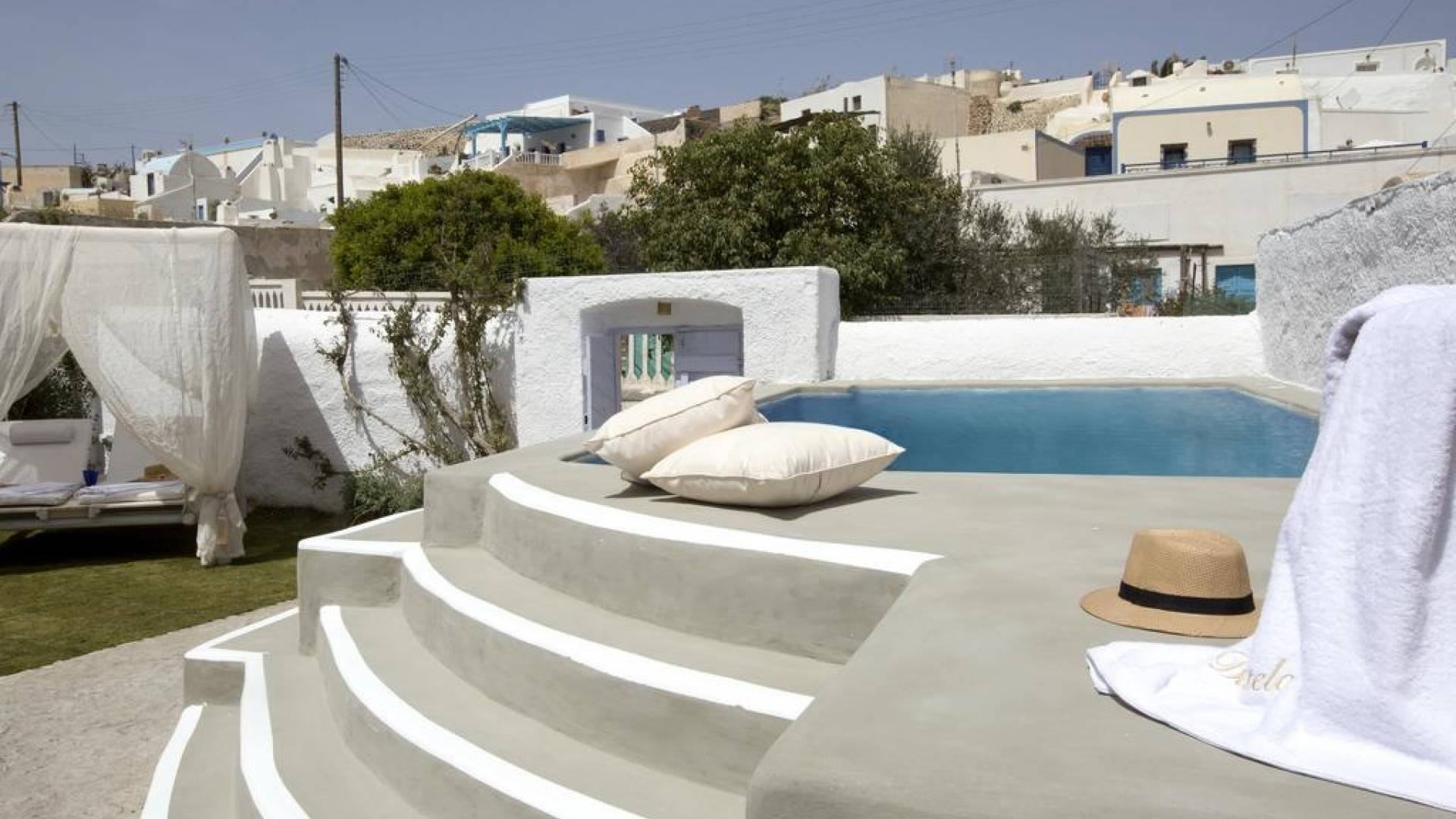 Blue Residence at Dantelo Santorini is a luxury villa rental with 2 bedrooms and a private pool. The Blue Residence accommodates up to 8 persons, spreading all on one level, with two main entrances, as the plot is situated between two cobbled streets. Elements such as the original timber doors and shutters, the poured concrete flooring, the domed ceilings, the canava cave rooms, and the cobbled verandas have been preciously safeguarded as both physical & stylistic remnants of the island's cultural heritage. During the summer, the blue residence offers a cool paradise amidst the sun-drenched village, whether you spent time under the shade of the jasmine pergola, plunging in the water pool, or simply relaxing in one of the exquisite settings, indoor or outdoor. During the coolest months, the warm pool water is the best way to unwind after a day of adventure on the island.