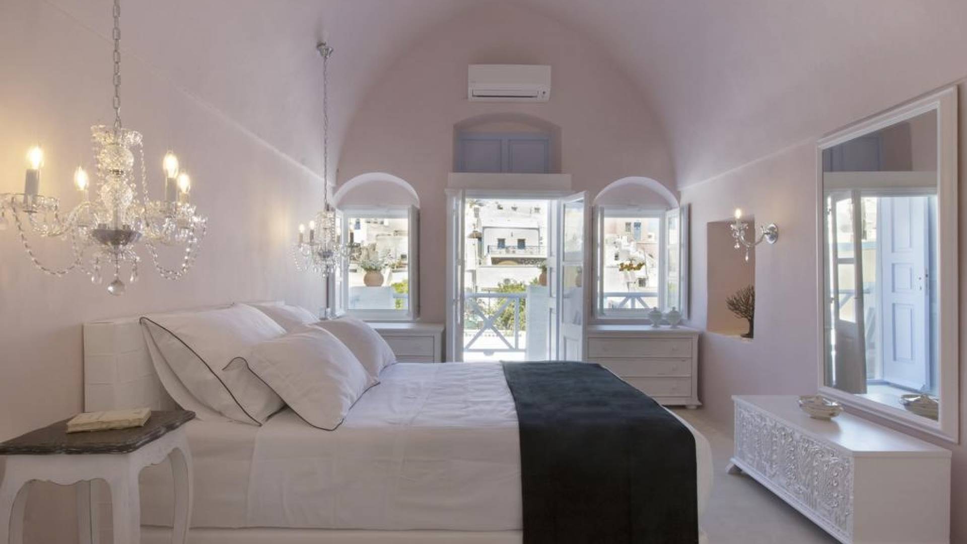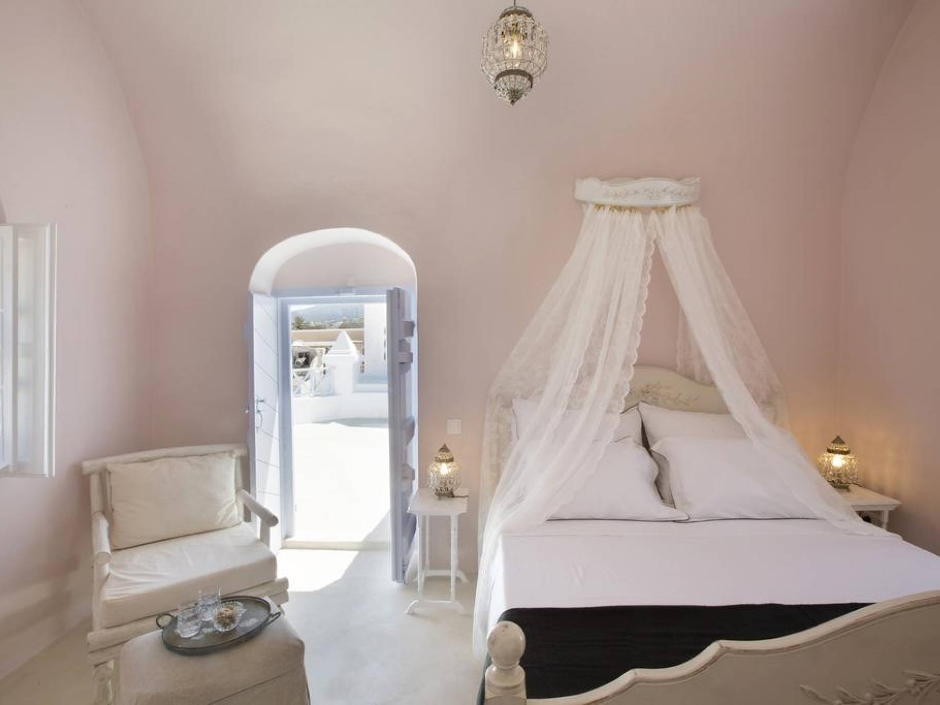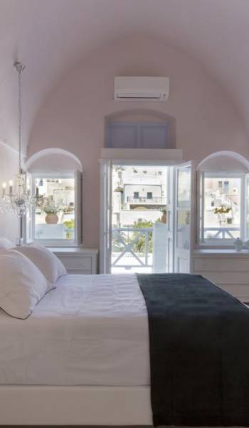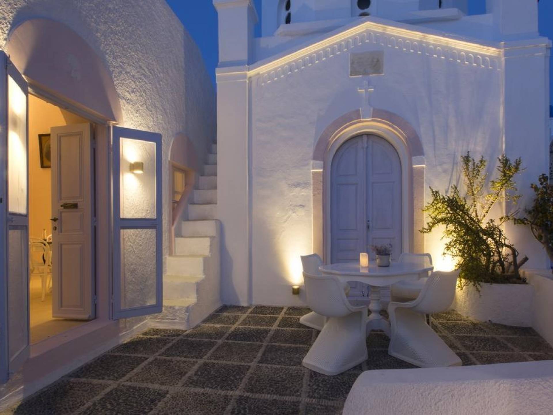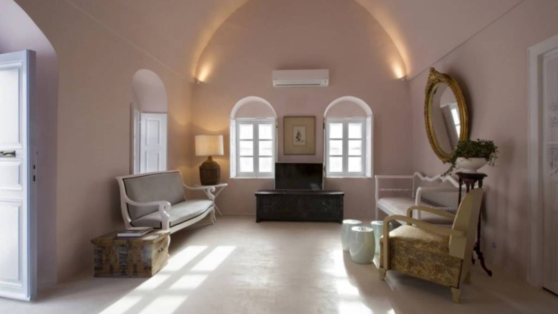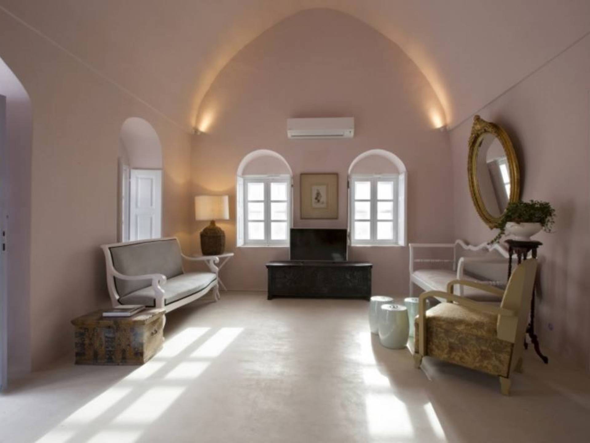 The Pink Residence accommodates up to 6 persons over two levels, with one main entrance on the lower floor. Interior decoration combines antique furniture with modern amenities and romantic lighting. At night, the residence transforms into a private heaven under the stars, amidst scenic night views of the village, illuminated church domes and romantic sea views of the aegean far in the distance. The residence is accustomed for all seasons.